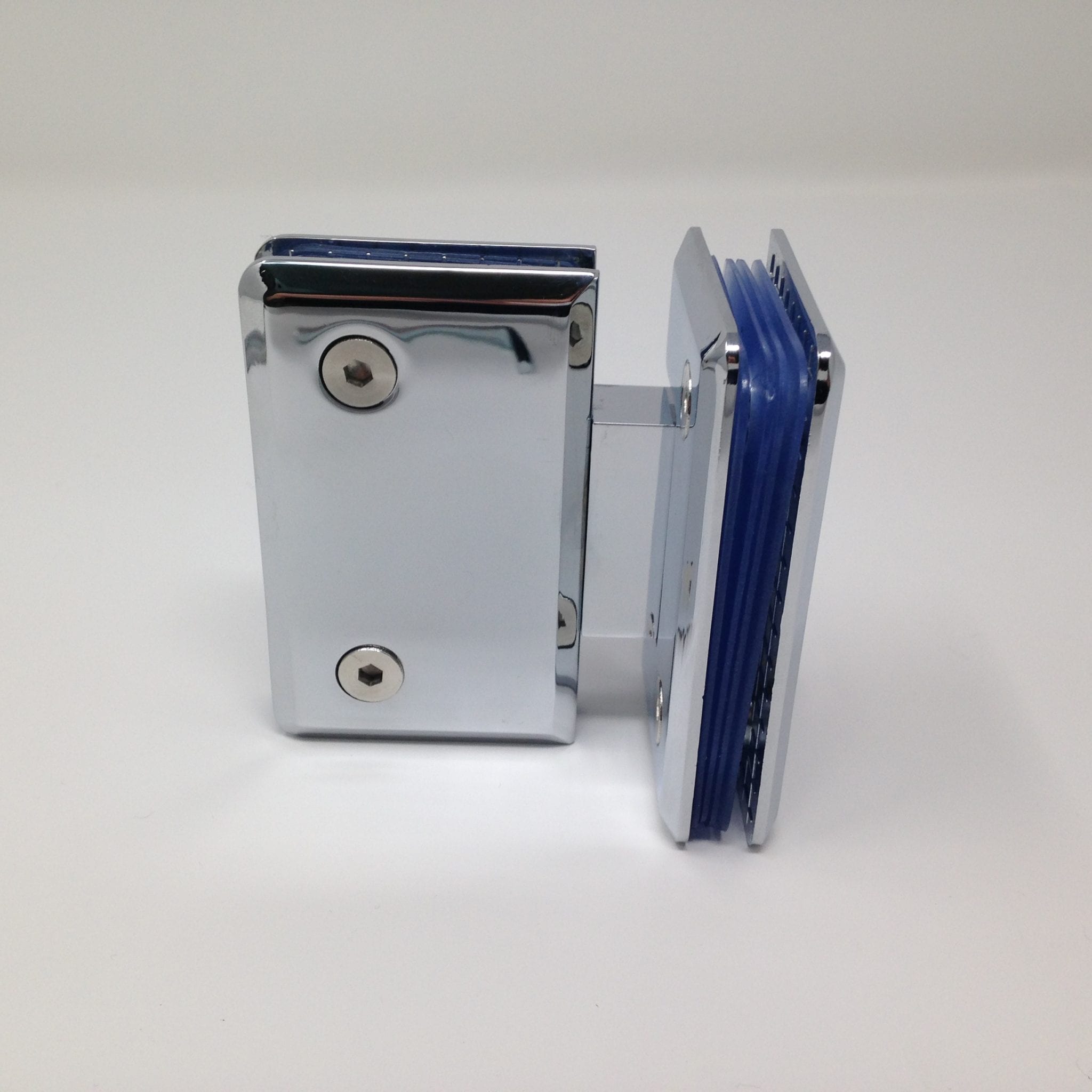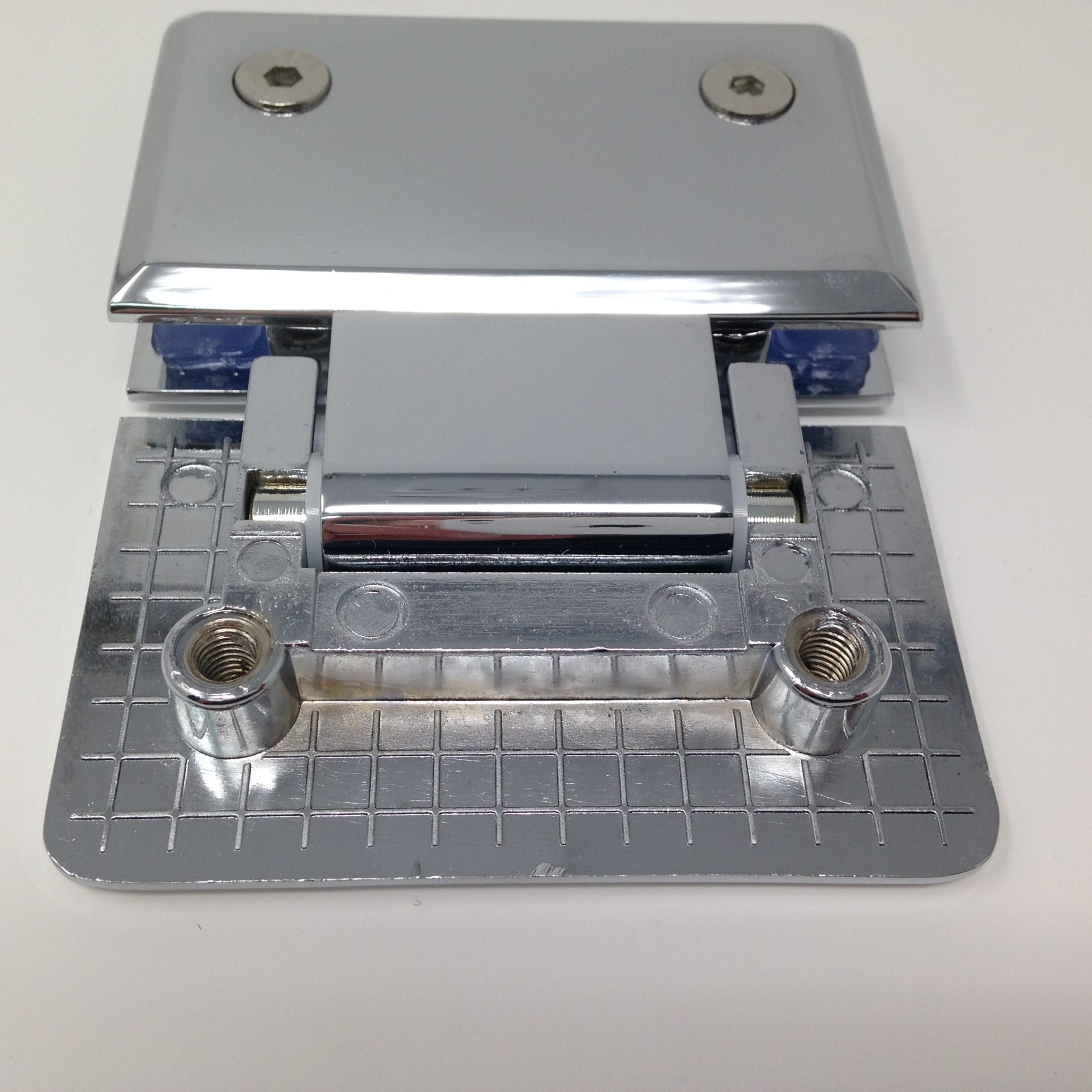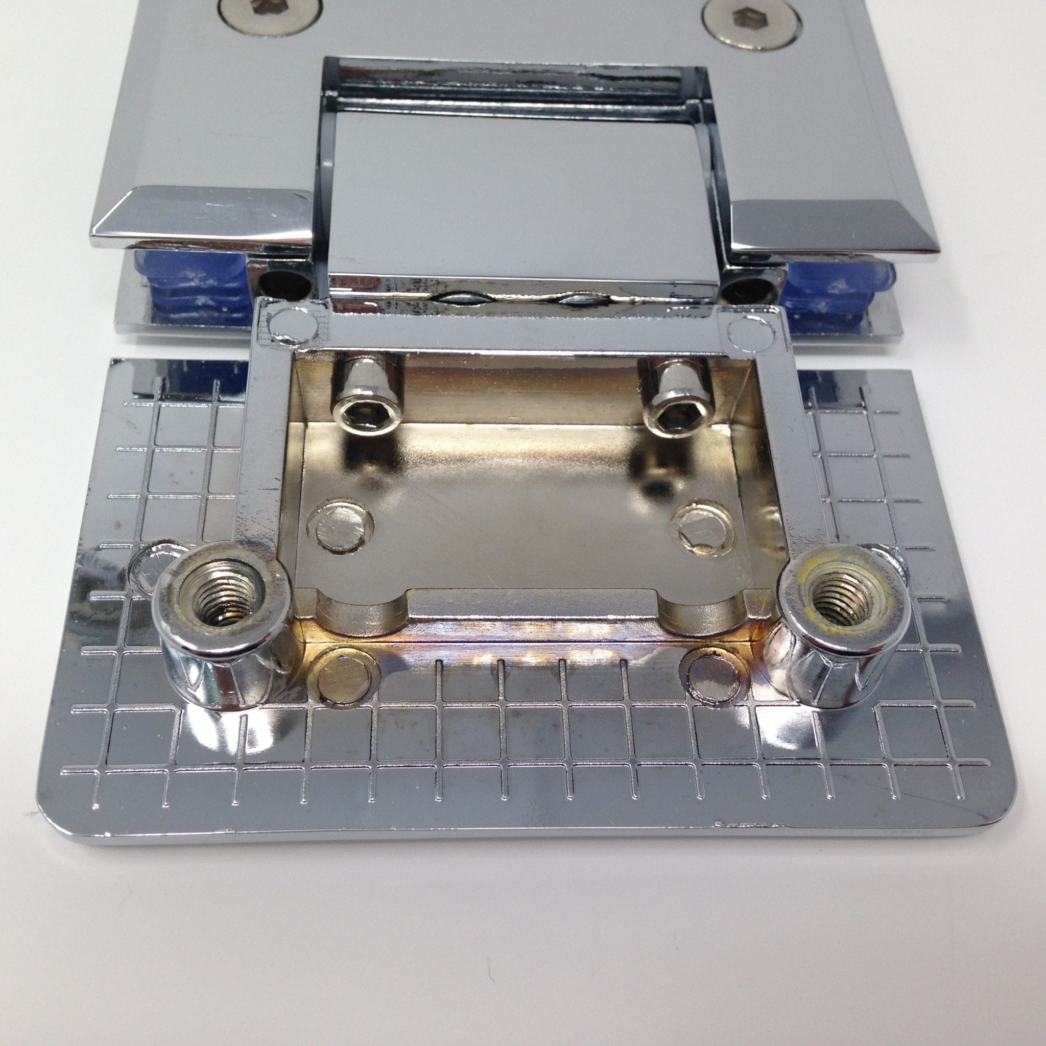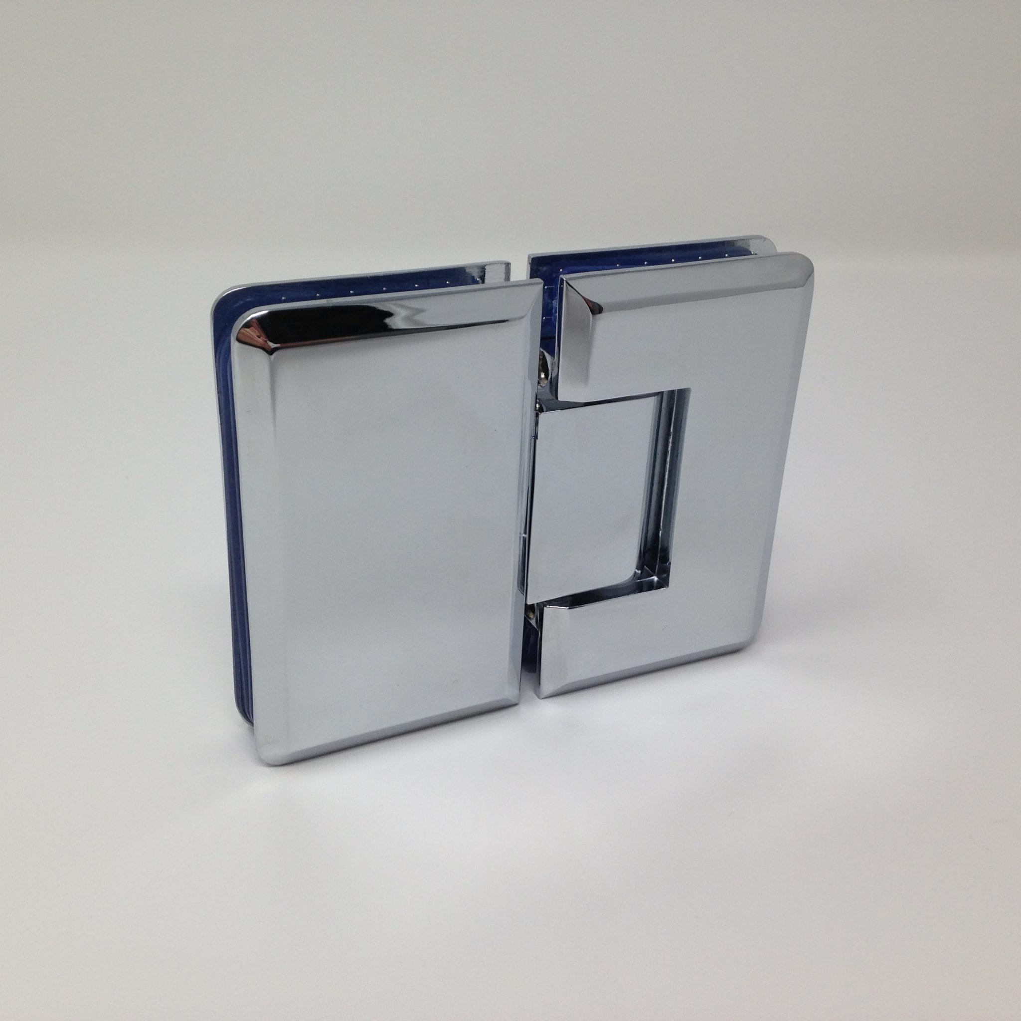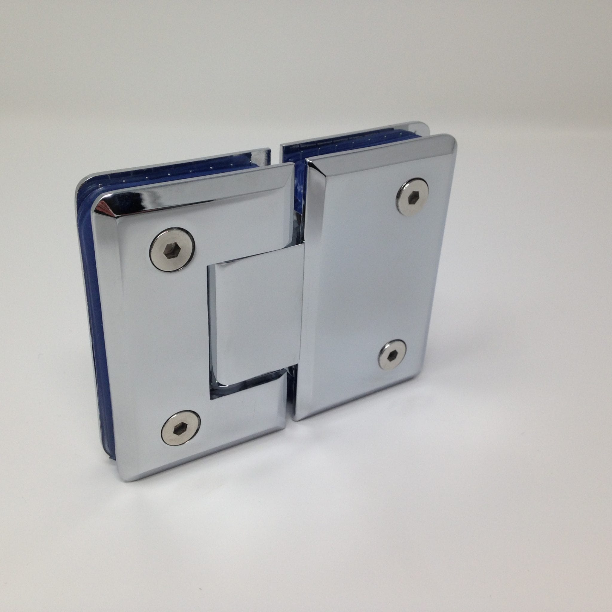 Charnière à ouverture à 180° pour porte de cabine de douche ou pare douche, usinée dans du laiton massif et recouverte d’un fini chromé conférant ainsi une finition impeccable.