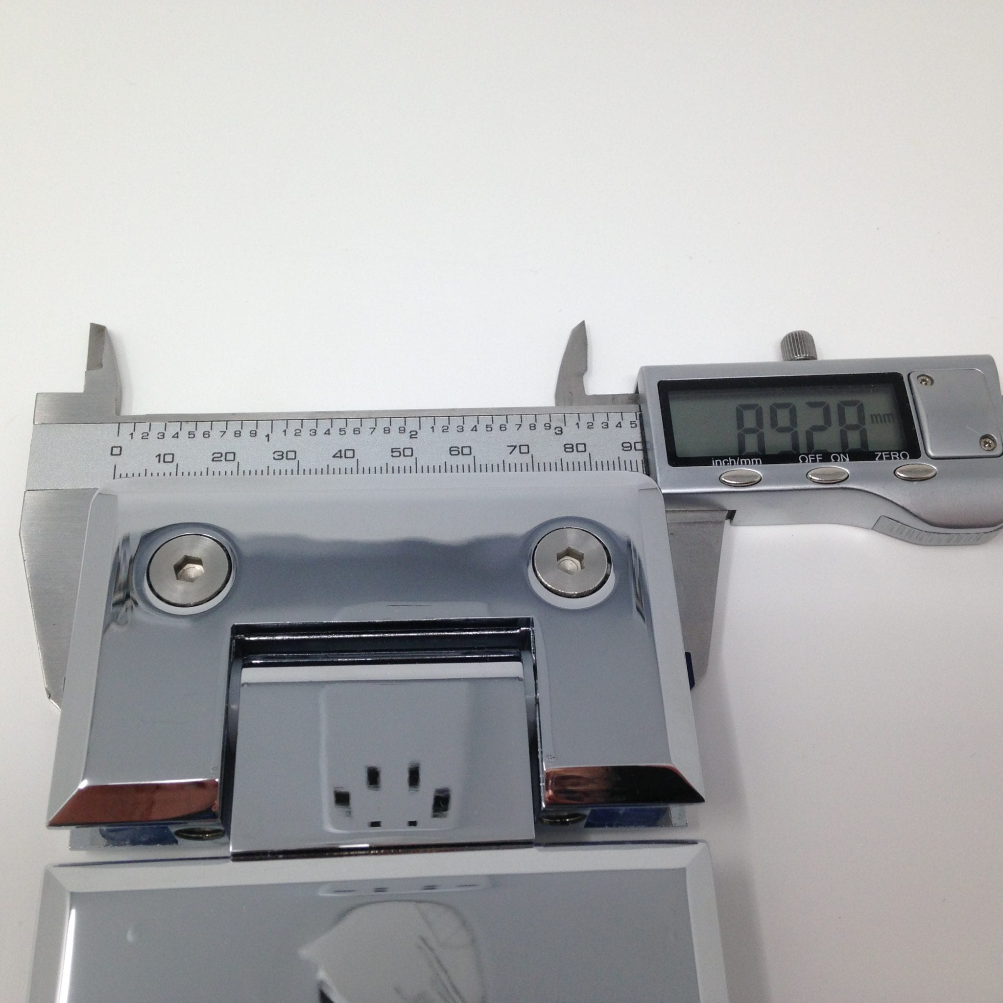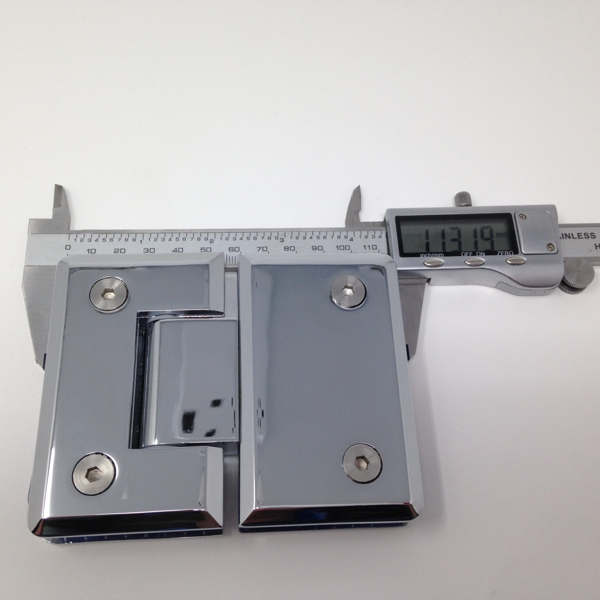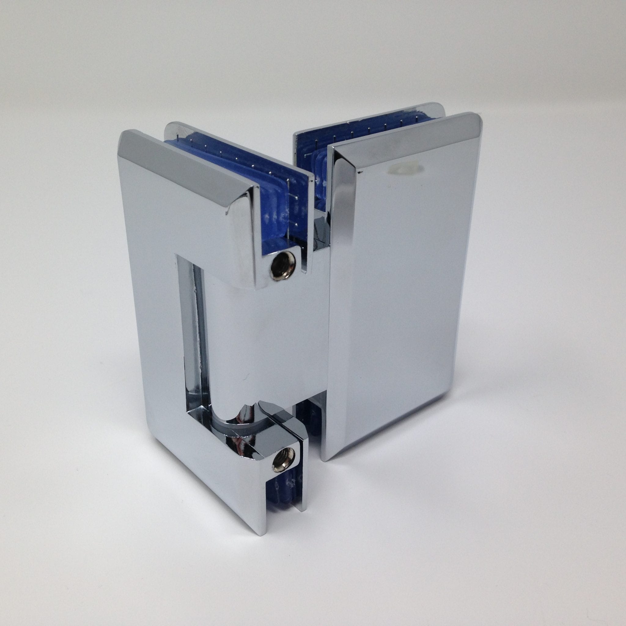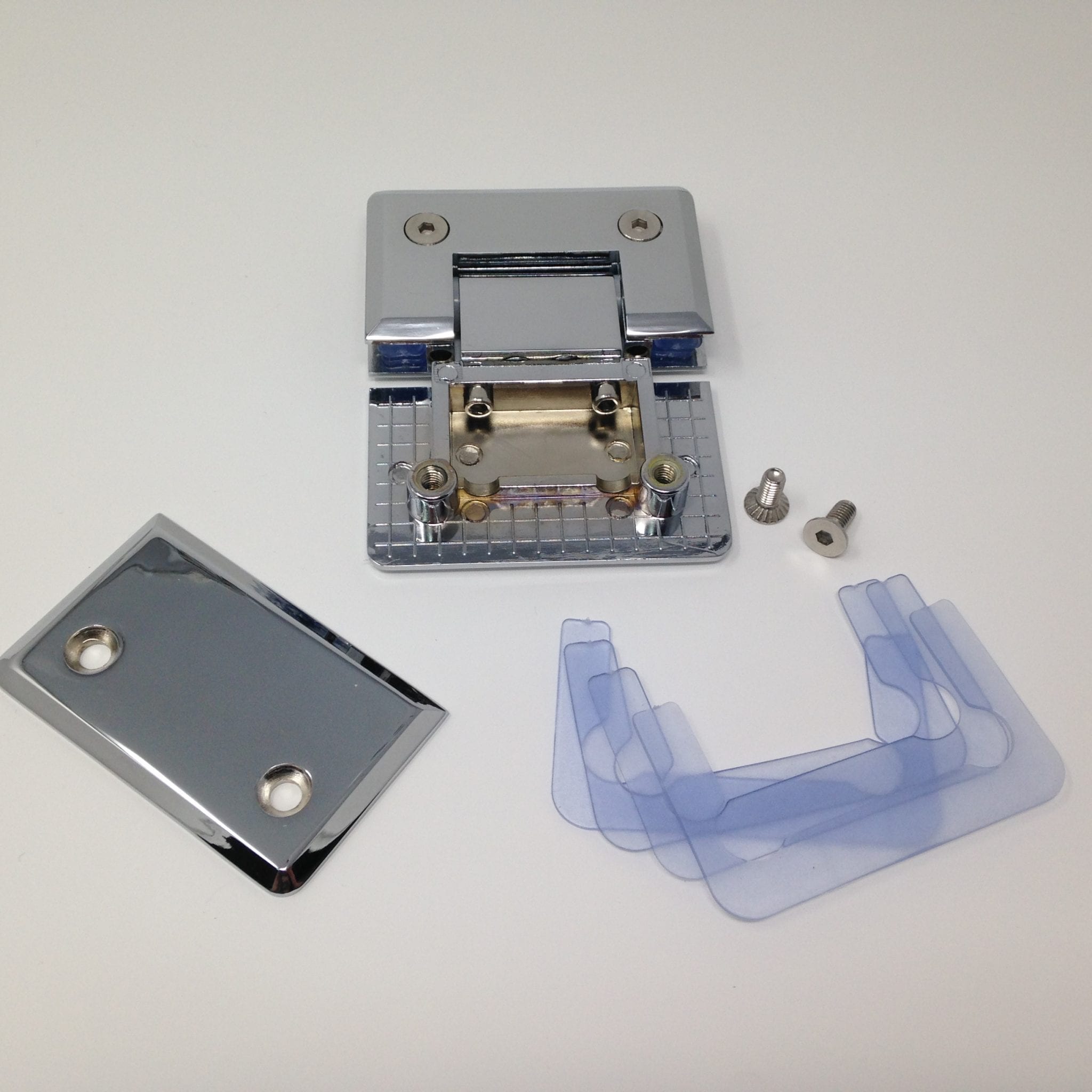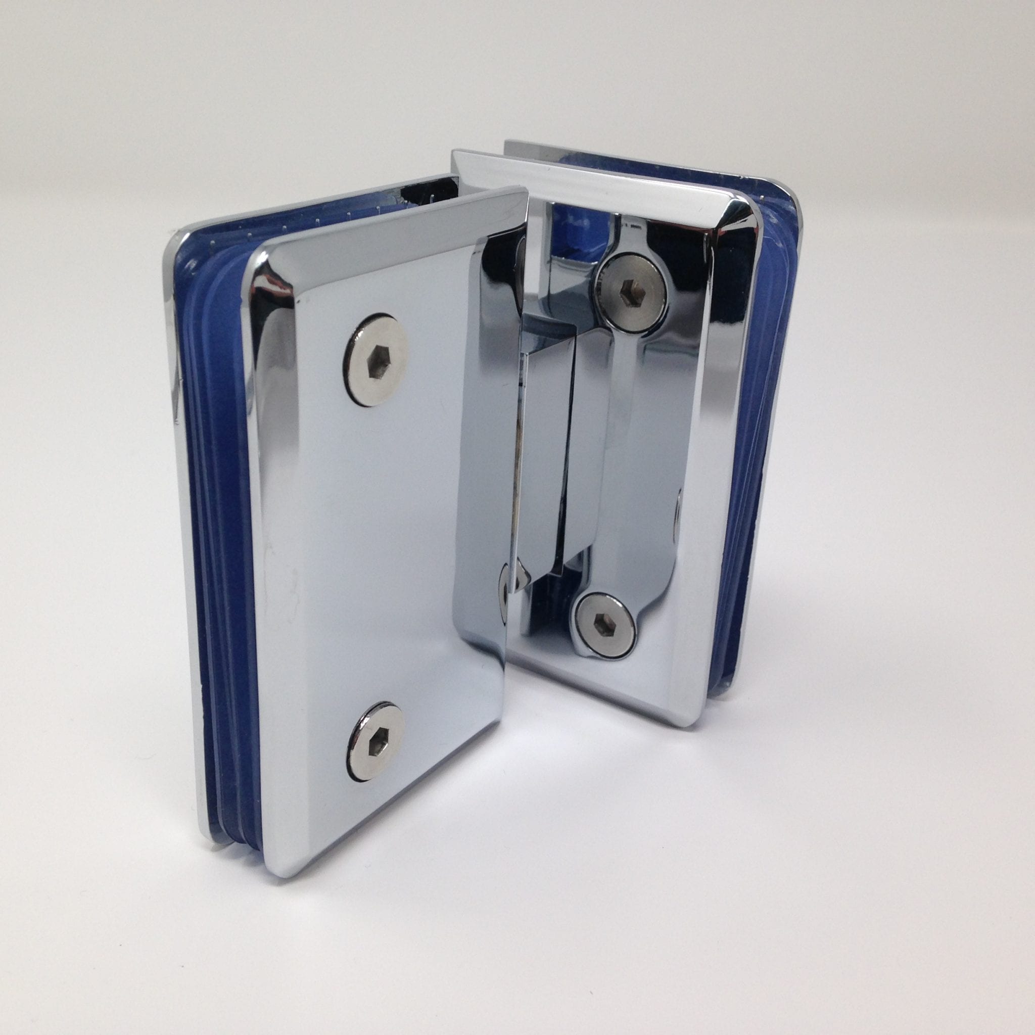Charnière à ouverture à 180° pour porte de cabine de douche ou pare douche, usinée dans du laiton massif et recouverte d’un fini chromé conférant ainsi une finition impeccable.