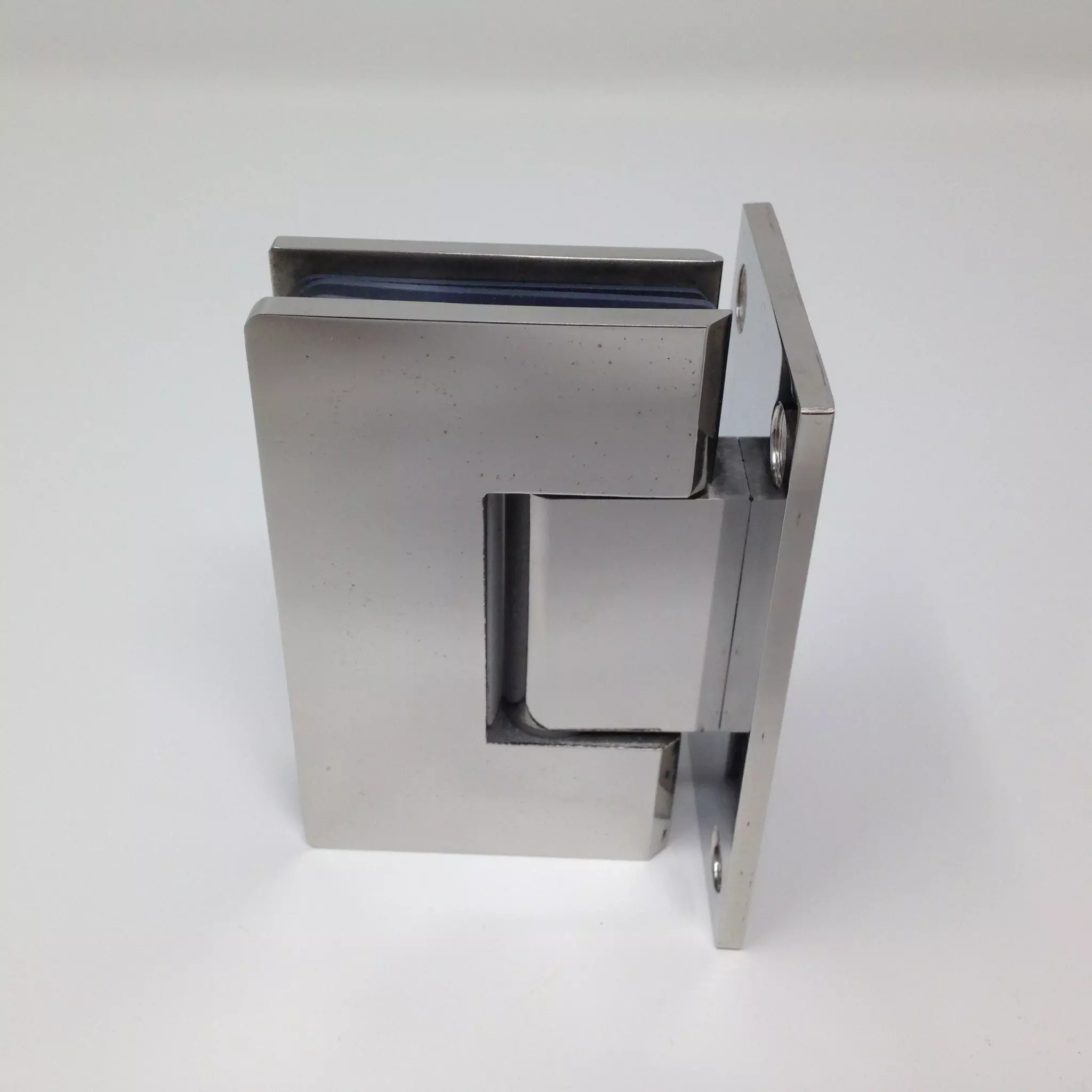 Charnière sur platine centrée pour porte de cabine de douche usinée dans du laiton massif et recouverte d’un fini chromé conférant ainsi une finition impeccable.