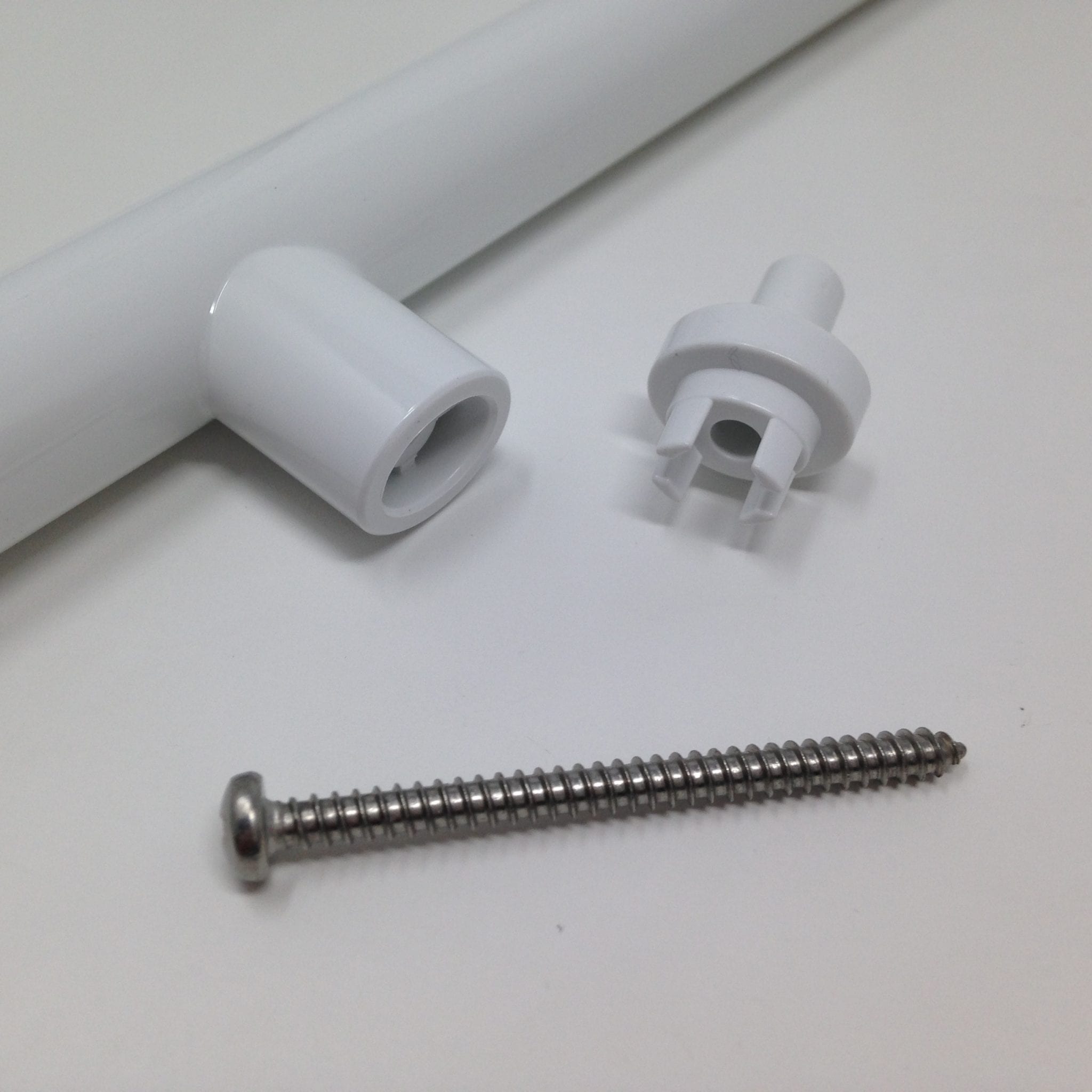 Ces poignées sont vendues avec ses 2 vis de serrage recouvertes par un bouton en PVC blanc. Une fois montée, la vis est invisible. Finition et rendu impeccables. Grande simplicité de montage et de serrage.