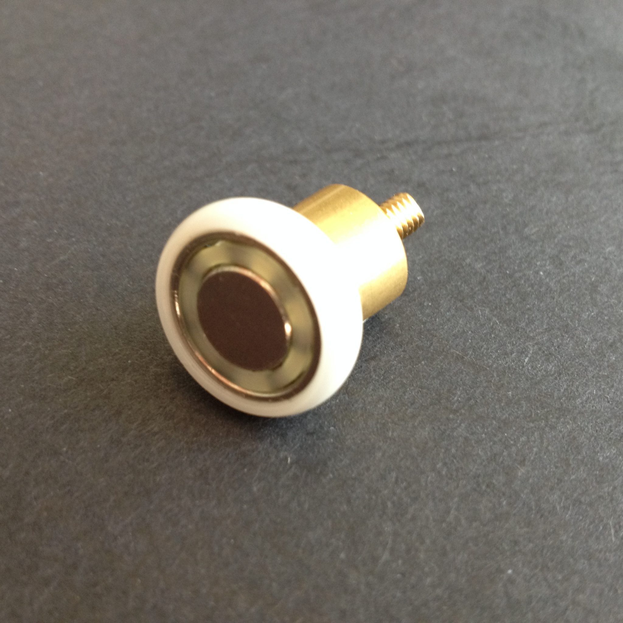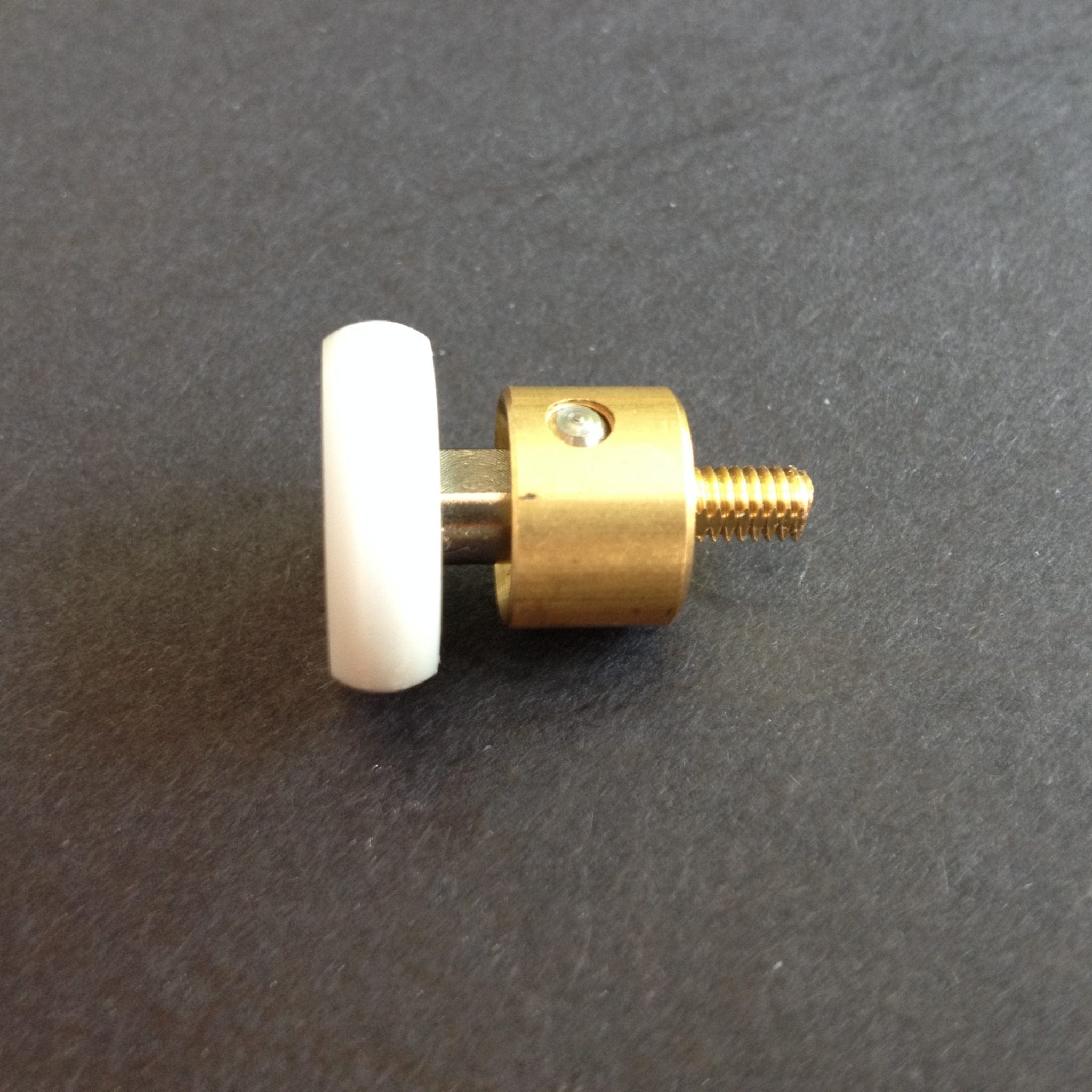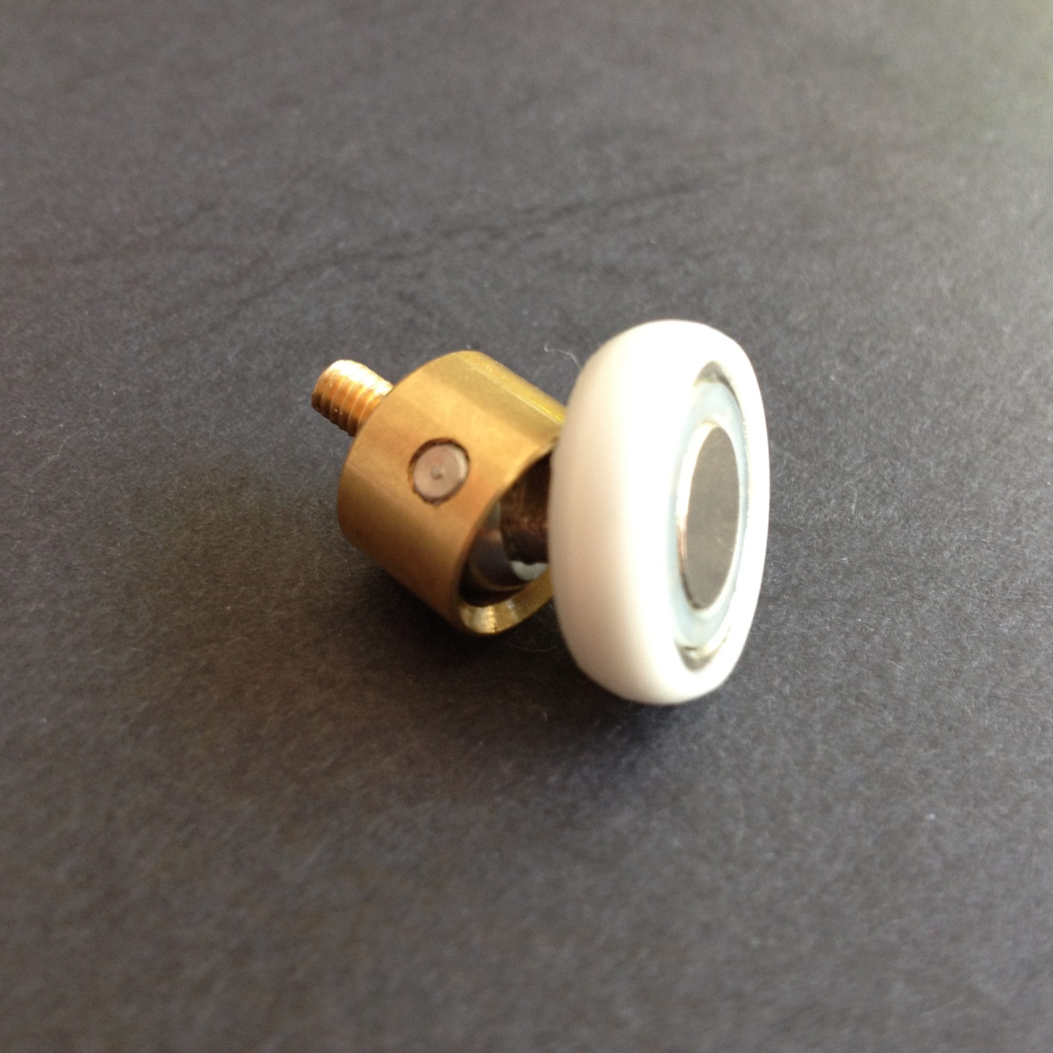 Roulette articulée simple pour porte coulissante de cabine de douche. Vendue à l’unité, cette roulette se compose d’un corps en laiton. Le bandage de la roulette est en téflon, recouvrant un roulement à billes étanche en acier inoxydable. Le choix et la qualité des matériaux employés offrent une utilisation optimale de confort, limitant ainsi le frottement et le bruit lors de la manipulation de la porte.