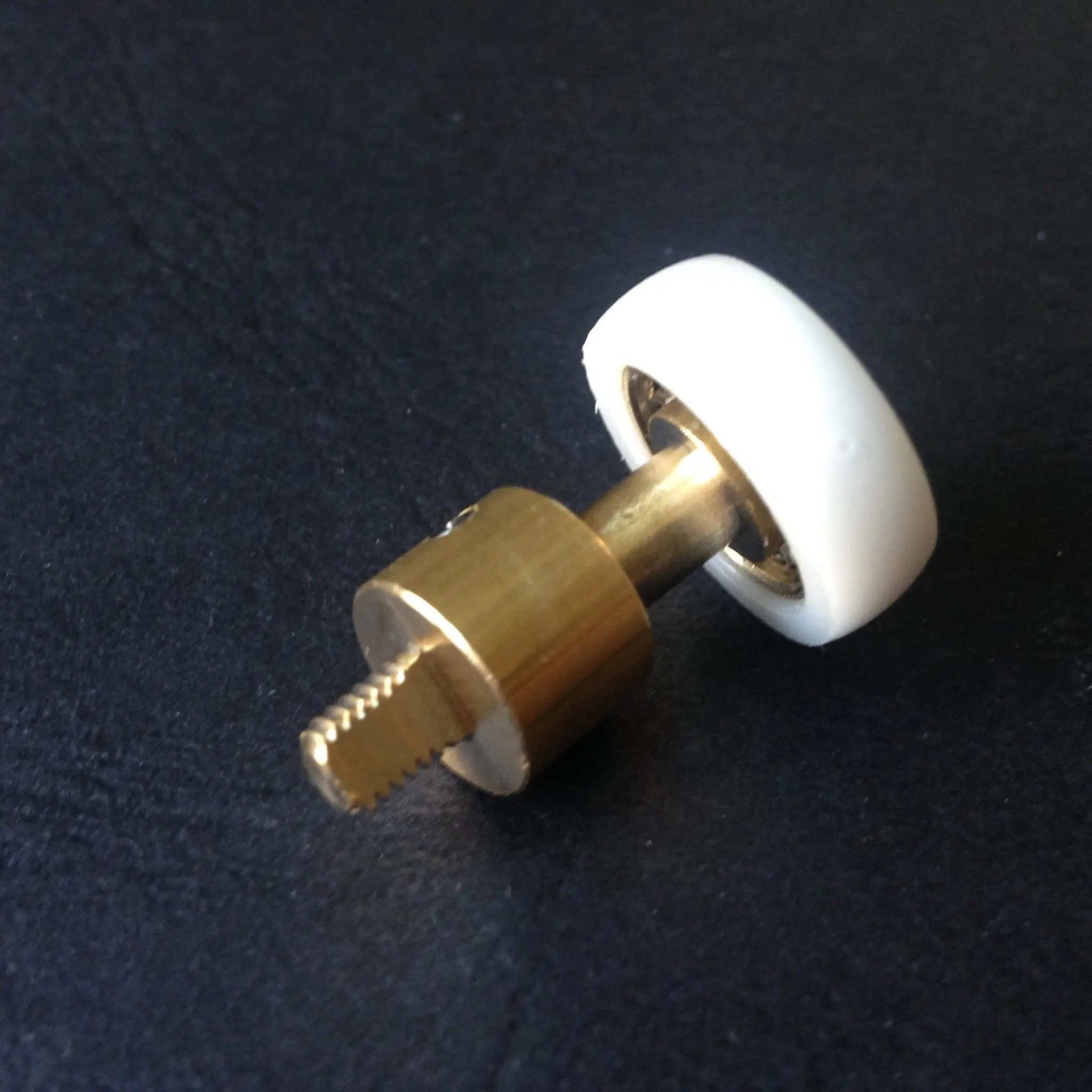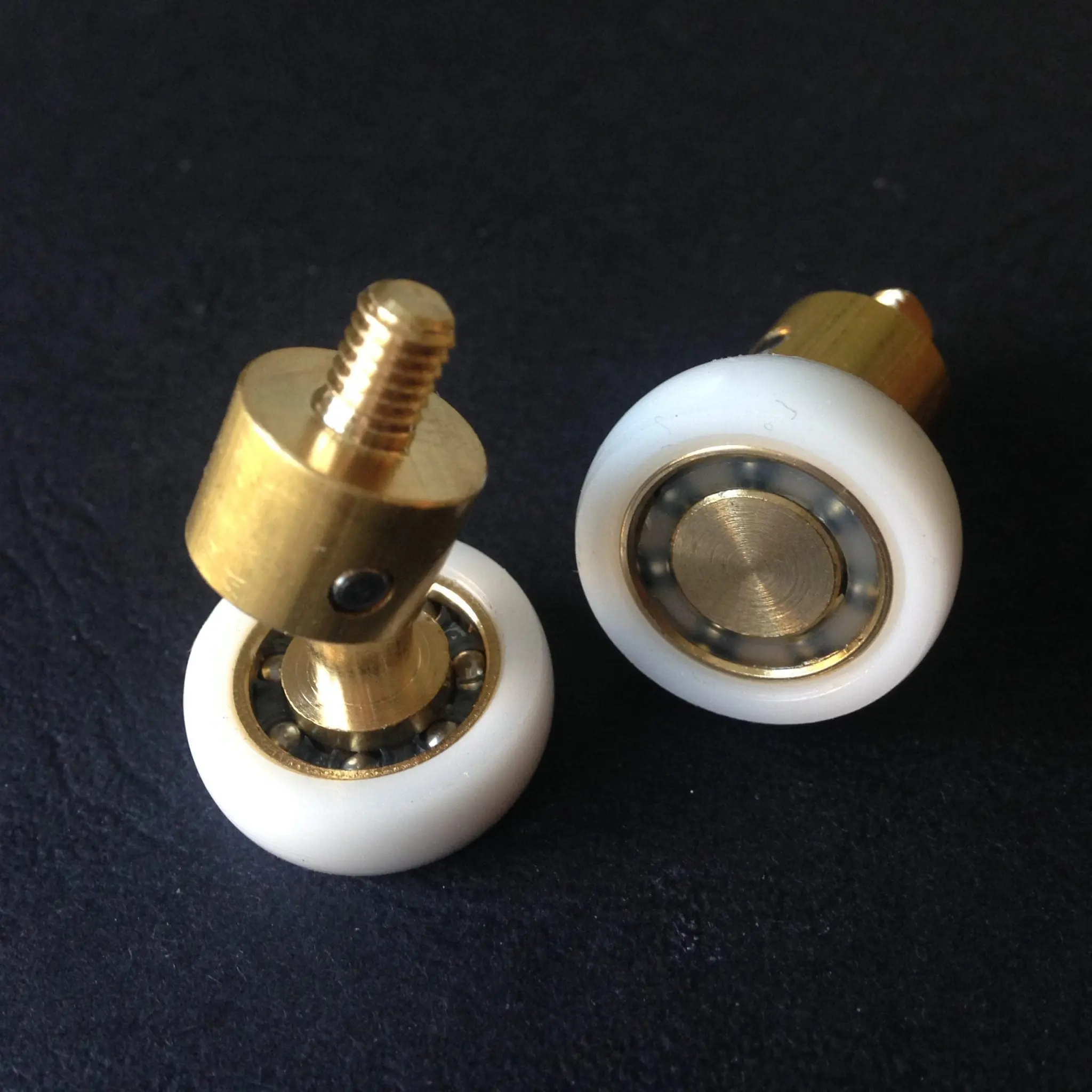 Roulette articulée simple pour porte coulissante de cabine de douche. Vendue à l’unité, cette roulette se compose d’un corps en laiton. Le bandage plat de la roulette est en téflon, recouvrant un roulement à billes étanche en acier inoxydable. Le choix et la qualité des matériaux employés offrent une utilisation optimale de confort, limitant ainsi le frottement et le bruit lors de la manipulation de la porte.