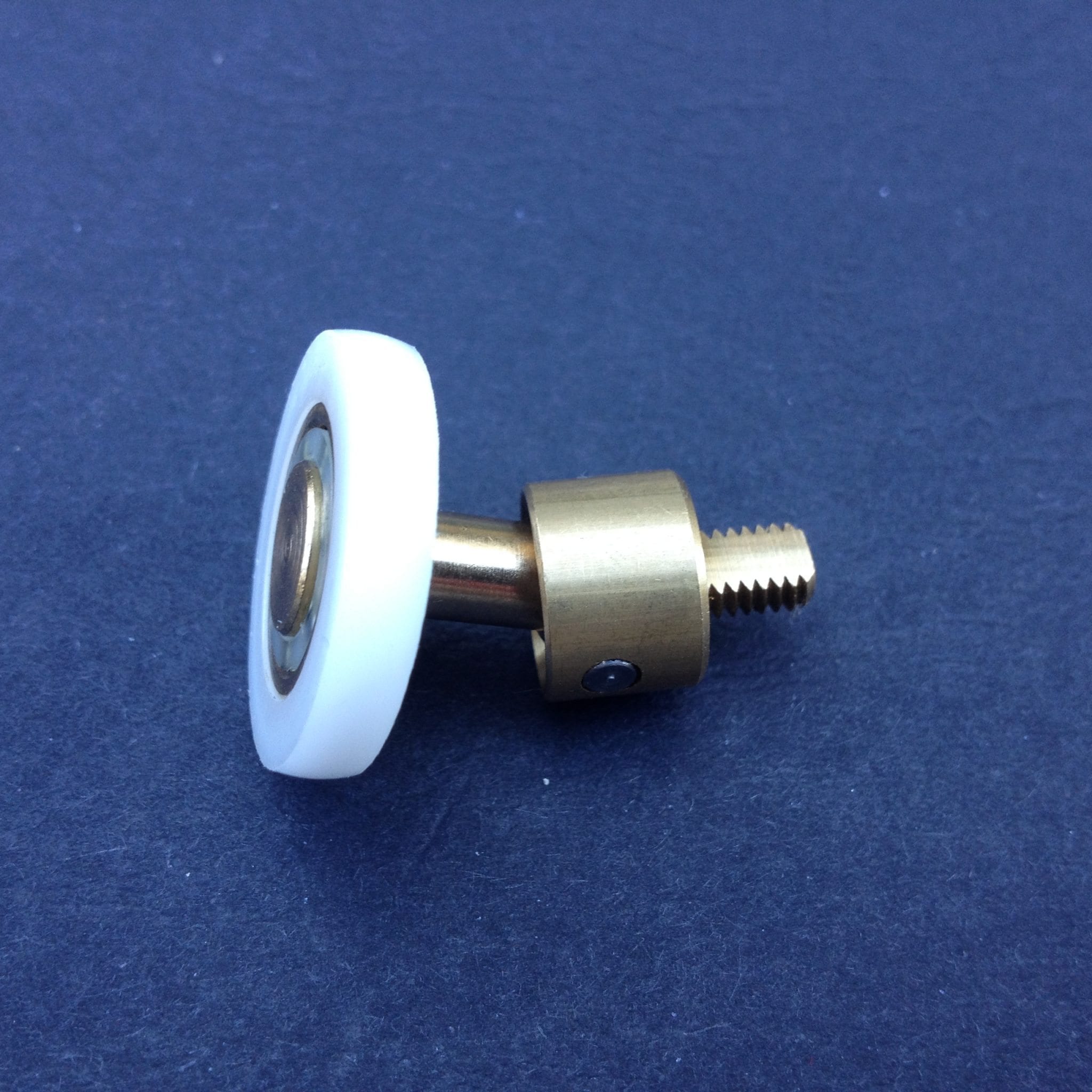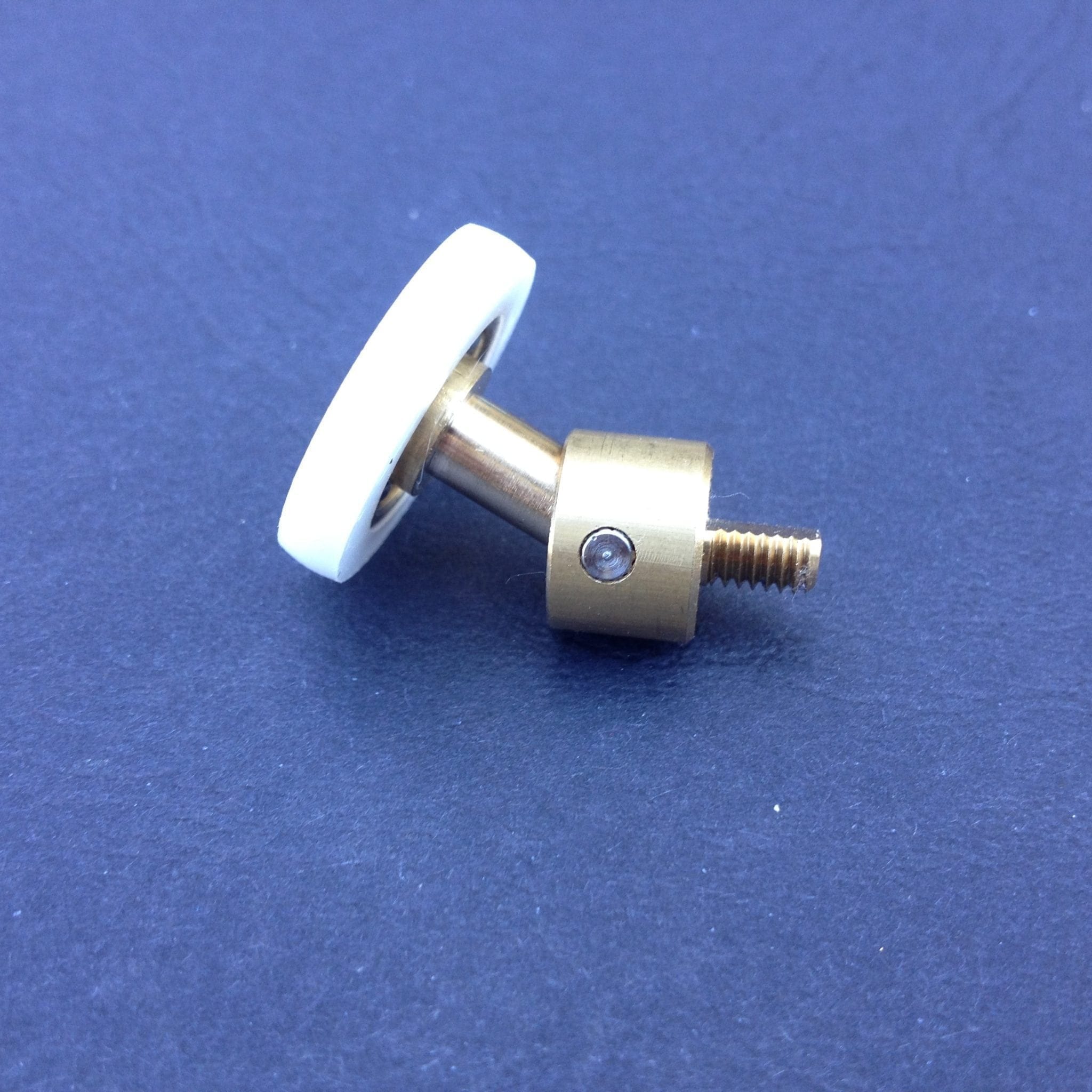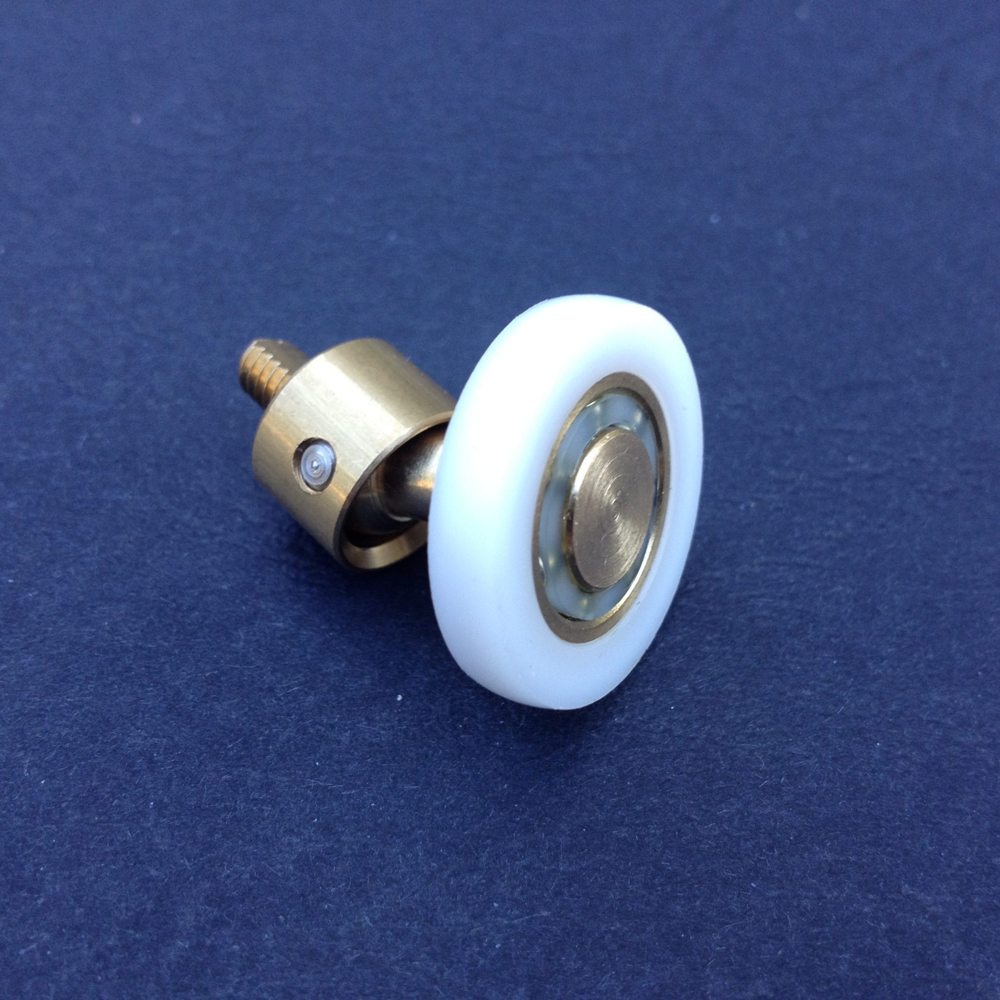Roulette articulée simple pour porte coulissante de cabine de douche. Vendue à l’unité, cette roulette se compose d’un corps en laiton. Le bandage de la roulette est en téflon, recouvrant un roulement à billes étanche en acier inoxydable. Le choix et la qualité des matériaux employés offrent une utilisation optimale de confort, limitant ainsi le frottement et le bruit lors de la manipulation de la porte.