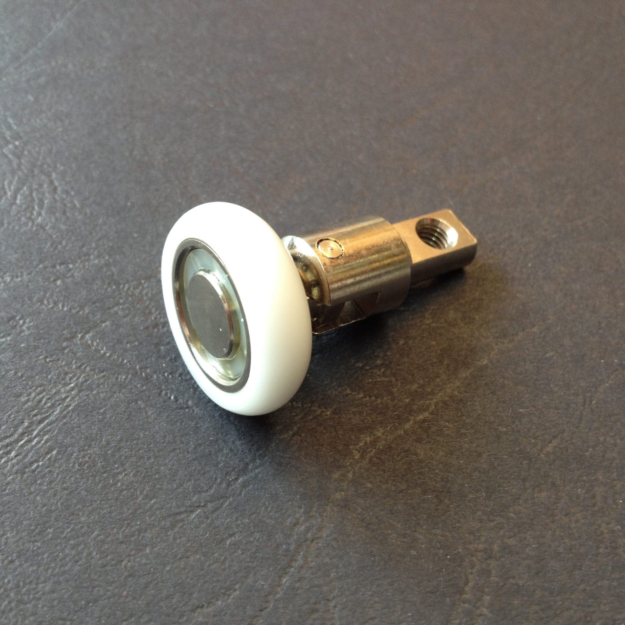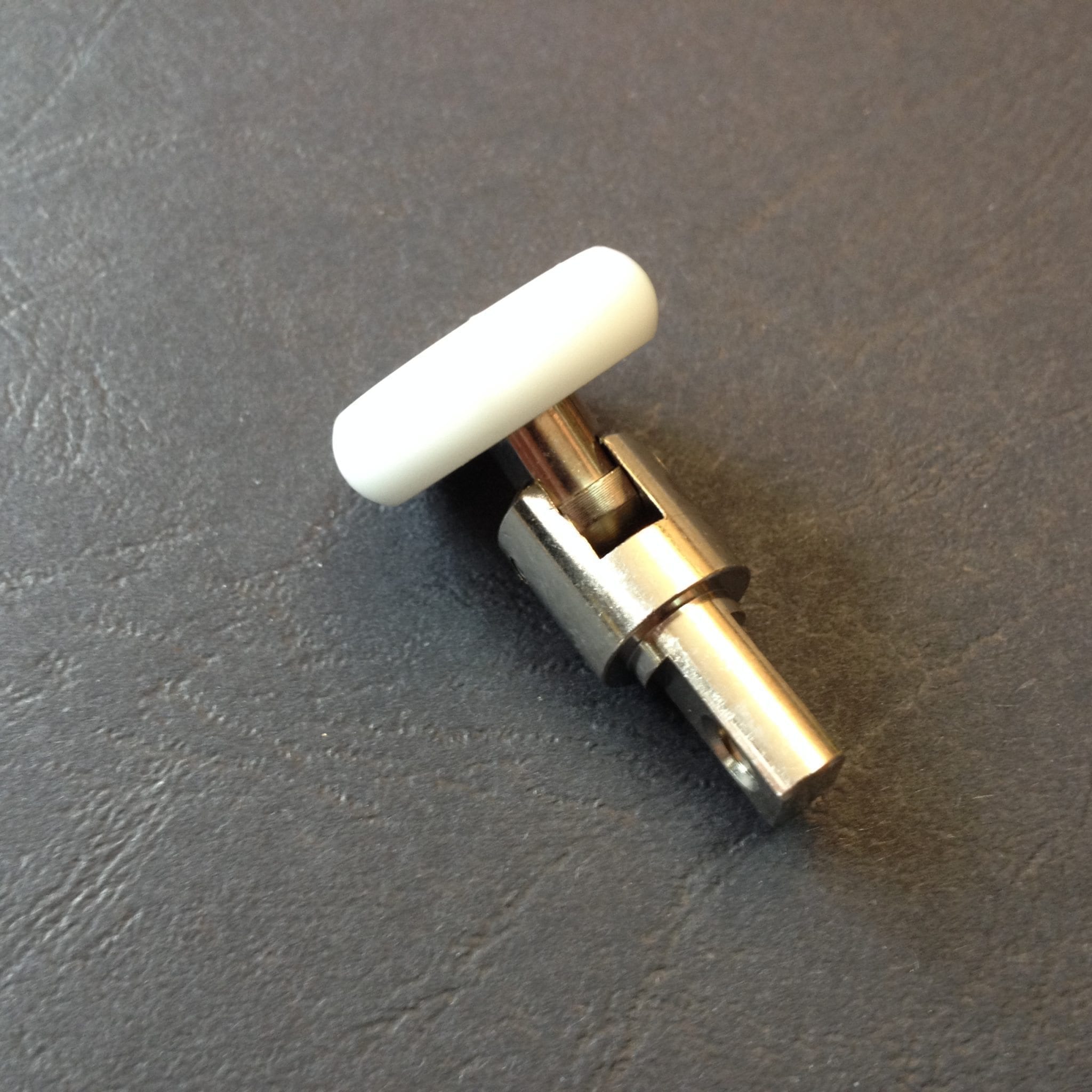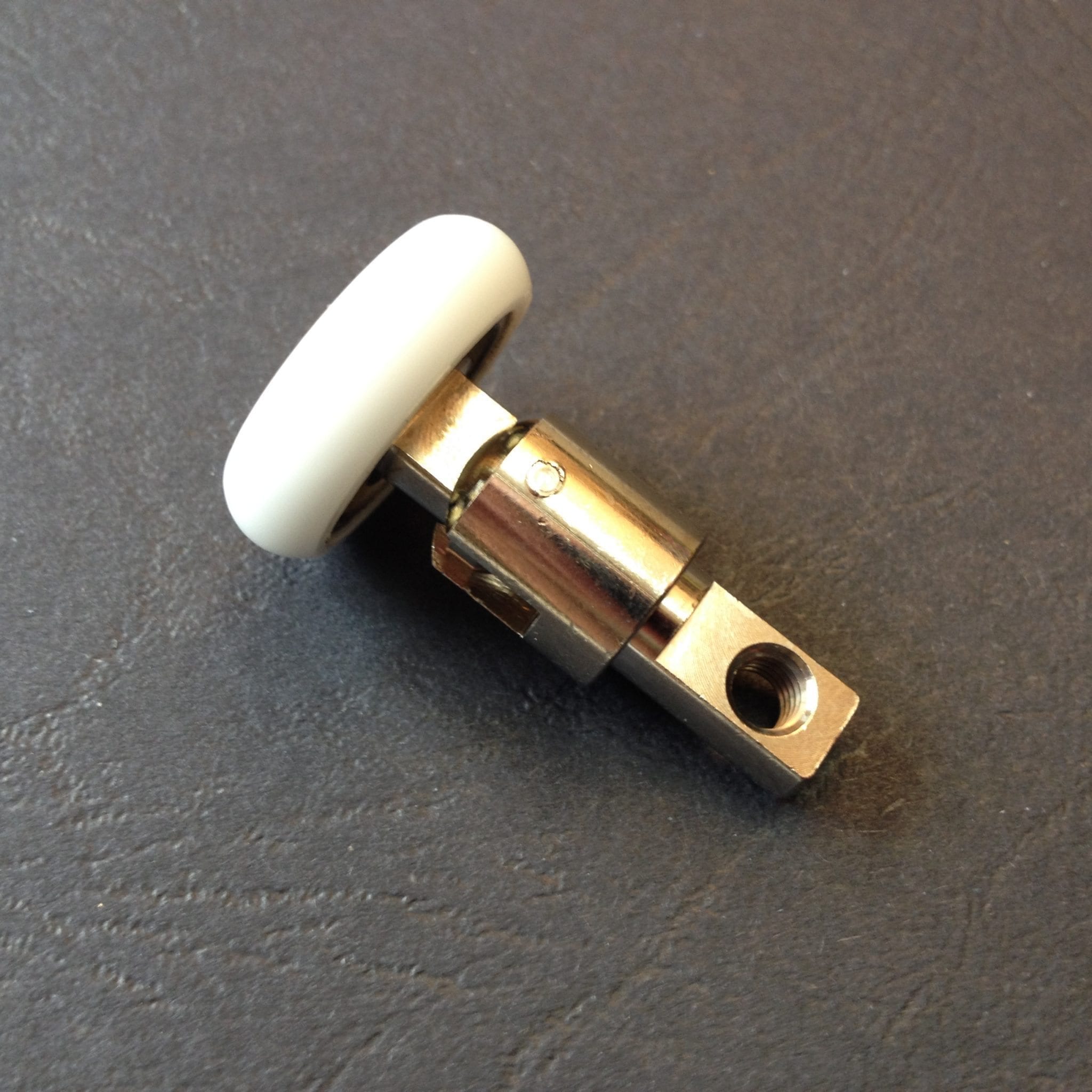 Roulette articulée simple pour porte coulissante de cabine de douche. Vendue à l’unité, cette roulette se compose d’un corps en laiton. Le bandage de la roulette est en téflon, recouvrant un roulement à billes étanche en acier inoxydable. Le choix et la qualité des matériaux employés offrent une utilisation optimale de confort, limitant ainsi le frottement et le bruit lors de la manipulation de la porte.