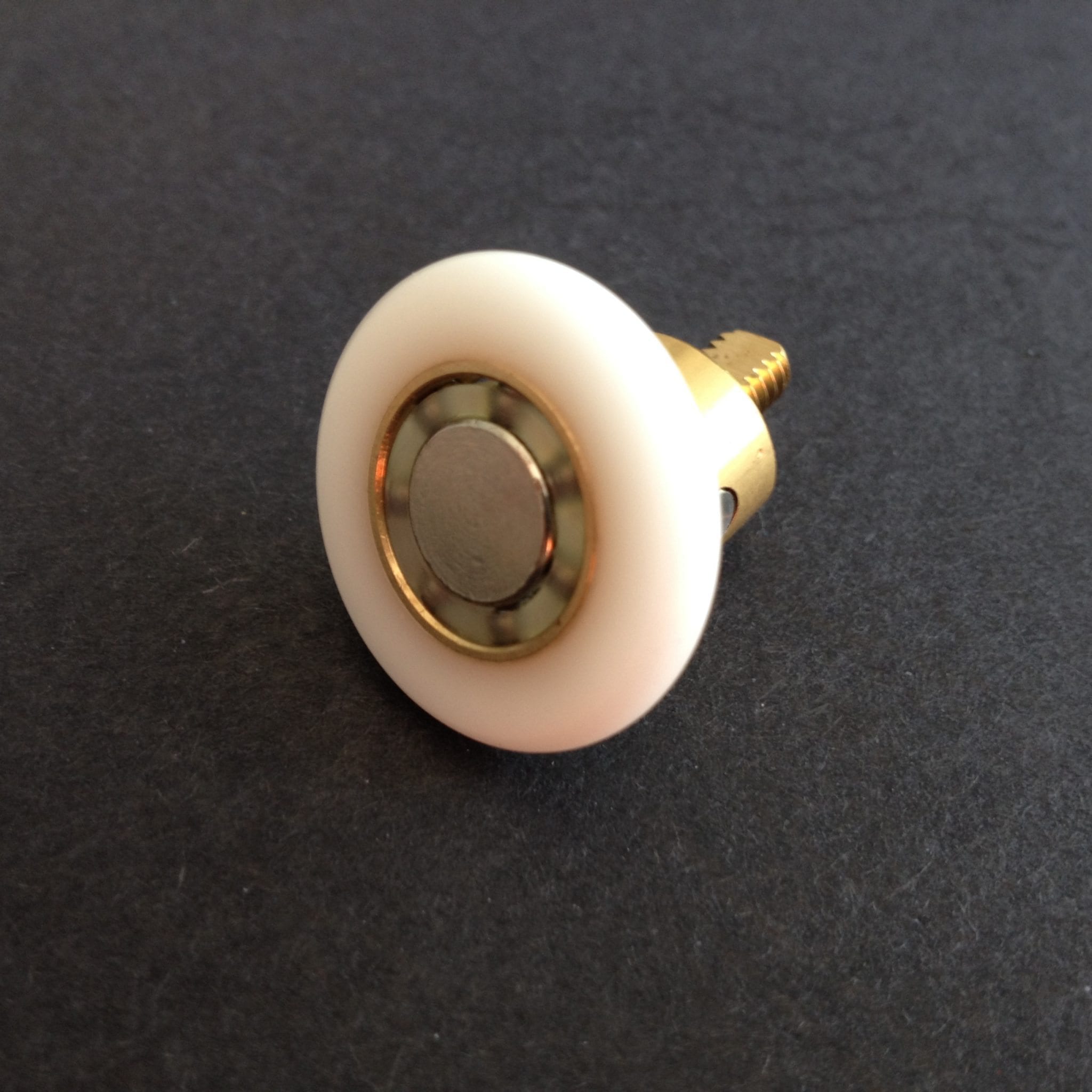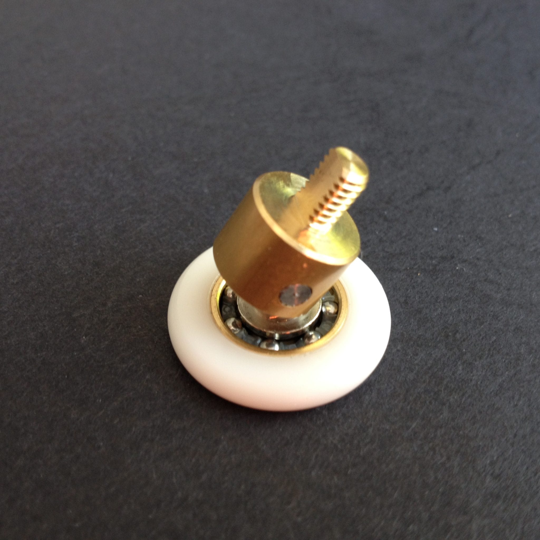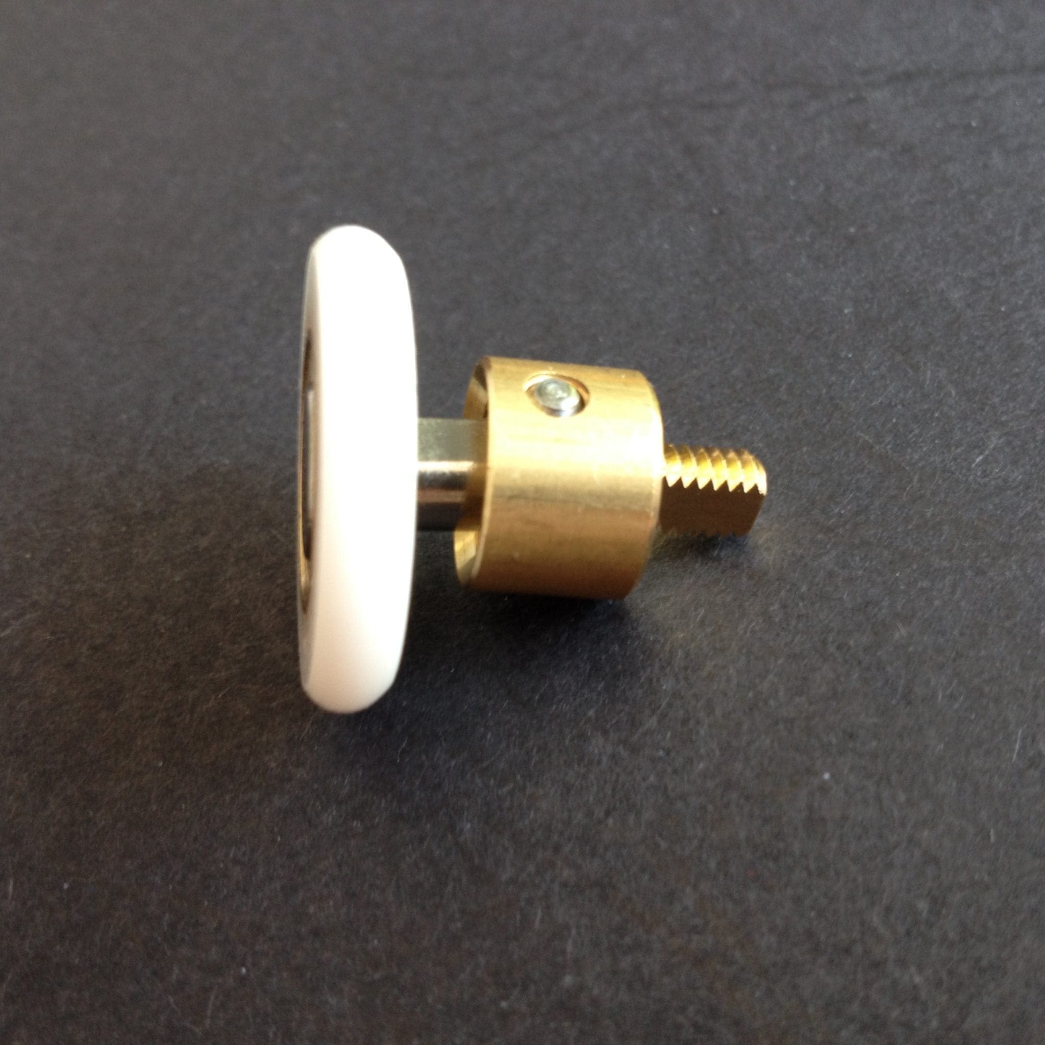 Roulette articulée simple pour porte coulissante de cabine de douche. Vendue à l’unité, cette roulette se compose d’un corps en laiton. Le bandage de la roulette est en téflon, recouvrant un roulement à billes étanche en acier inoxydable. Le choix et la qualité des matériaux employés offrent une utilisation optimale de confort, limitant ainsi le frottement et le bruit lors de la manipulation de la porte.