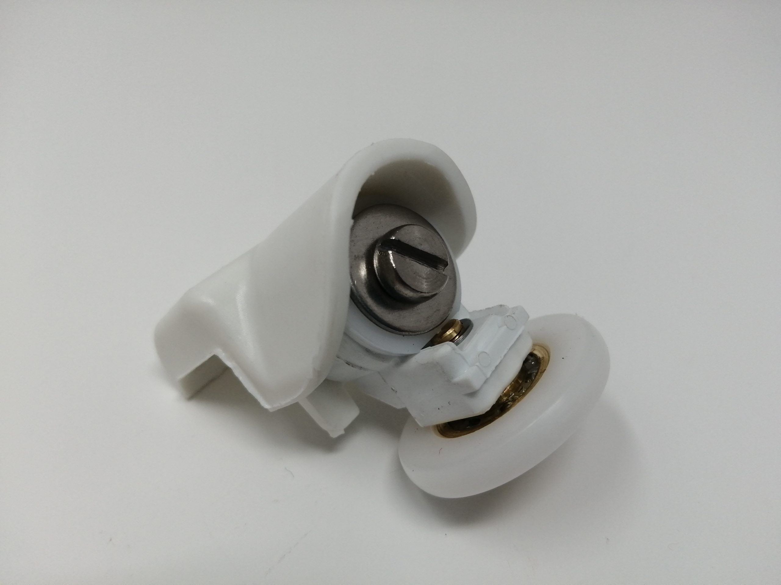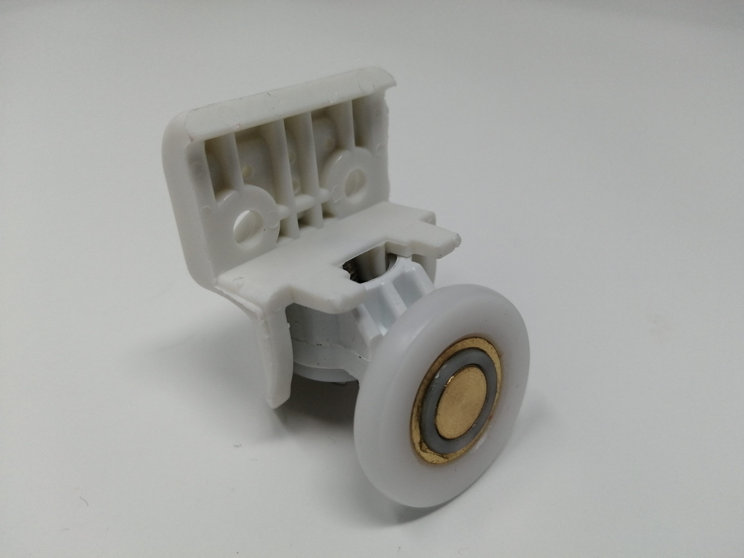 Roulette simple pour porte coulissante de cabine de douche. Vendue à l’unité, cette roulette se compose d’un corps en laiton et d’éléments de soutien en plastique type ABS et en laiton chromé. Le bandage de la roulette est en téflon, recouvrant un roulement à billes étanche en acier inoxydable. Le choix et la qualité des matériaux employés offrent une utilisation optimale de confort, limitant ainsi le frottement et le bruit lors de la manipulation de la porte.