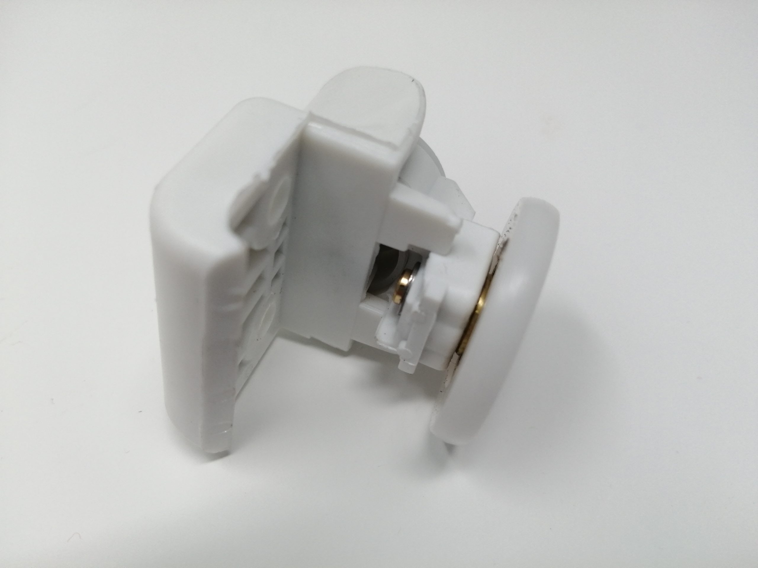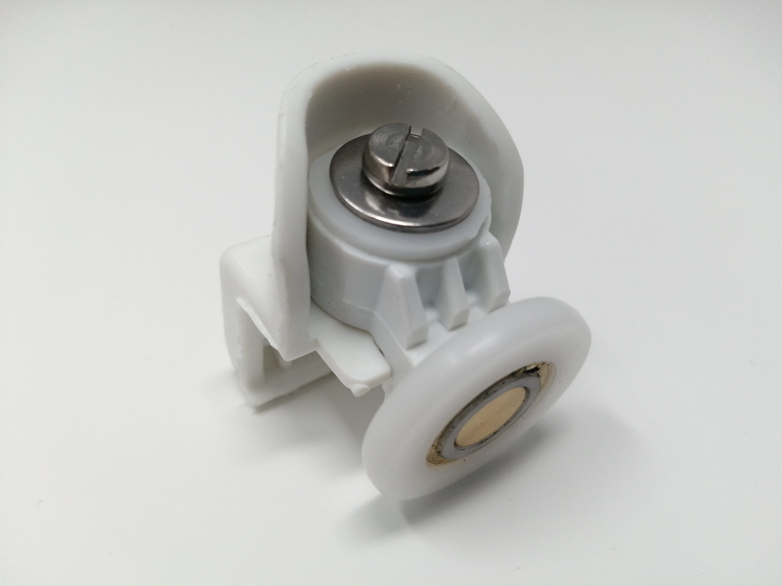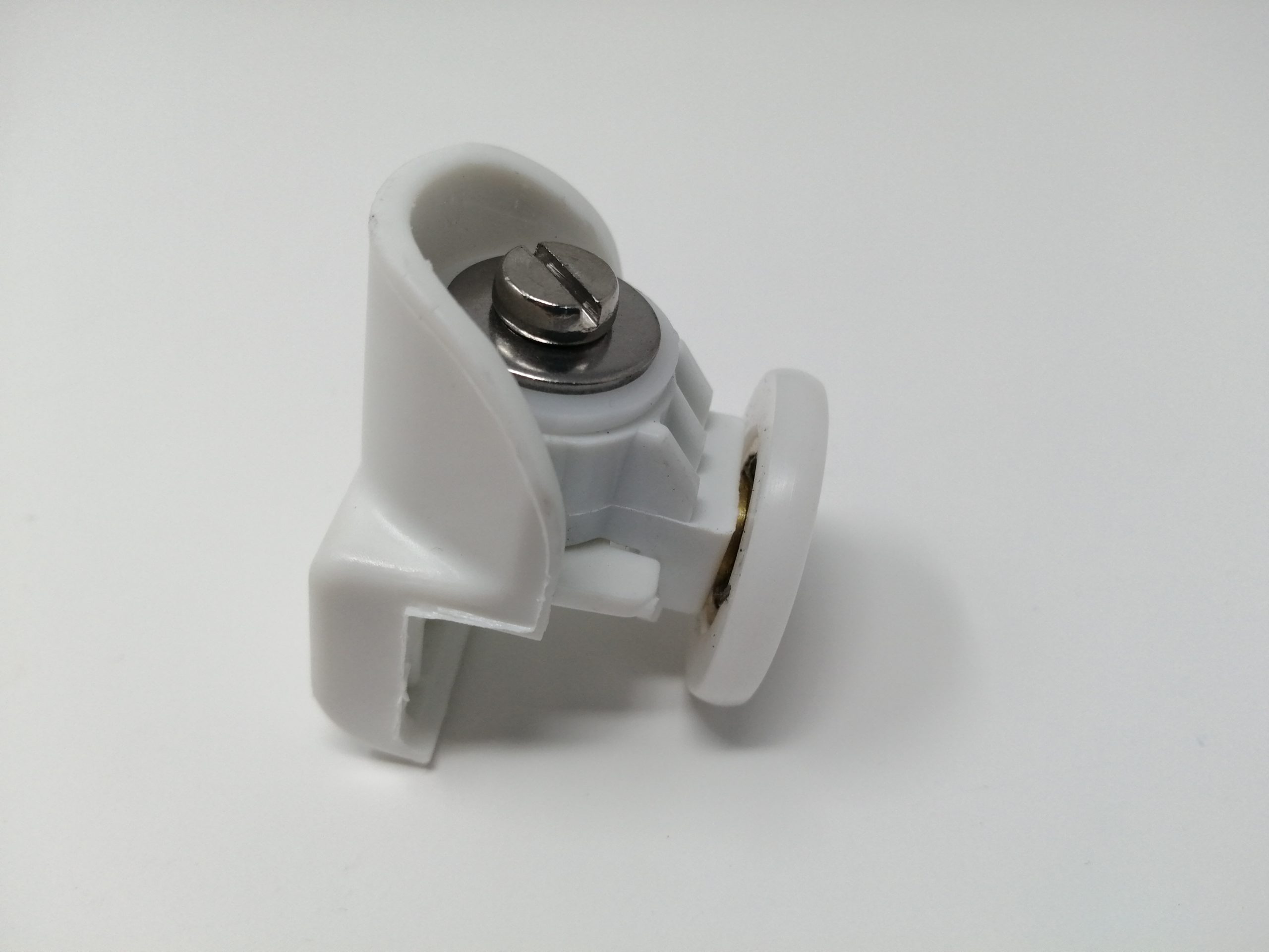 Roulette simple pour porte coulissante de cabine de douche. Vendue à l’unité, cette roulette se compose d’un corps en laiton et d’éléments de soutien en plastique type ABS et en laiton chromé. Le bandage de la roulette est en téflon, recouvrant un roulement à billes étanche en acier inoxydable. Le choix et la qualité des matériaux employés offrent une utilisation optimale de confort, limitant ainsi le frottement et le bruit lors de la manipulation de la porte.