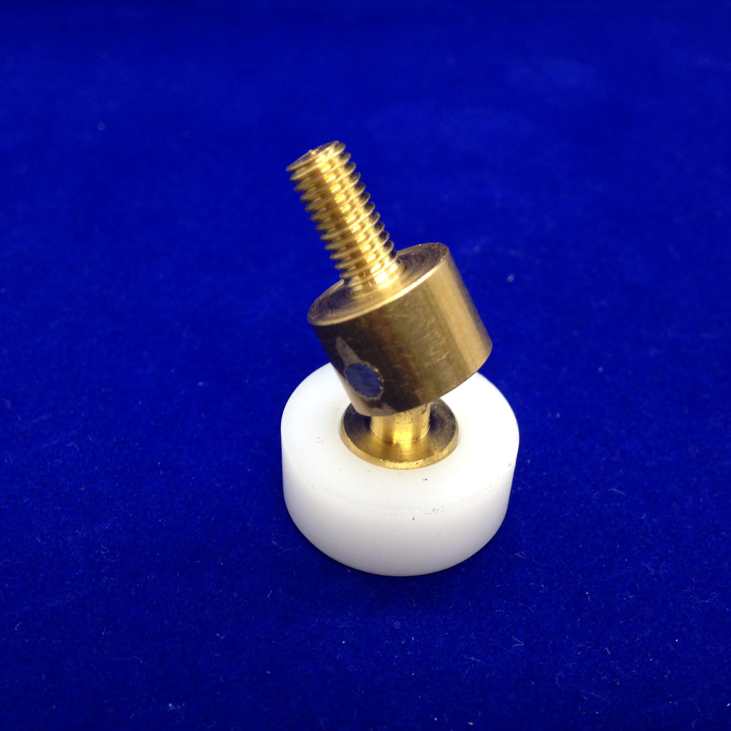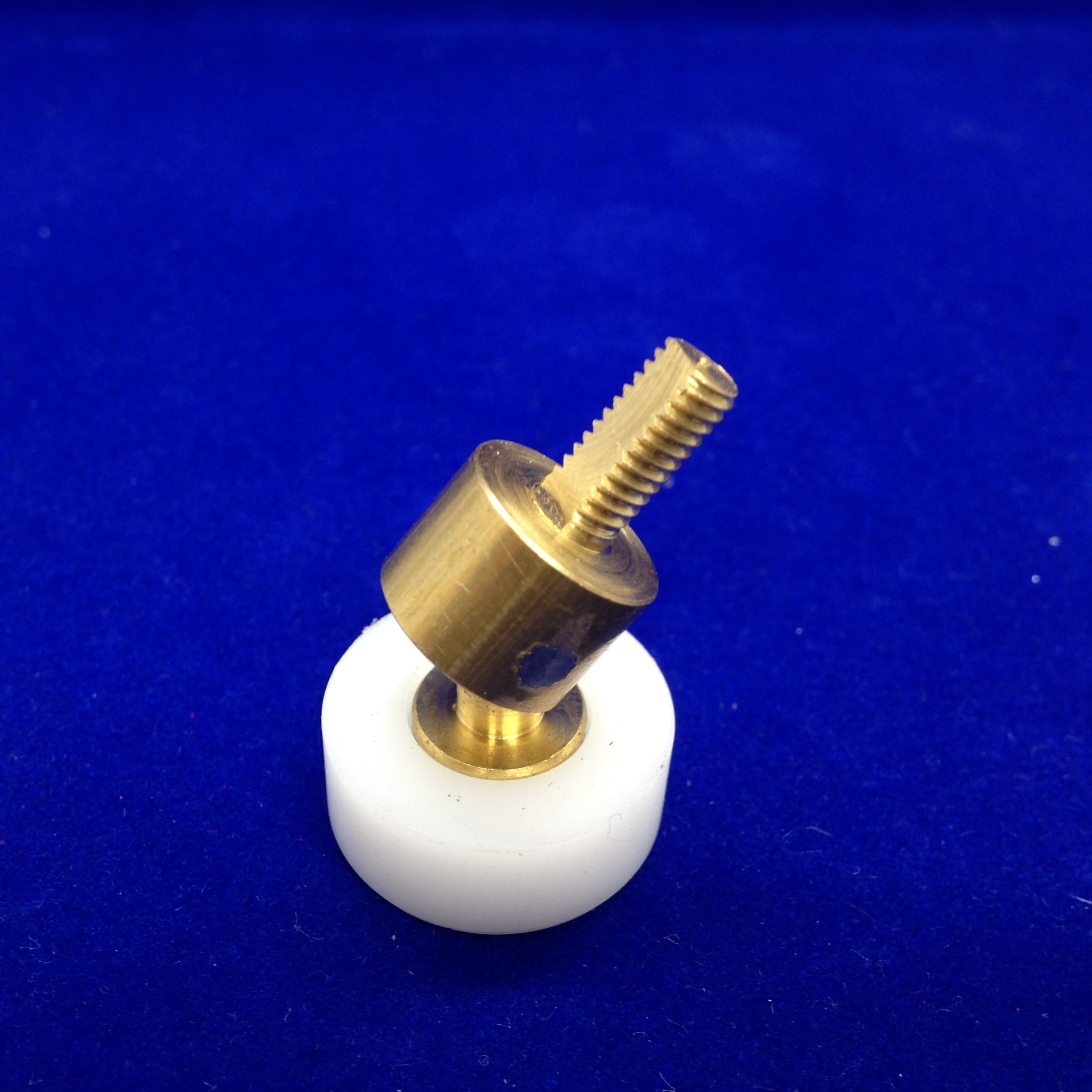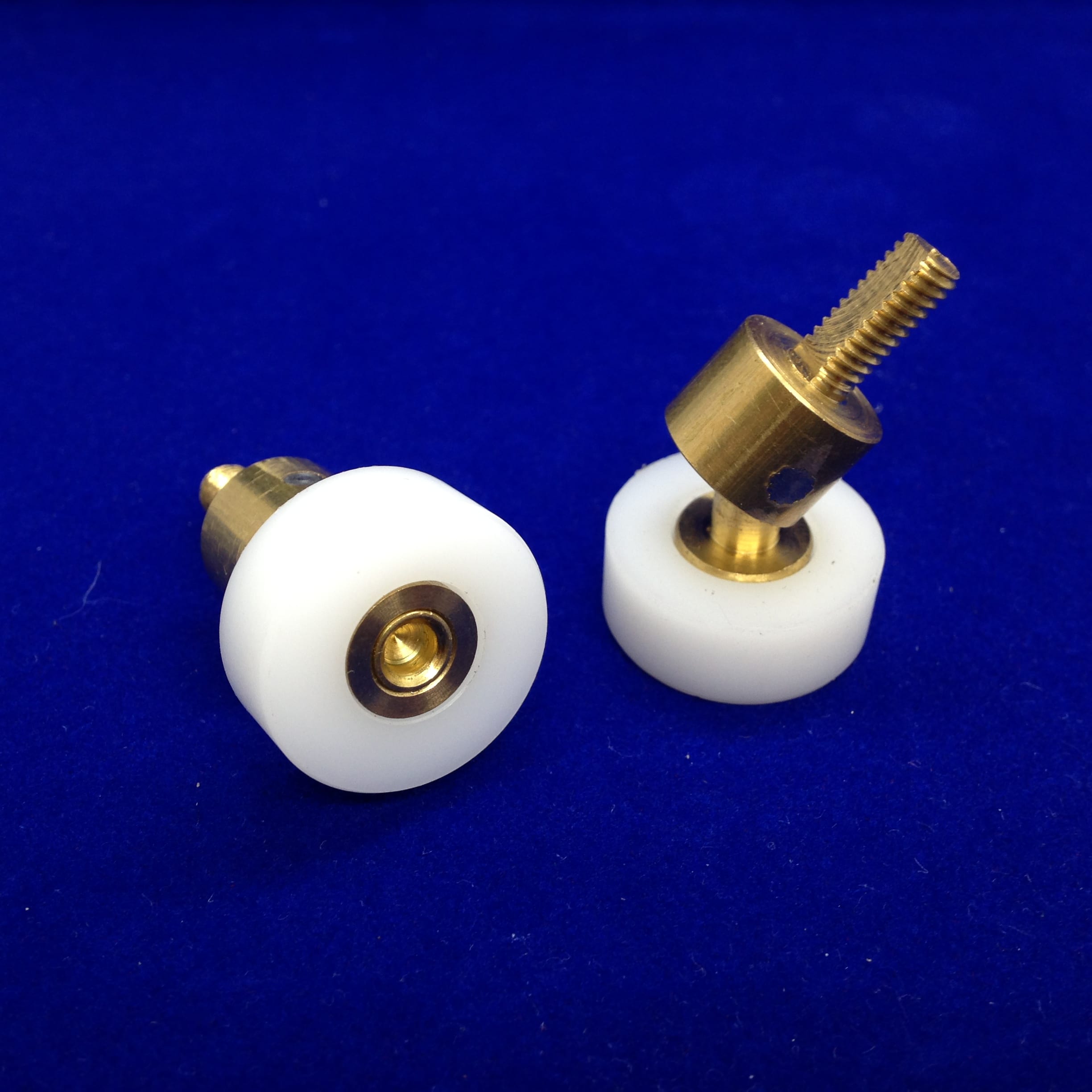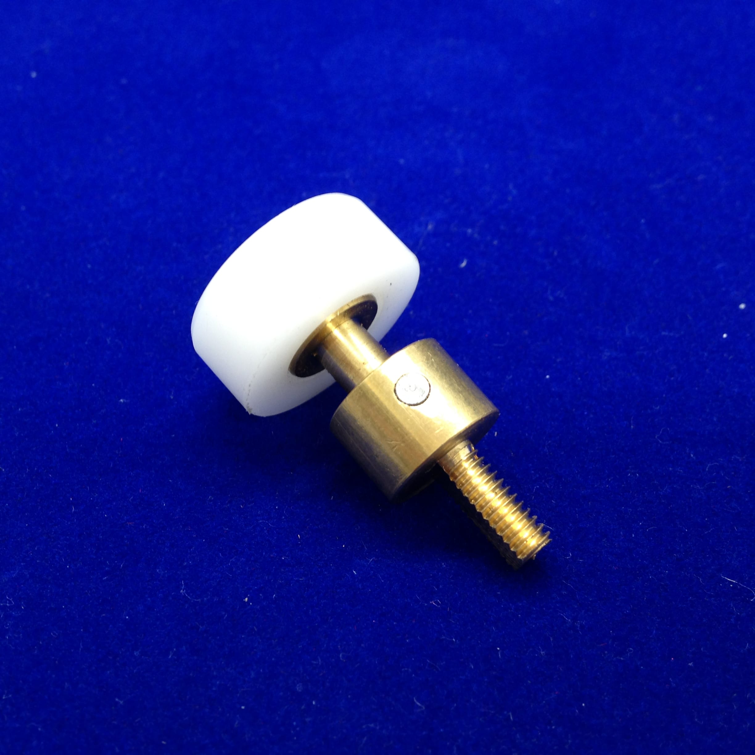 Roulette articulée simple pour porte coulissante de cabine de douche. Vendue par lot de 2, cette roulette se compose d’un corps en laiton. Le bandage plat de la roulette est en téflon, recouvrant un roulement à billes étanche en acier inoxydable. Le choix et la qualité des matériaux employés offrent une utilisation optimale de confort, limitant ainsi le frottement et le bruit lors de la manipulation de la porte.