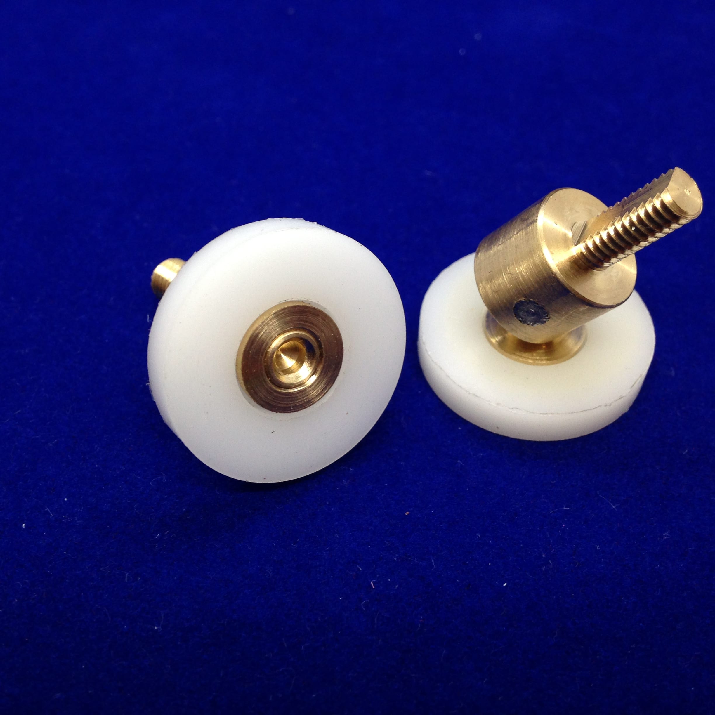 Roulette articulée simple pour porte coulissante de cabine de douche. Vendue par lot de 2, cette roulette se compose d’un corps en laiton. Le bandage plat de la roulette est en téflon, recouvrant un roulement à billes étanche en acier inoxydable. Le choix et la qualité des matériaux employés offrent une utilisation optimale de confort, limitant ainsi le frottement et le bruit lors de la manipulation de la porte.