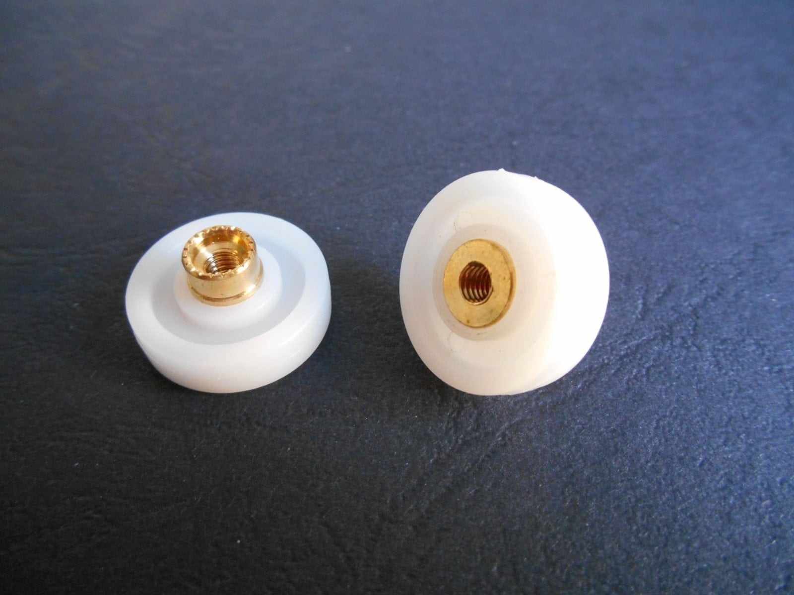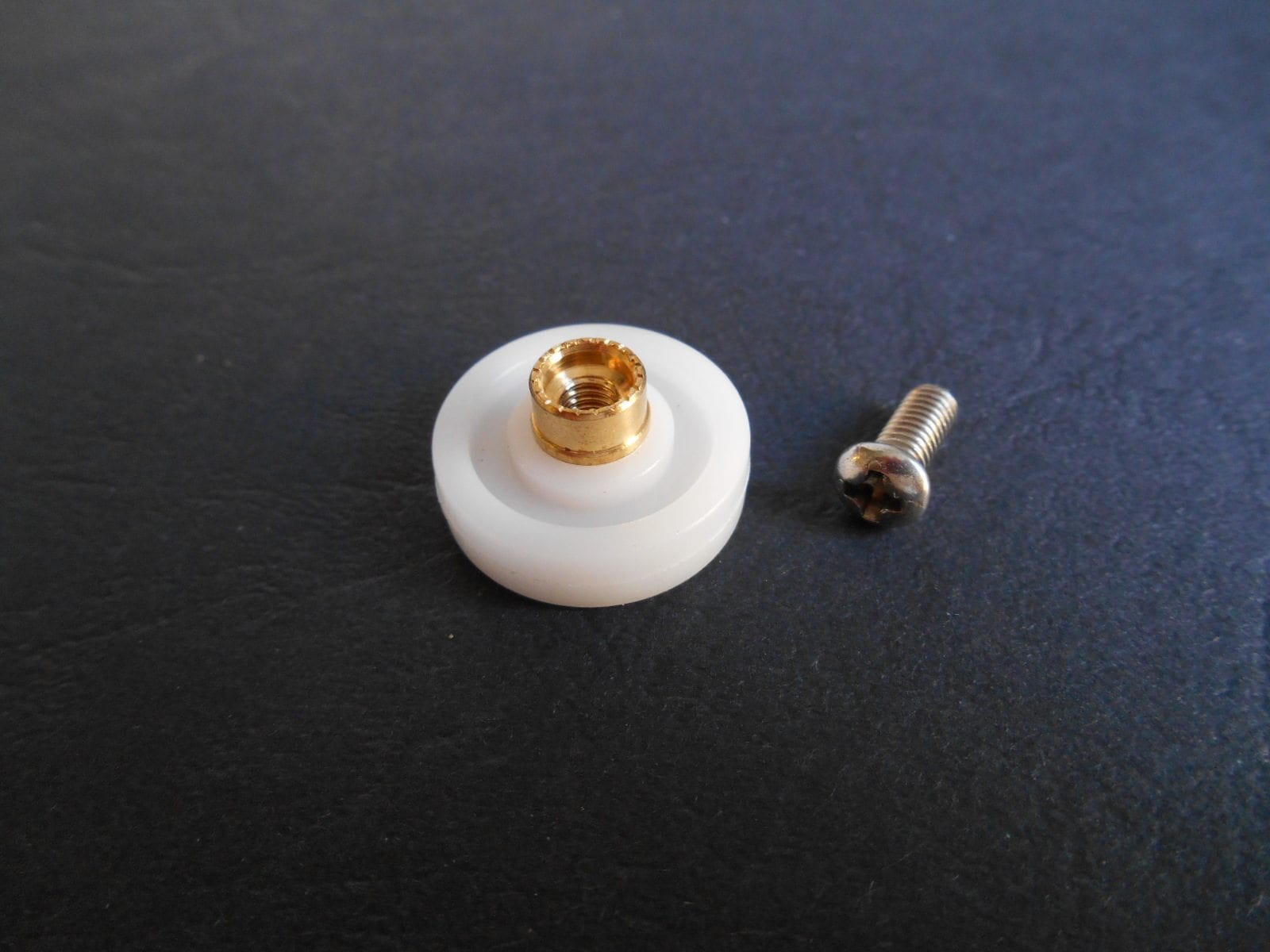 Roulette droite simple à bandage plat pour porte coulissante de cabine de douche. Vendues par lot de 4, ces roulettes se composent d’un corps en laiton ou en alliage de zinc et d’éléments de soutien en plastique type ABS. Le bandage de la roulette est en téflon, recouvrant un roulement à billes étanche en acier inoxydable. Le choix et la qualité des matériaux employés offrent une utilisation optimale de confort, limitant ainsi le frottement et le bruit lors de la manipulation de la porte.
