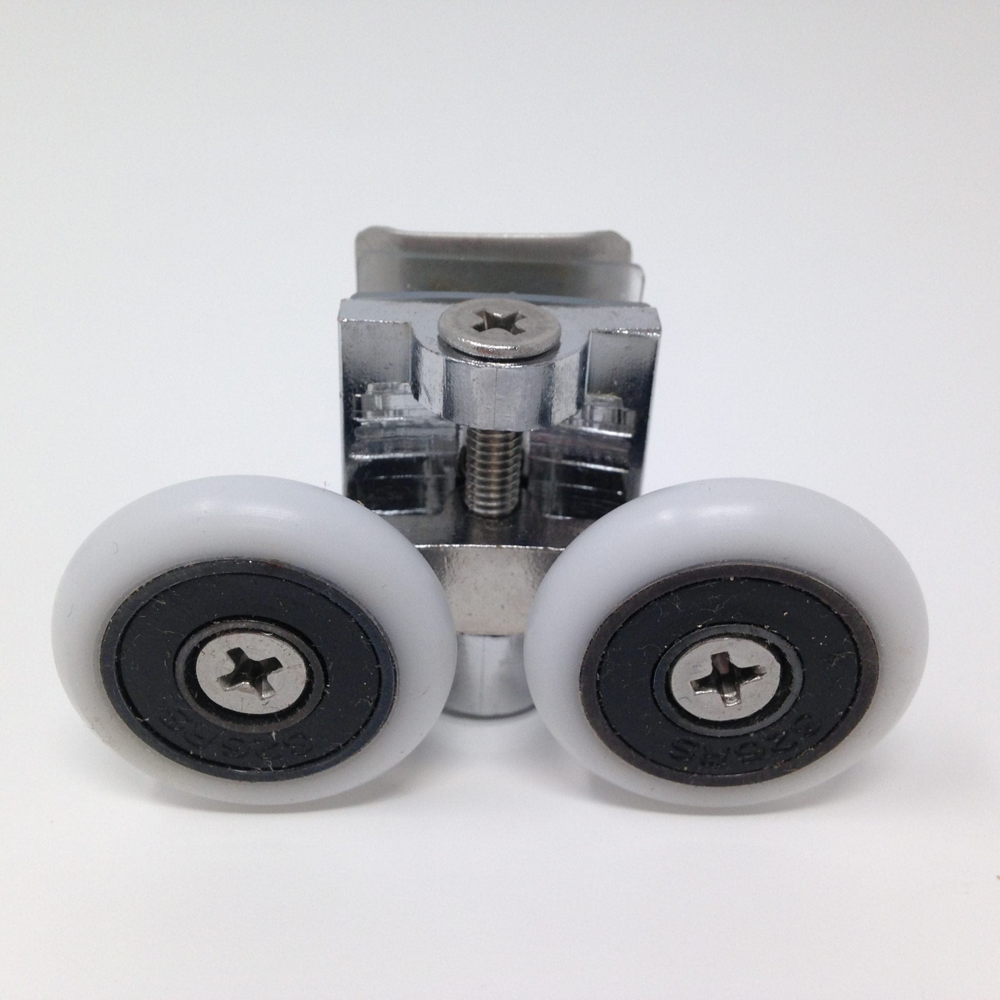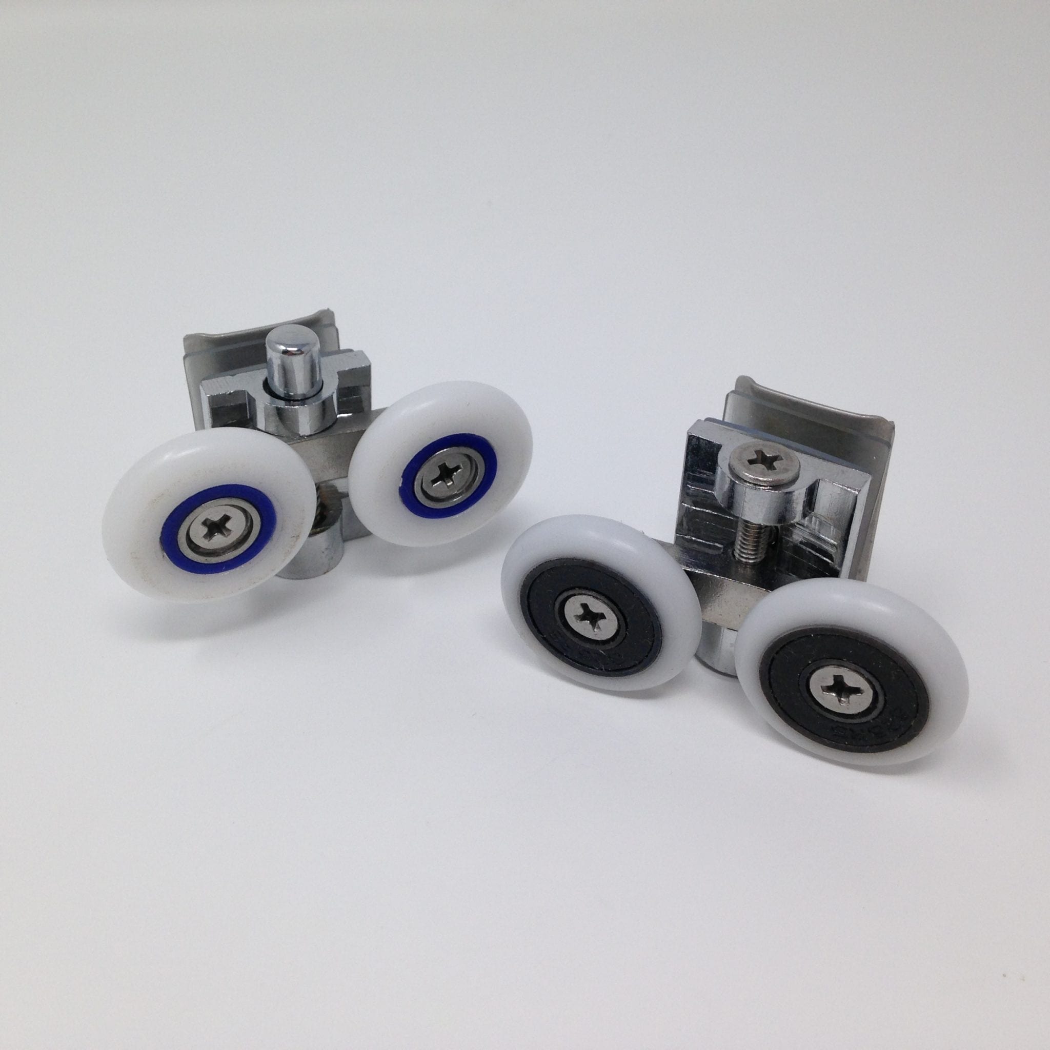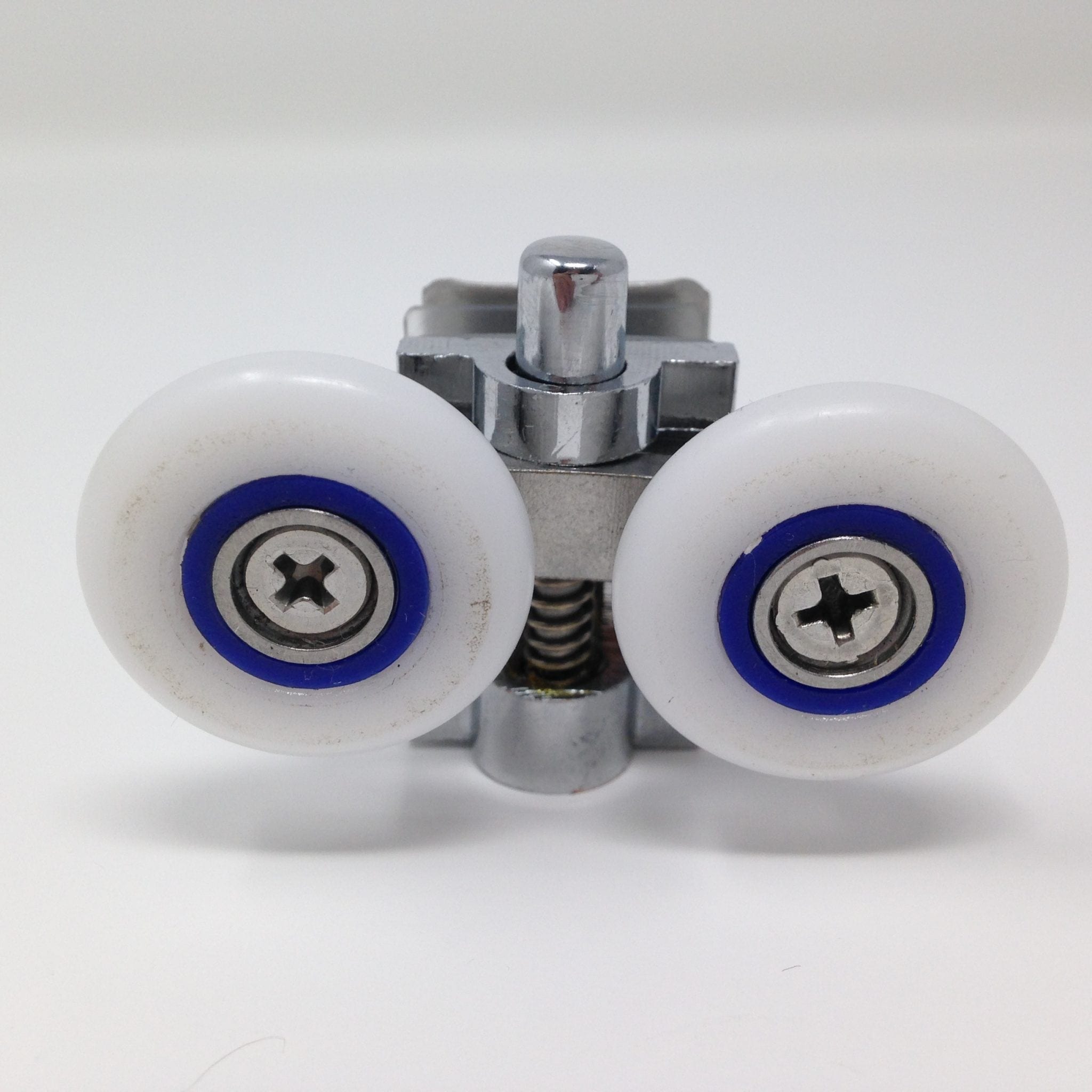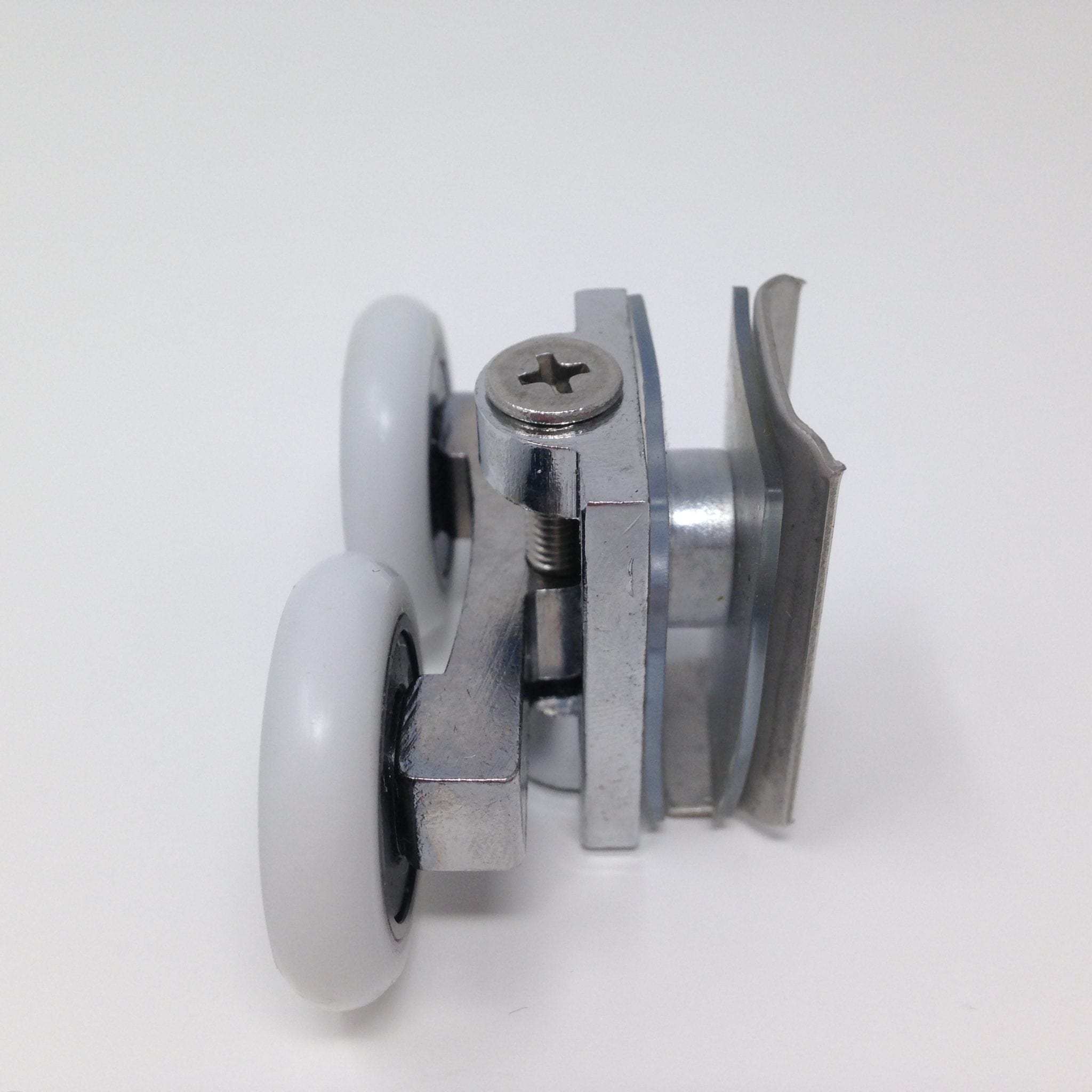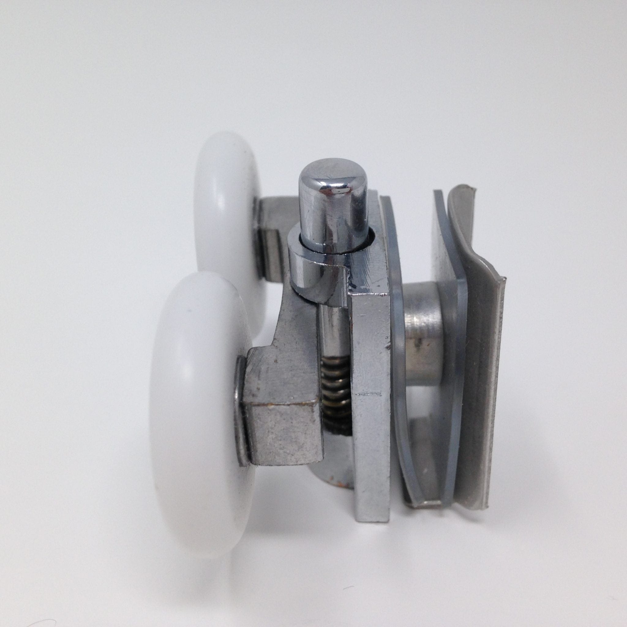 Roulette double basse pour porte coulissante de cabine de douche. Vendues par paire, ces roulettes se composent d’un corps en laiton ou en alliage de zinc et d’éléments de soutien en plastique type ABS. Le bandage de la roulette est en téflon, recouvrant un roulement à billes étanche en acier inoxydable. Le choix et la qualité des matériaux employés offrent une utilisation optimale de confort, limitant ainsi le frottement et le bruit lors de la manipulation de la porte.