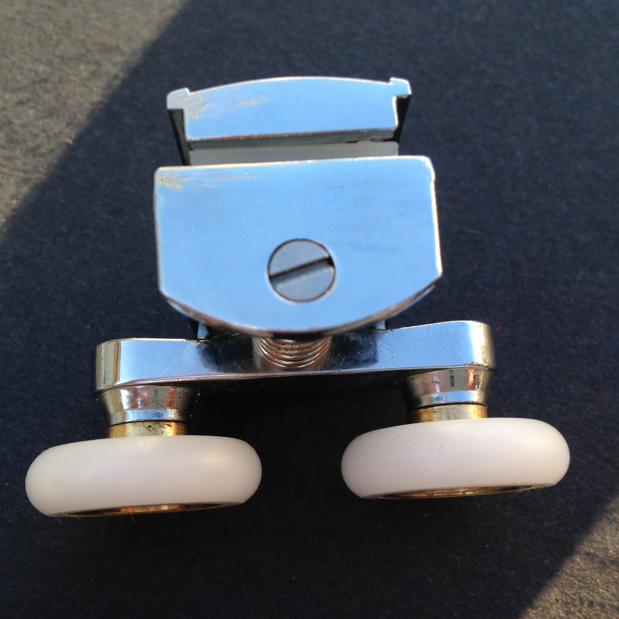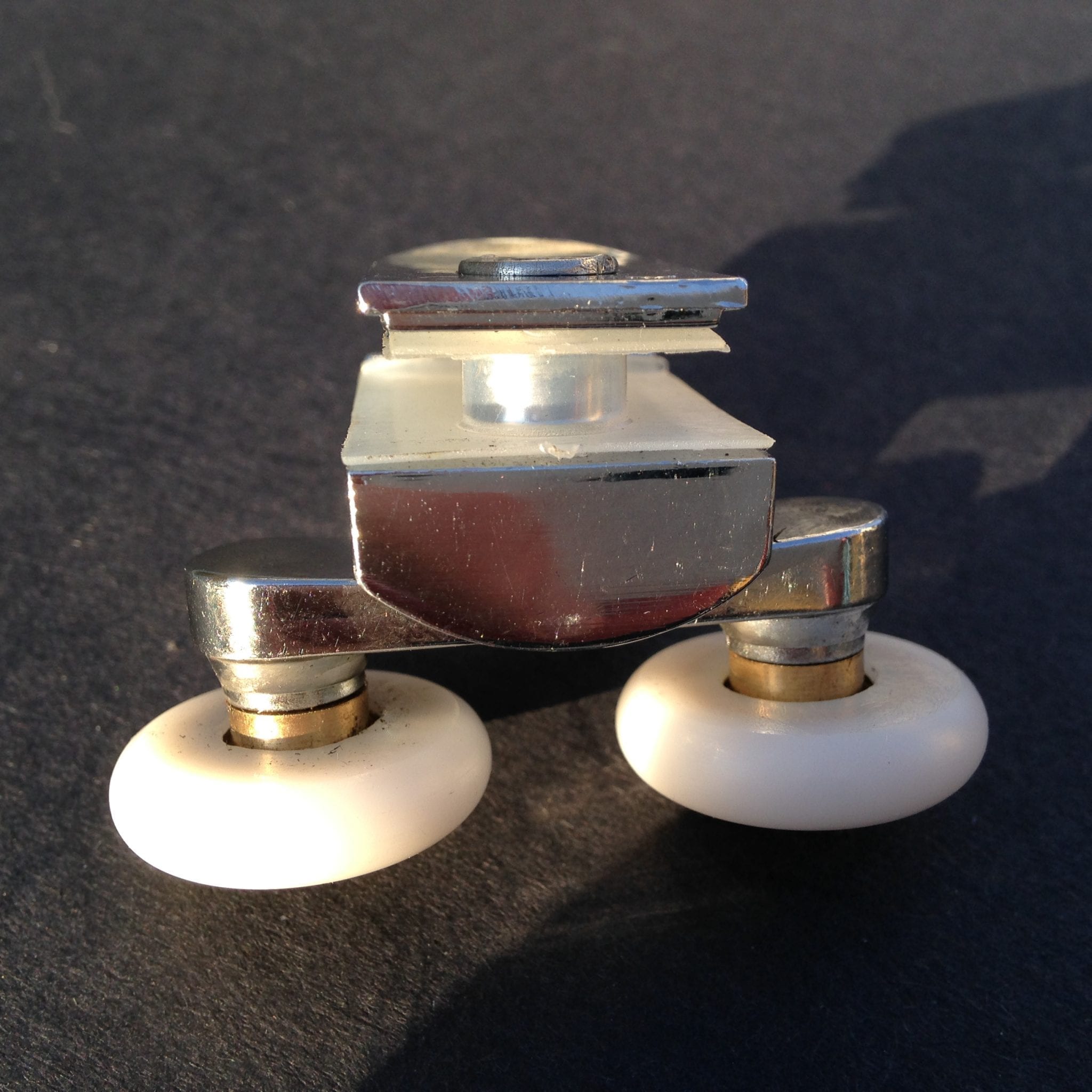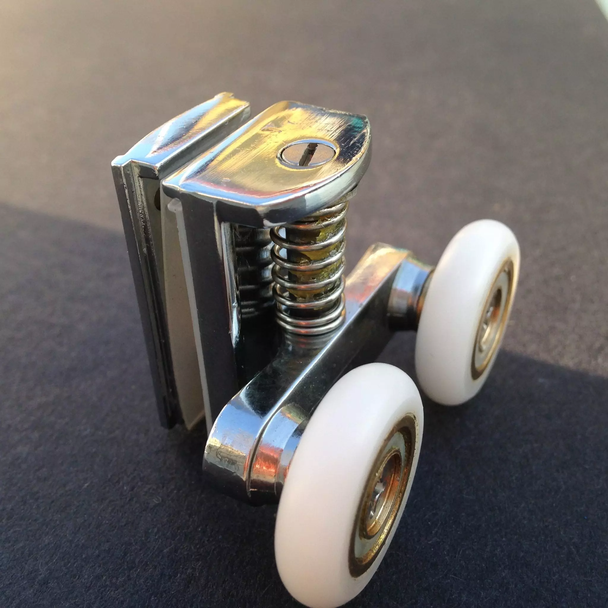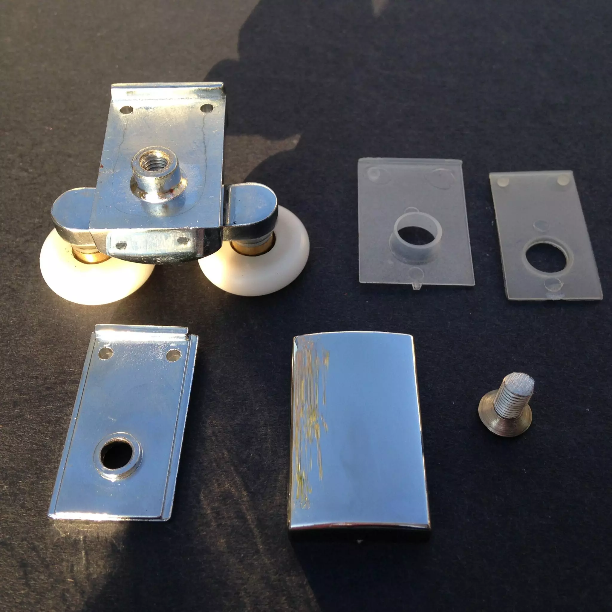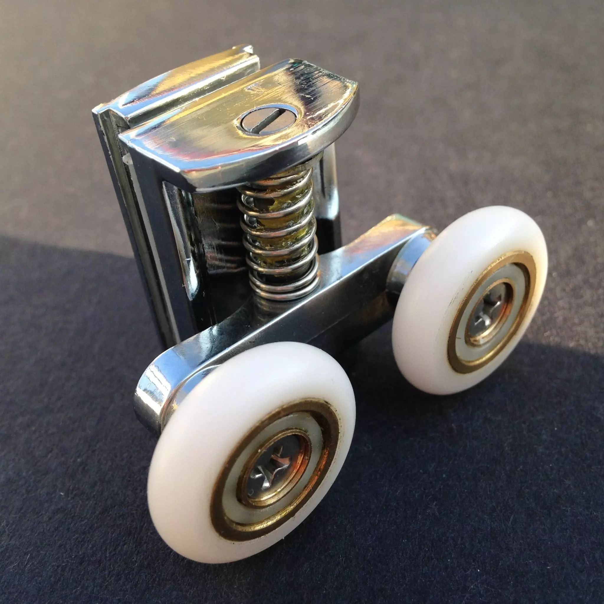 Roulette double pour porte coulissante de cabine de douche. Vendues à l’unité, cette roulette se compose d’un corps en laiton et d’éléments de soutien en plastique type ABS. Le bandage de la roulette est en téflon, recouvrant un roulement à billes étanche en acier inoxydable. Le choix et la qualité des matériaux employés offrent une utilisation optimale de confort, limitant ainsi le frottement et le bruit lors de la manipulation de la porte.