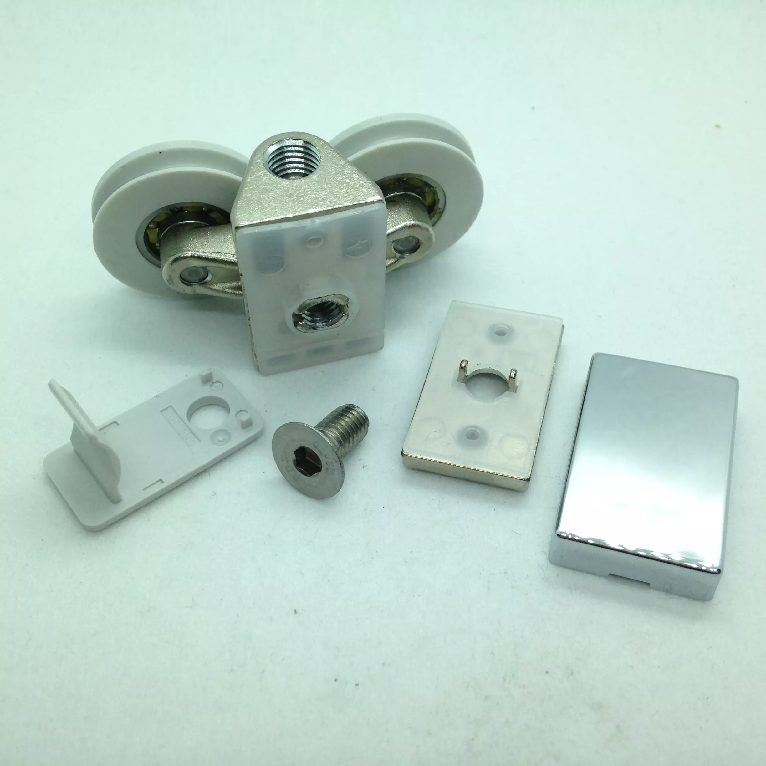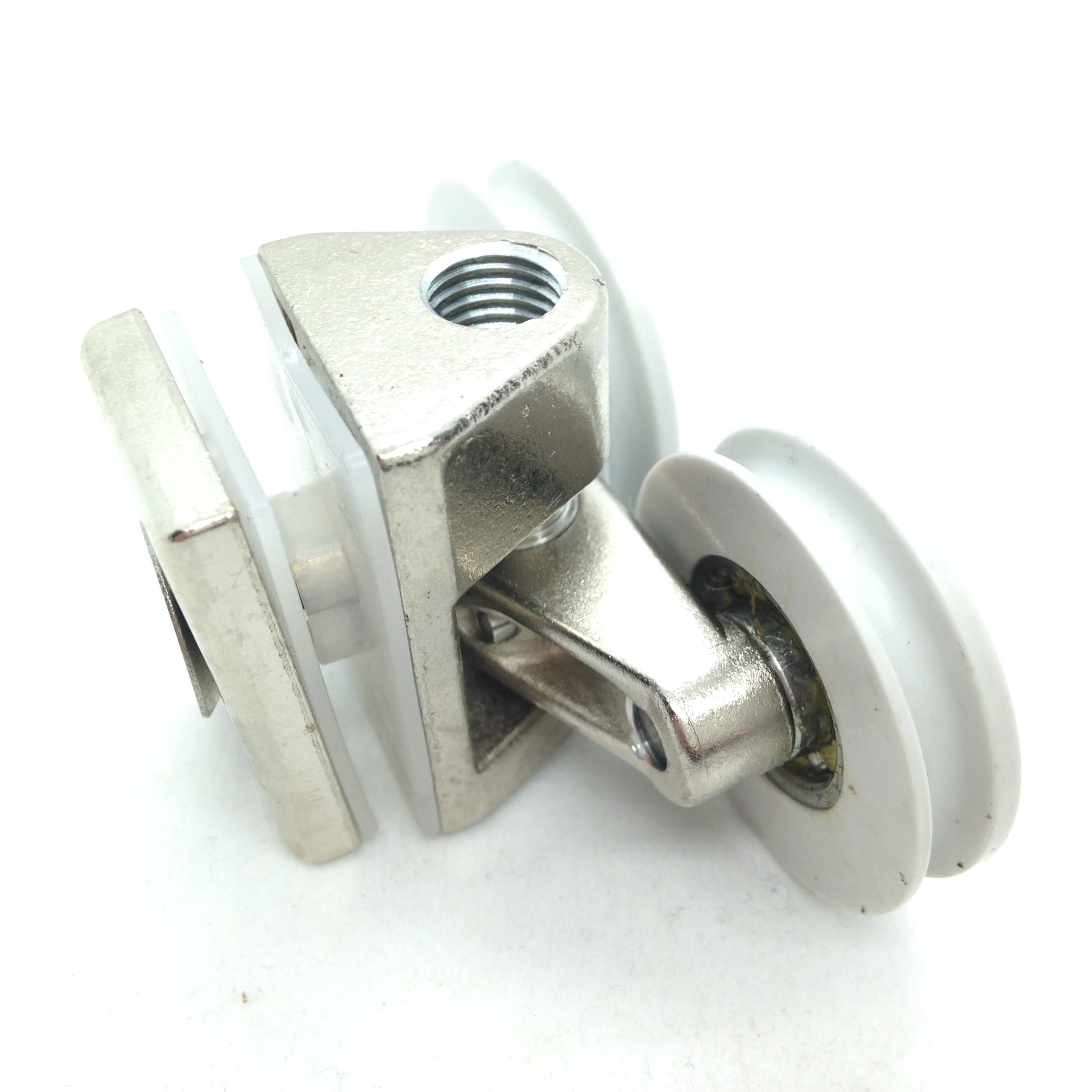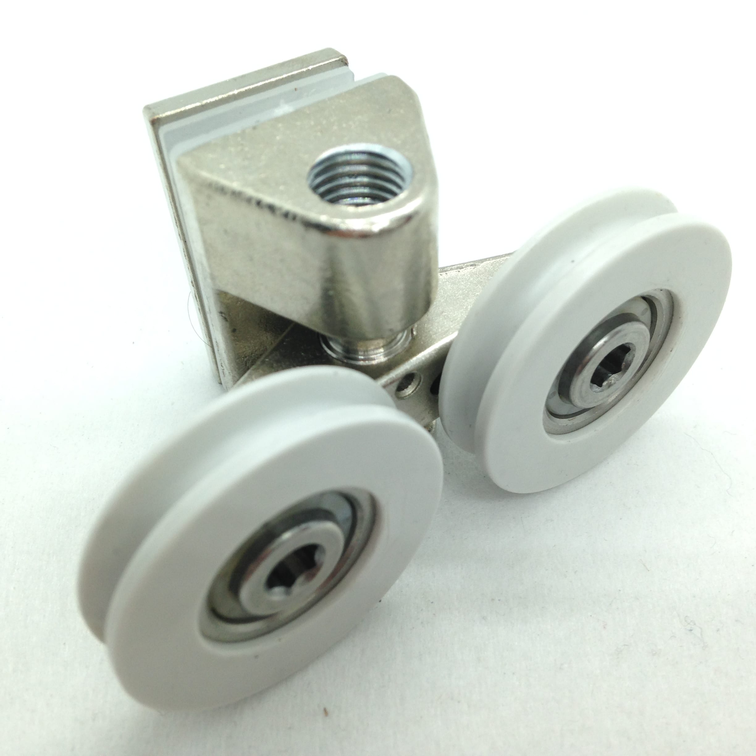 Roulette double haute en U pour porte coulissante de cabine de douche. Vendue à l’unité, cette roulette se compose d’un corps en plastique type ABS. Le bandage de la roulette est également en plastique ABS, recouvrant un roulement à billes étanche en acier inoxydable. Le choix et la qualité des matériaux employés offrent une utilisation optimale de confort, limitant ainsi le frottement et le bruit lors de la manipulation de la porte.