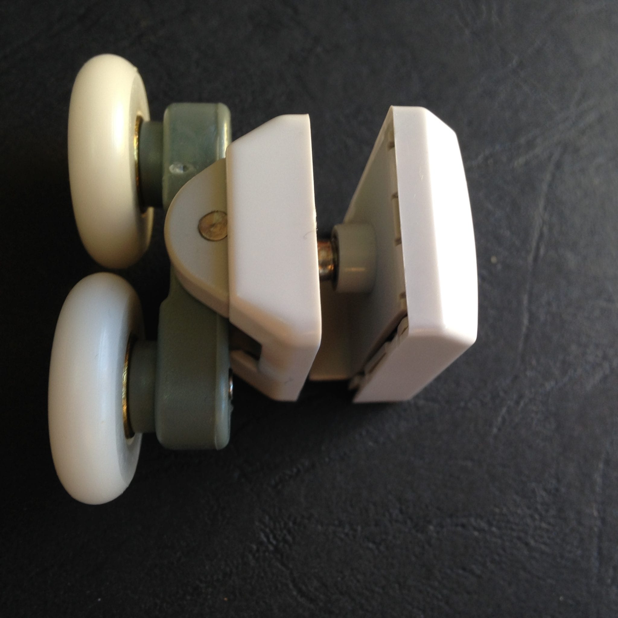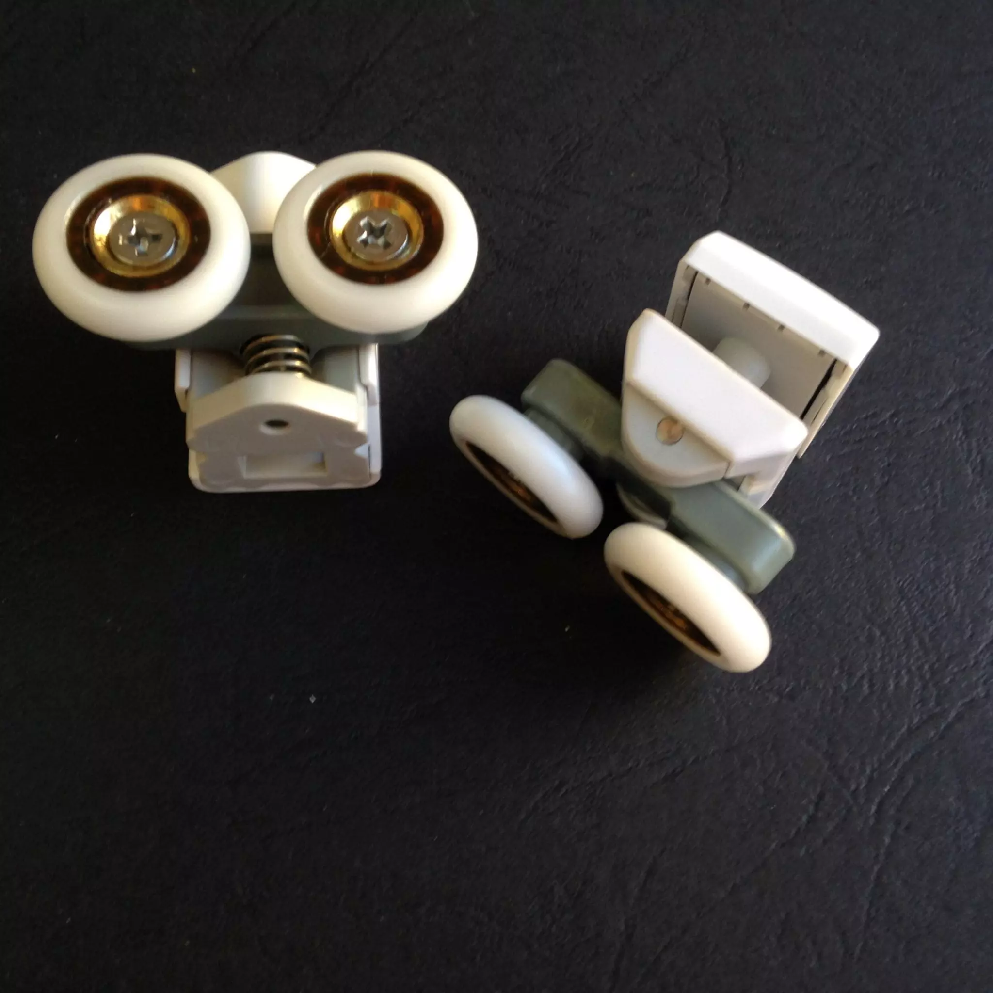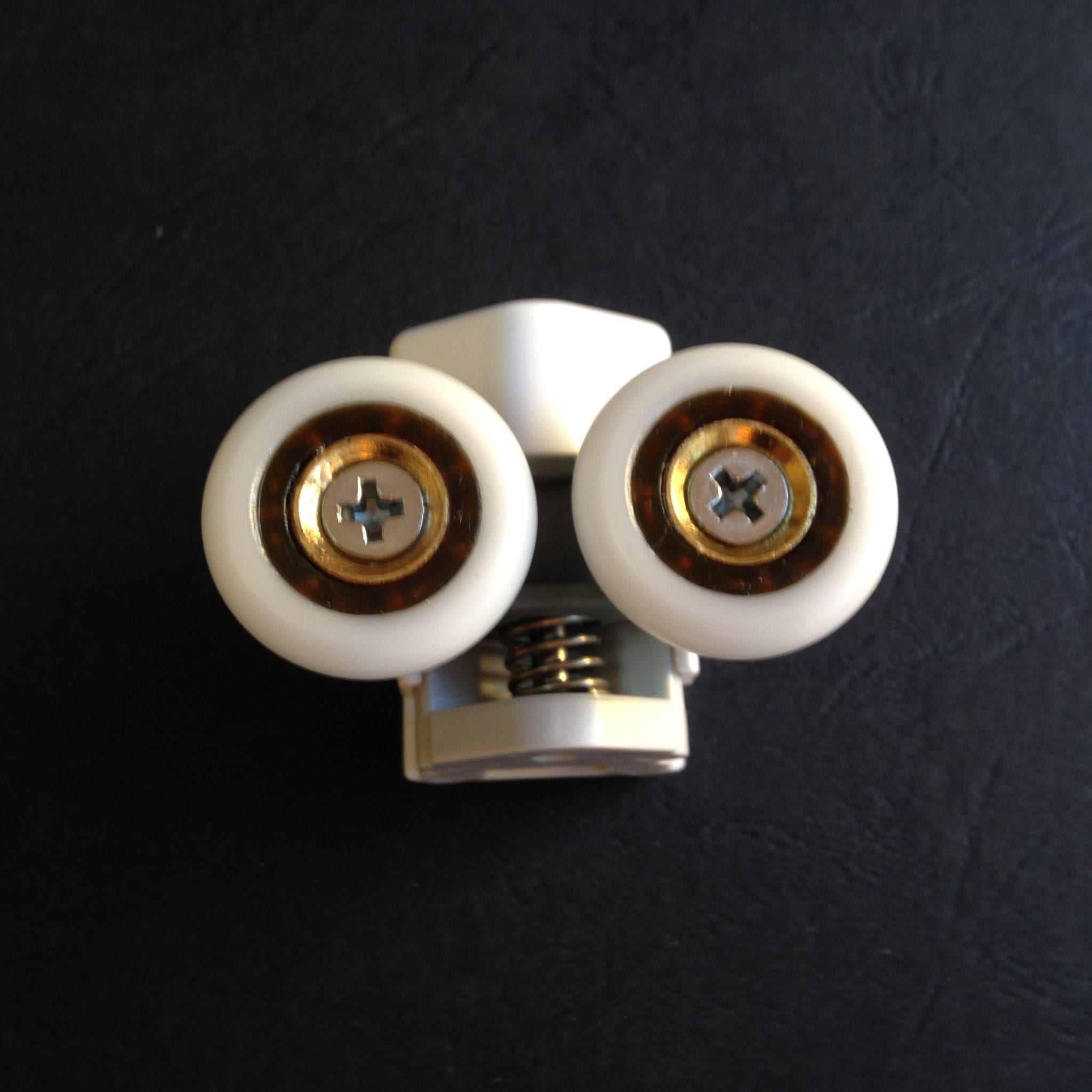 Roulette double pour porte coulissante de cabine de douche. Vendues par lot de 2, ces roulettes se composent d’un corps en laiton et d’éléments de soutien en plastique type ABS. Le bandage de la roulette est en téflon, recouvrant un roulement à billes étanche en acier inoxydable. Le choix et la qualité des matériaux employés offrent une utilisation optimale de confort, limitant ainsi le frottement et le bruit lors de la manipulation de la porte.