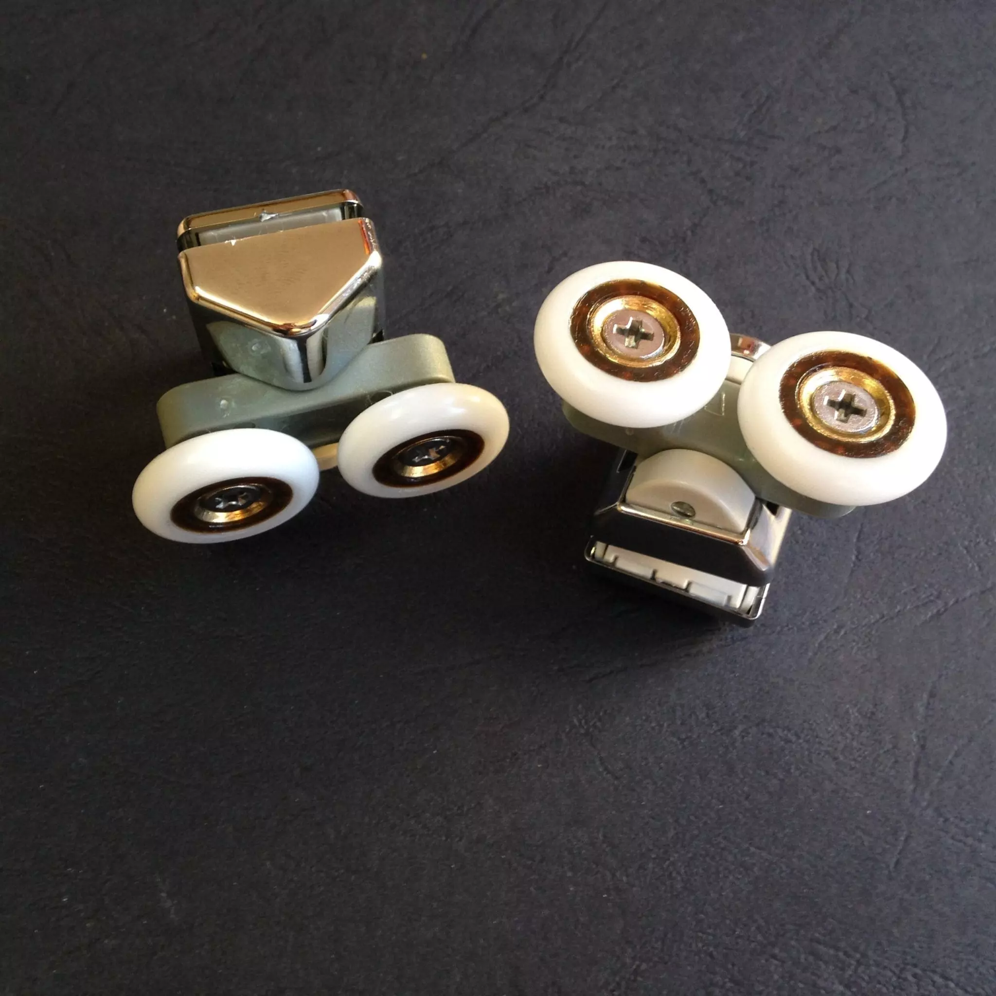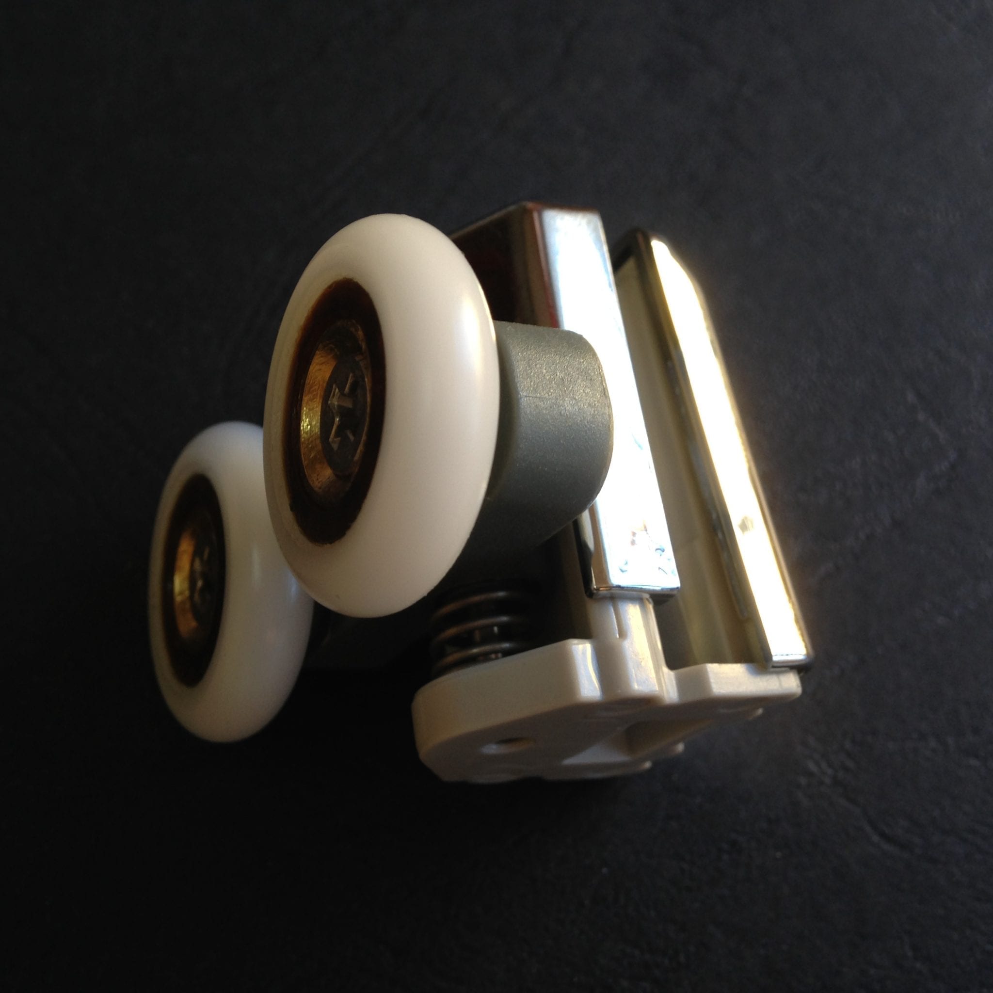 Roulette double pour porte coulissante de cabine de douche. Vendues par lot de 2, ces roulettes se composent d’un corps en laiton et d’éléments de soutien en plastique type ABS. Le bandage de la roulette est en téflon, recouvrant un roulement à billes étanche en acier inoxydable. Le choix et la qualité des matériaux employés offrent une utilisation optimale de confort, limitant ainsi le frottement et le bruit lors de la manipulation de la porte.
