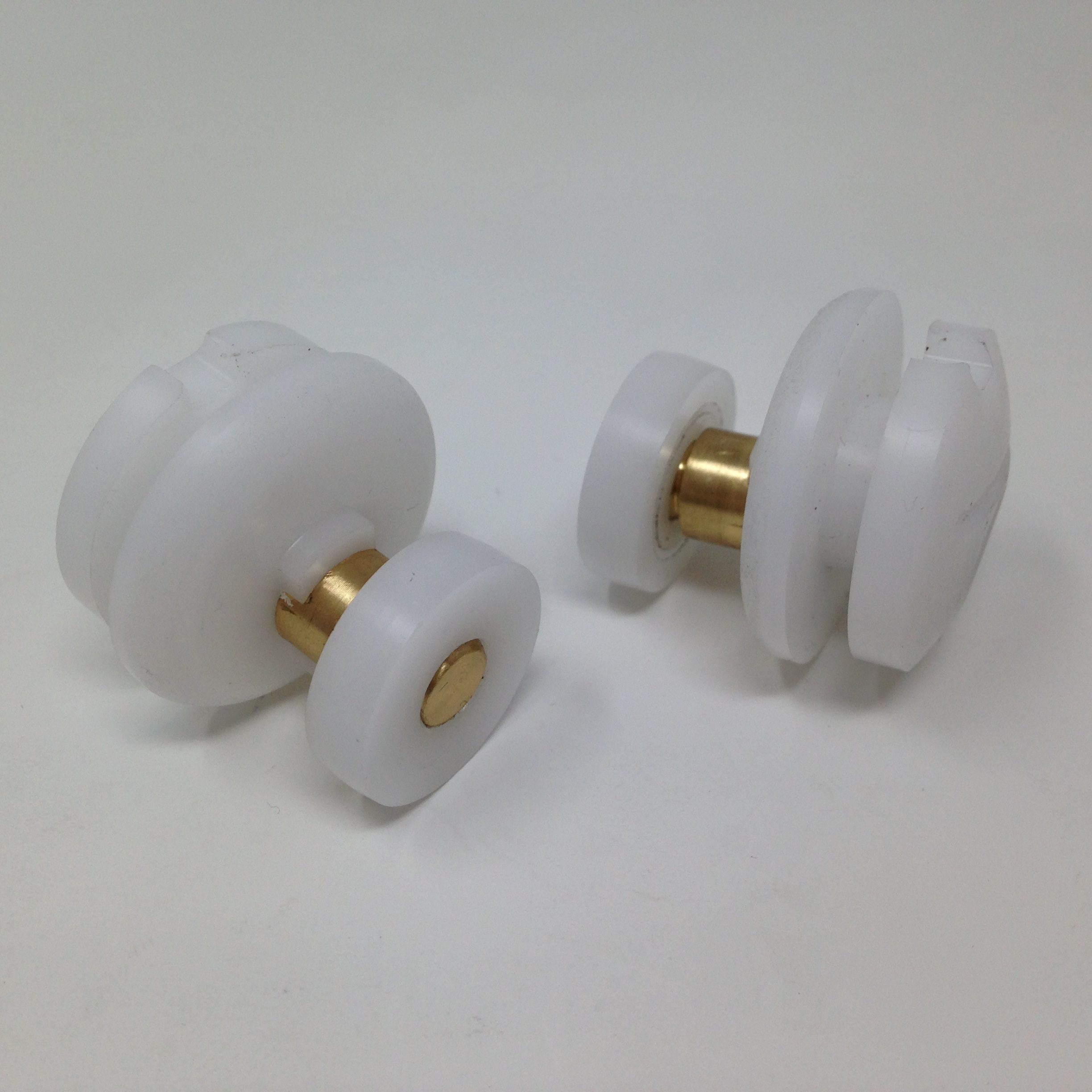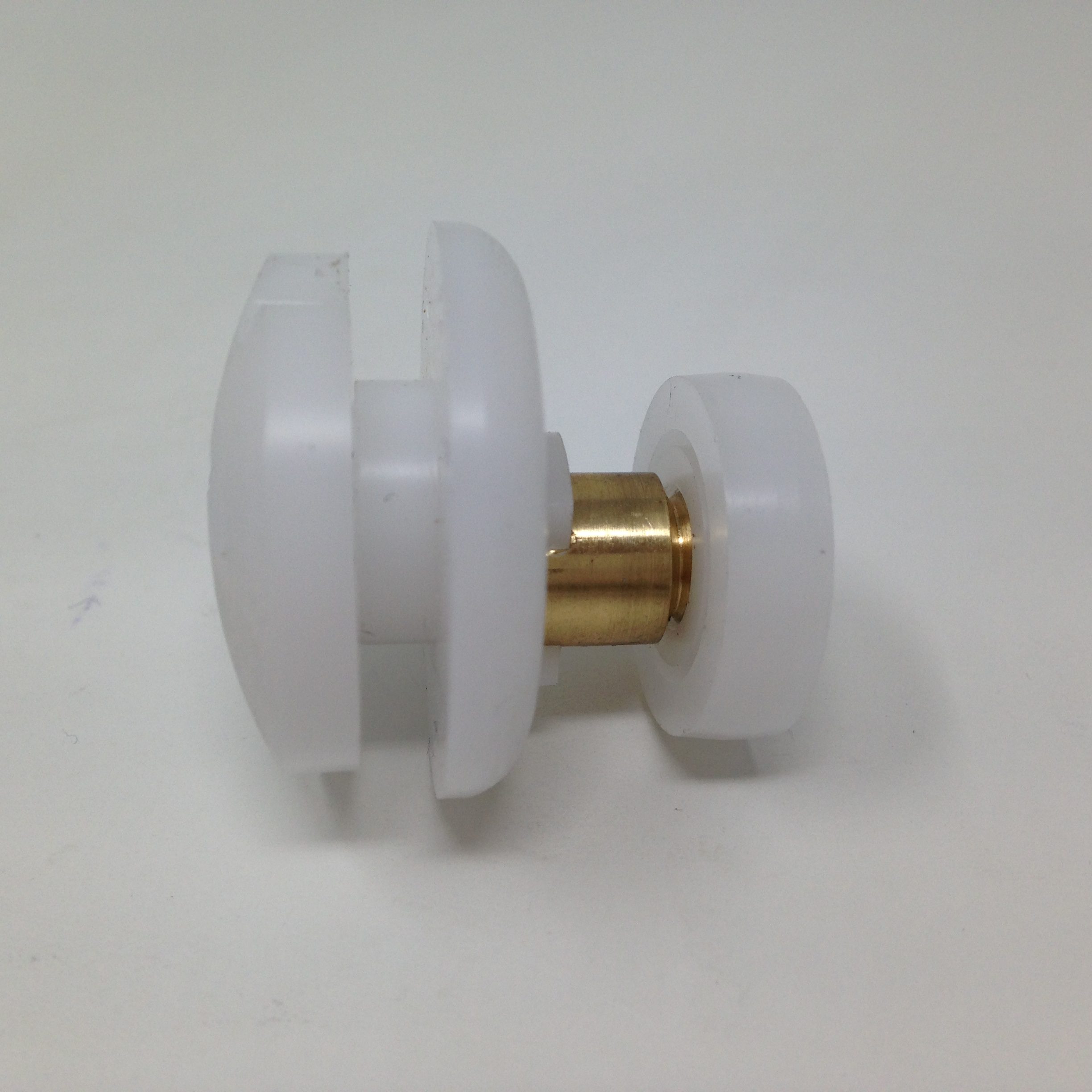 Roulette droite simple pour porte coulissante de cabine de douche. Vendue par lot de 2, cette roulette se compose d’un corps en laiton. Le bandage de la roulette est en téflon, recouvrant un roulement à billes étanche en acier inoxydable. Le choix et la qualité des matériaux employés offrent une utilisation optimale de confort, limitant ainsi le frottement et le bruit lors de la manipulation de la porte.