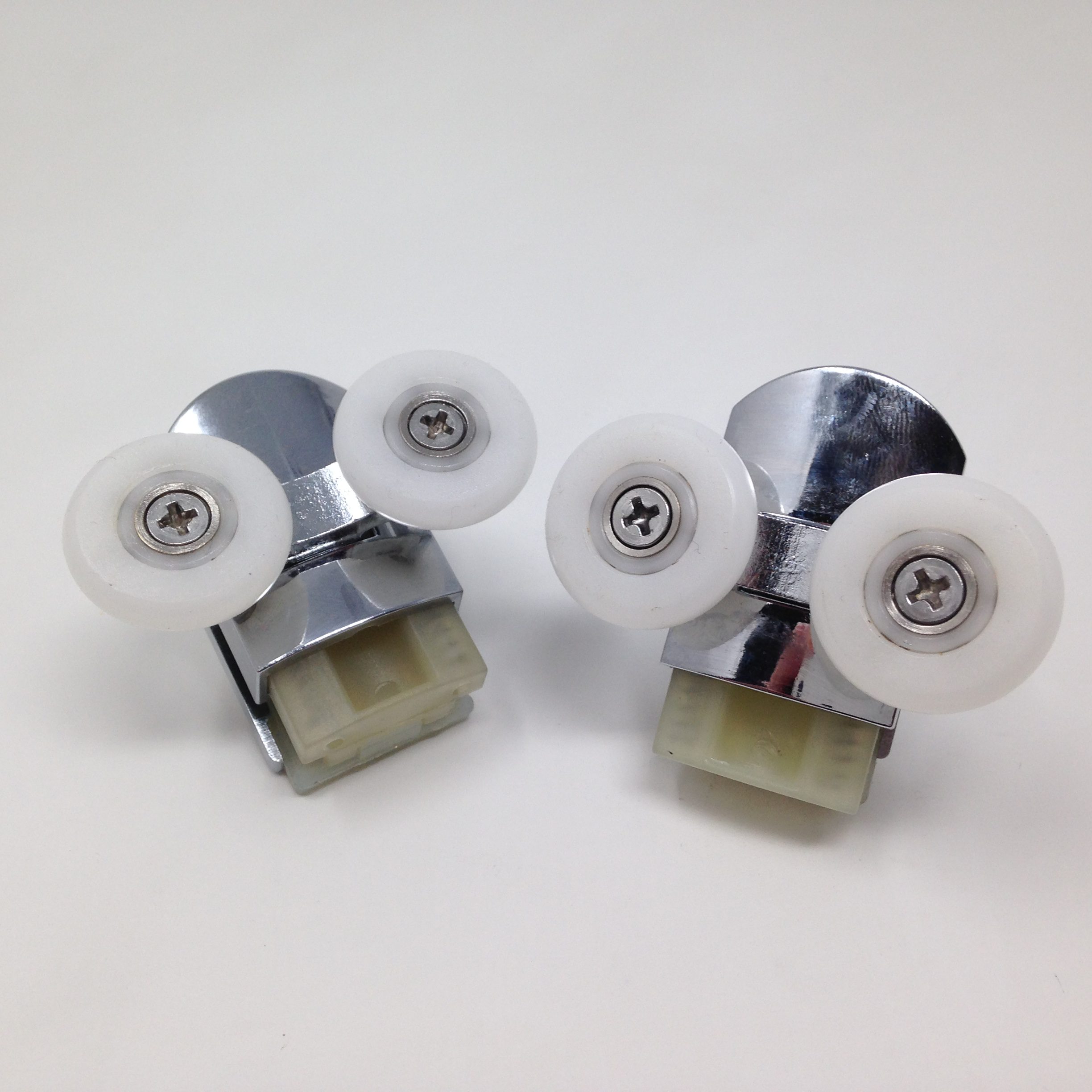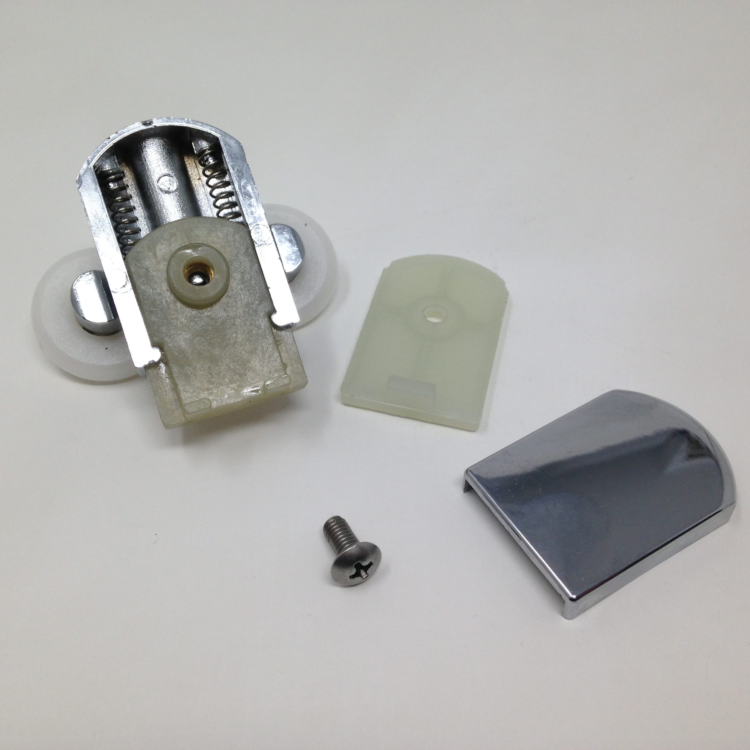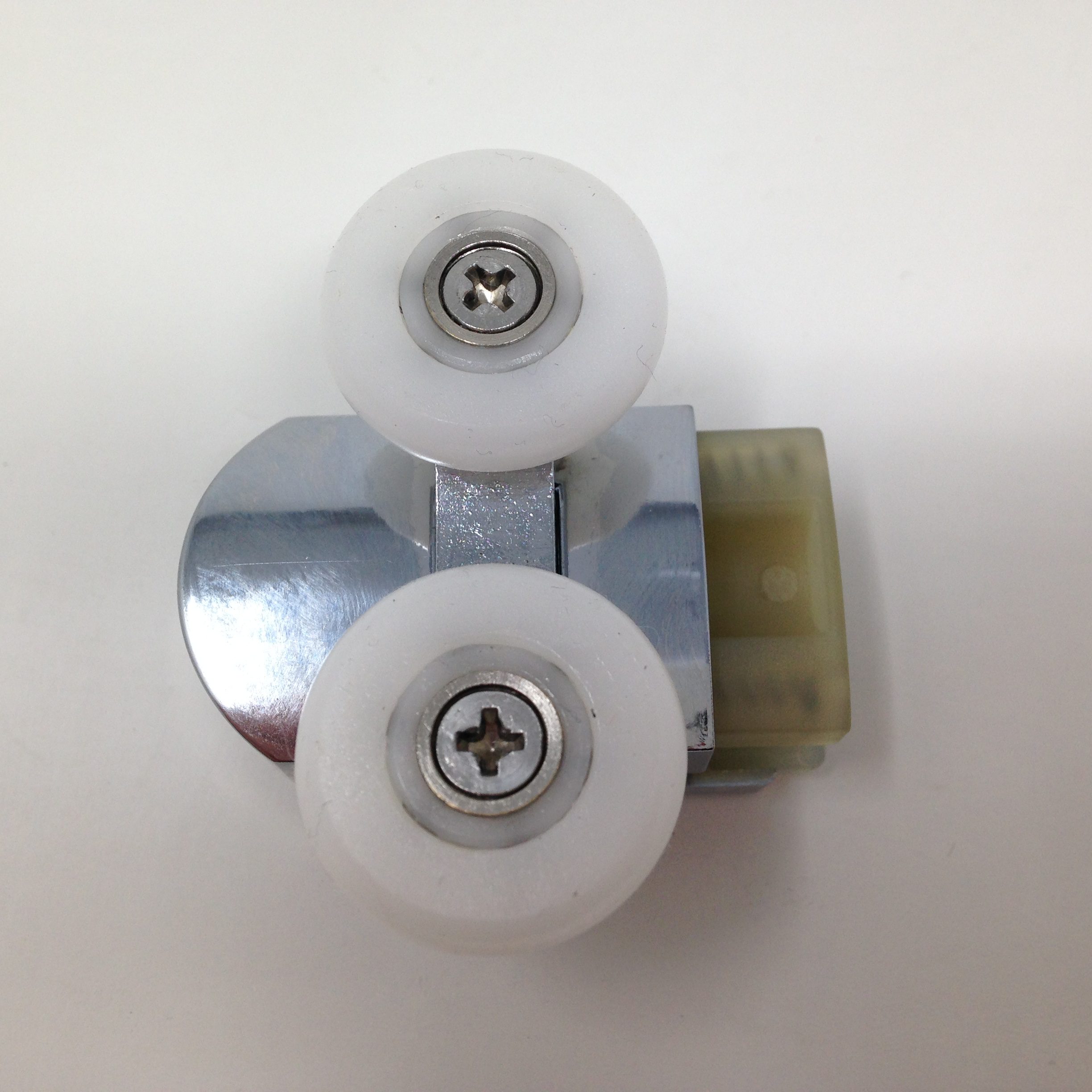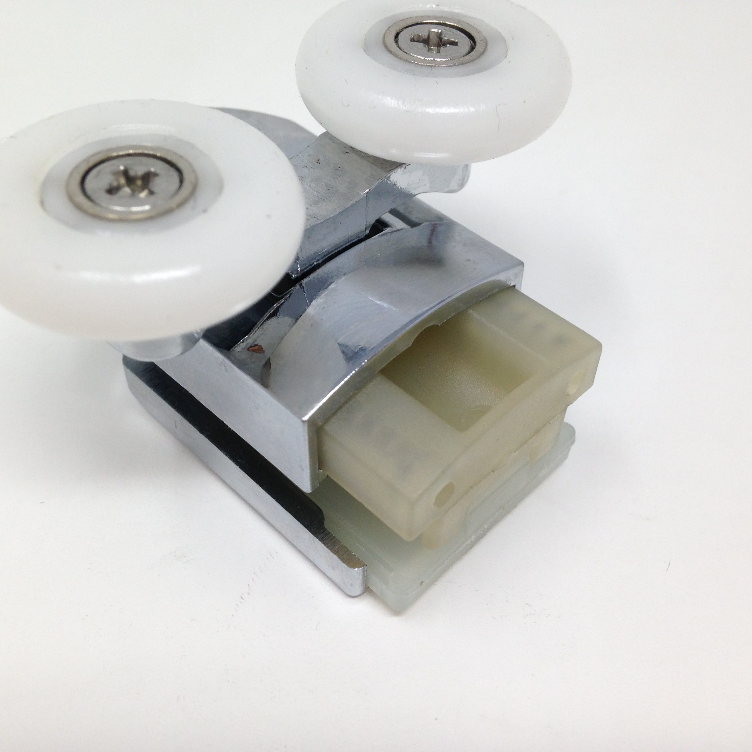 Roulette double basse pour porte coulissante de cabine de douche. Vendues par lot de 4, ces roulettes se composent d’un corps en laiton ou en alliage de zinc et d’éléments de soutien en plastique type ABS. Le bandage de la roulette est en téflon, recouvrant un roulement à billes étanche en acier inoxydable. Le choix et la qualité des matériaux employés offrent une utilisation optimale de confort, limitant ainsi le frottement et le bruit lors de la manipulation de la porte.