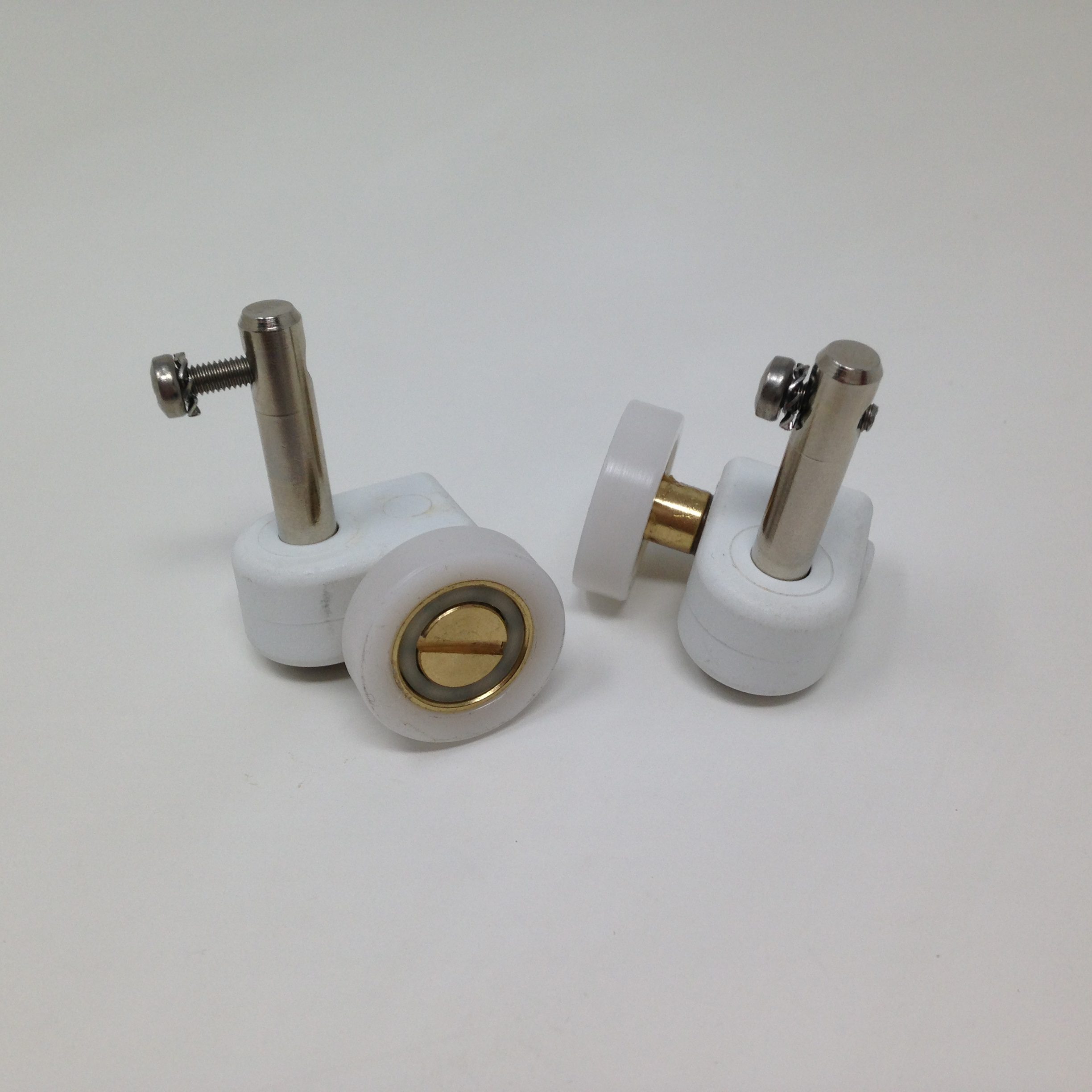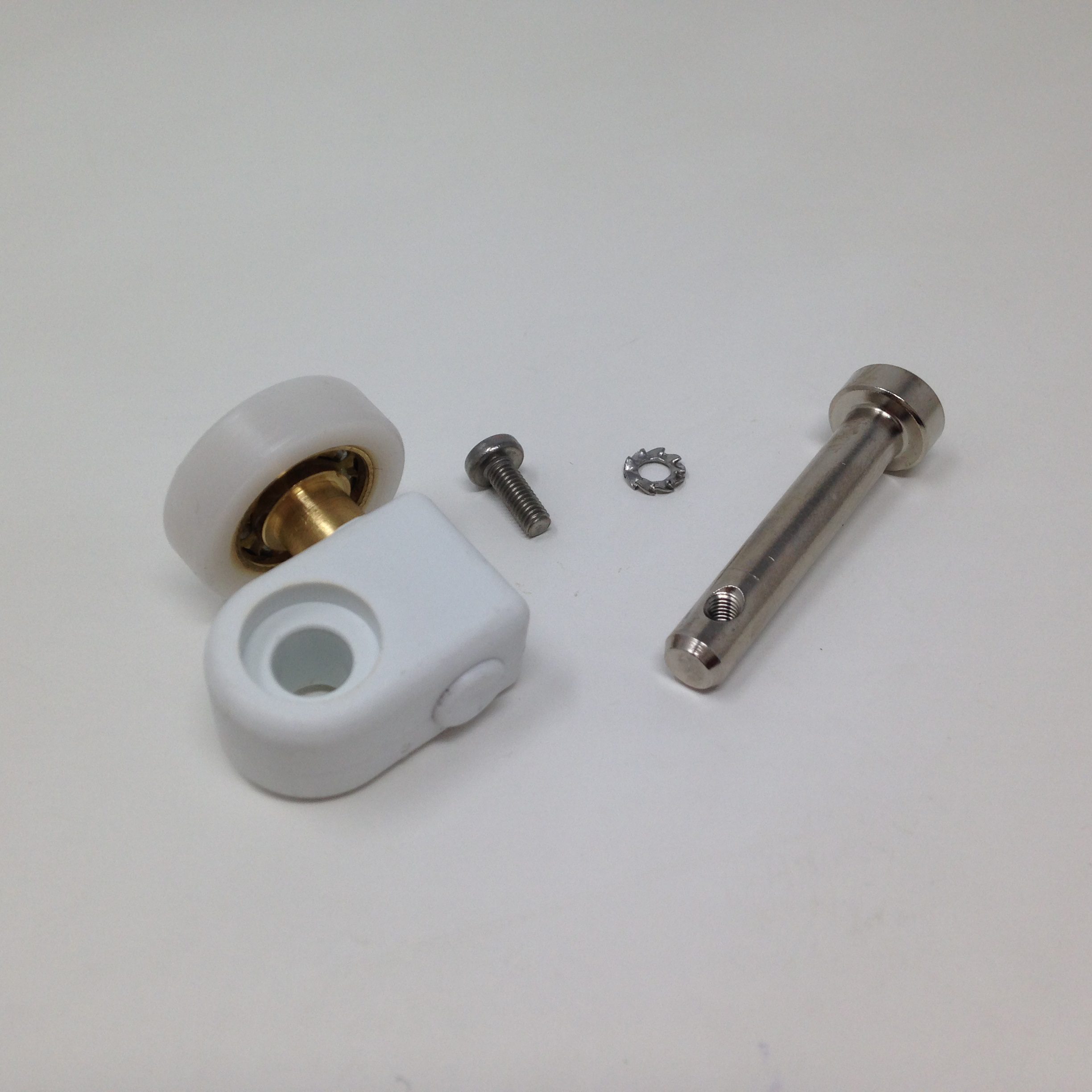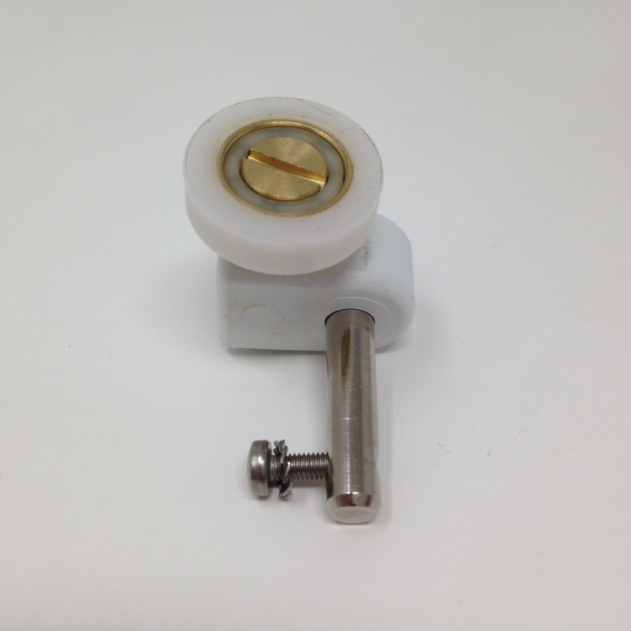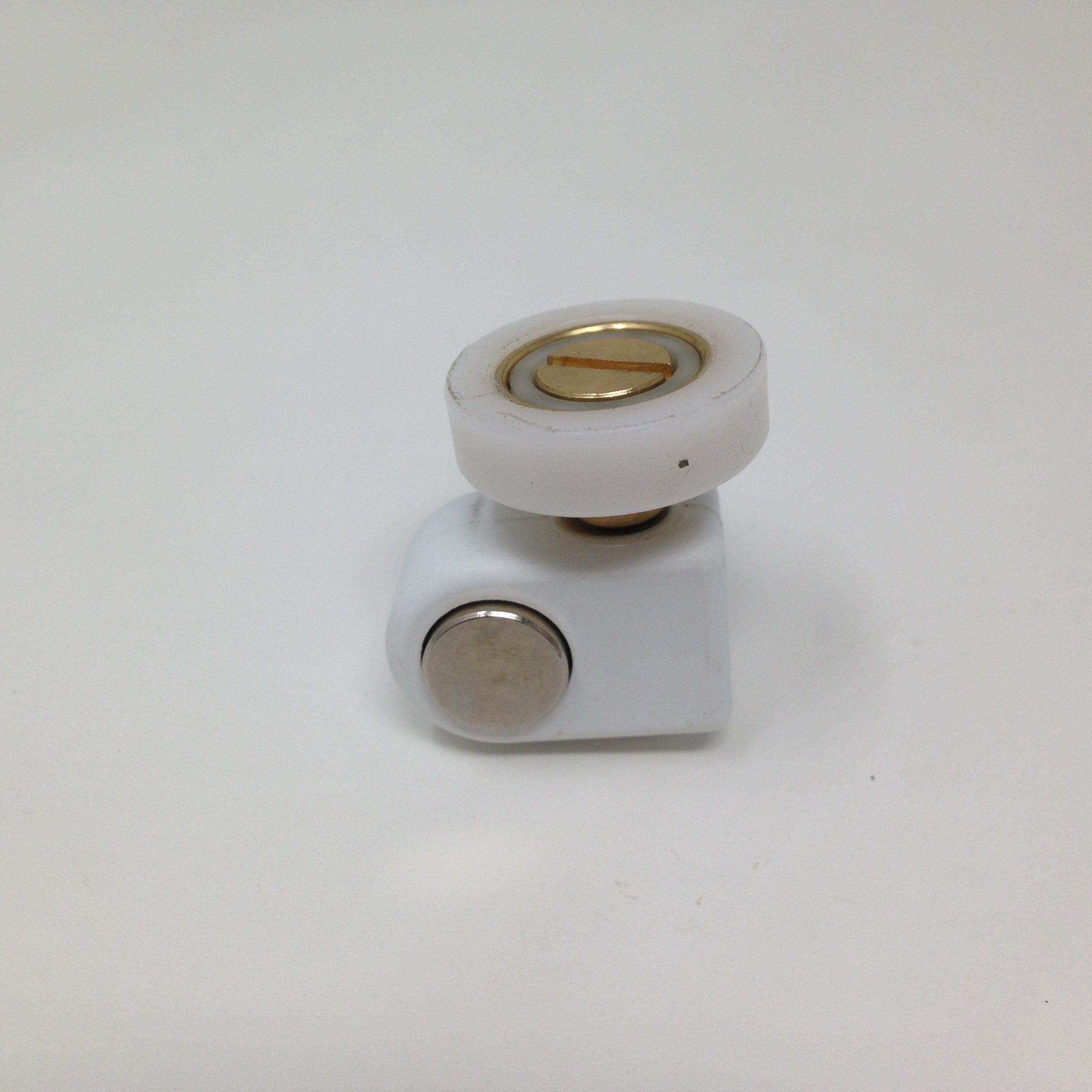 Roulette droite simple pour porte coulissante de cabine de douche. Vendue par lot de 2, cette roulette se compose d’un corps en téflon. Le bandage de la roulette est en téflon, recouvrant un roulement à billes étanche en acier inoxydable. Le choix et la qualité des matériaux employés offrent une utilisation optimale de confort, limitant ainsi le frottement et le bruit lors de la manipulation de la porte.