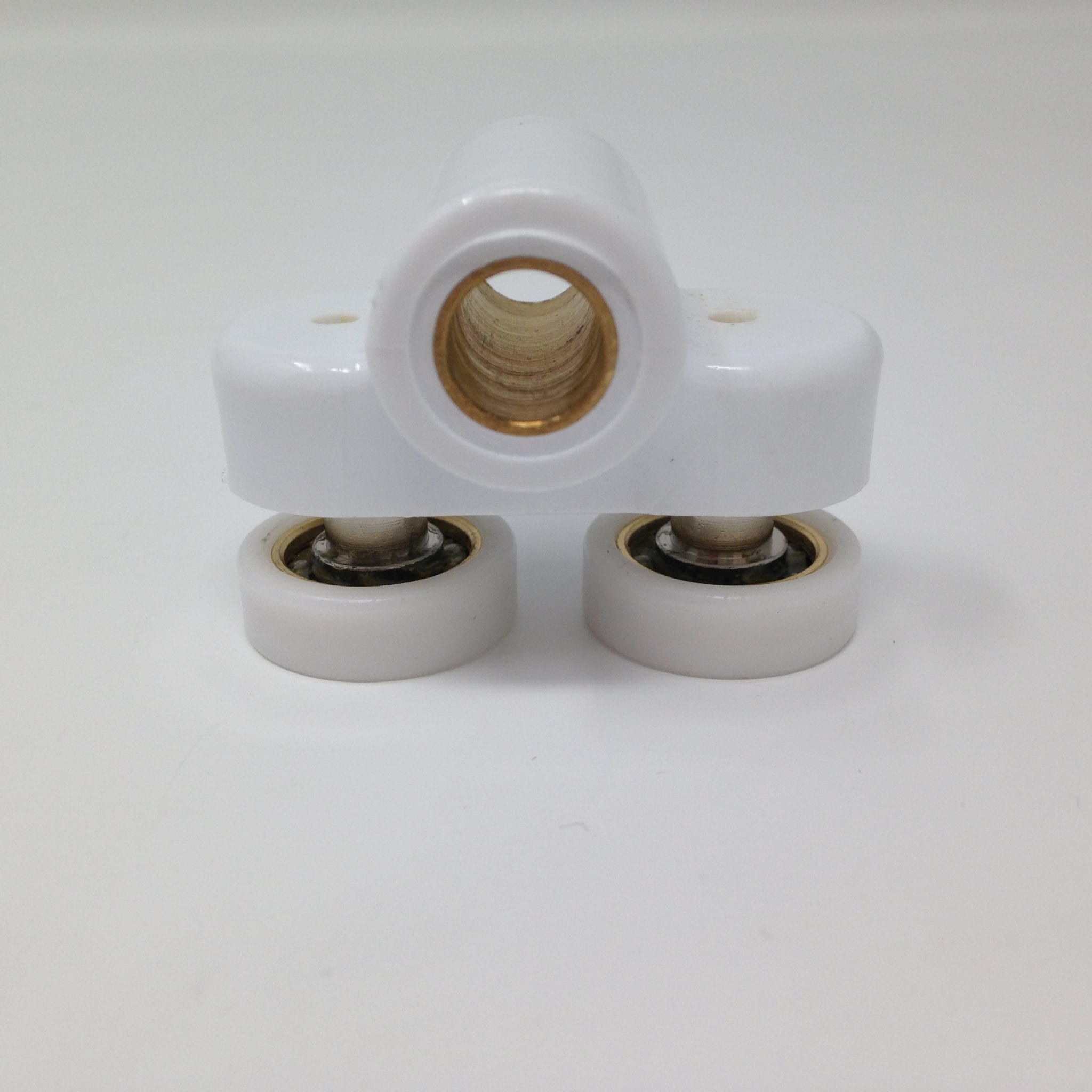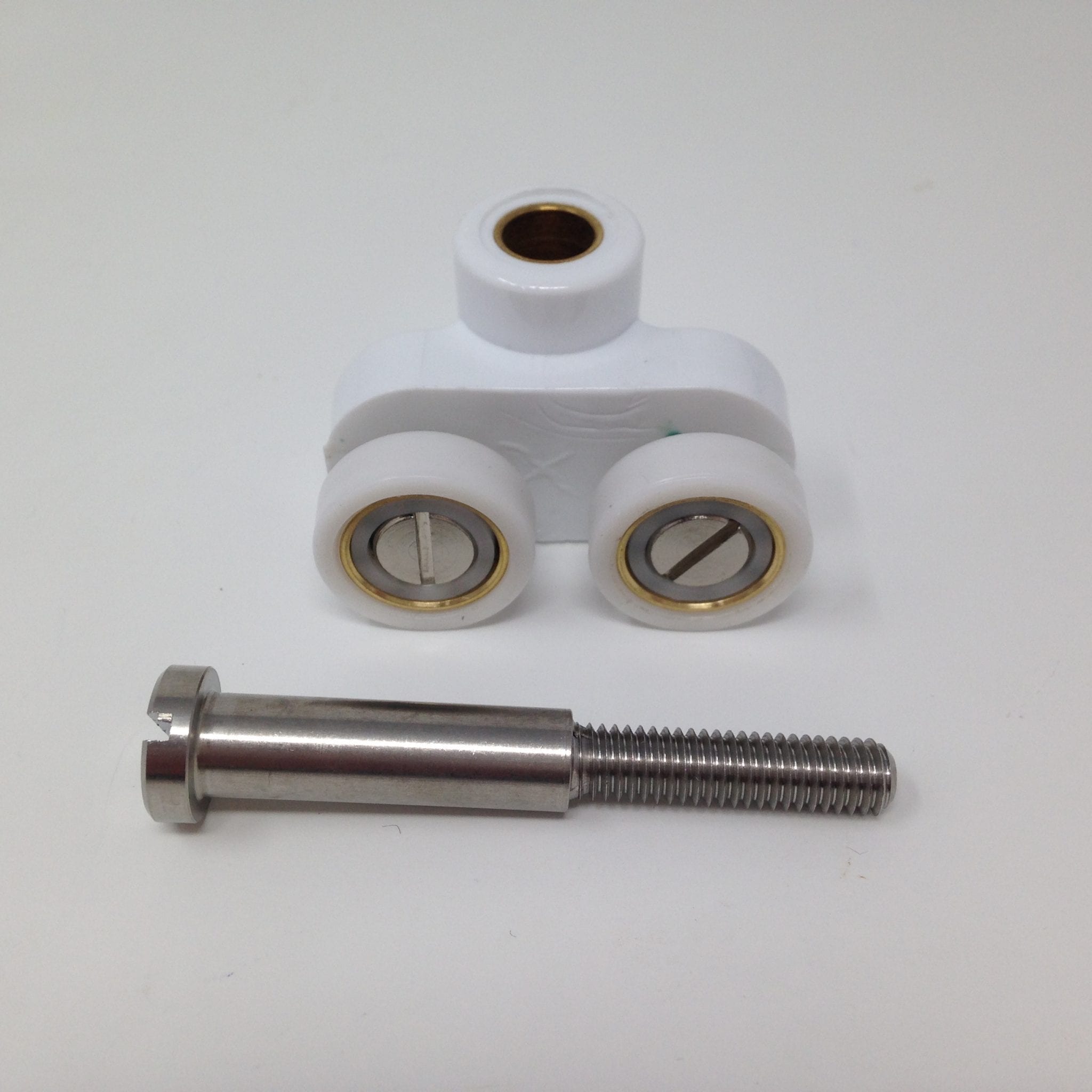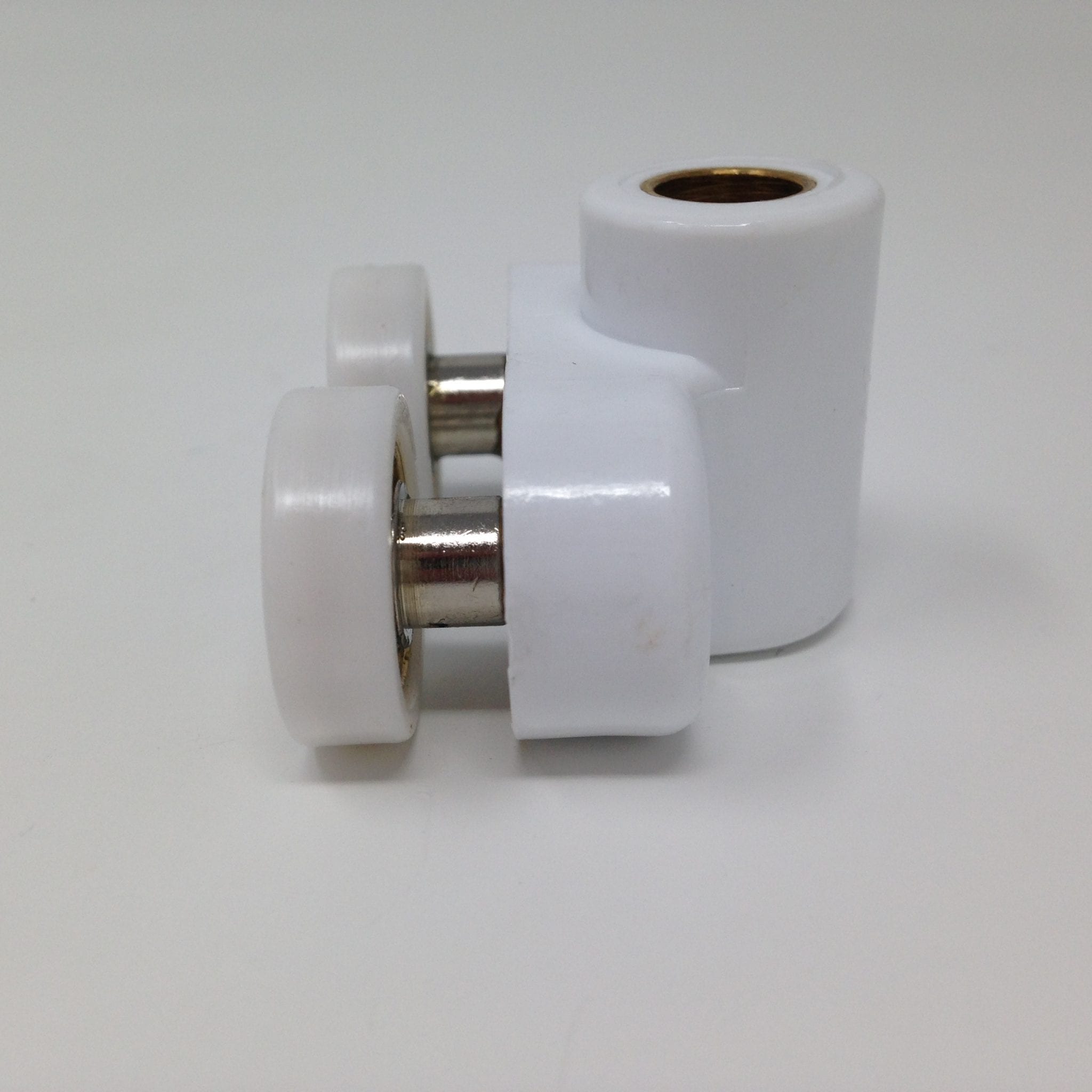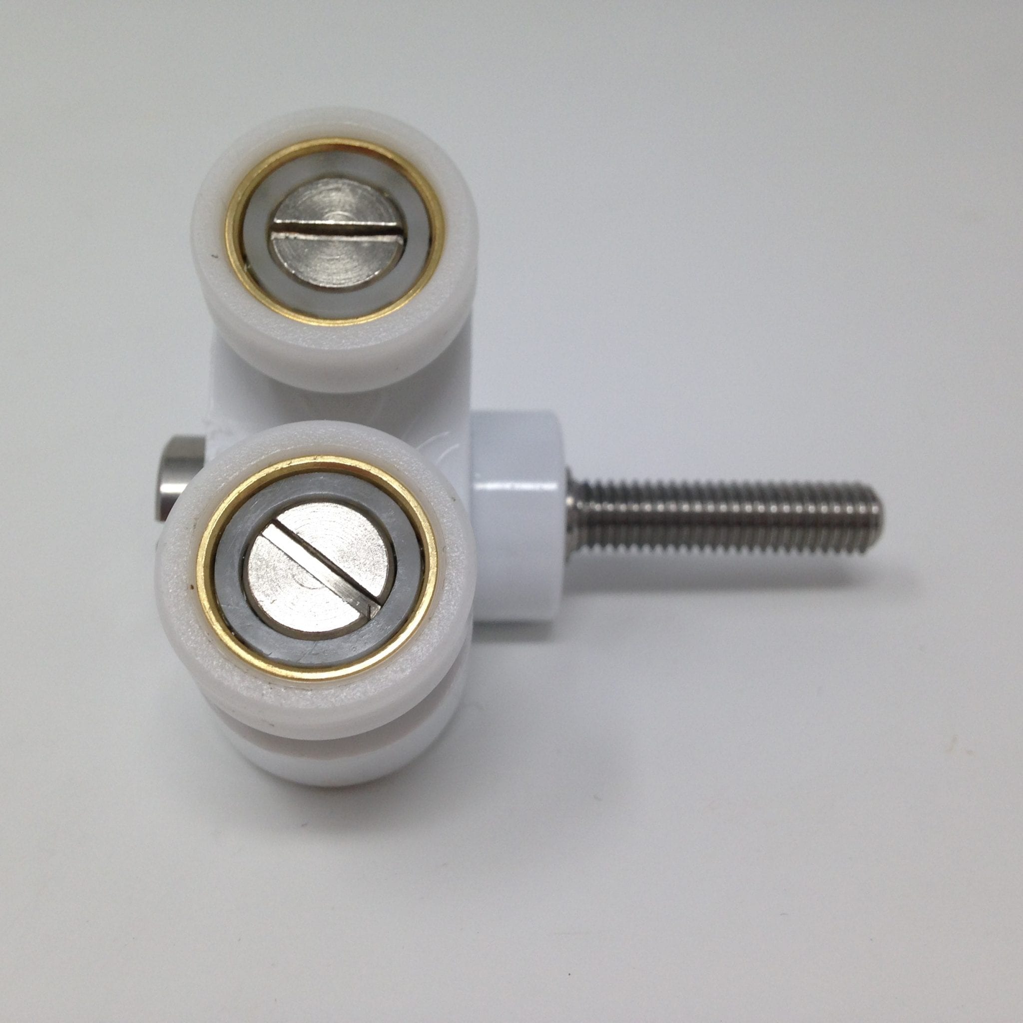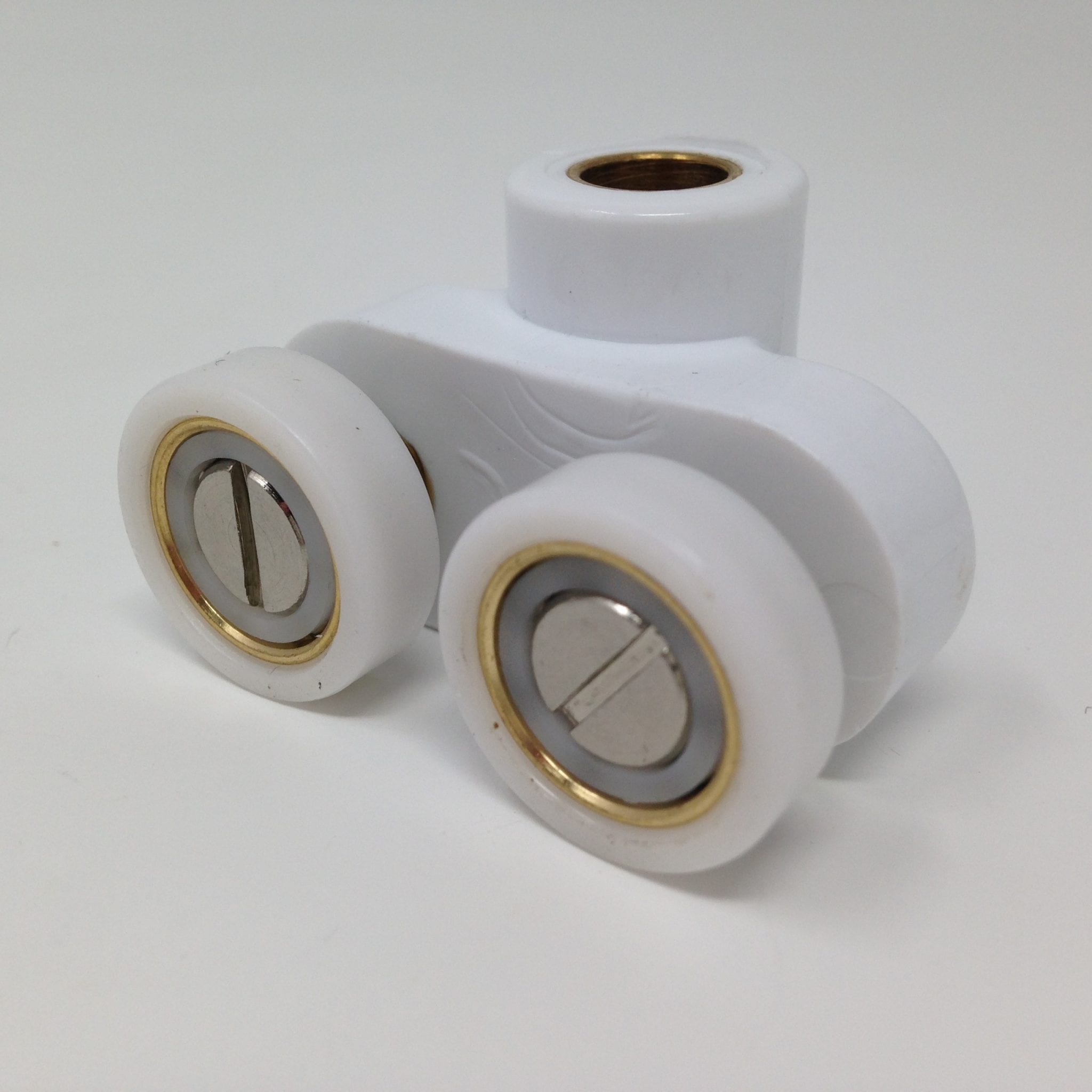 Roulette double pour porte coulissante de cabine de douche. Vendue à l’unité, cette roulette se compose d’un corps en laiton et d’éléments de soutien en plastique type ABS. Le bandage de la roulette est en téflon, recouvrant un roulement à billes étanche en acier inoxydable. Le choix et la qualité des matériaux employés offrent une utilisation optimale de confort, limitant ainsi le frottement et le bruit lors de la manipulation de la porte.
