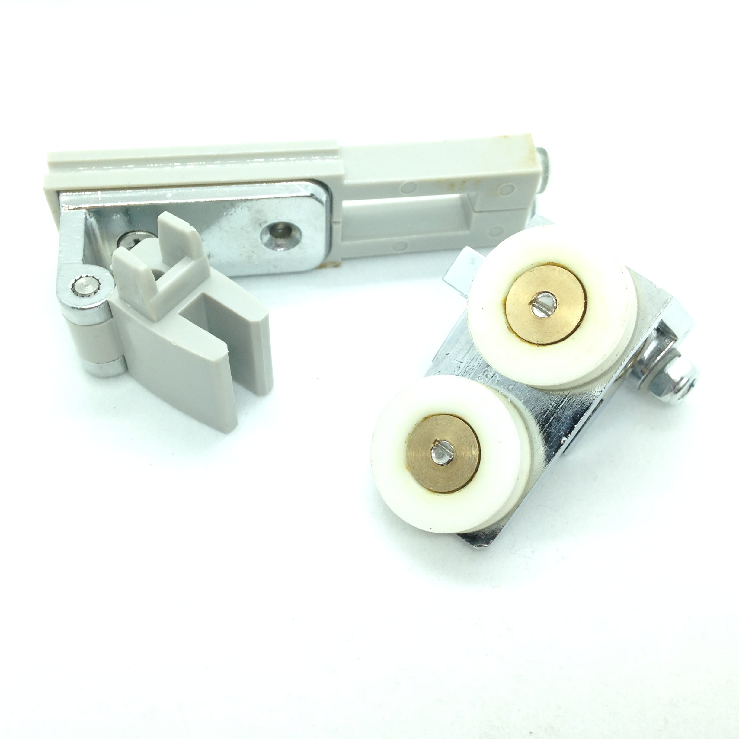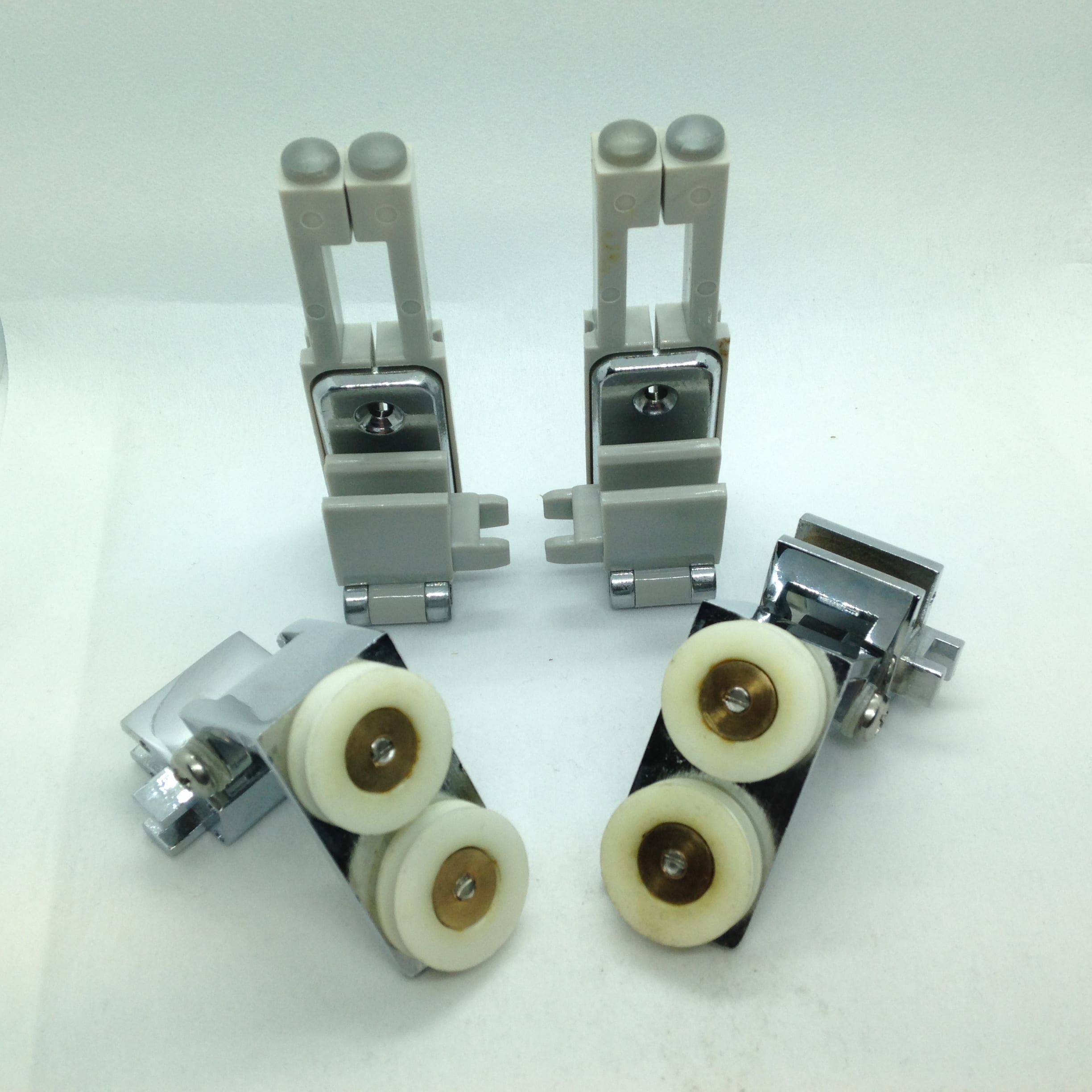Vous achetez un kit complet de 2 roulettes doubles montées sur charnières et 2 charnières pour cabine de douche MERLYN, modèle Series 6.