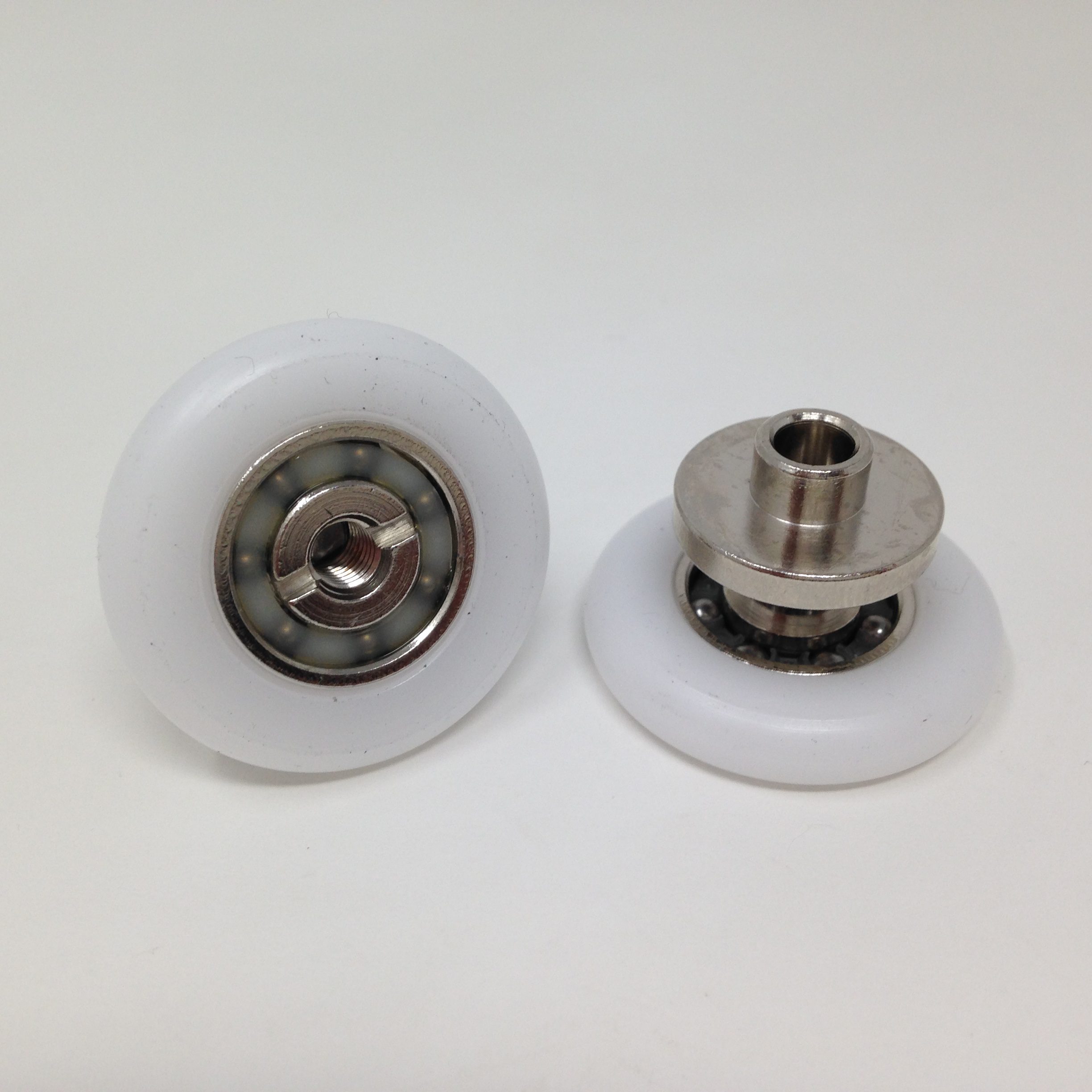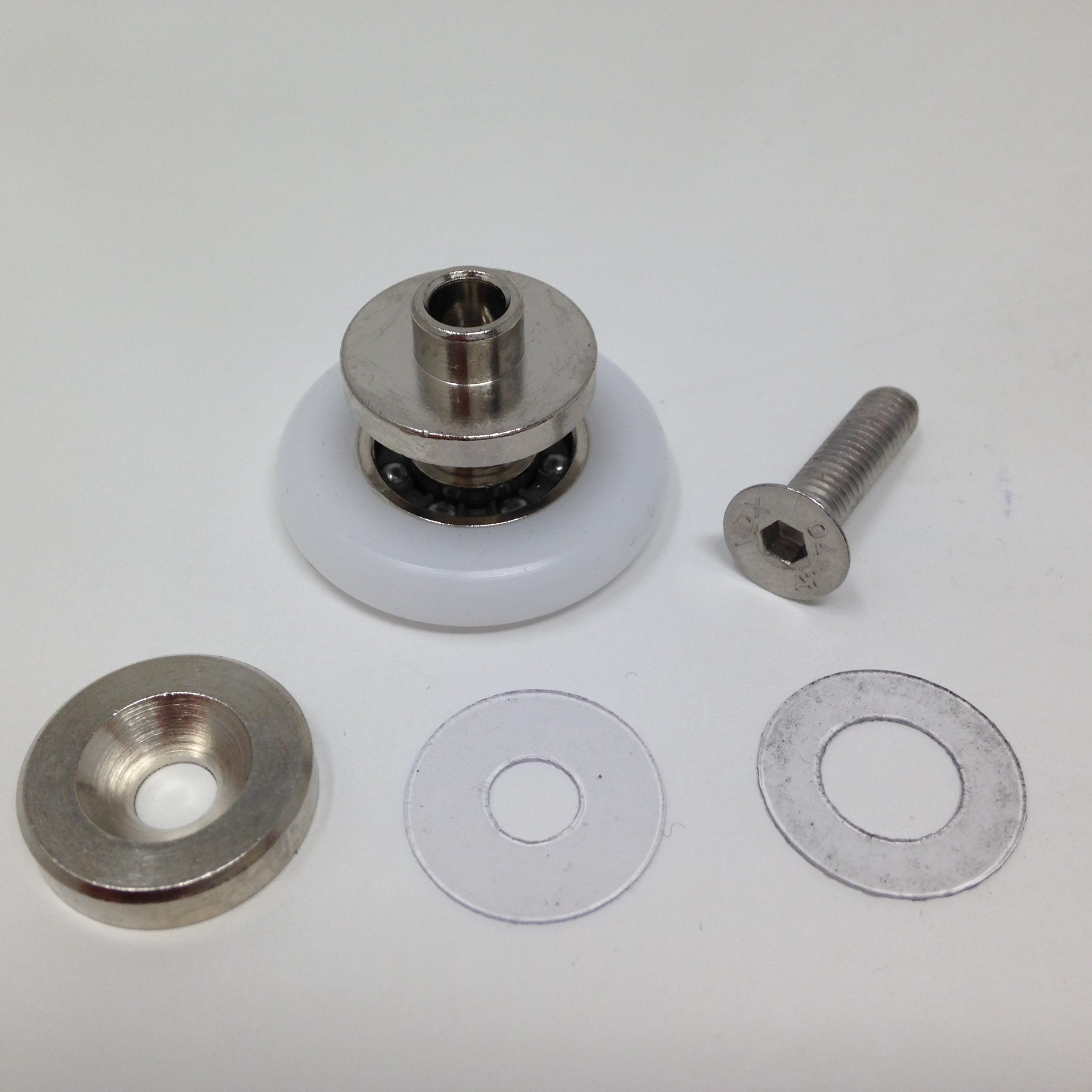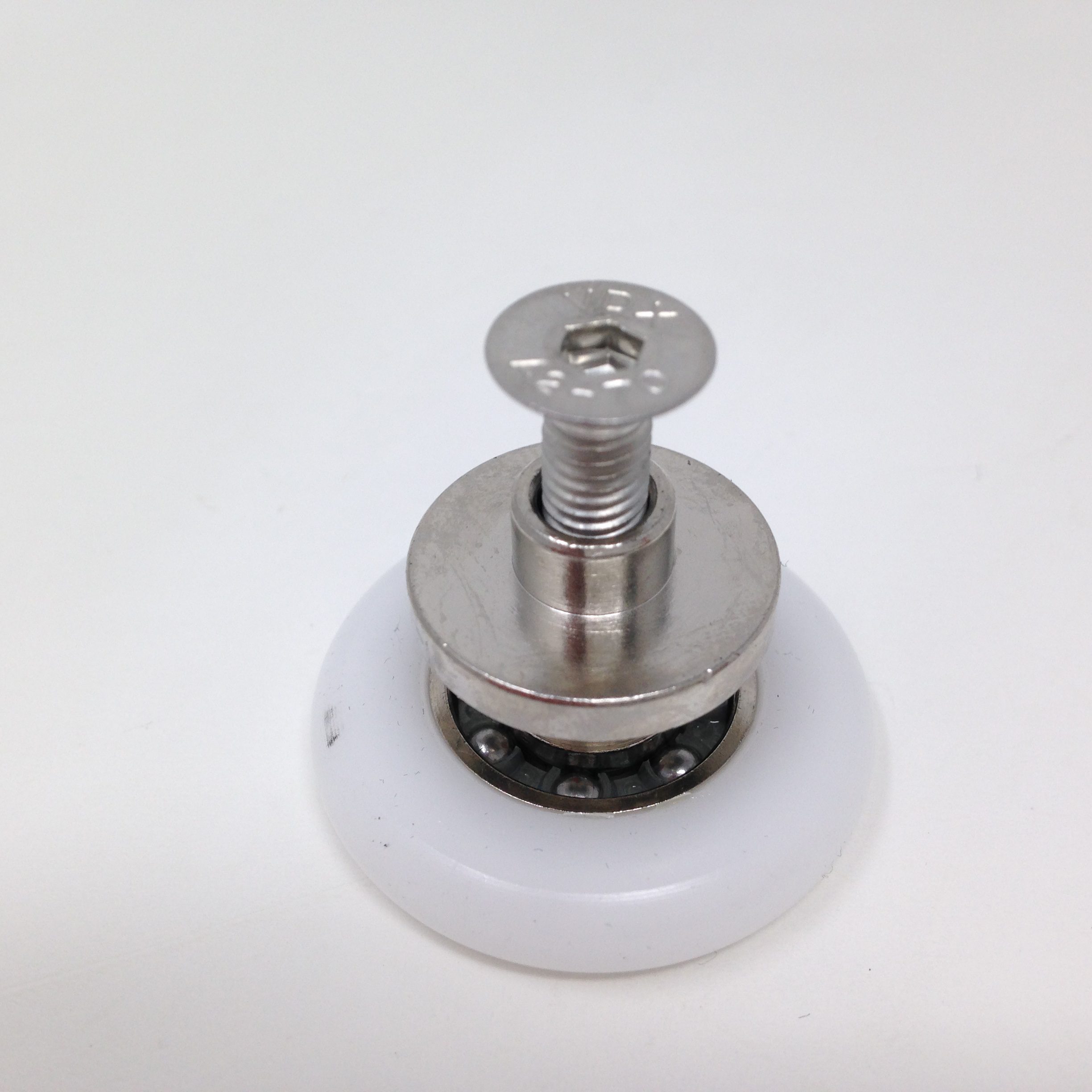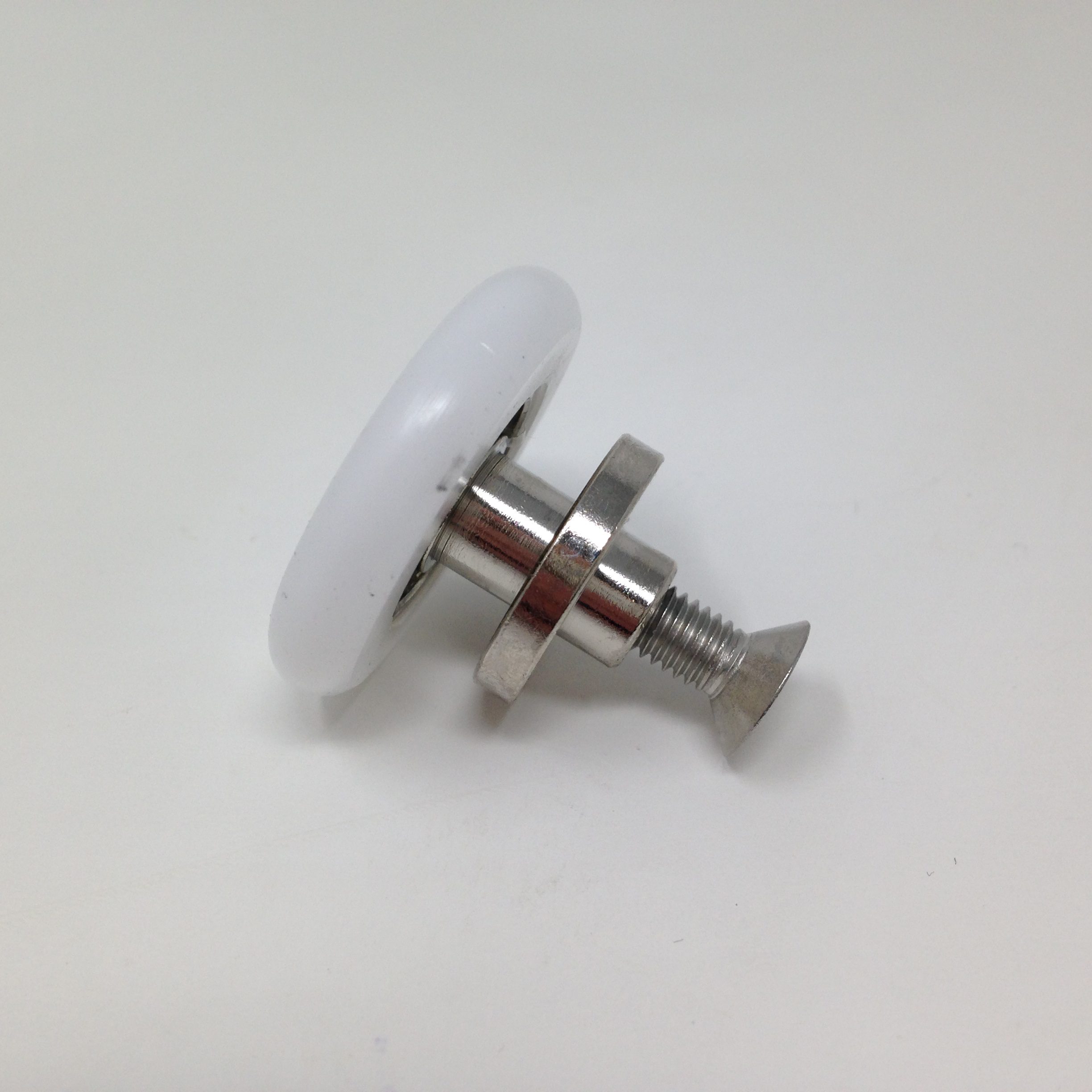 Roulette droite simple pour porte coulissante de cabine de douche. Vendue par lot de 2, cette roulette se compose d’un corps en laiton. Le bandage de la roulette est en téflon, recouvrant un roulement à billes étanche en acier inoxydable. Le choix et la qualité des matériaux employés offrent une utilisation optimale de confort, limitant ainsi le frottement et le bruit lors de la manipulation de la porte.
