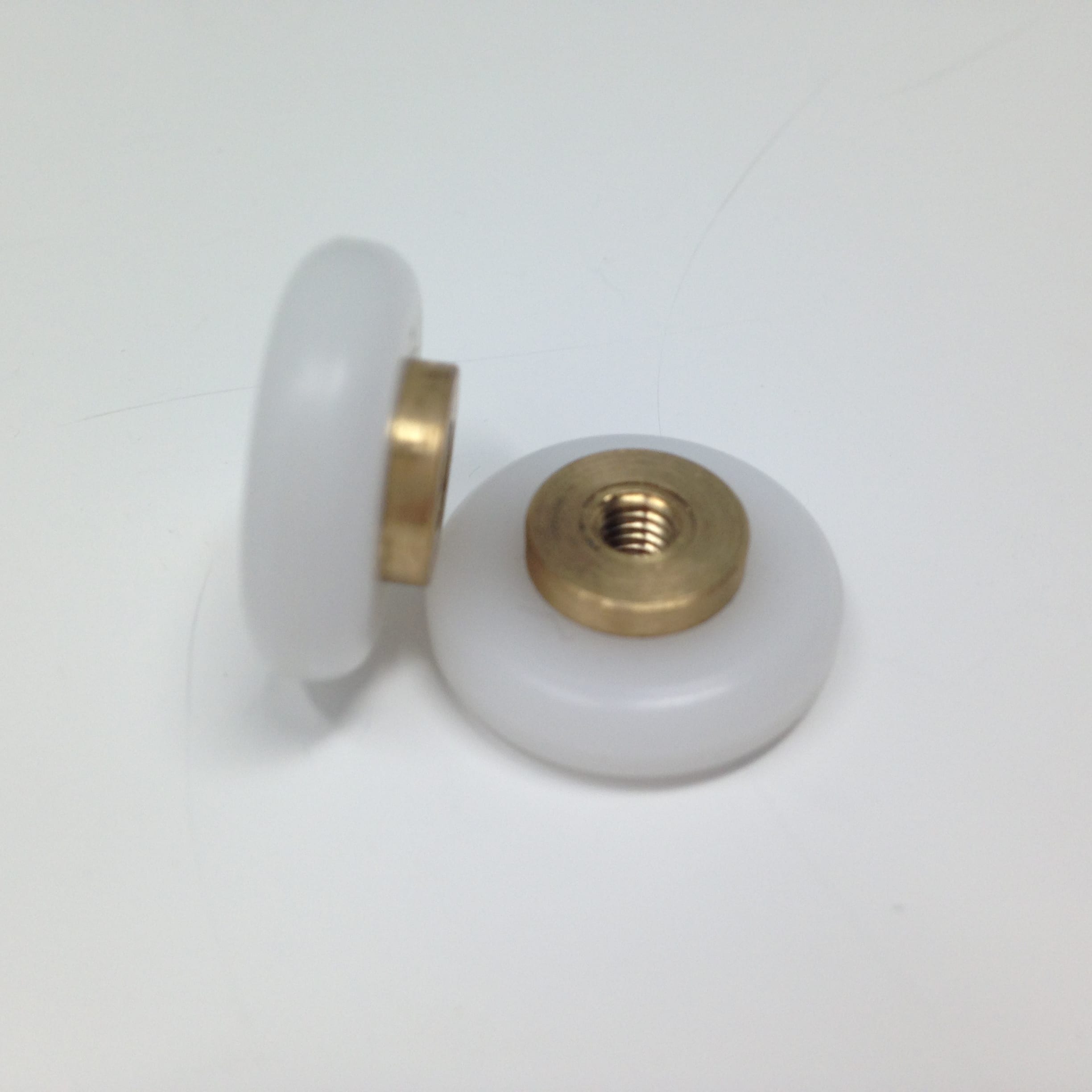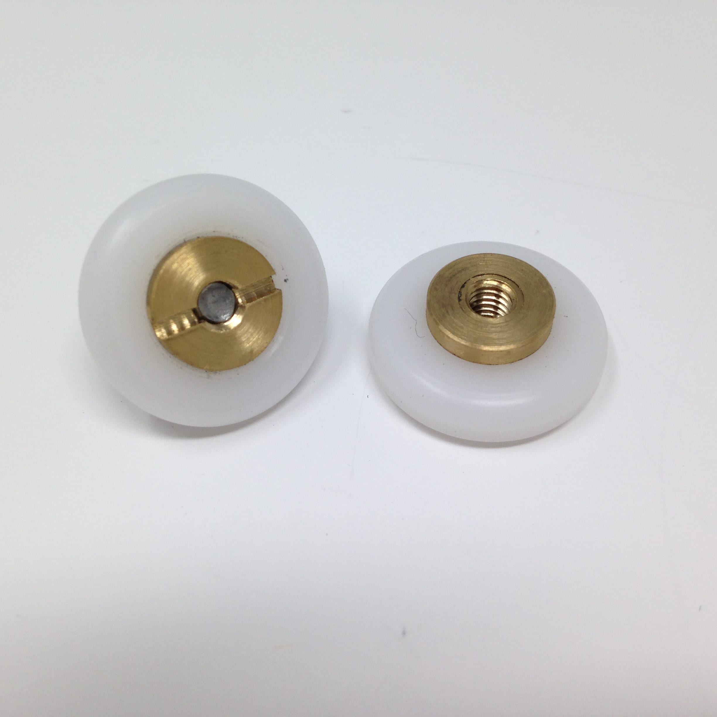 Roulette droite simple pour porte coulissante de cabine de douche. Vendue par lot de 2, cette roulette se compose d’un corps en laiton. Le bandage de la roulette est en téflon, recouvrant un roulement à billes étanche en acier inoxydable. Le choix et la qualité des matériaux employés offrent une utilisation optimale de confort, limitant ainsi le frottement et le bruit lors de la manipulation de la porte.