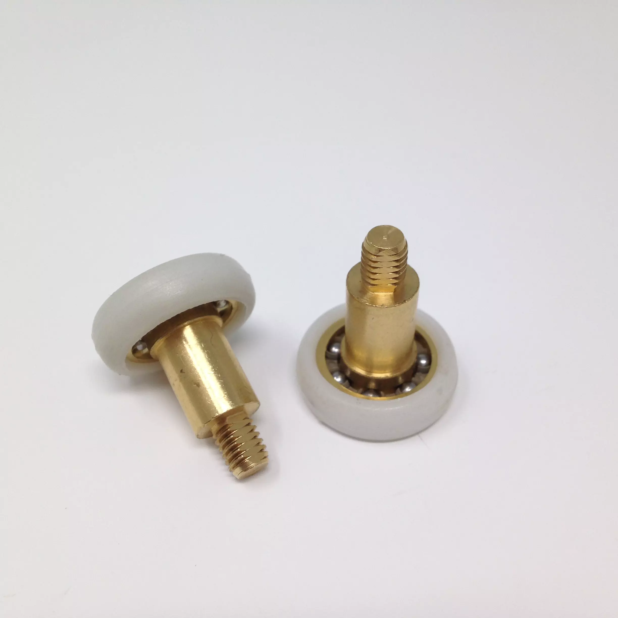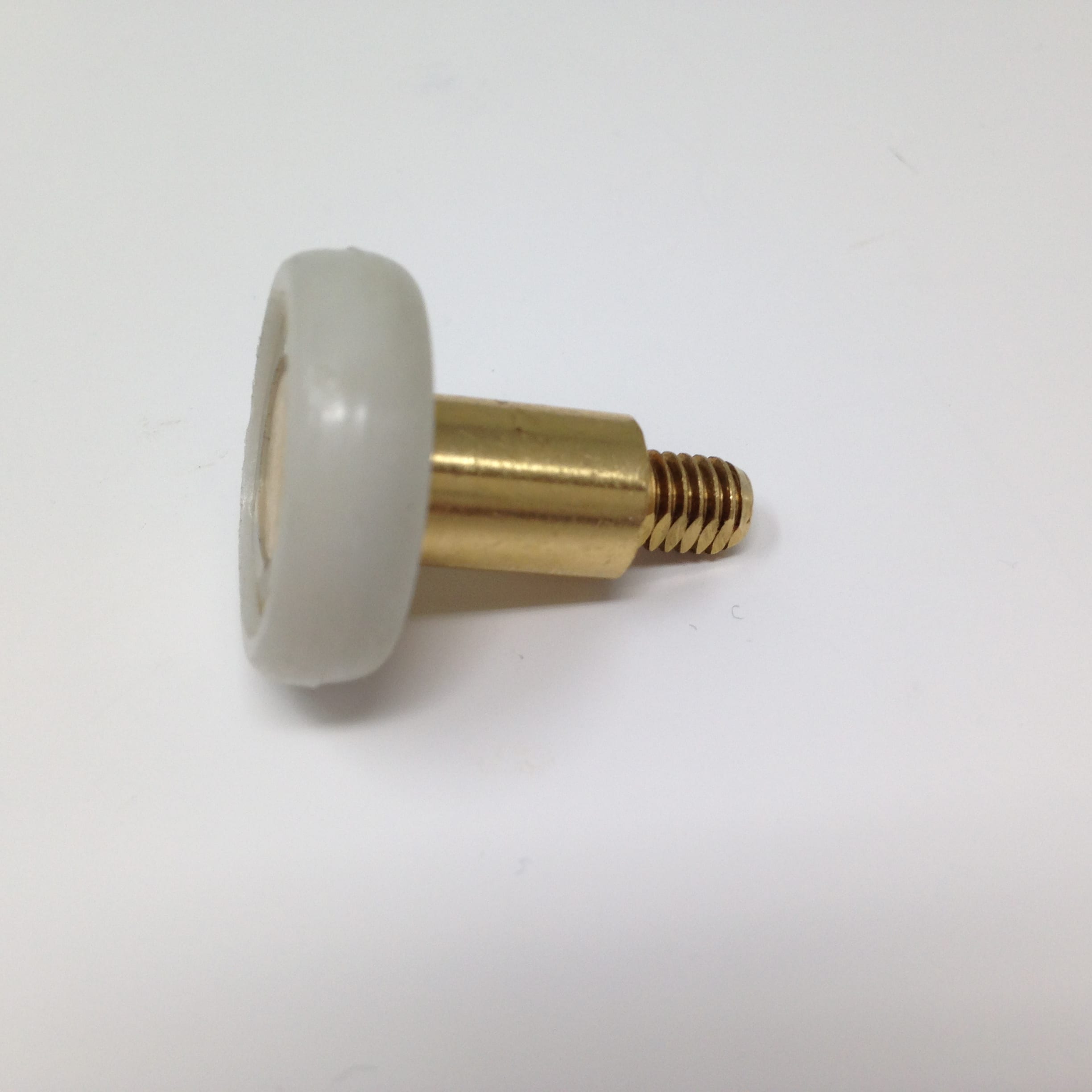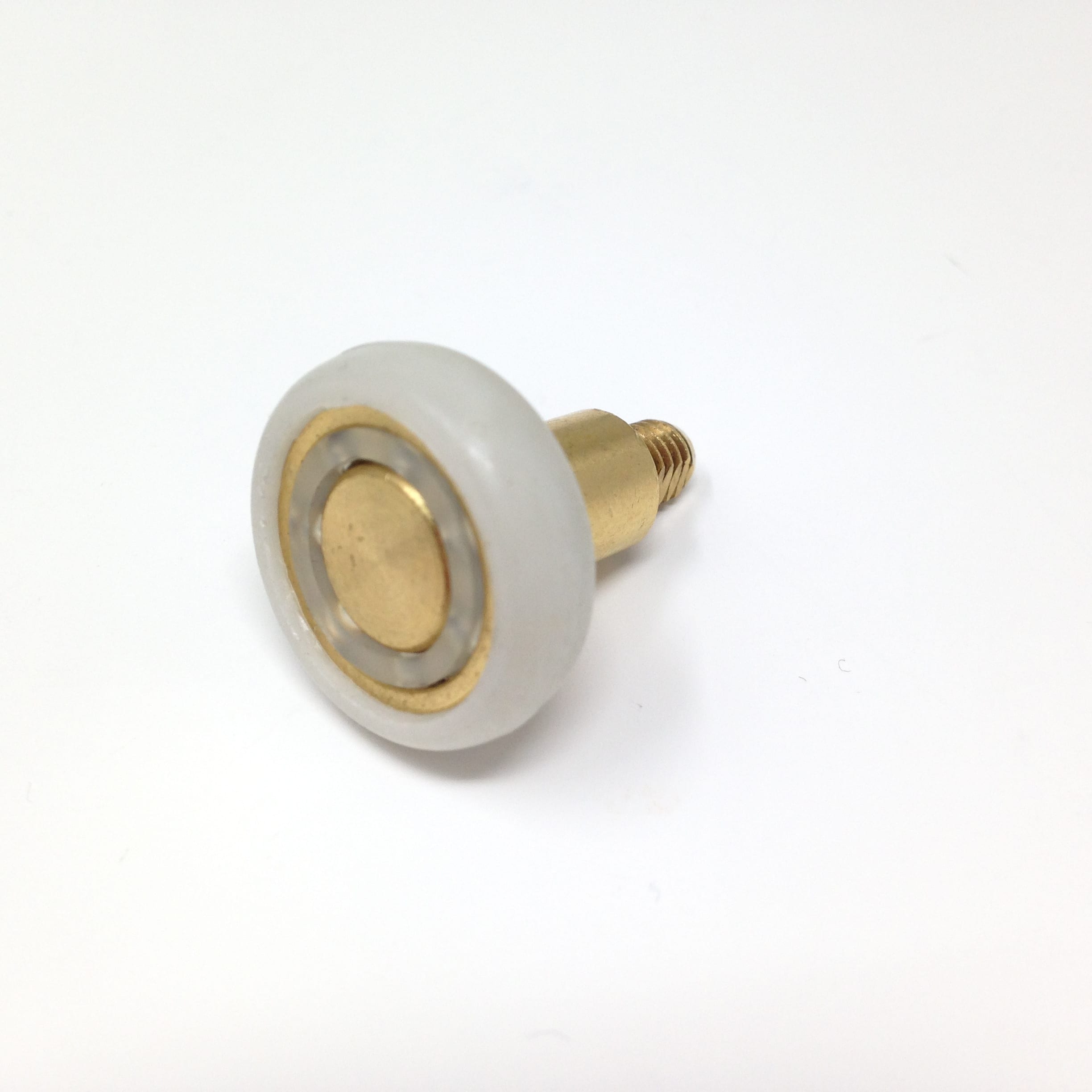 Roulette droite simple pour porte coulissante de cabine de douche. Vendue par lot de 2, cette roulette se composent d’un corps en laiton. Le bandage plat de la roulette est en téflon, recouvrant un roulement à billes étanche en acier inoxydable. Le choix et la qualité des matériaux employés offrent une utilisation optimale de confort, limitant ainsi le frottement et le bruit lors de la manipulation de la porte.