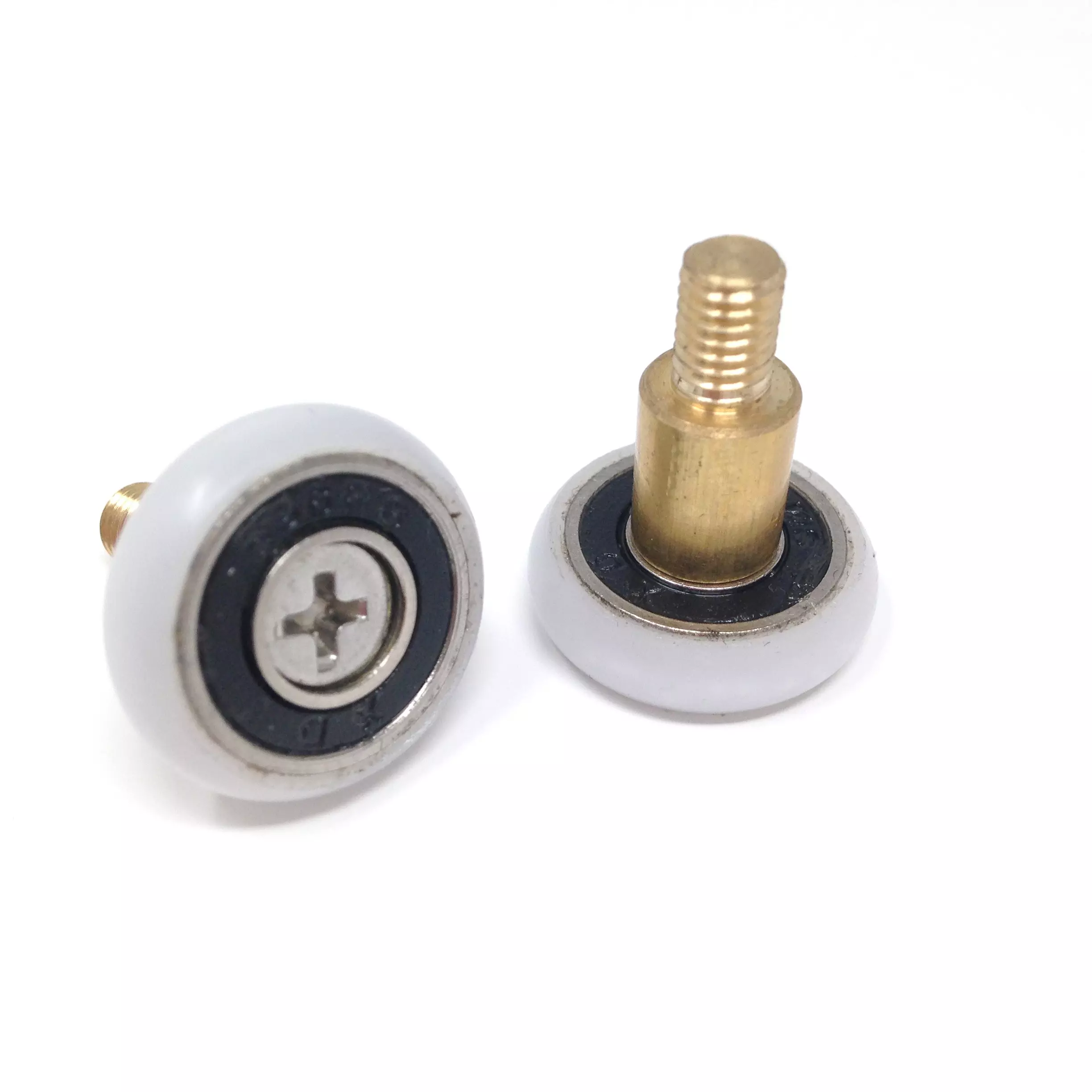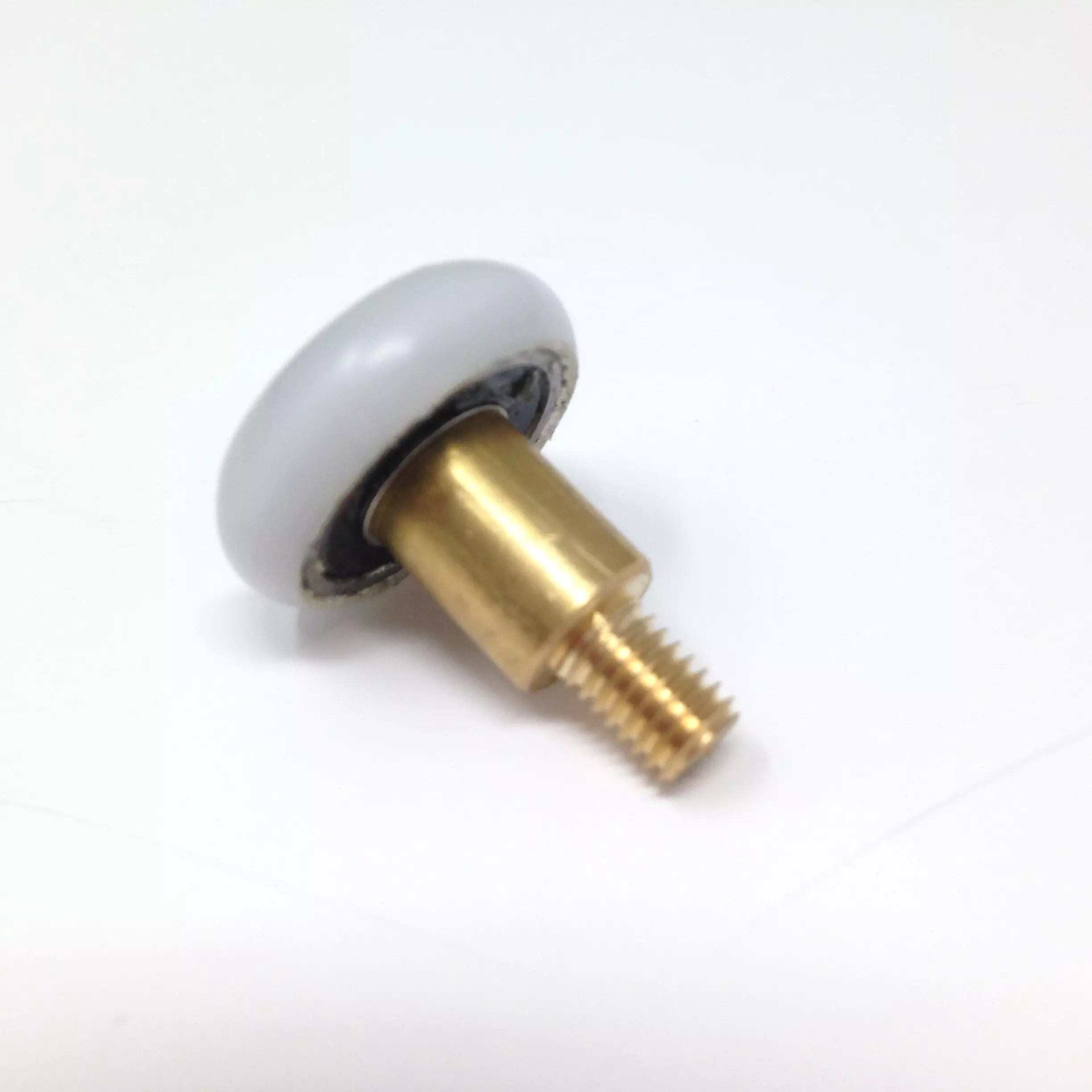 Roulette droite 6 simple pour porte coulissante de cabine de douche. Vendue par lot de 2, cette roulette se compose d’un corps en laiton. Le bandage de la roulette est en téflon, recouvrant un roulement à billes étanche en acier inoxydable. Le choix et la qualité des matériaux employés offrent une utilisation optimale de confort, limitant ainsi le frottement et le bruit lors de la manipulation de la porte.