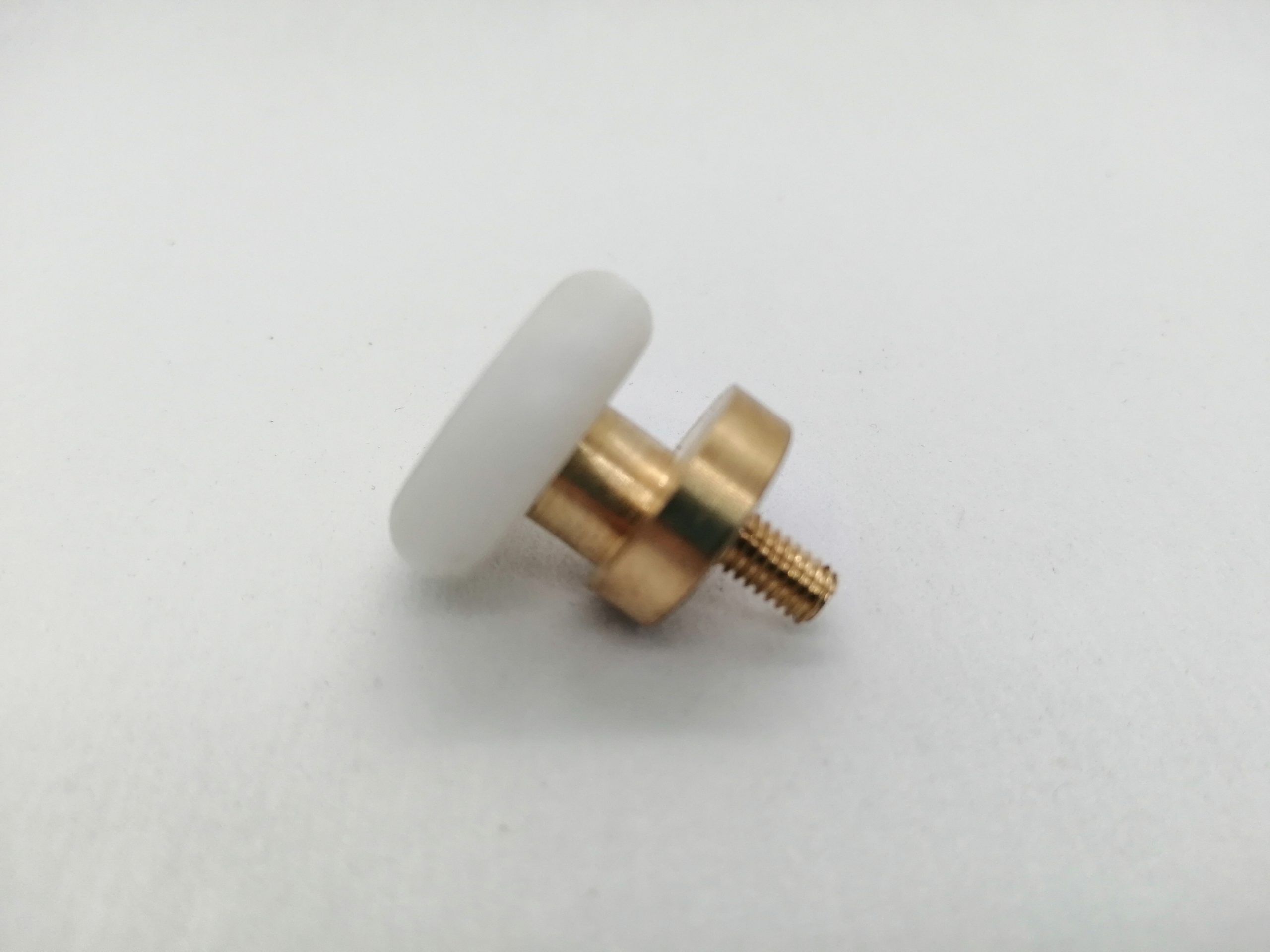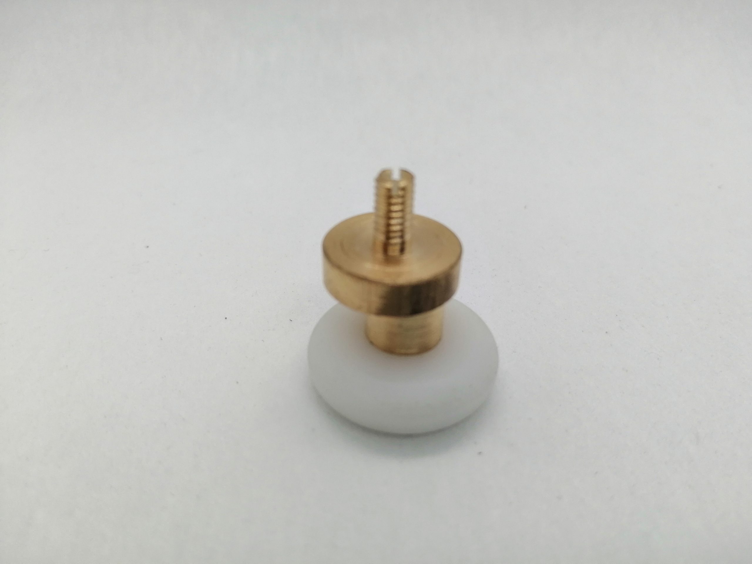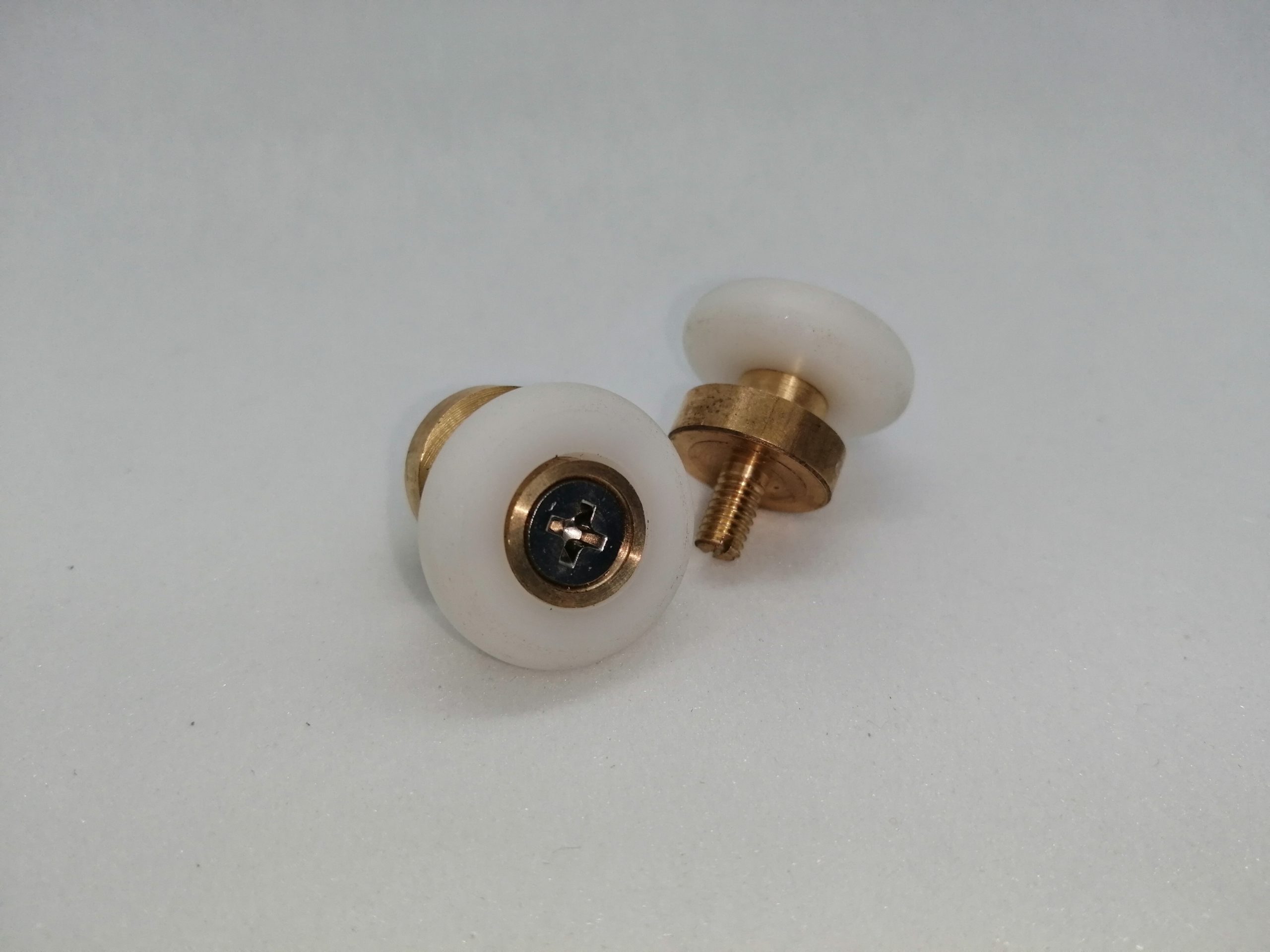 Roulette simple droite pour porte coulissante de cabine de douche. Vendue à l’unité, cette roulette se compose d’un corps en laiton. Le bandage de la roulette est en téflon, recouvrant un roulement à billes étanche en acier inoxydable. Le choix et la qualité des matériaux employés offrent une utilisation optimale de confort, limitant ainsi le frottement et le bruit lors de la manipulation de la porte.