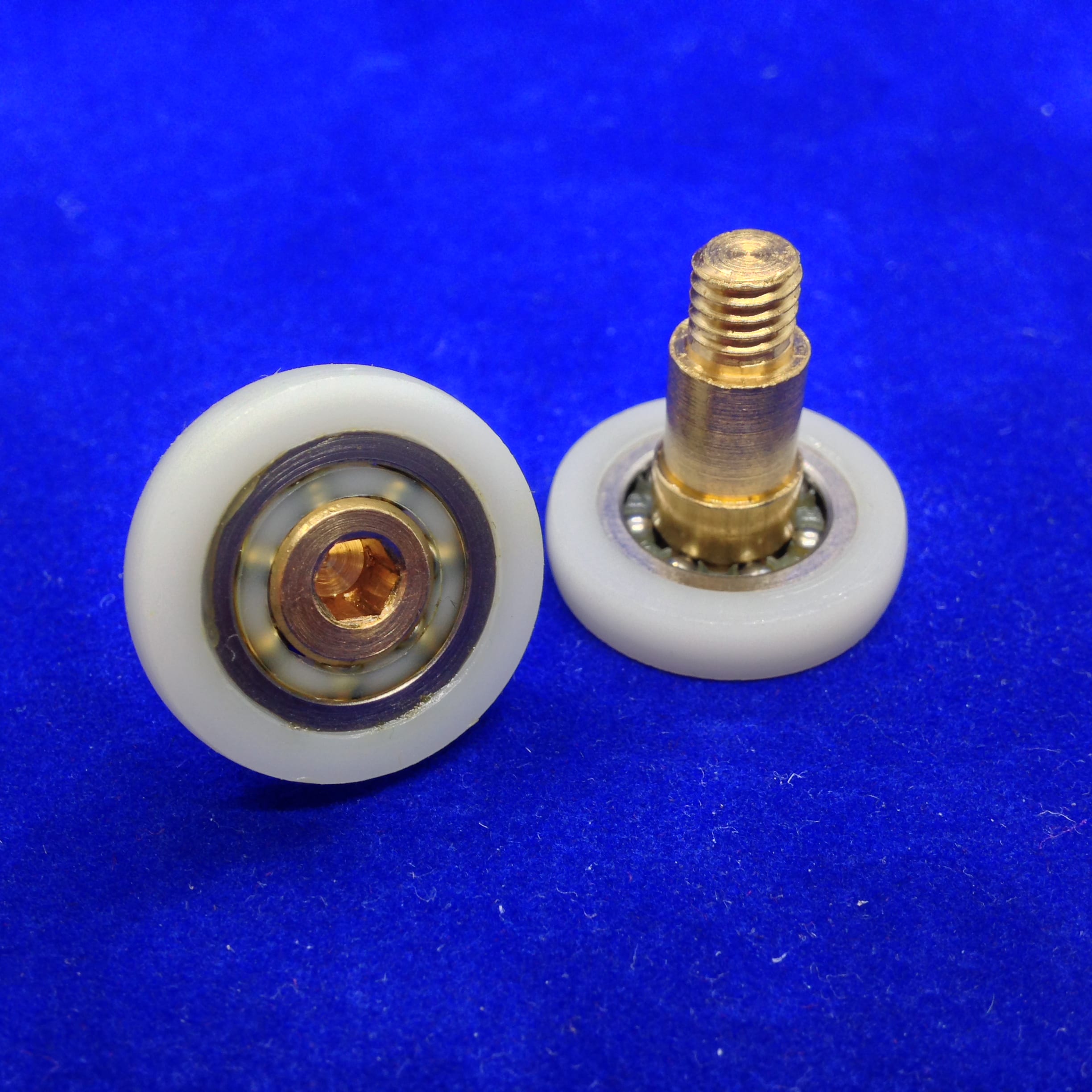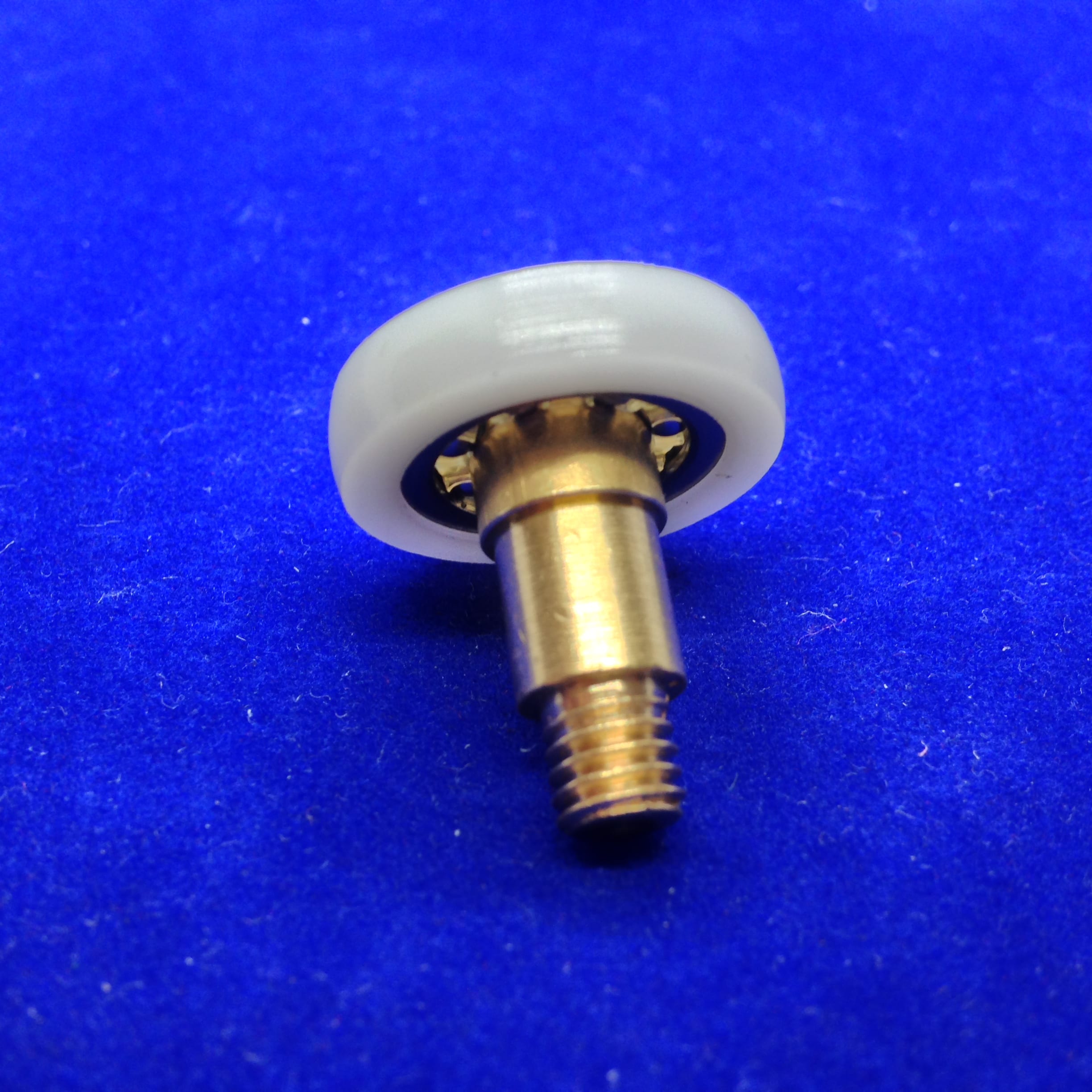 Roulette droite simple pour porte coulissante de cabine de douche. Vendue par lot de 2, cette roulette se composent d’un corps en laiton. Le bandage plat de la roulette est en téflon, recouvrant un roulement à billes étanche en acier inoxydable. Le choix et la qualité des matériaux employés offrent une utilisation optimale de confort, limitant ainsi le frottement et le bruit lors de la manipulation de la porte.