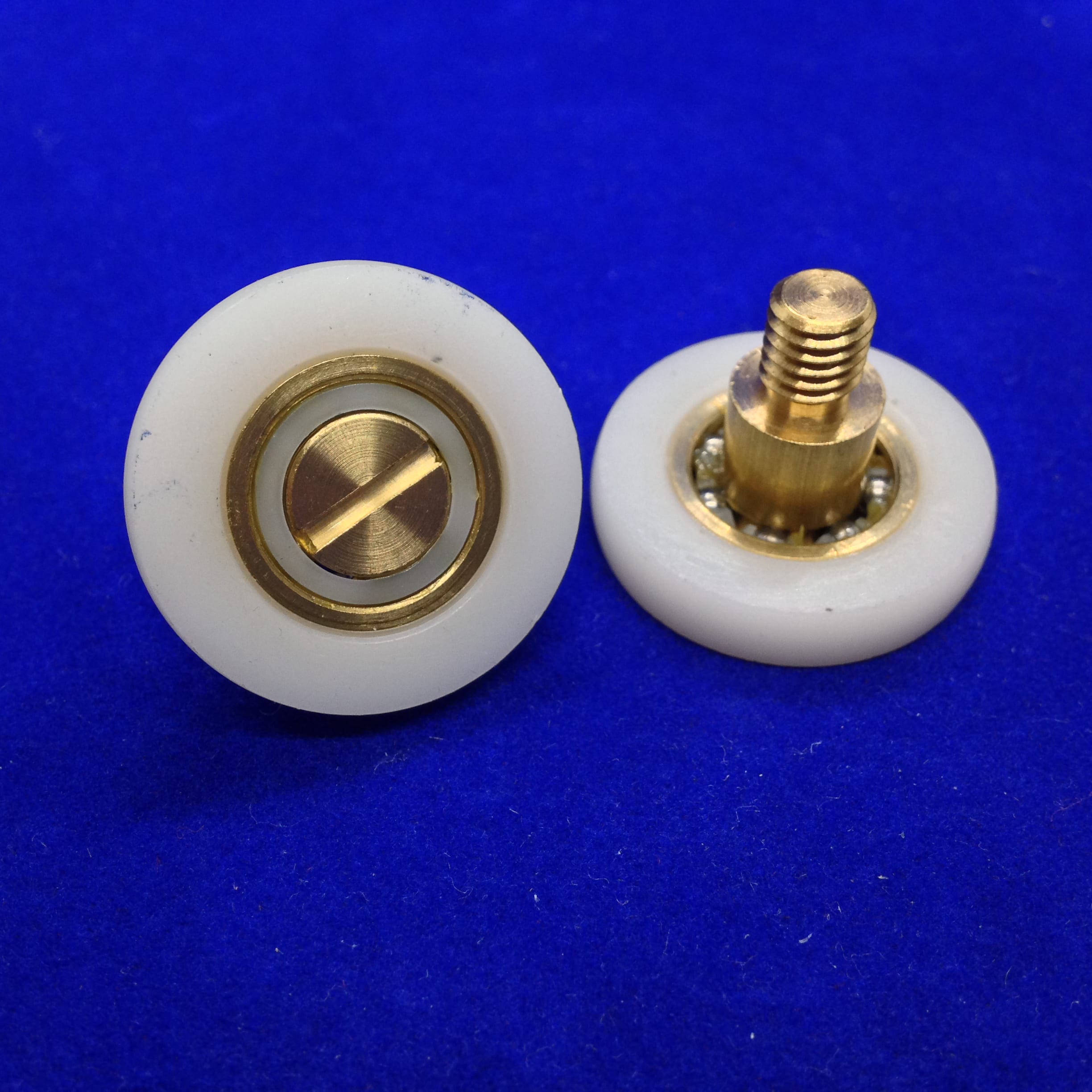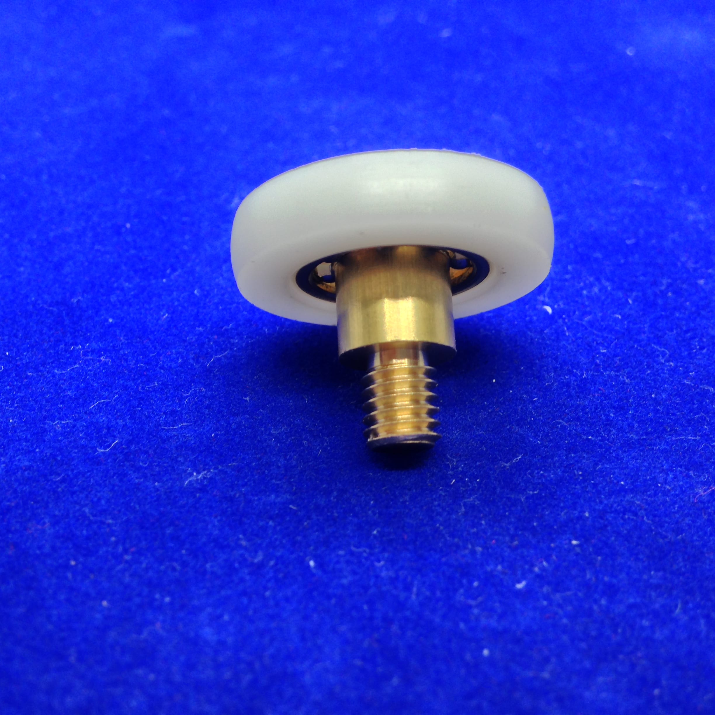 Roulette droite simple pour porte coulissante de cabine de douche. Vendue par lot de 2, cette roulette se composent d’un corps en laiton. Le bandage plat de la roulette est en téflon, recouvrant un roulement à billes étanche en acier inoxydable. Le choix et la qualité des matériaux employés offrent une utilisation optimale de confort, limitant ainsi le frottement et le bruit lors de la manipulation de la porte.