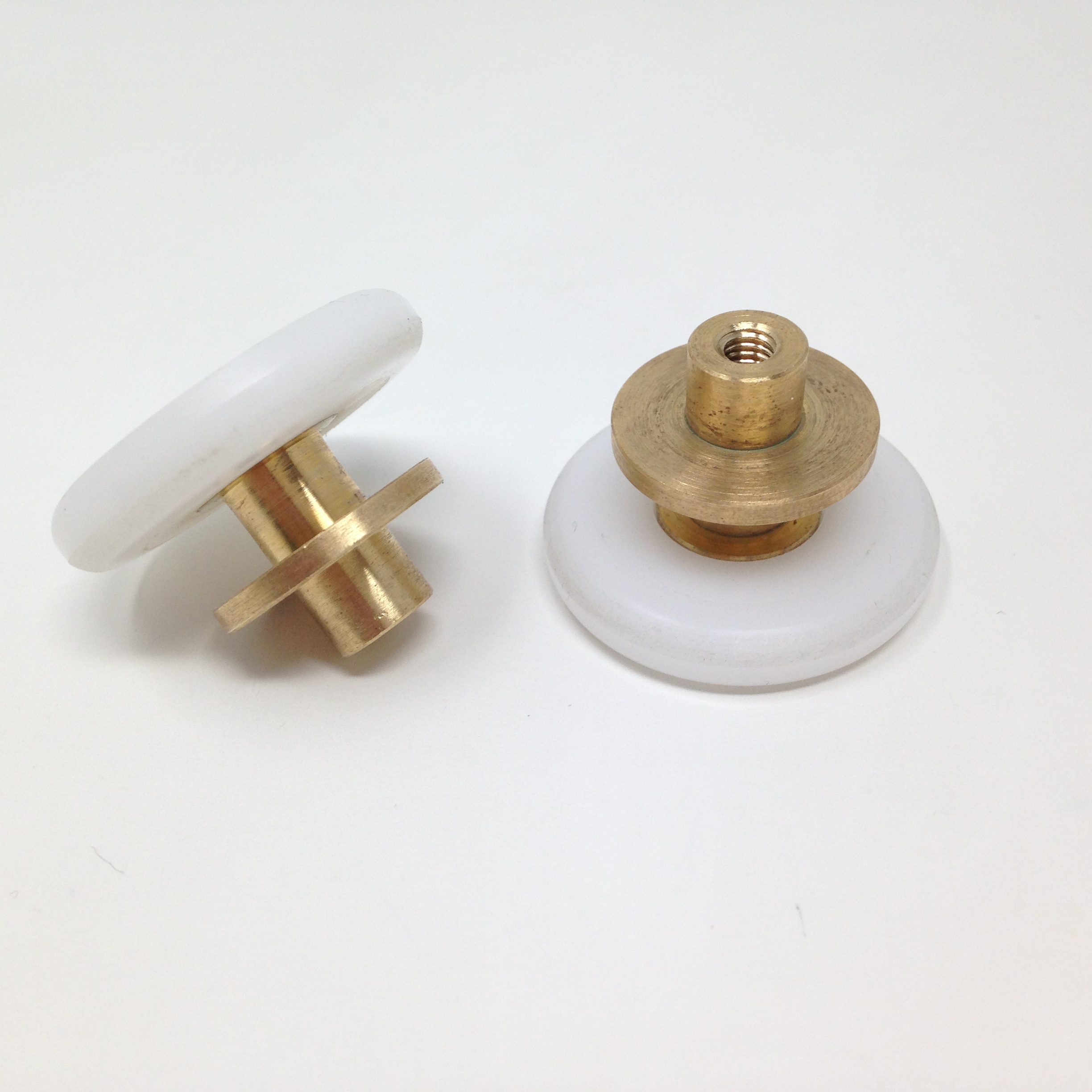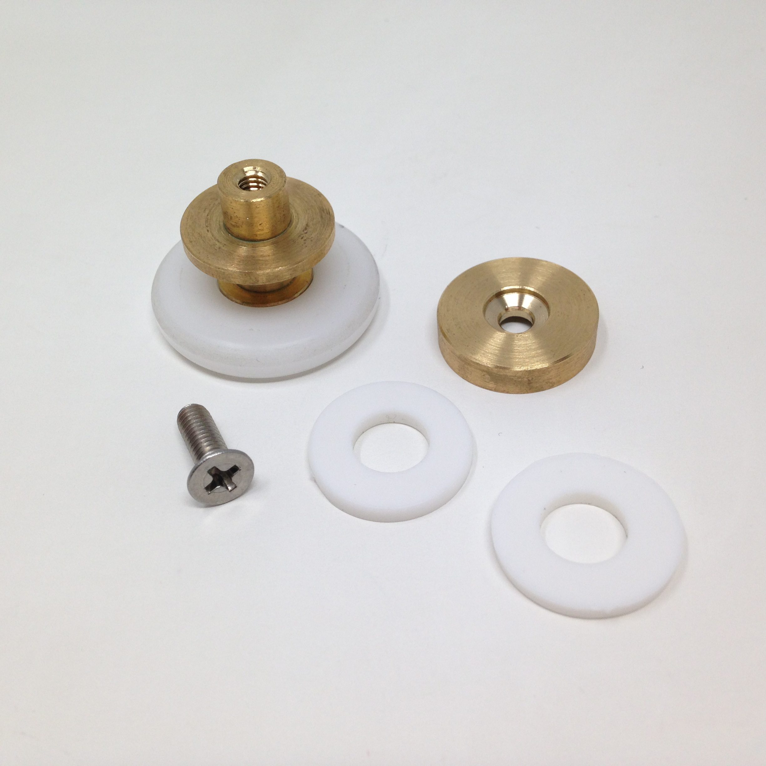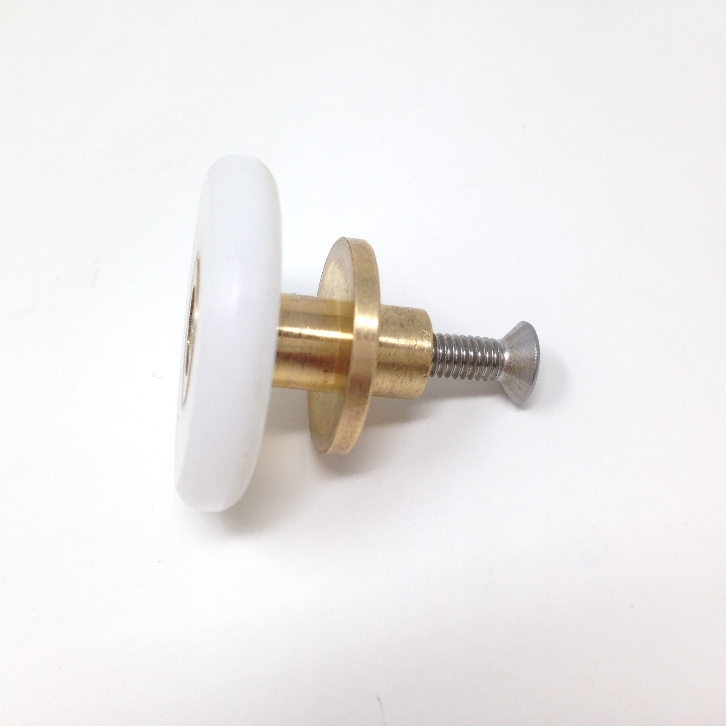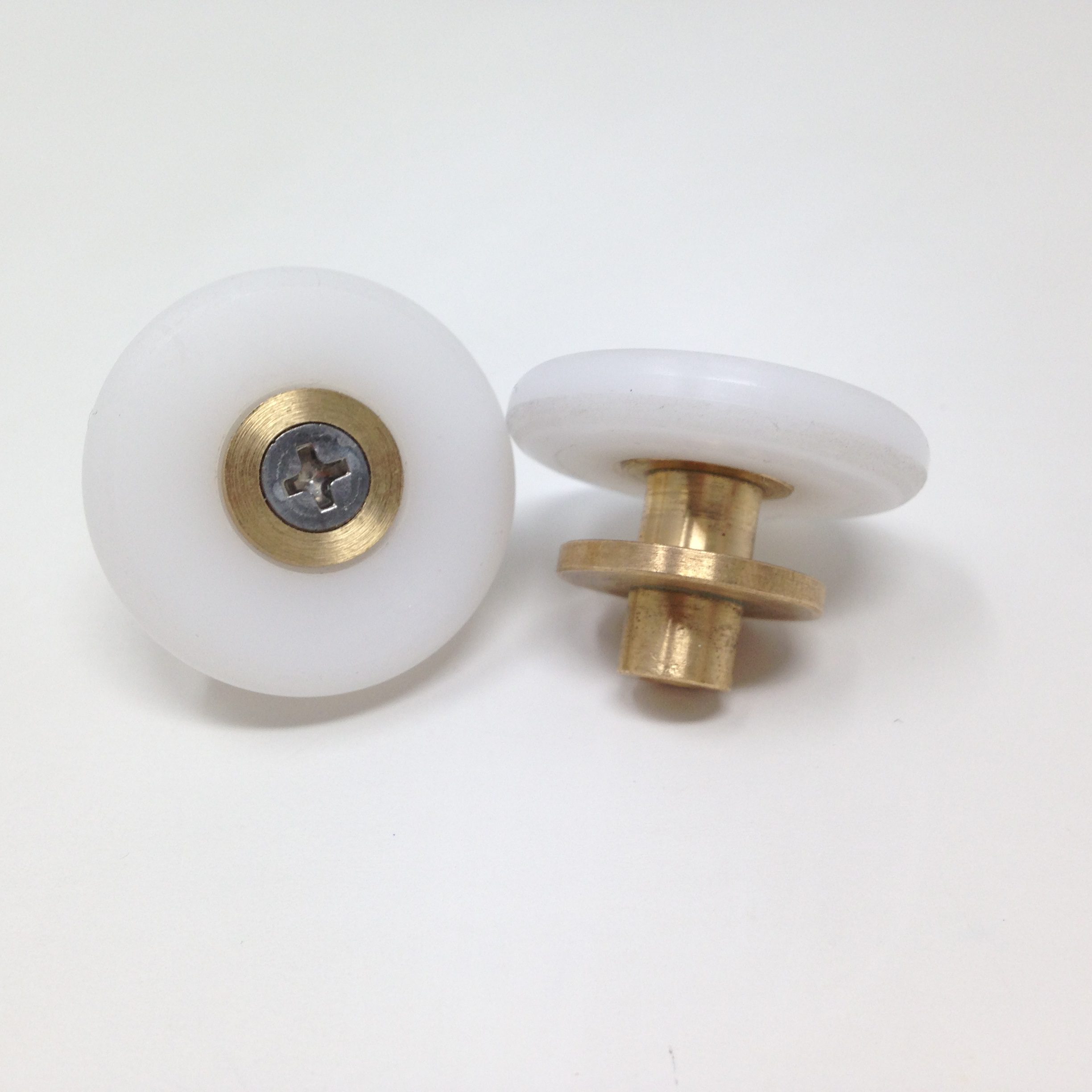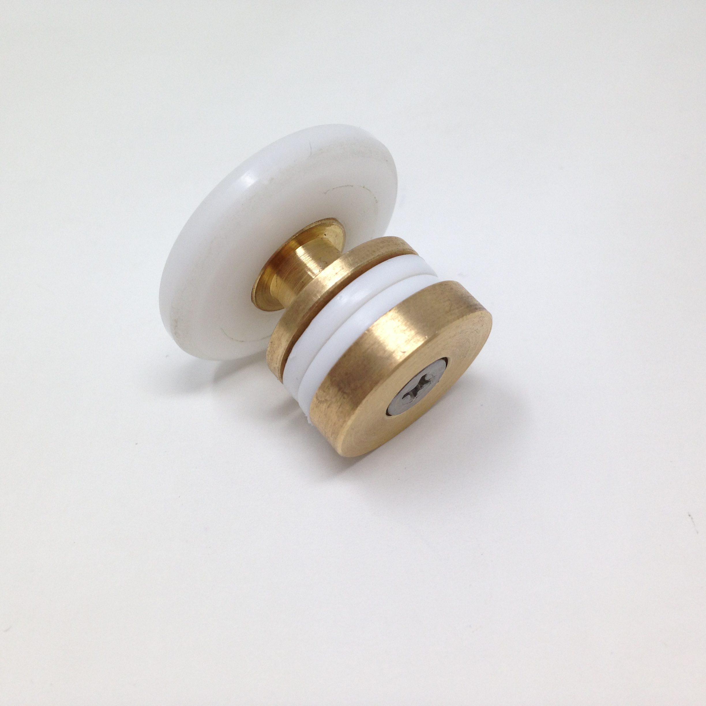 Roulette droite simple pour porte coulissante de cabine de douche. Vendue par lot de 2, cette roulette se compose d’un corps en laiton. Le bandage de la roulette est en téflon, recouvrant un roulement à billes étanche en acier inoxydable. Le choix et la qualité des matériaux employés offrent une utilisation optimale de confort, limitant ainsi le frottement et le bruit lors de la manipulation de la porte.