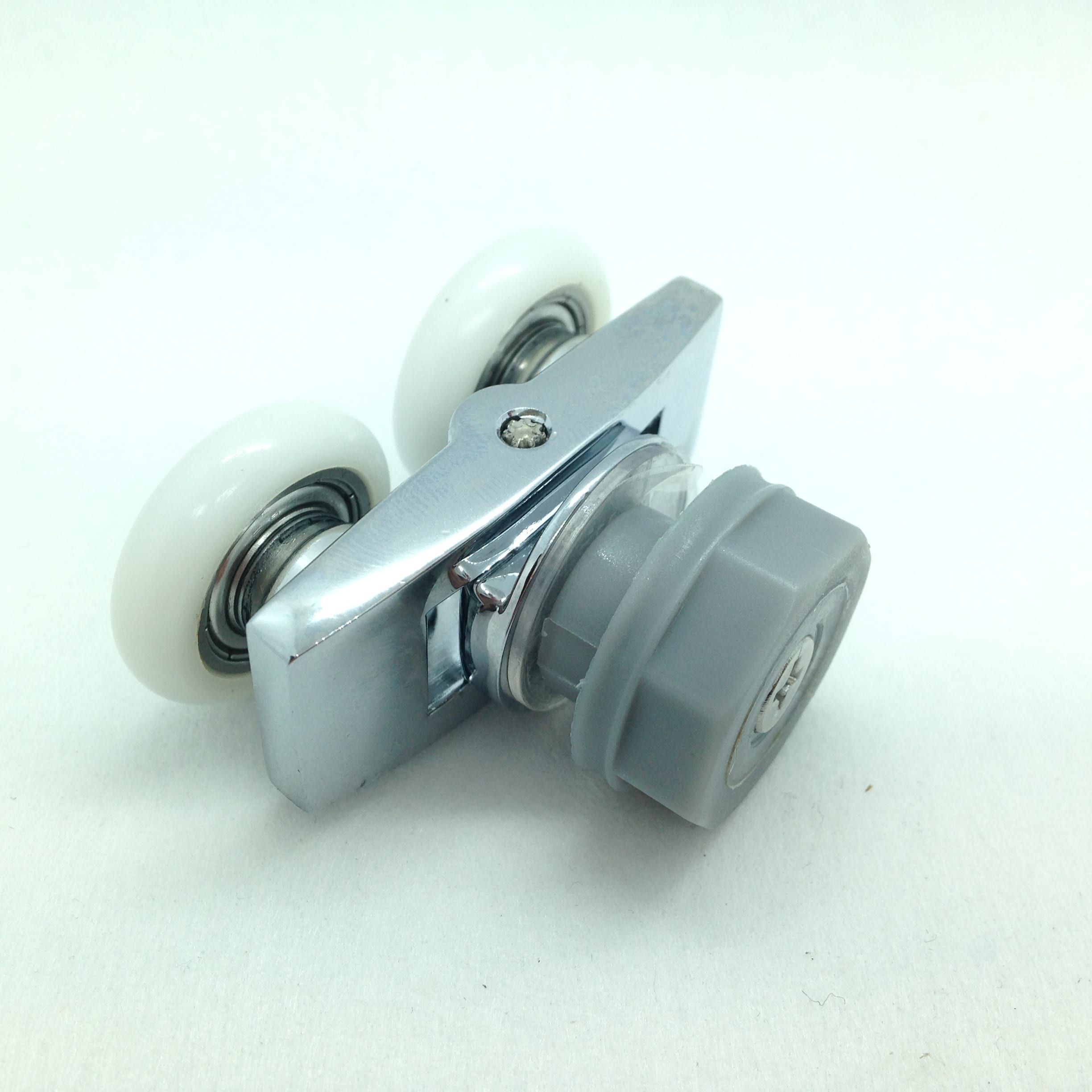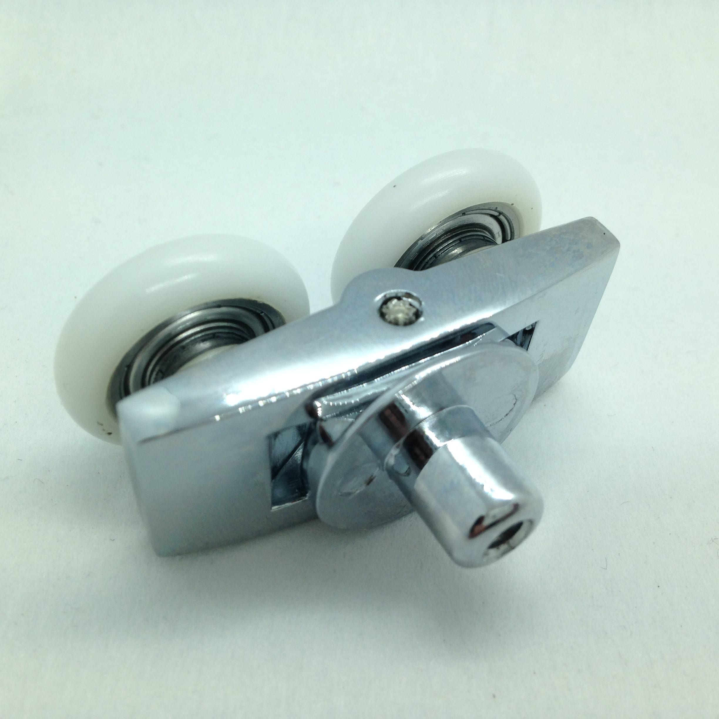 Roulette double pour porte coulissante de cabine de douche. Vendues à l’unité, cette roulette se compose d’un corps en laiton et d’éléments de soutien en plastique type ABS. Le bandage de la roulette est en téflon, recouvrant un roulement à billes étanche en acier inoxydable. Le choix et la qualité des matériaux employés offrent une utilisation optimale de confort, limitant ainsi le frottement et le bruit lors de la manipulation de la porte.