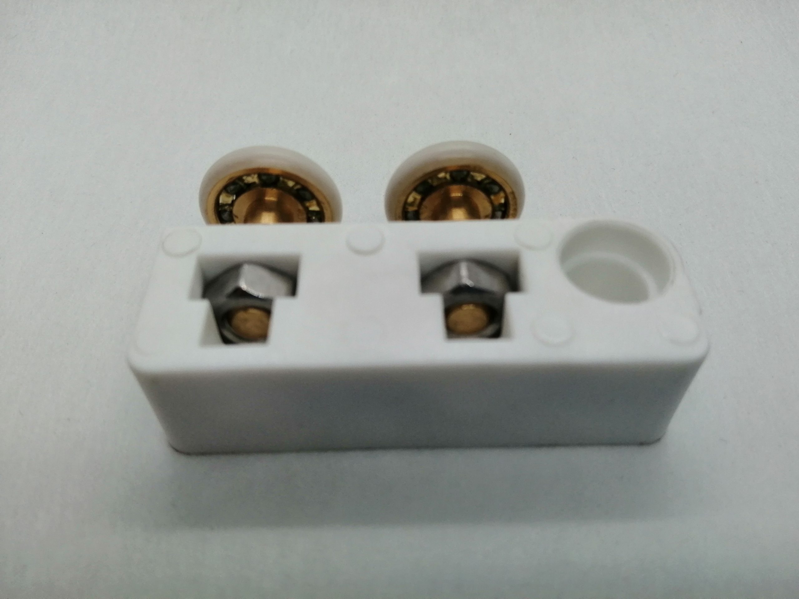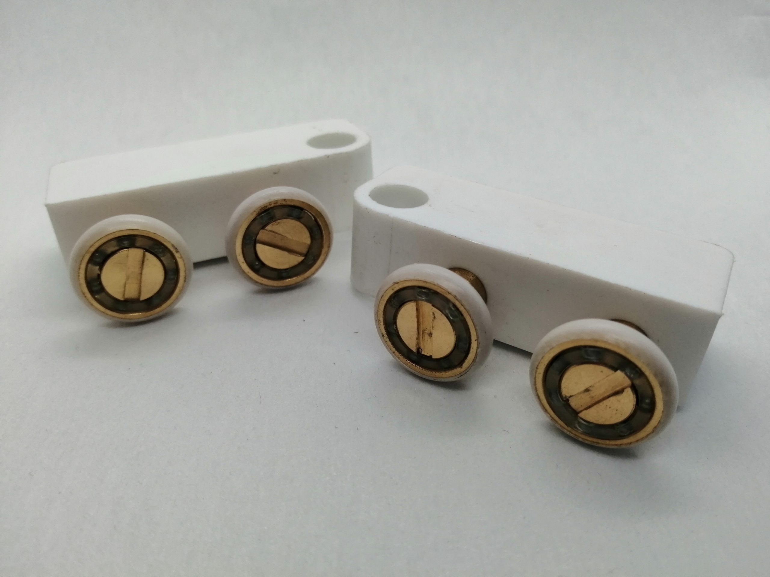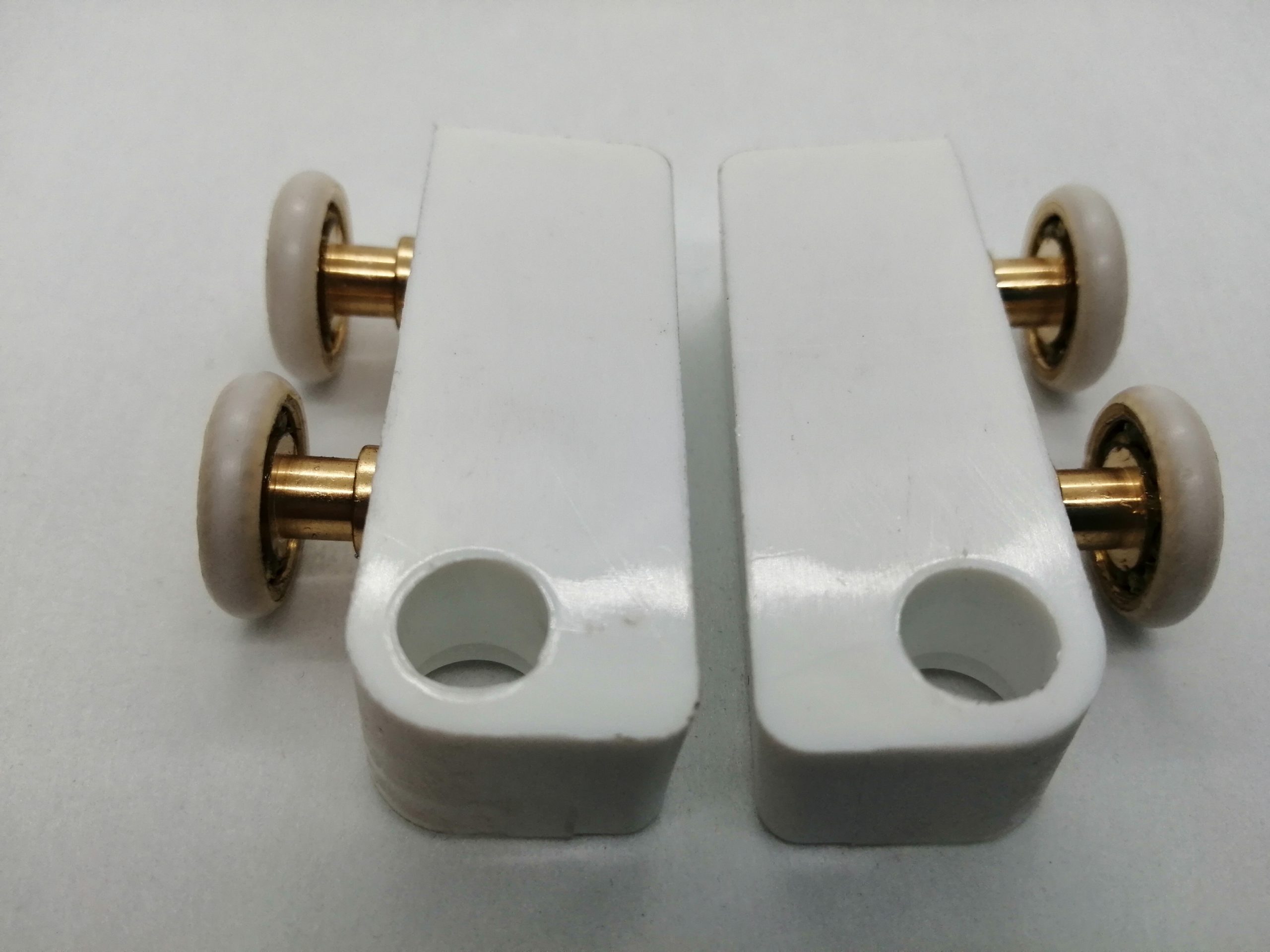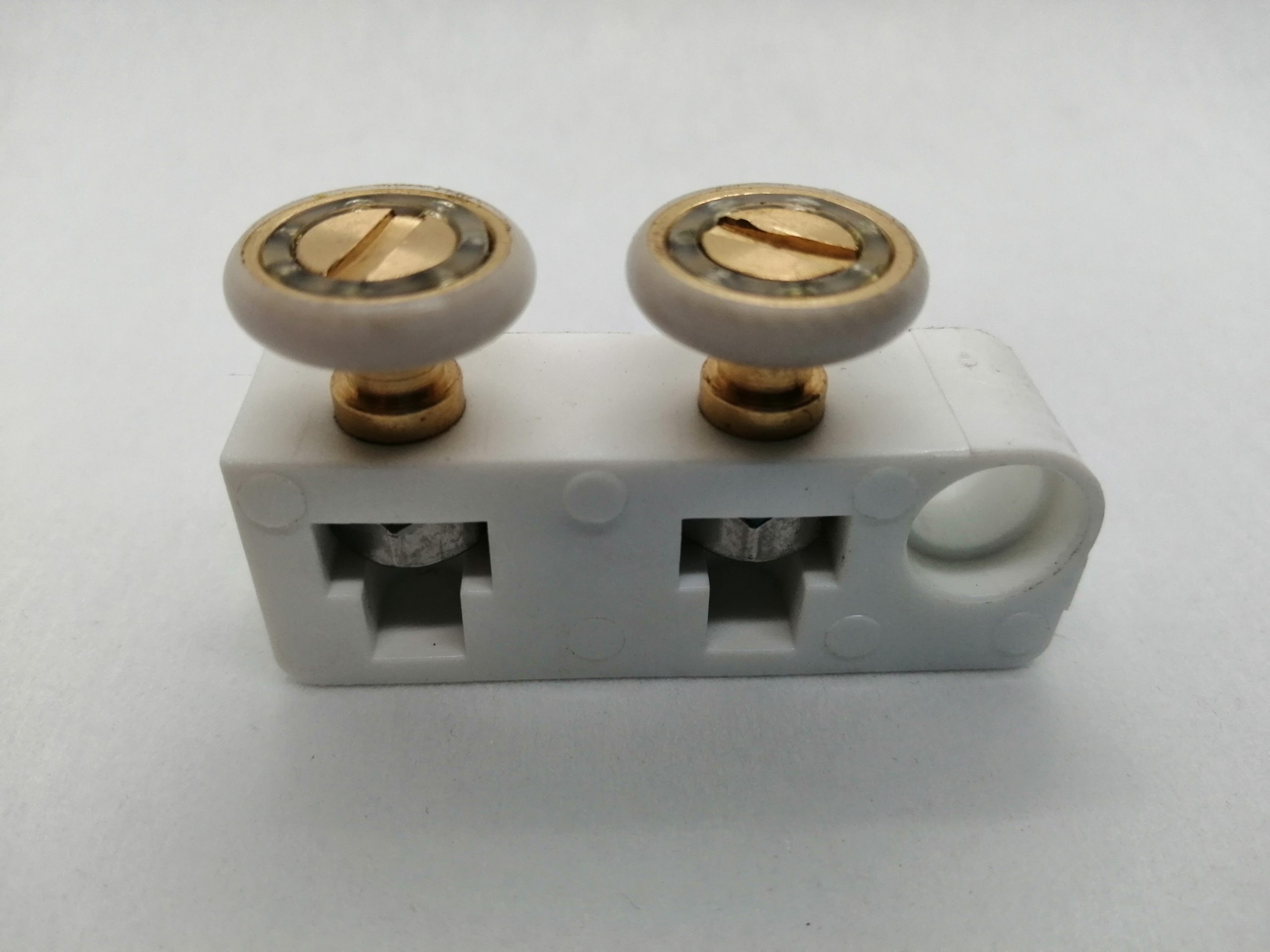 Roulette double pour porte coulissante de cabine de douche. Vendue par lot de 2, cette roulette se compose d’un corps en plastique type ABS et en laiton. Le bandage de la roulette est en téflon. Le choix et la qualité des matériaux employés offrent une utilisation optimale de confort, limitant ainsi le frottement et le bruit lors de la manipulation de la porte.