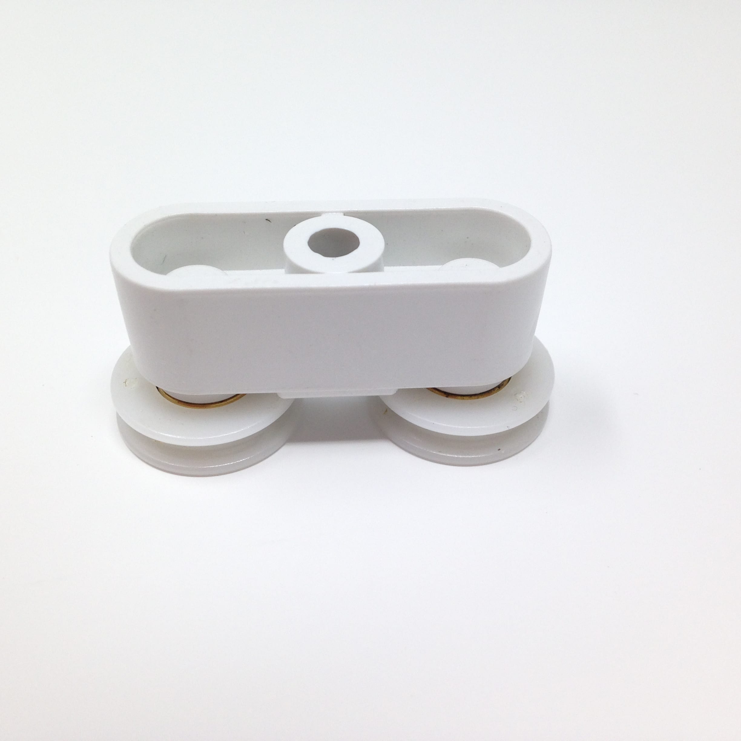 Roulette double pour porte coulissante de cabine de douche. Vendues à l’unité, cette roulette se compose d’un corps en laiton et d’éléments de soutien en plastique type ABS. Le bandage de la roulette est en téflon, recouvrant un roulement à billes étanche en acier inoxydable. Le choix et la qualité des matériaux employés offrent une utilisation optimale de confort, limitant ainsi le frottement et le bruit lors de la manipulation de la porte.