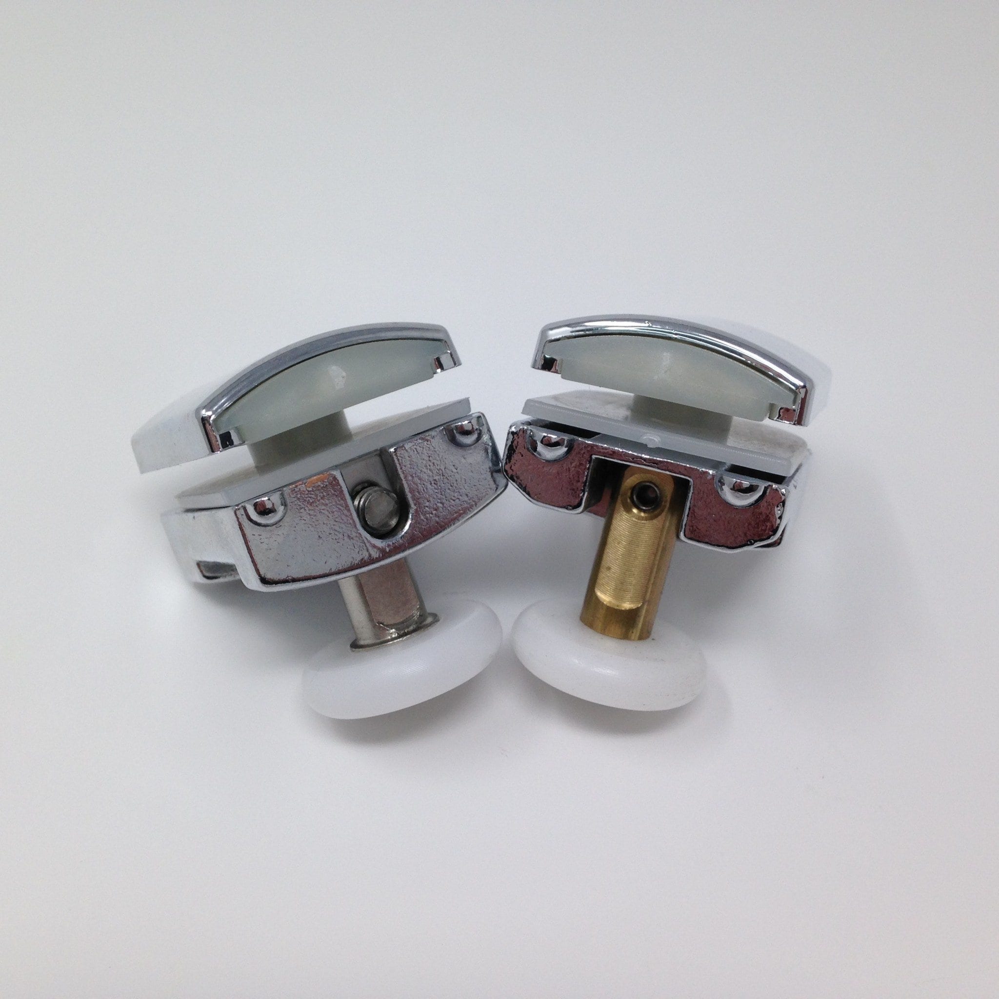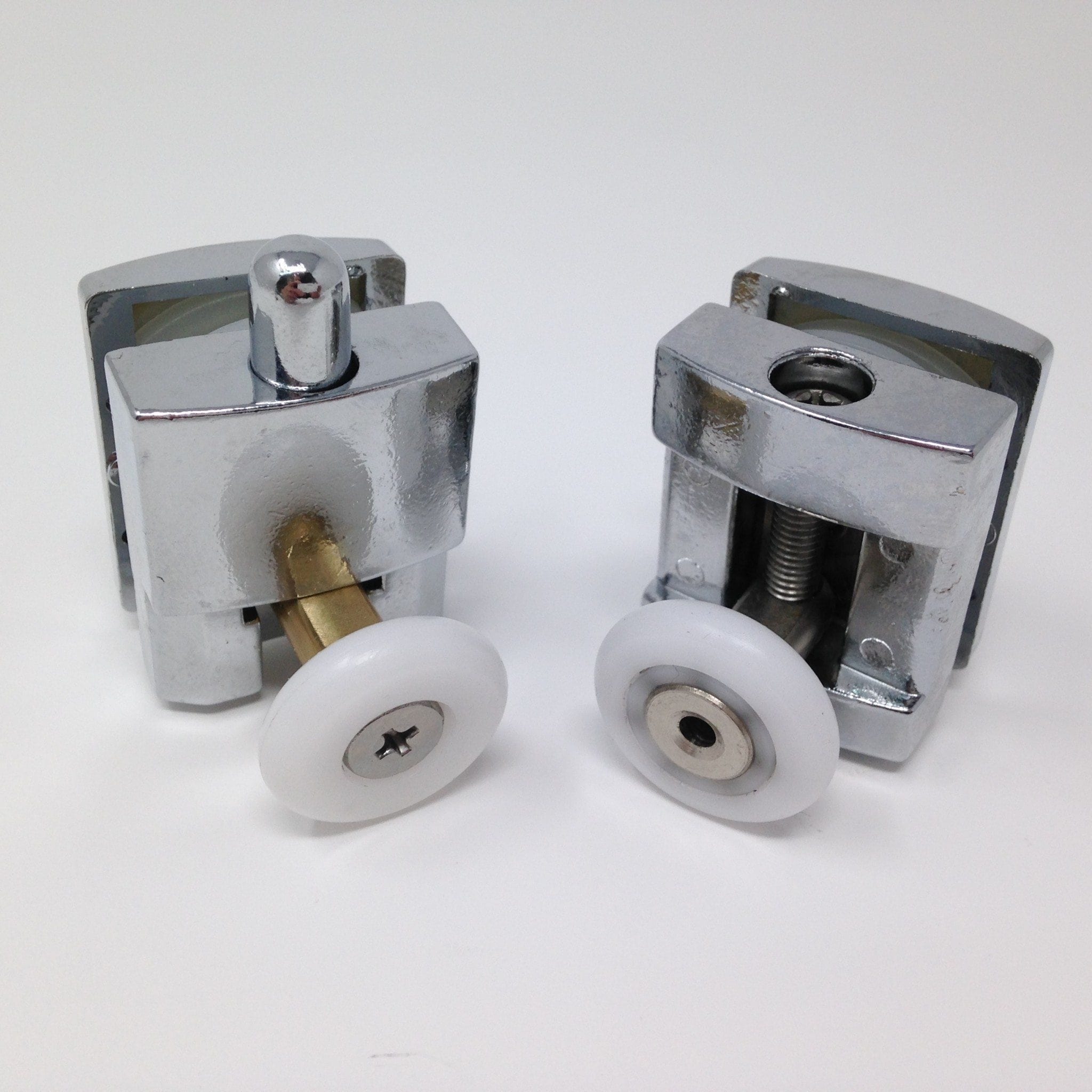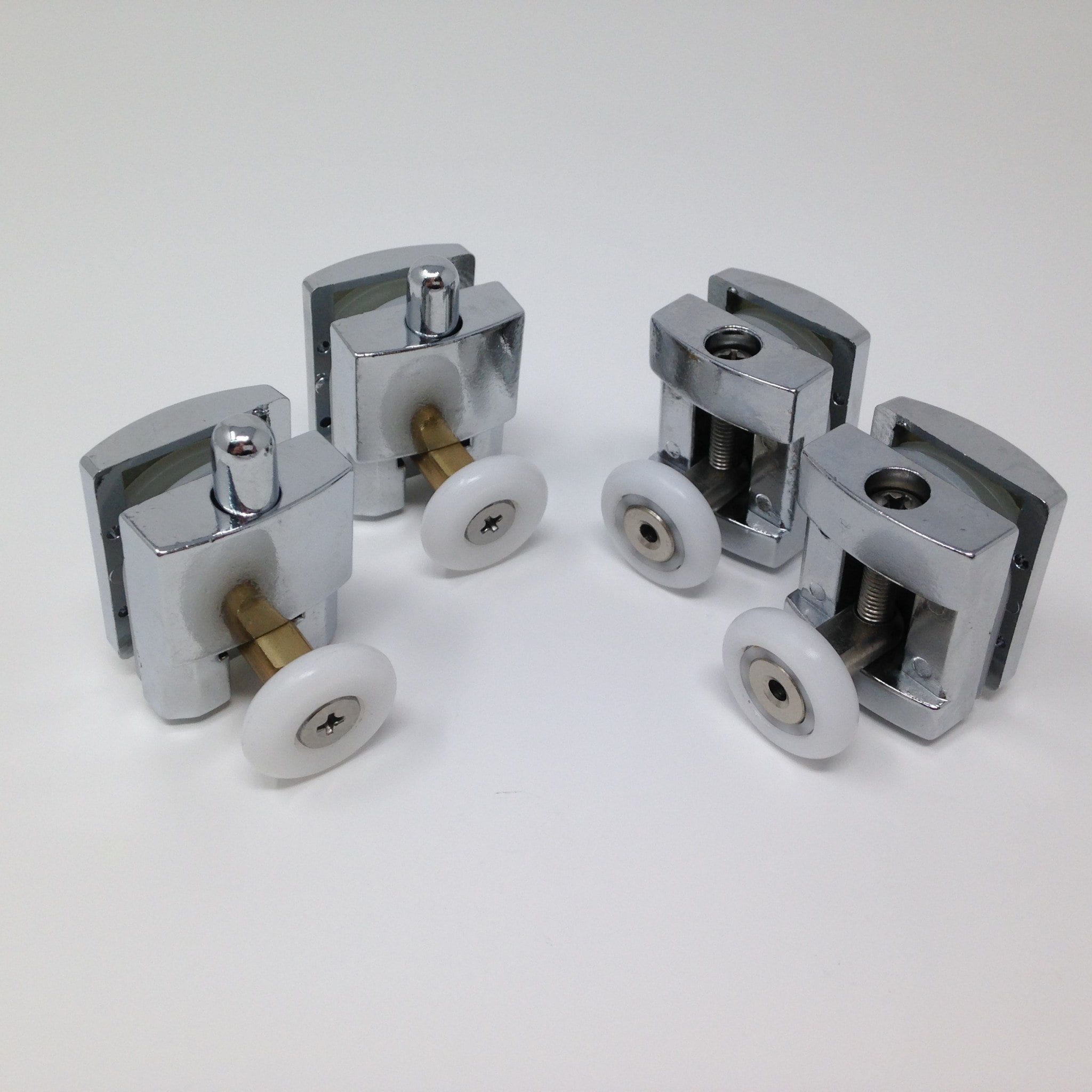 Roulette simple haute et basse pour porte coulissante de cabine de douche. Vendues par lot de 4, ces roulettes se composent d’un corps en laiton ou en alliage de zinc et d’éléments de soutien en plastique type ABS. Le bandage de la roulette est en téflon, recouvrant un roulement à billes étanche en acier inoxydable. Le choix et la qualité des matériaux employés offrent une utilisation optimale de confort, limitant ainsi le frottement et le bruit lors de la manipulation de la porte.