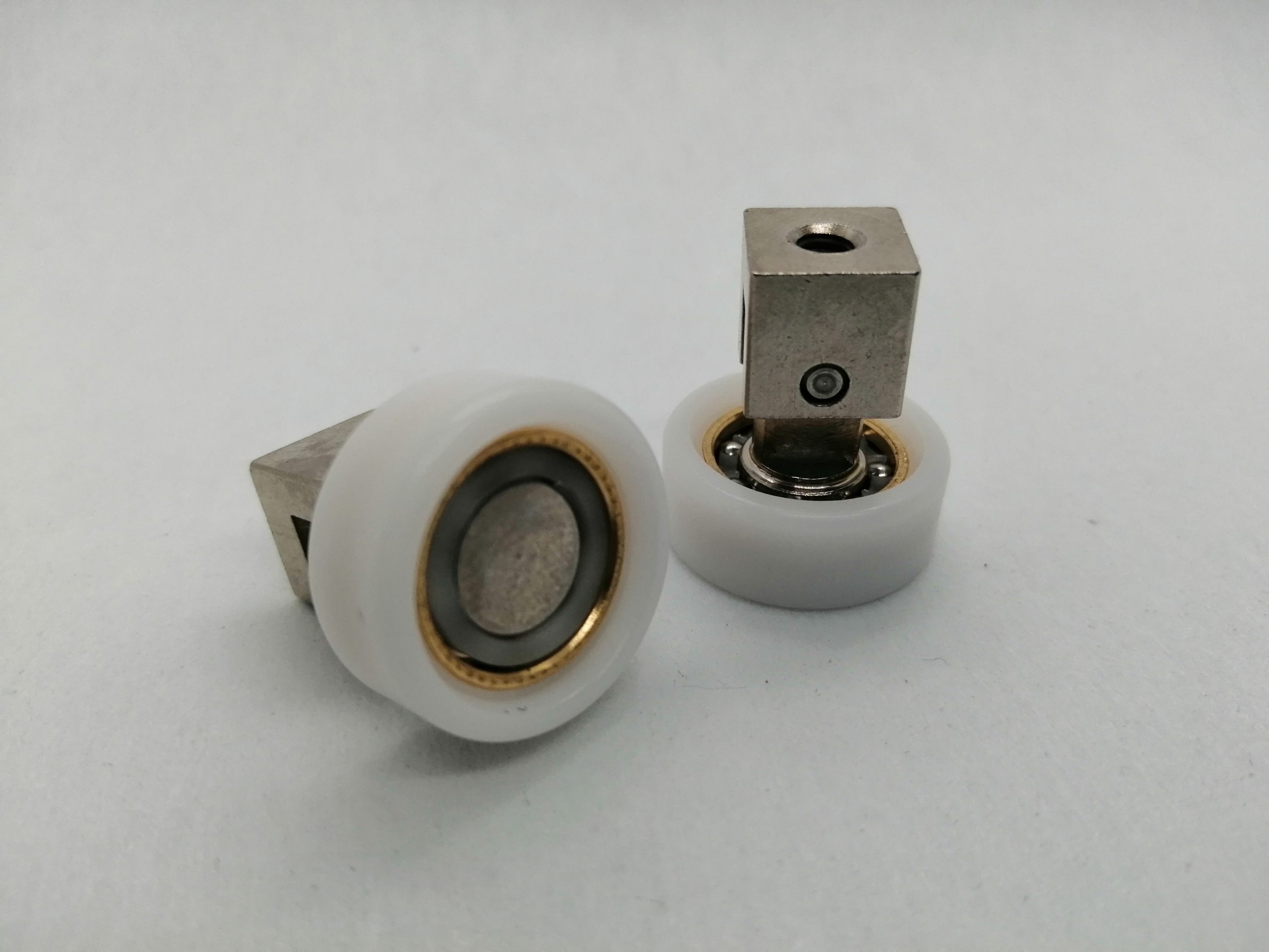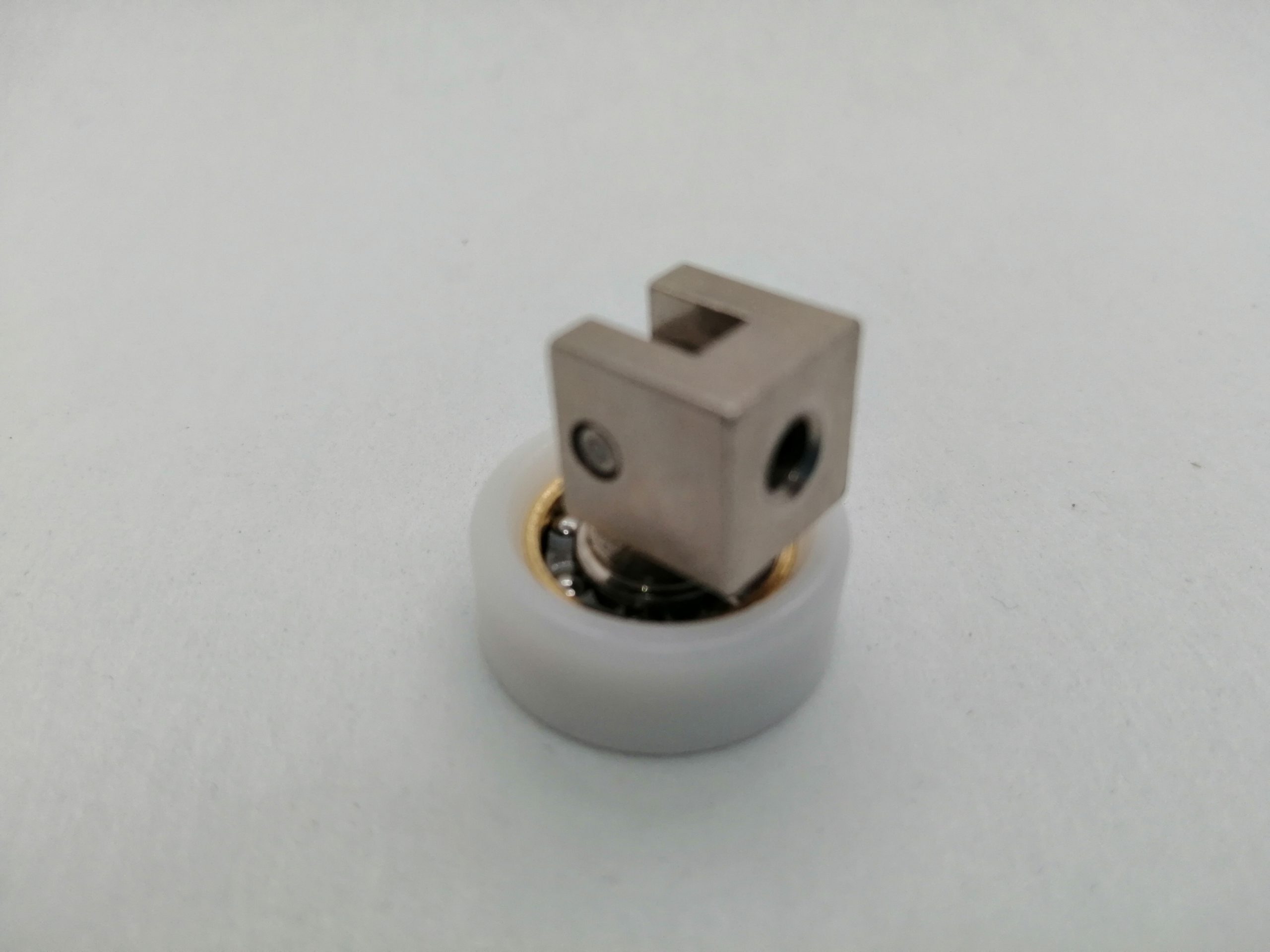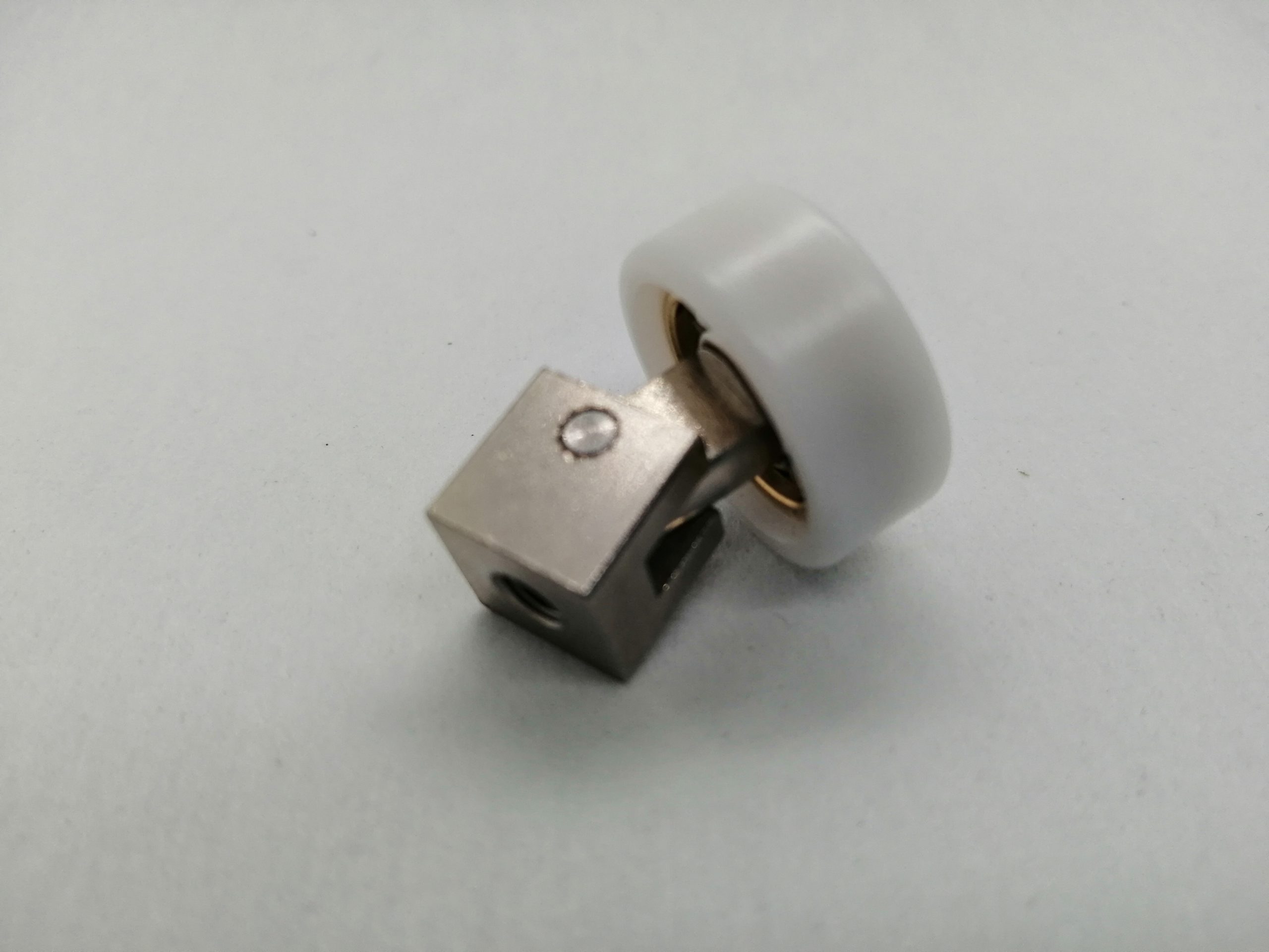 Roulette articulée simple pour porte coulissante de cabine de douche. Vendue à l’unité, cette roulette se compose d’un corps en laiton. Le bandage de la roulette est en téflon, recouvrant un roulement à billes étanche en acier inoxydable. Le choix et la qualité des matériaux employés offrent une utilisation optimale de confort, limitant ainsi le frottement et le bruit lors de la manipulation de la porte.