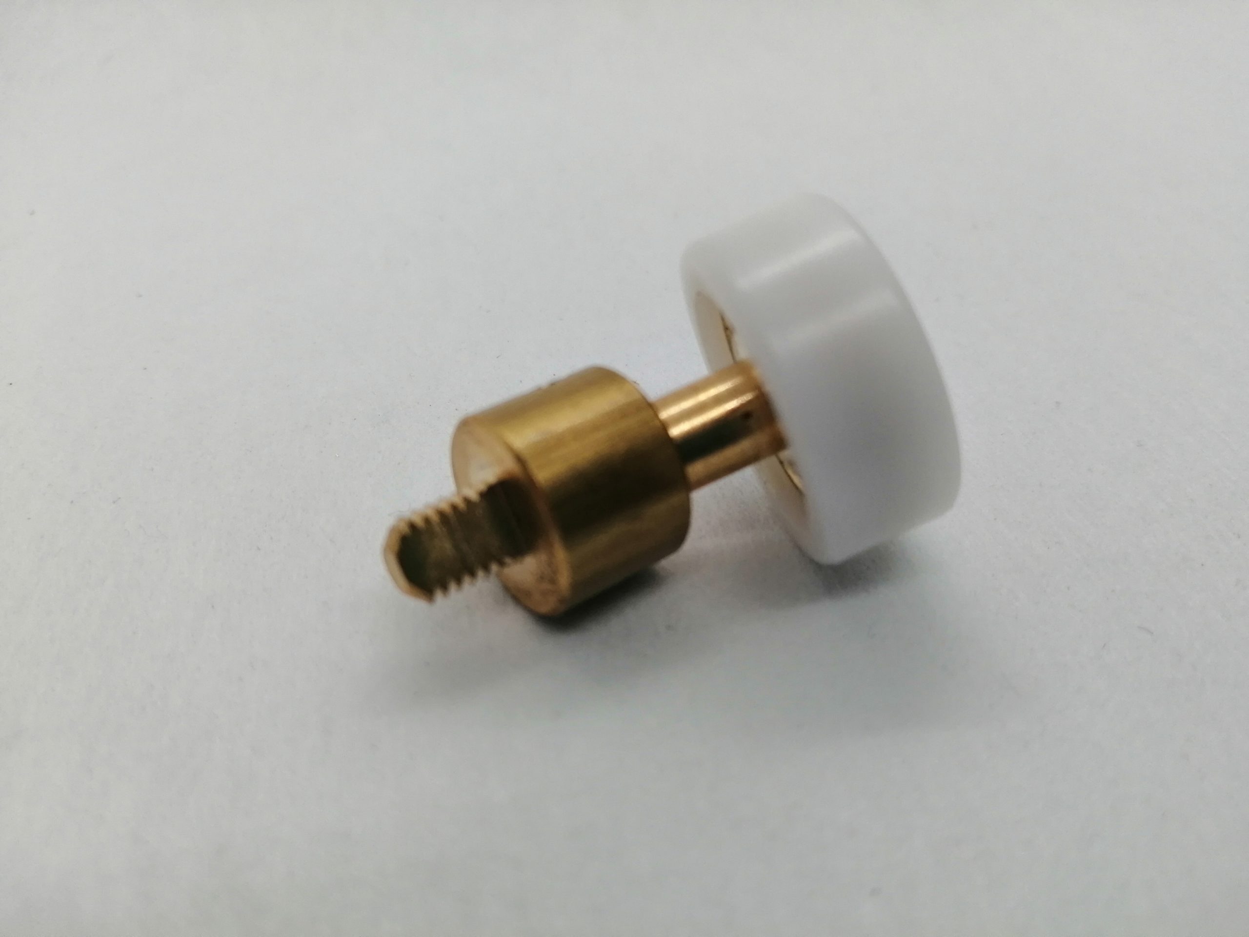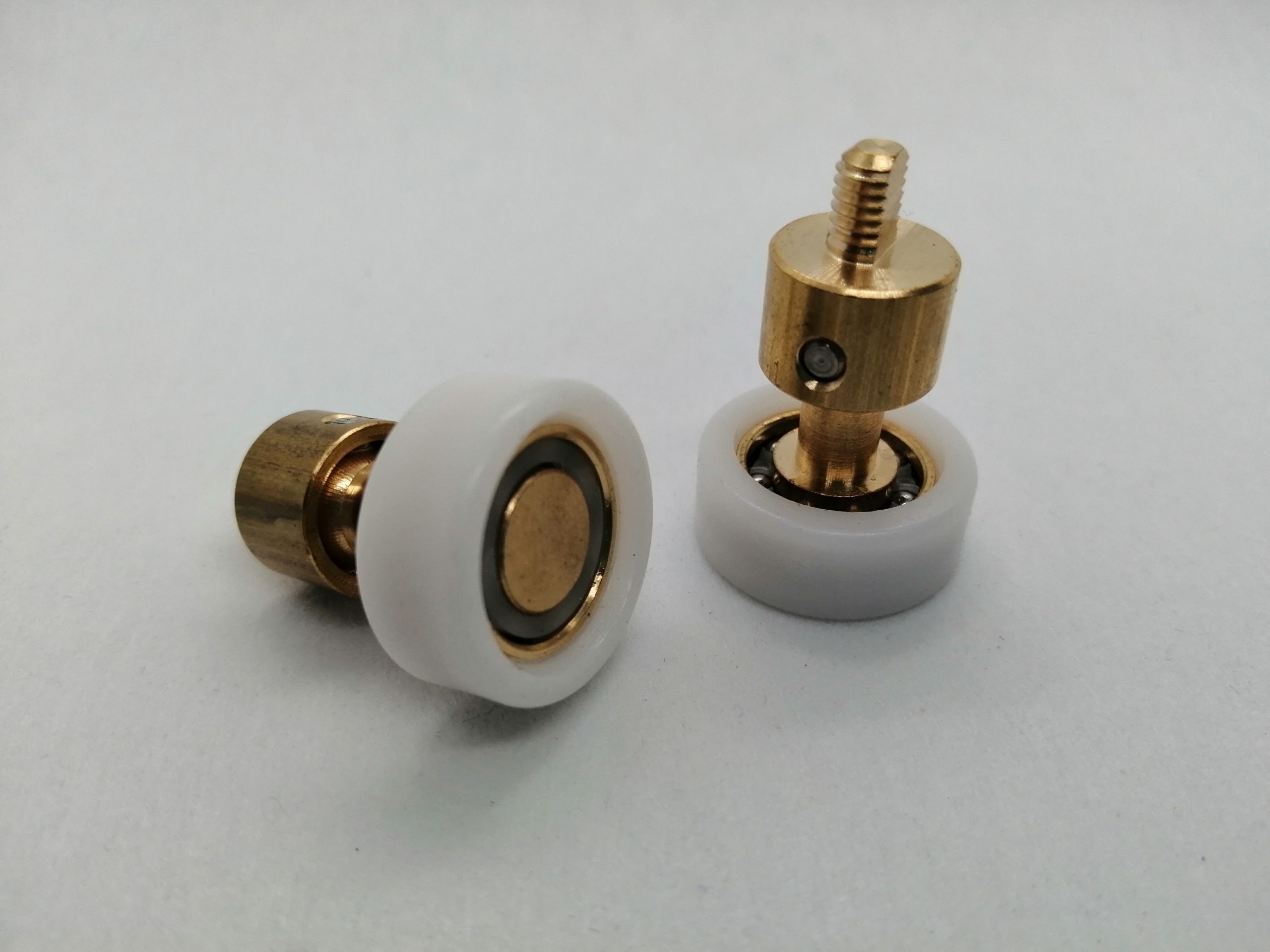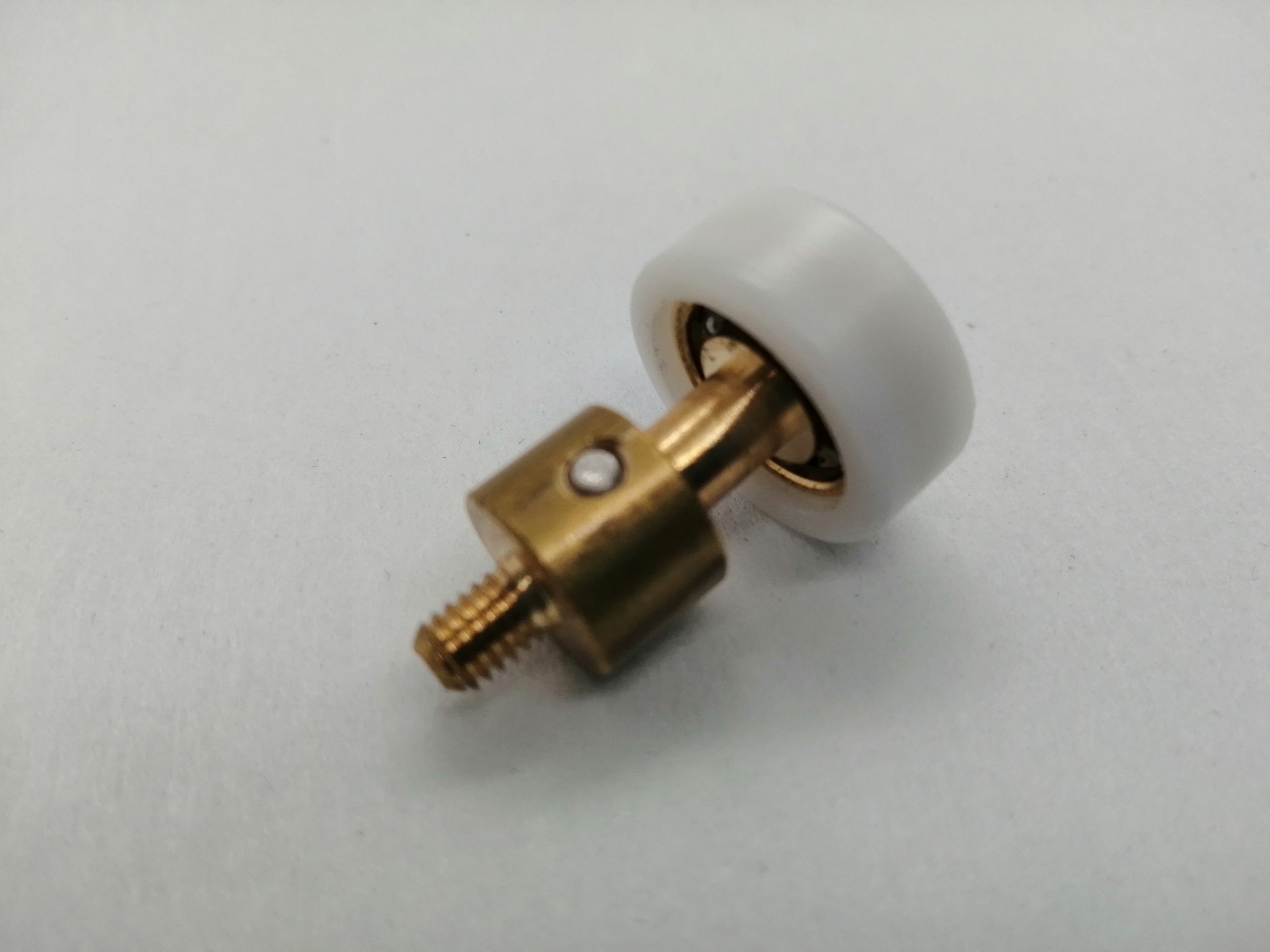 Roulette articulée simple pour porte coulissante de cabine de douche. Vendue à l’unité, cette roulette se compose d’un corps en laiton. Le bandage de la roulette est en téflon, recouvrant un roulement à billes étanche en acier inoxydable. Le choix et la qualité des matériaux employés offrent une utilisation optimale de confort, limitant ainsi le frottement et le bruit lors de la manipulation de la porte.