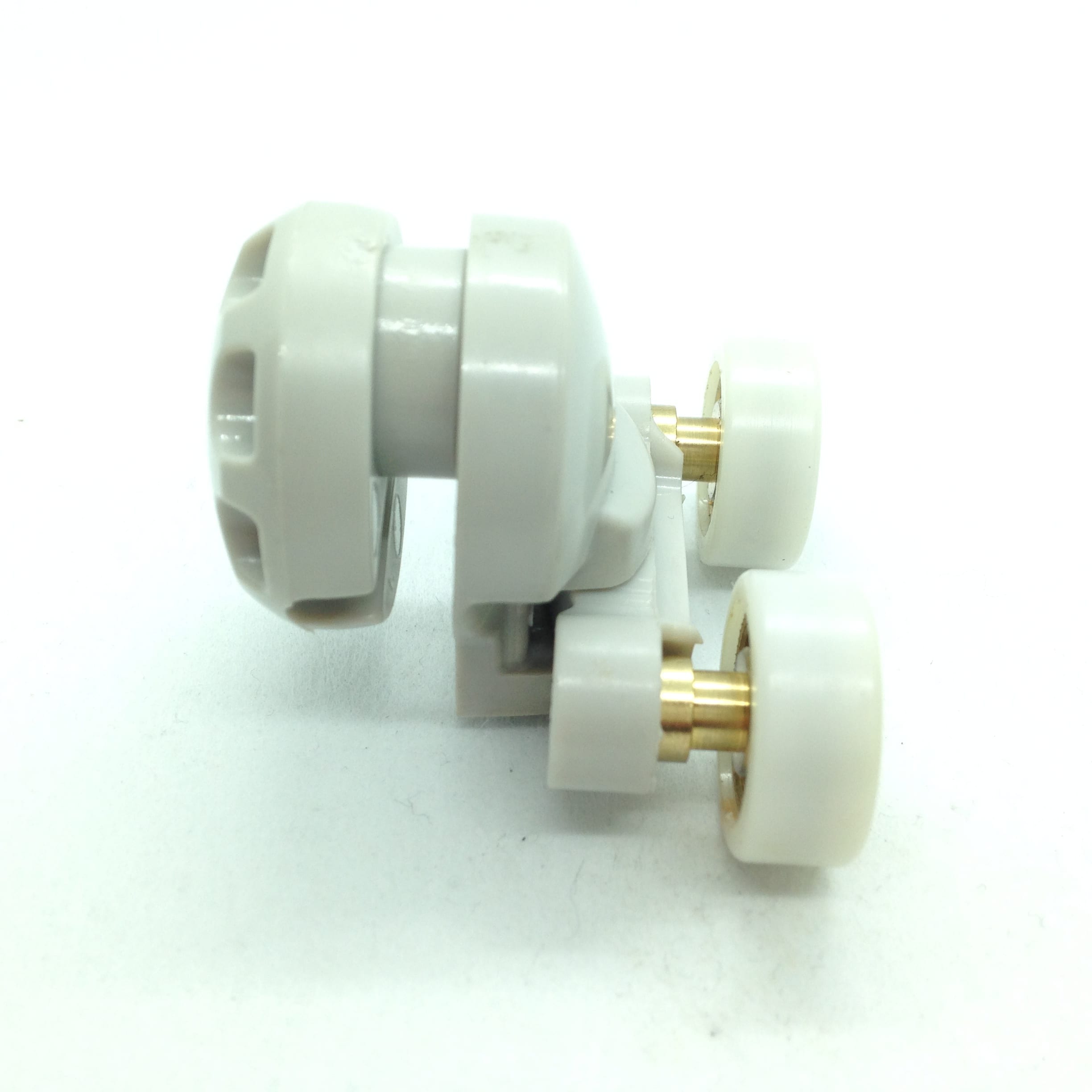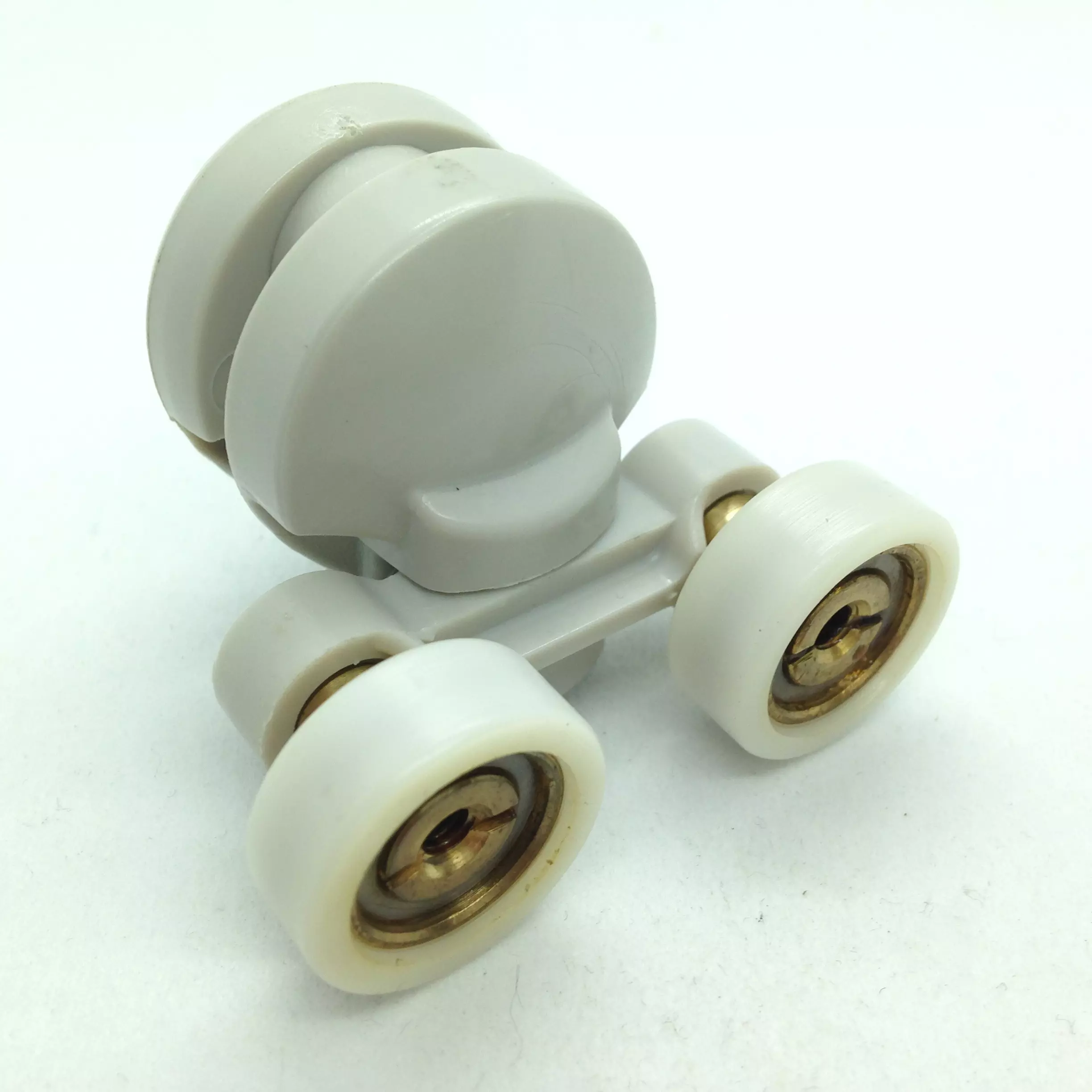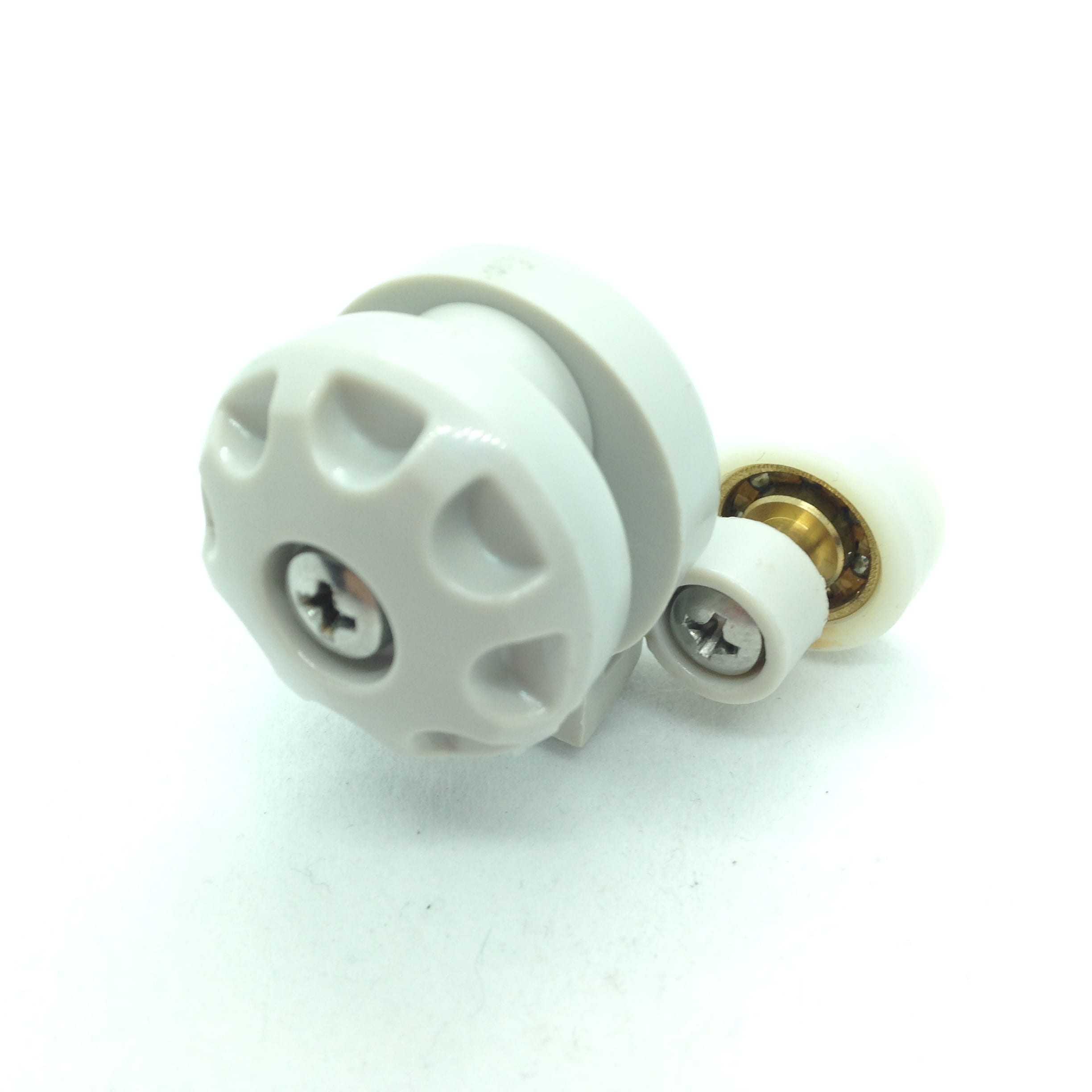 Roulette double haute et basse pour porte coulissante de cabine de douche. Vendue à l’unité, cette roulette se compose d’un corps en laiton et d’éléments de soutien en plastique type ABS. Le bandage de la roulette est en téflon, recouvrant un roulement à billes étanche en acier inoxydable. Le choix et la qualité des matériaux employés offrent une utilisation optimale de confort, limitant ainsi le frottement et le bruit lors de la manipulation de la porte.
