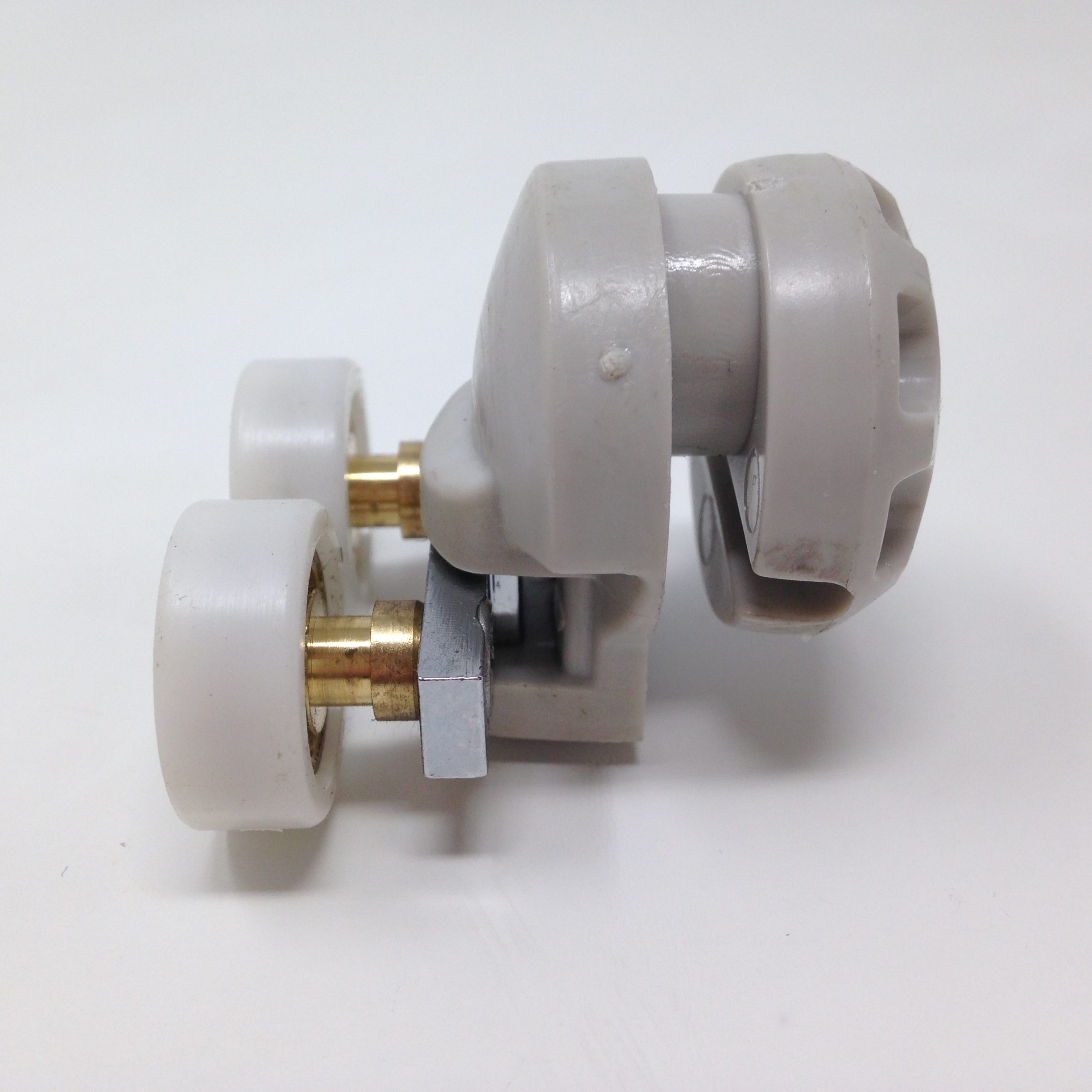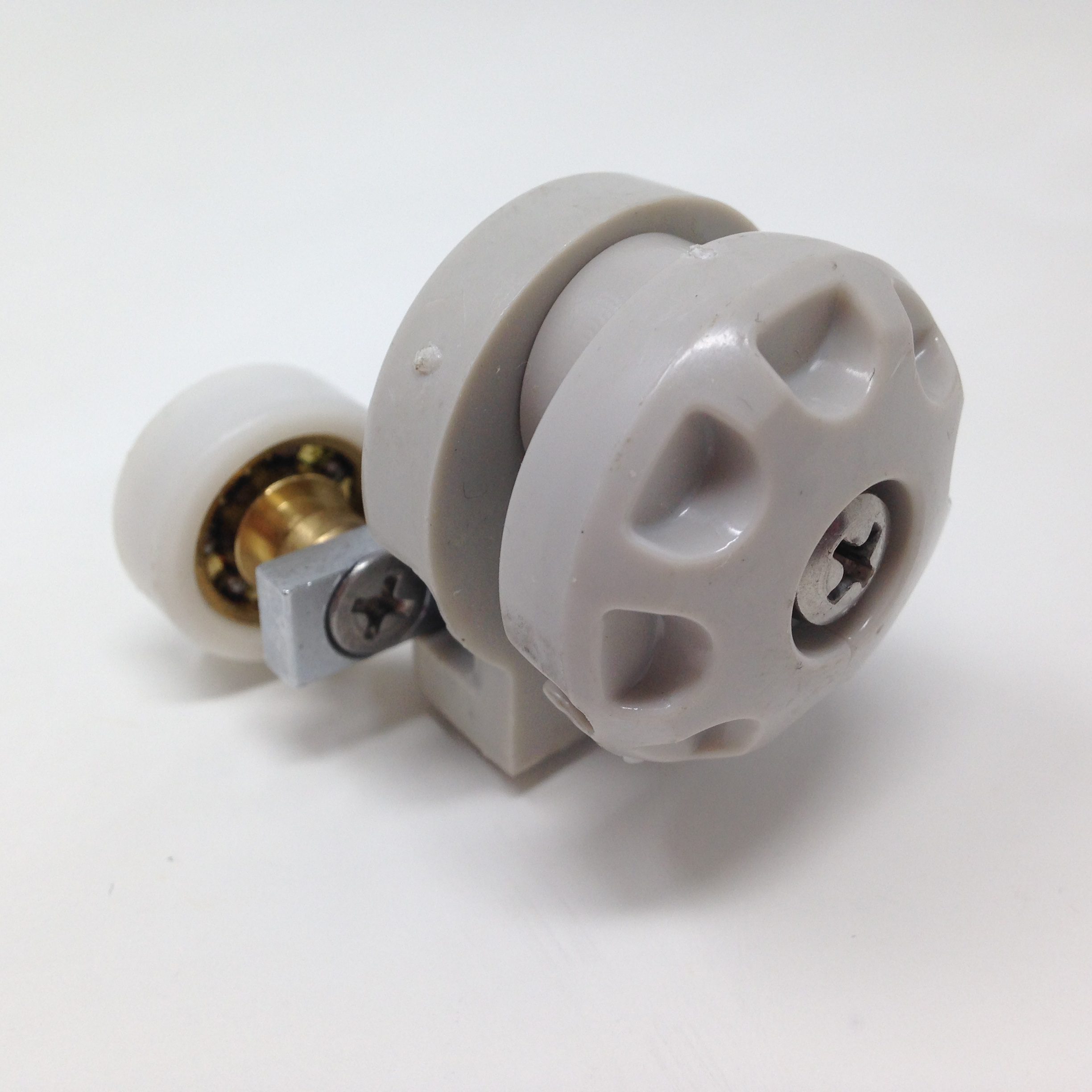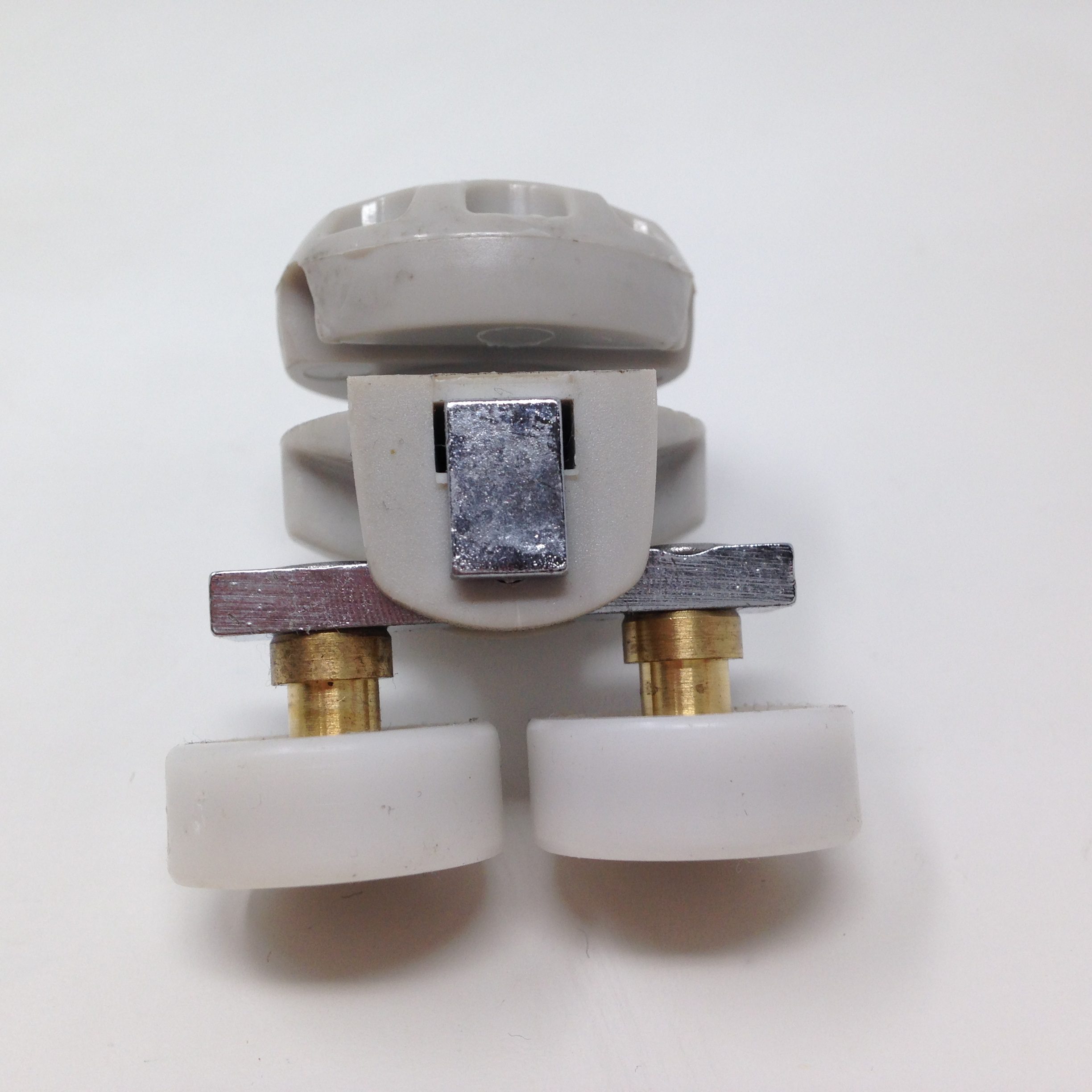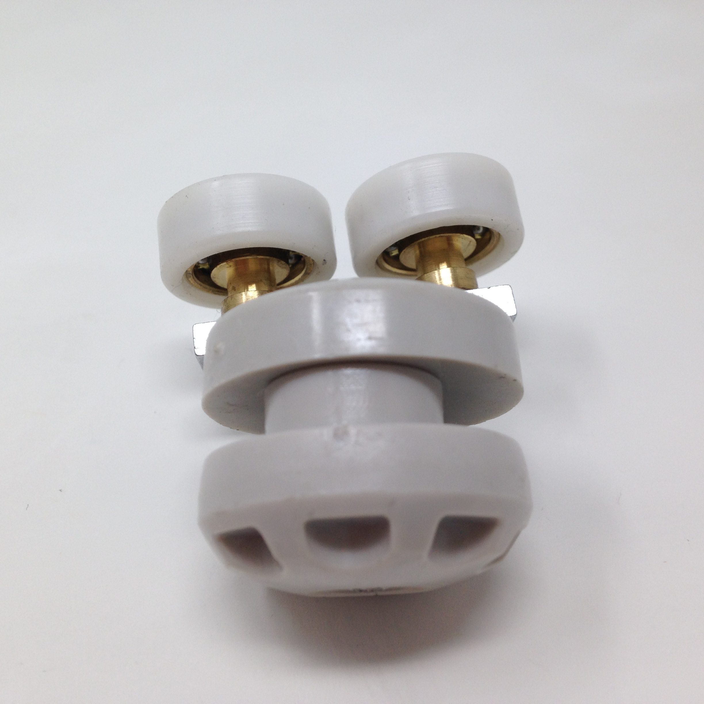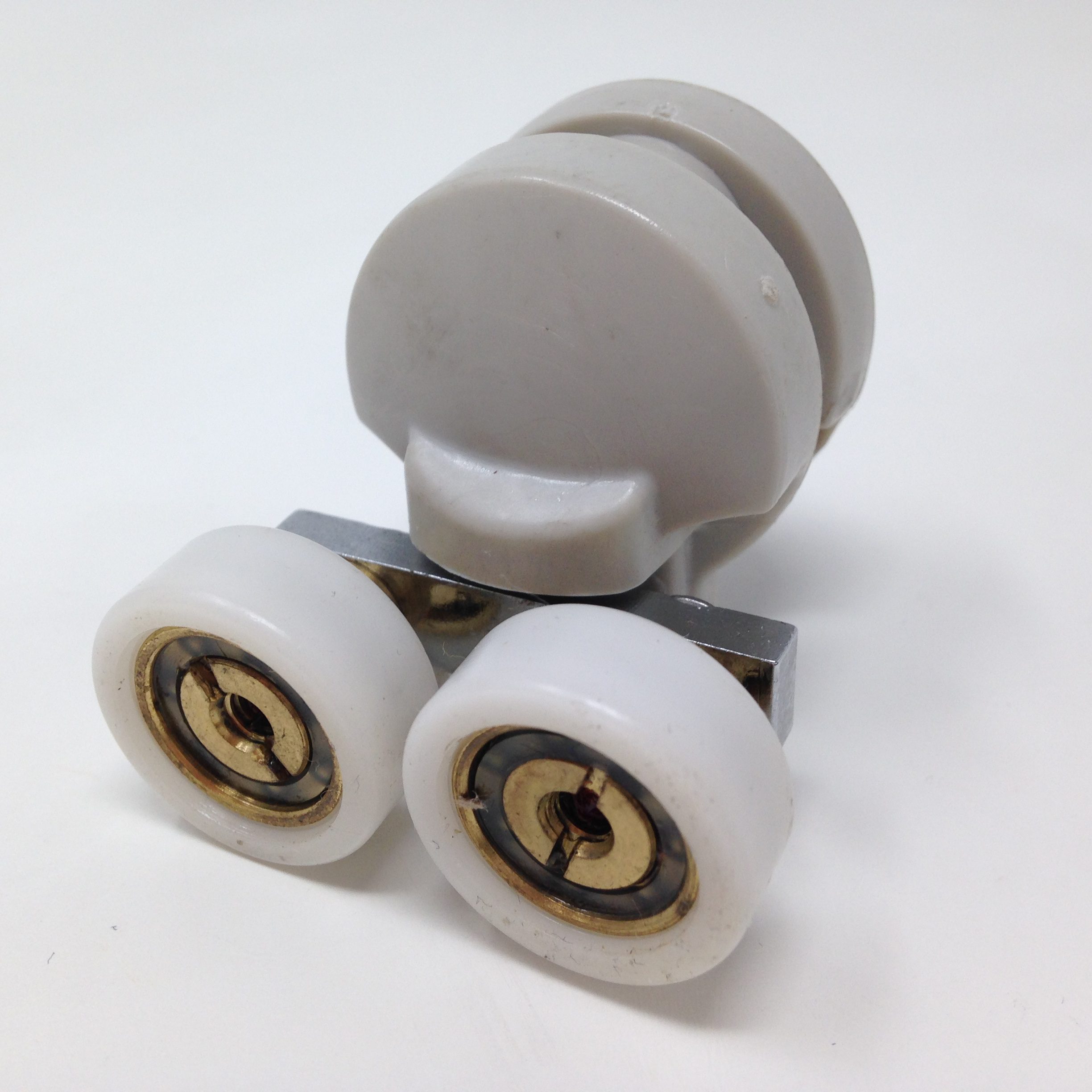 Roulette double haute et basse pour porte coulissante de cabine de douche. Vendue à l’unité, cette roulette se compose d’un corps en laiton et d’éléments de soutien en plastique type ABS. Le bandage de la roulette est en téflon, recouvrant un roulement à billes étanche en acier inoxydable. Le choix et la qualité des matériaux employés offrent une utilisation optimale de confort, limitant ainsi le frottement et le bruit lors de la manipulation de la porte.