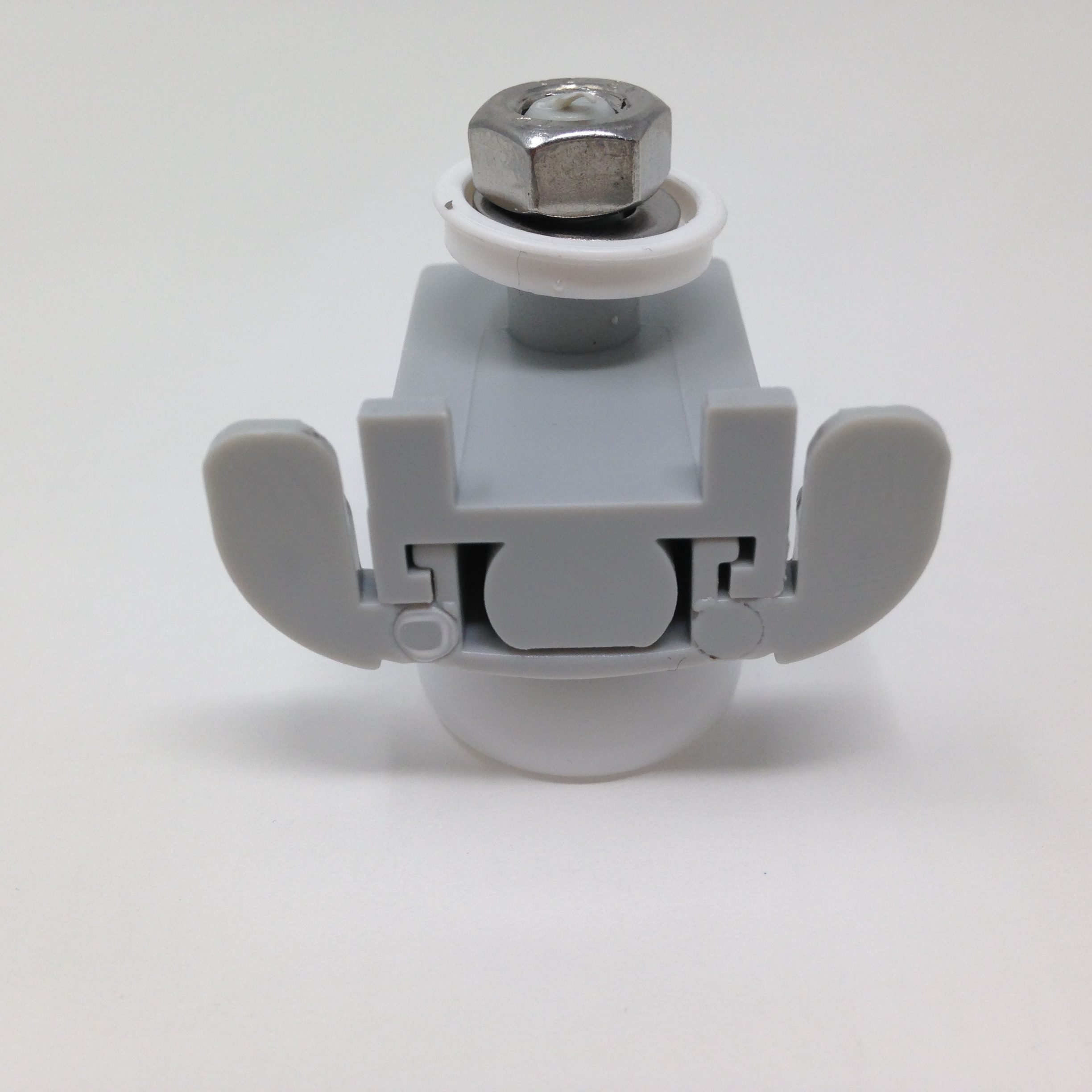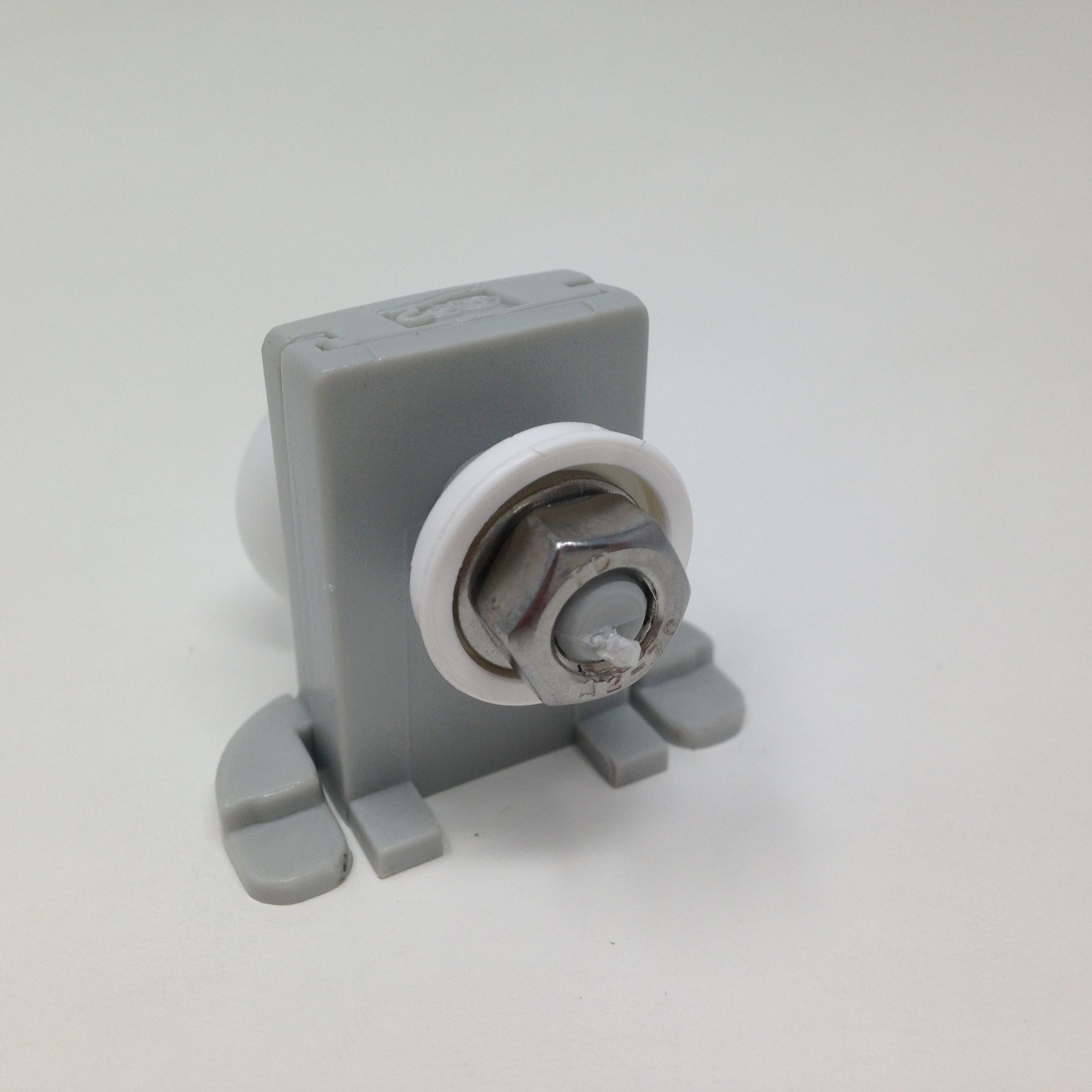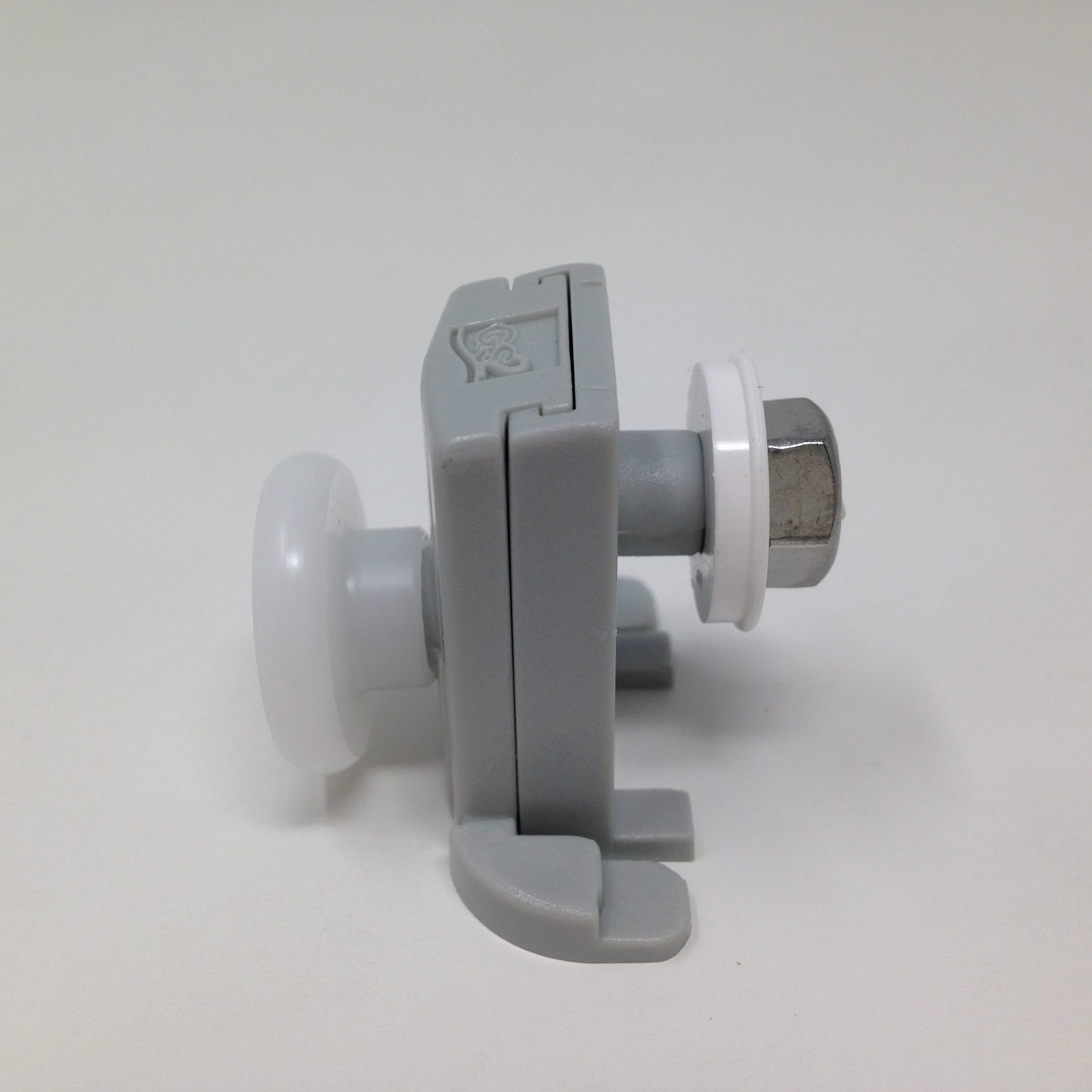 Roulette articulée pour porte coulissante de cabine de douche. Vendue à l’unité, cette roulette se compose d’un corps en laiton et d’éléments de soutien en plastique type ABS. Le bandage de la roulette est en téflon, recouvrant un roulement à billes étanche en acier inoxydable. Le choix et la qualité des matériaux employés offrent une utilisation optimale de confort, limitant ainsi le frottement et le bruit lors de la manipulation de la porte.