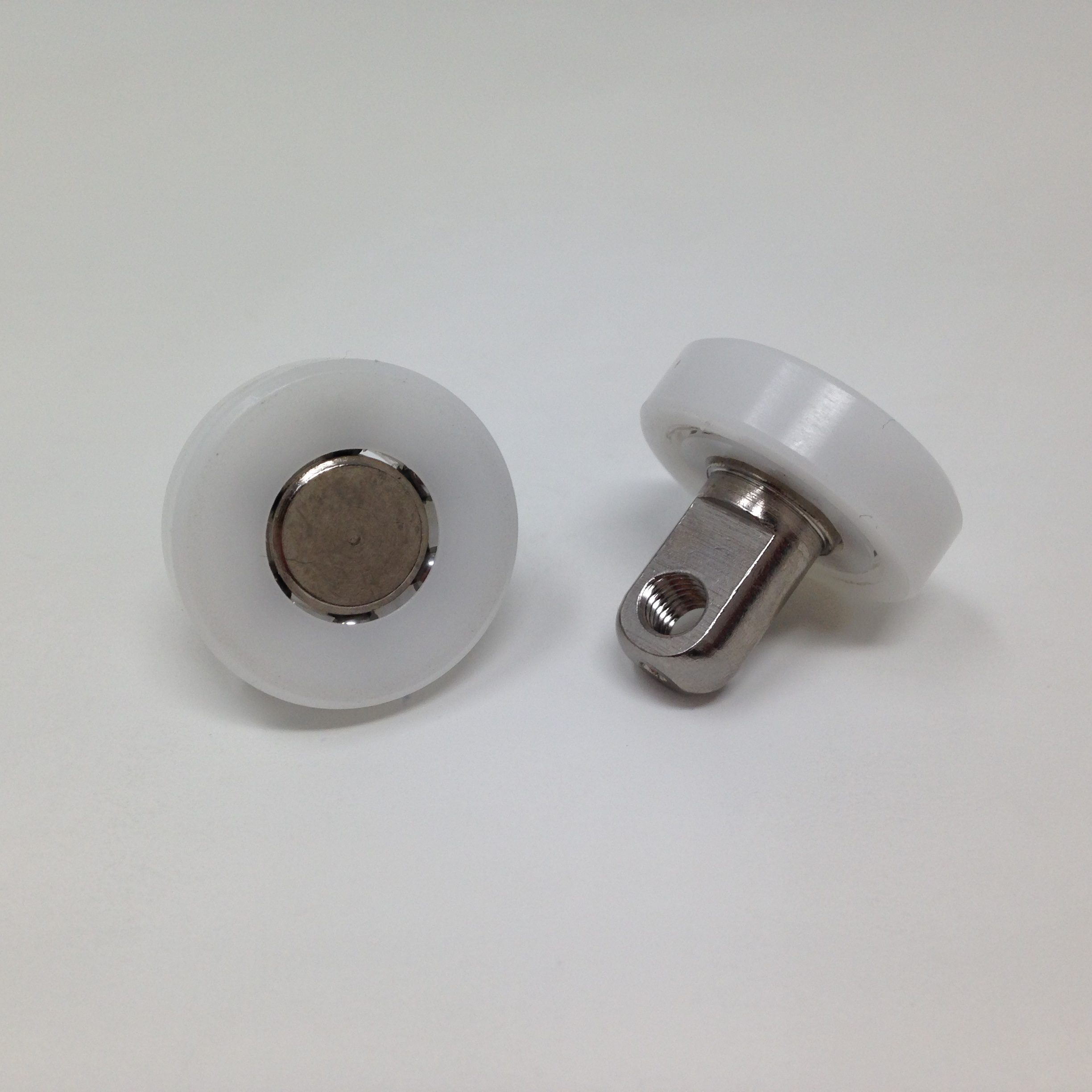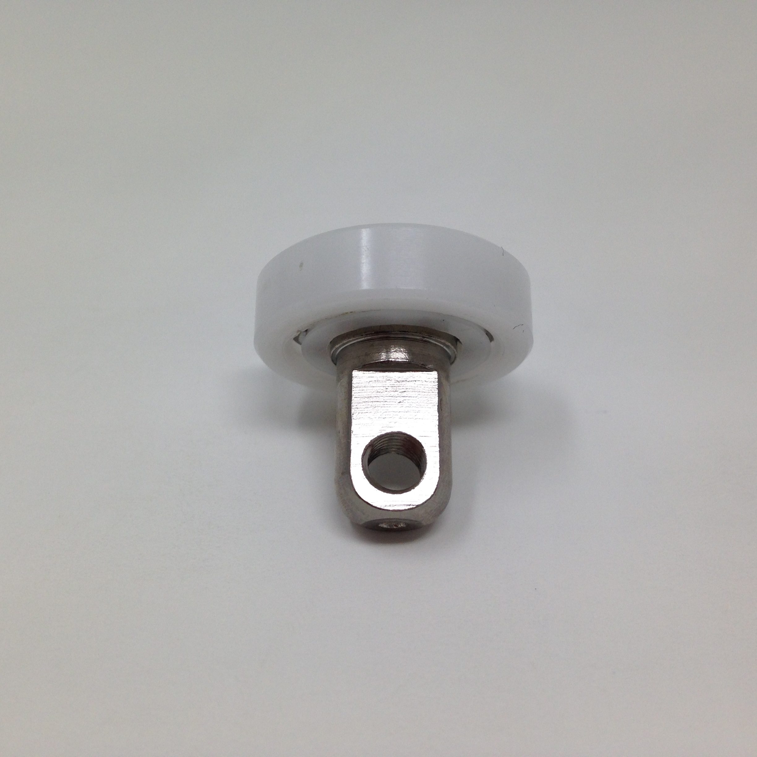 Roulette droite simple pour porte coulissante de cabine de douche. Vendue à l’unité, cette roulette se compose d’un corps en laiton. Le bandage plat de la roulette est en téflon, recouvrant un roulement à billes étanche en acier inoxydable. Le choix et la qualité des matériaux employés offrent une utilisation optimale de confort, limitant ainsi le frottement et le bruit lors de la manipulation de la porte.