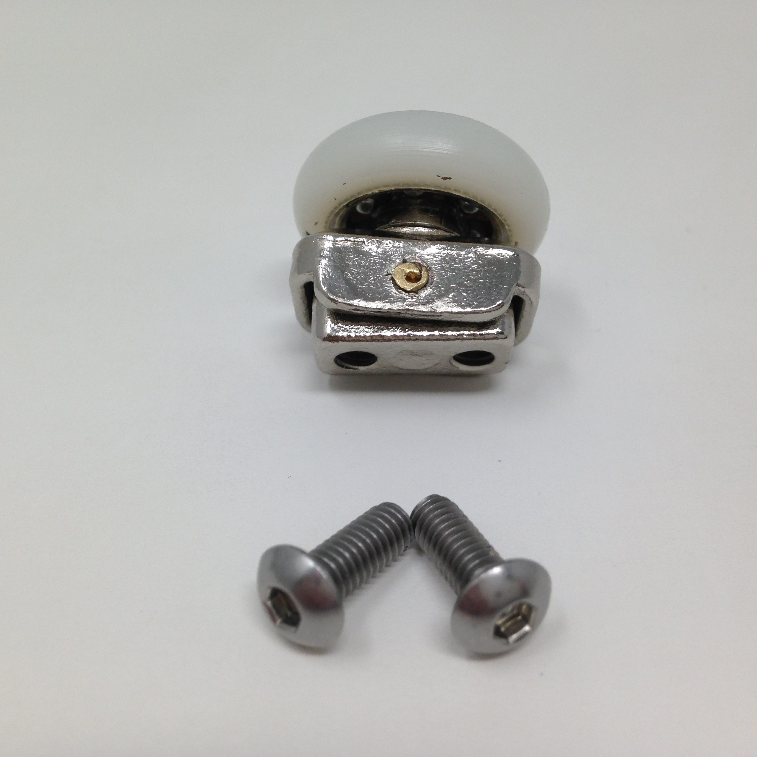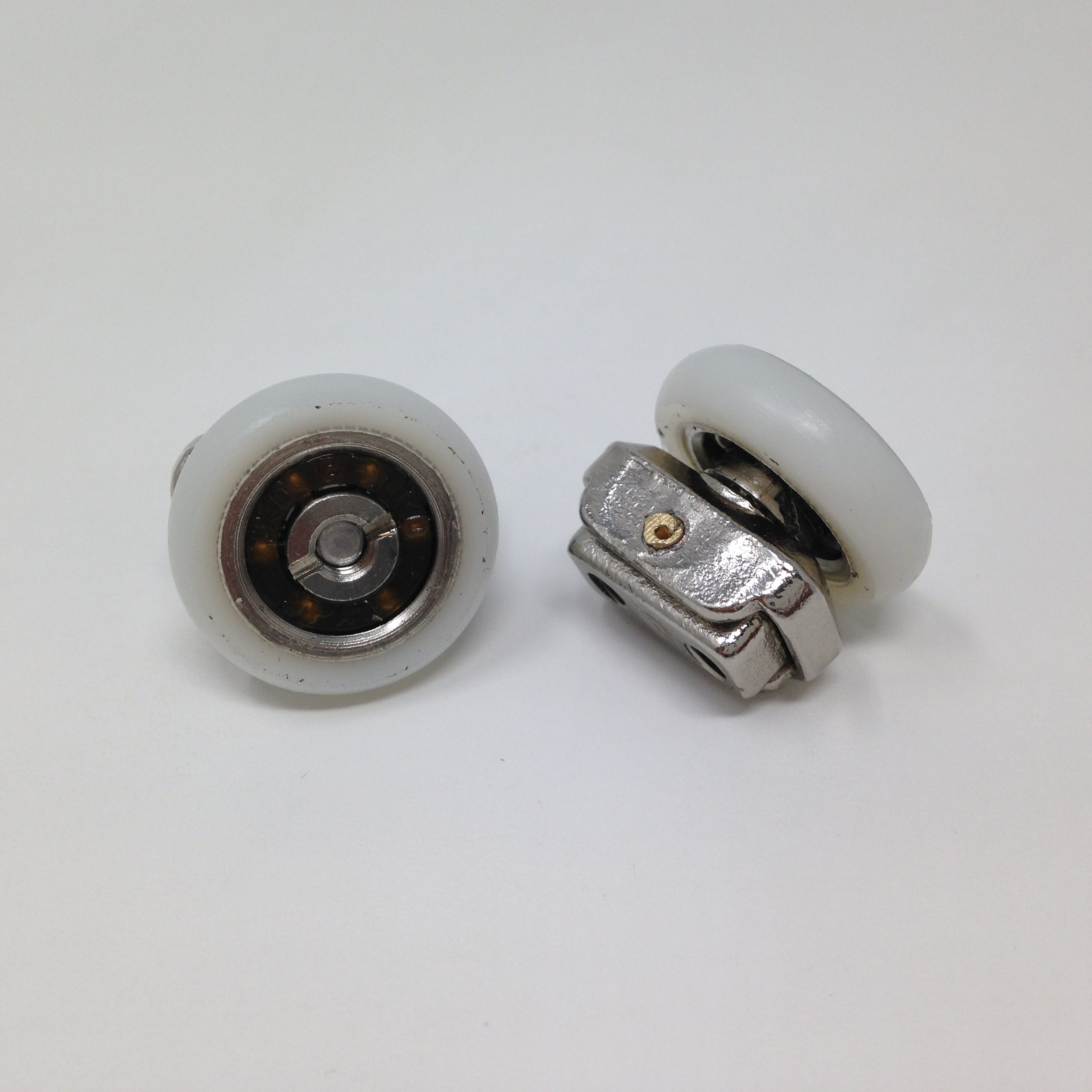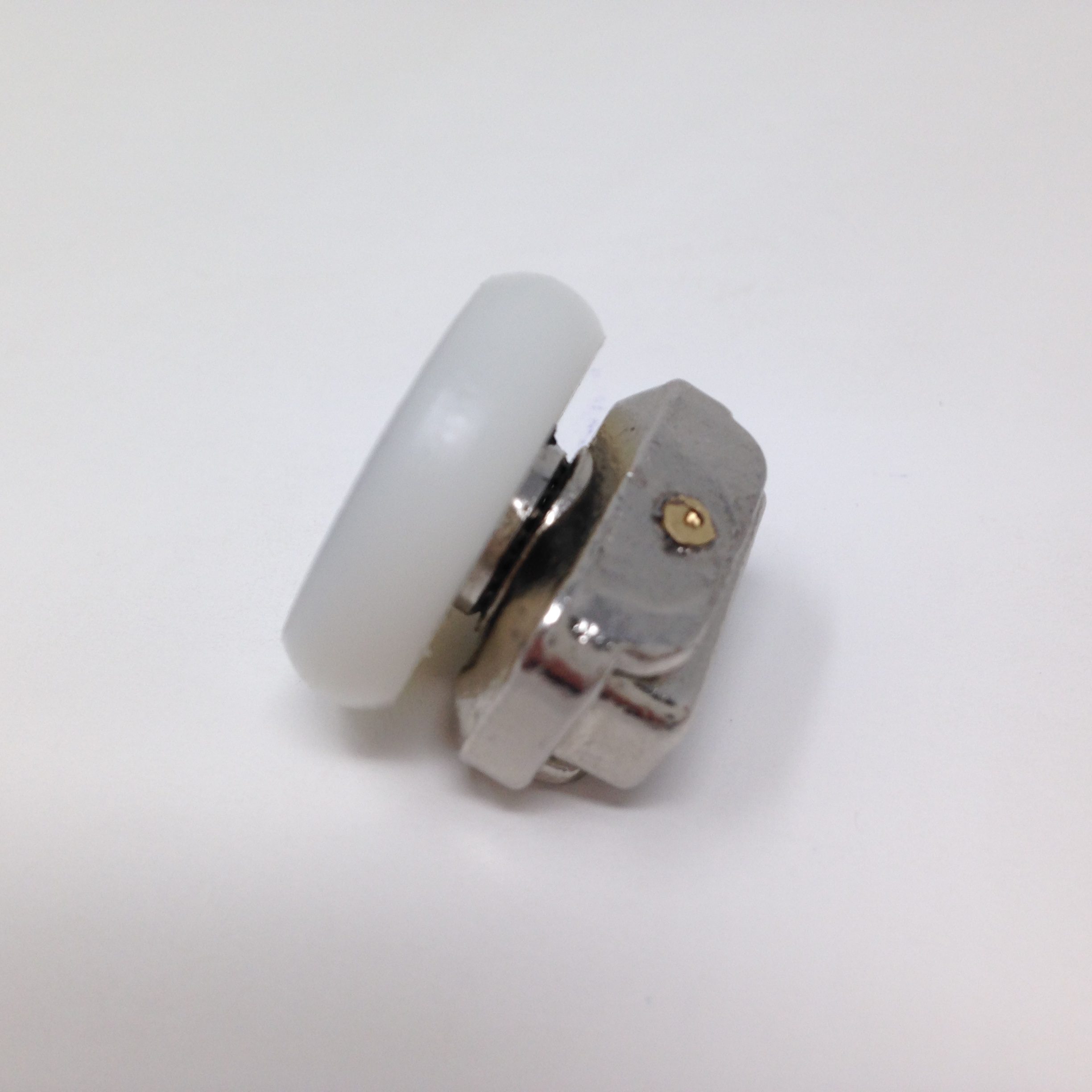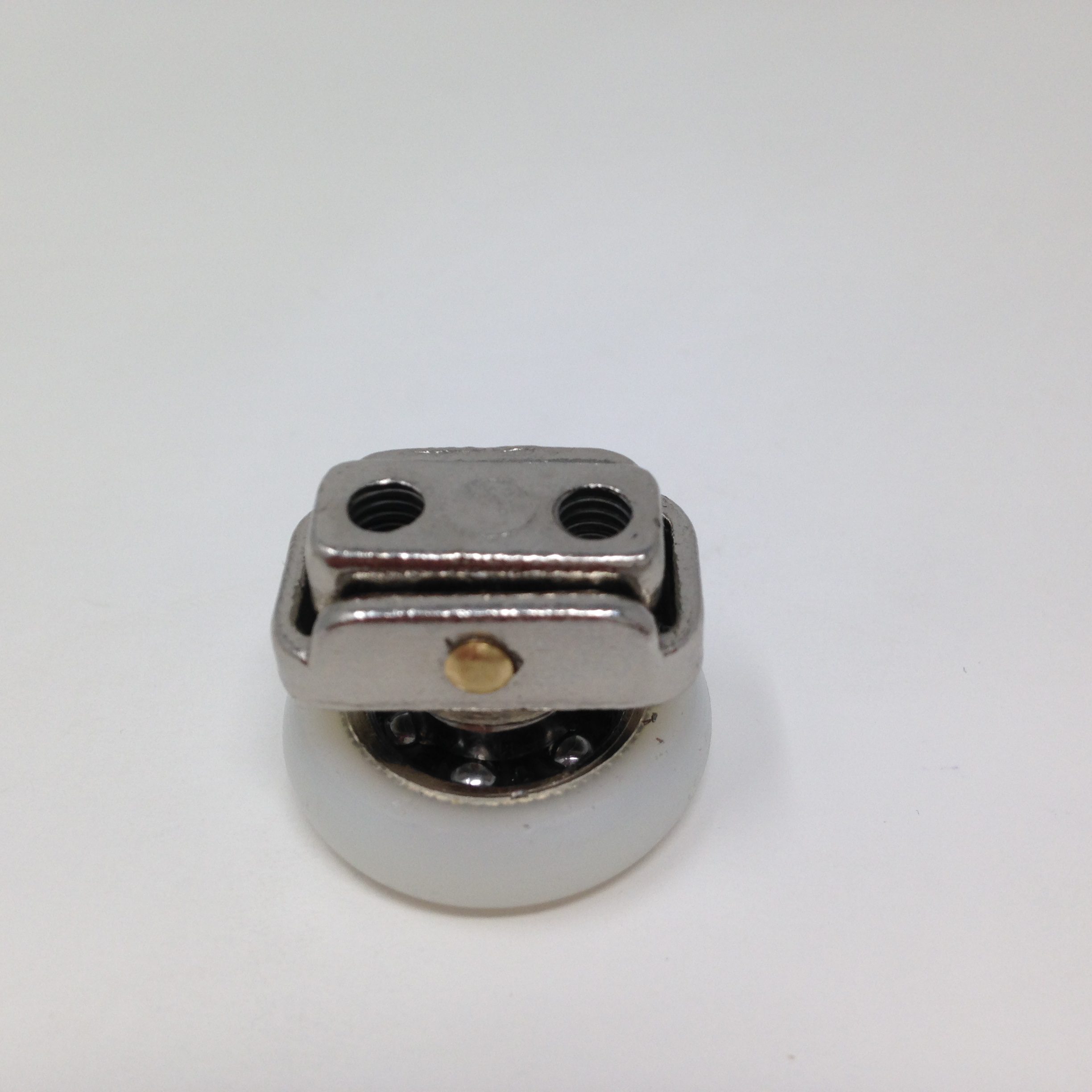 Roulette articulée pour porte coulissante de cabine de douche. Vendue à l’unité, cette roulette se compose d’un corps en laiton et d’éléments de soutien en plastique type ABS. Le bandage de la roulette est en téflon, recouvrant un roulement à billes étanche en acier inoxydable. Le choix et la qualité des matériaux employés offrent une utilisation optimale de confort, limitant ainsi le frottement et le bruit lors de la manipulation de la porte.