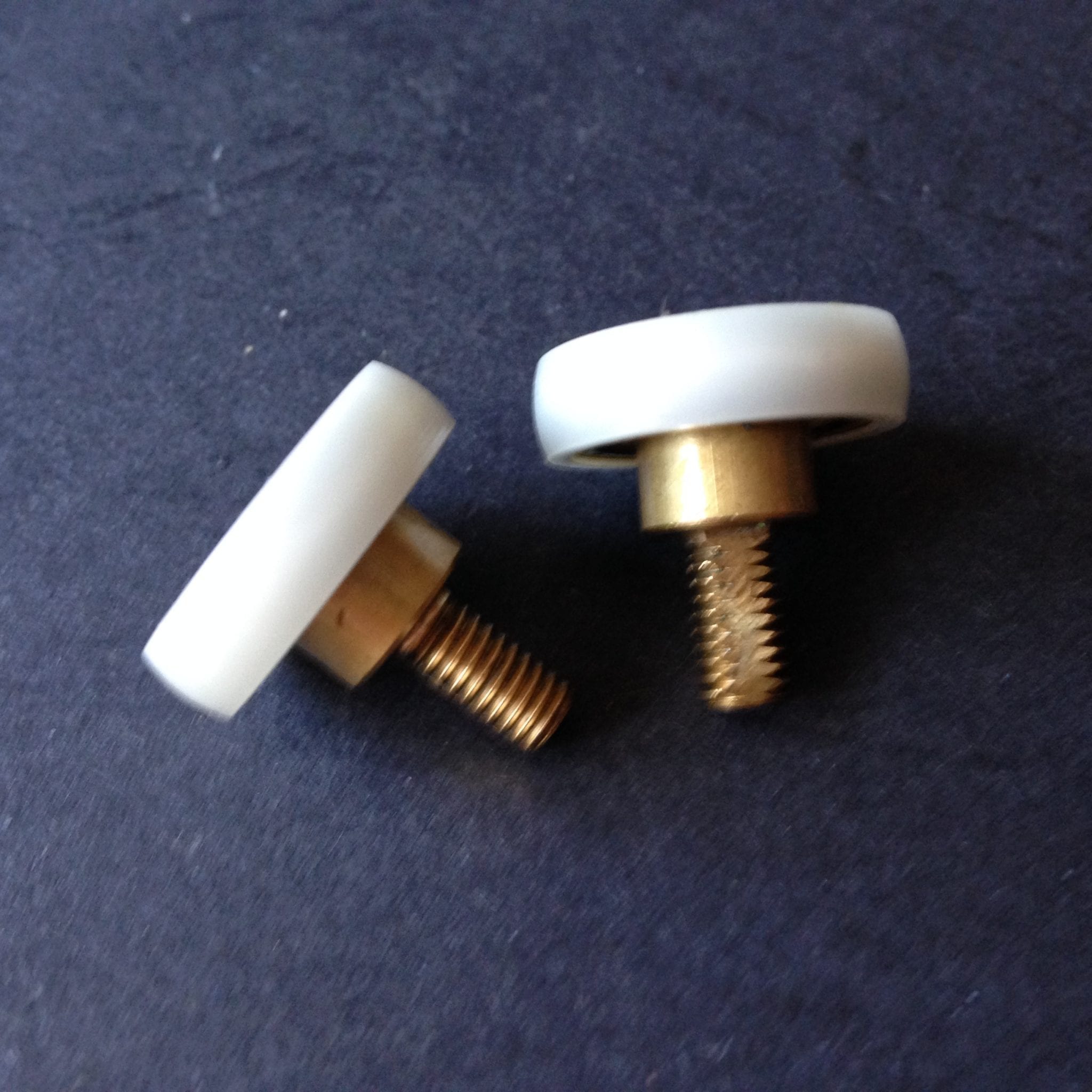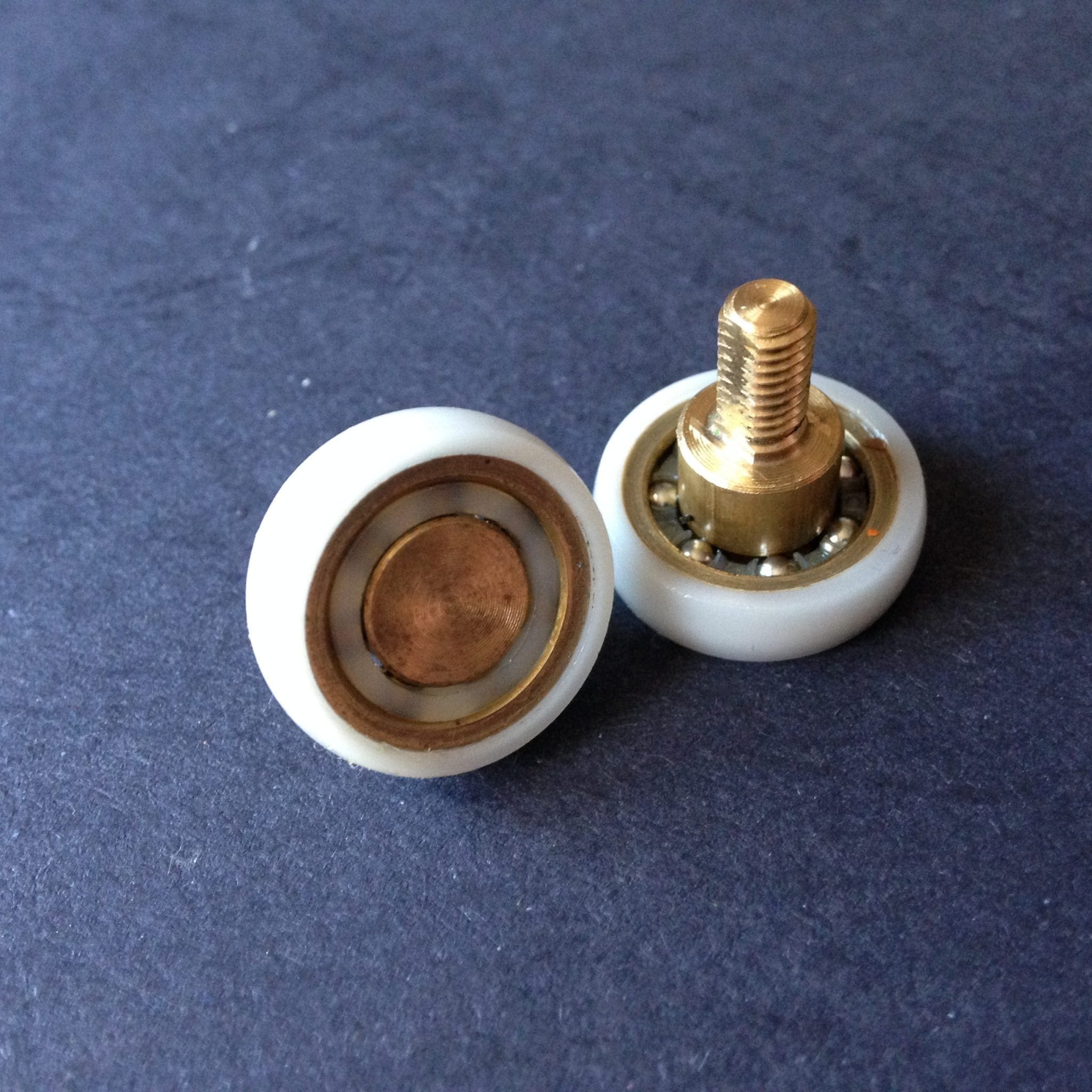 Roulette droite simple pour porte coulissante de cabine de douche. Vendue à l’unité, cette roulette se compose d’un corps en laiton. Le bandage plat de la roulette est en téflon, recouvrant un roulement à billes étanche en acier inoxydable. Le choix et la qualité des matériaux employés offrent une utilisation optimale de confort, limitant ainsi le frottement et le bruit lors de la manipulation de la porte.
