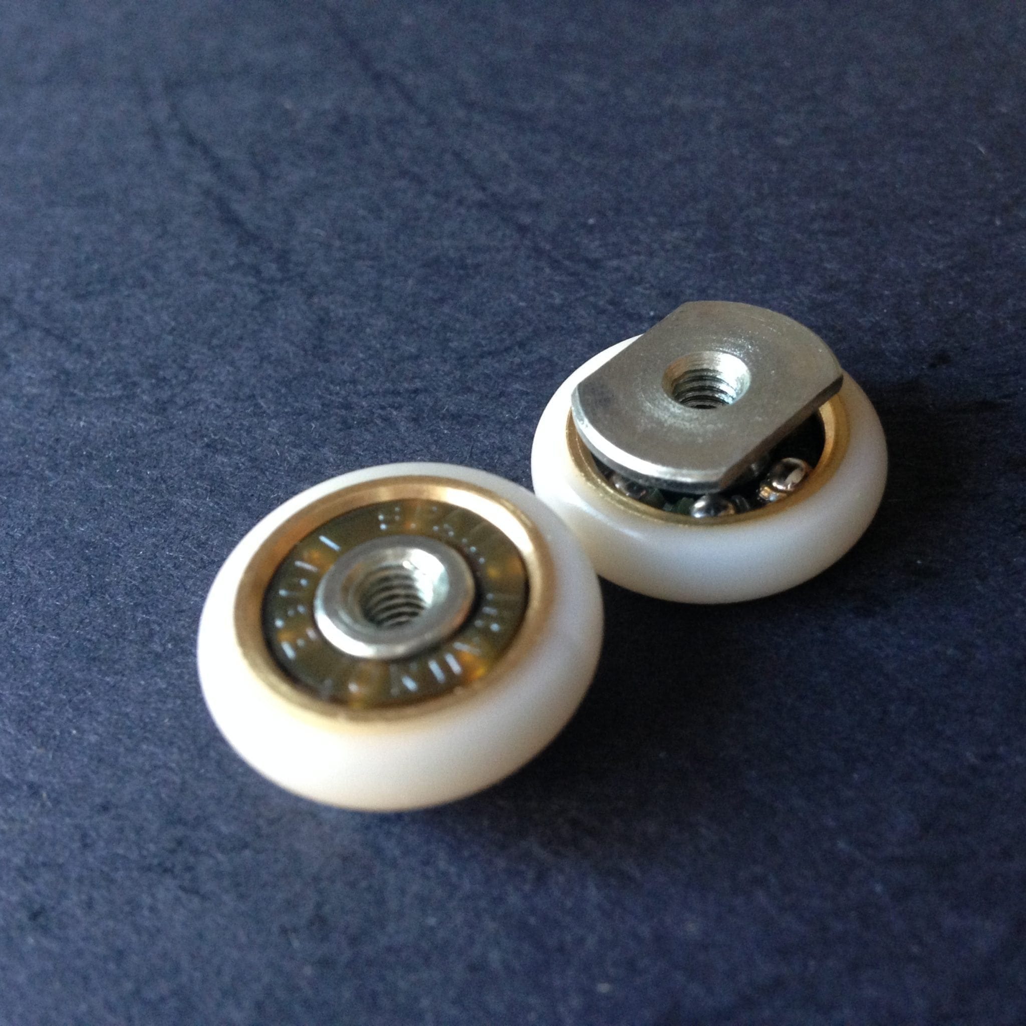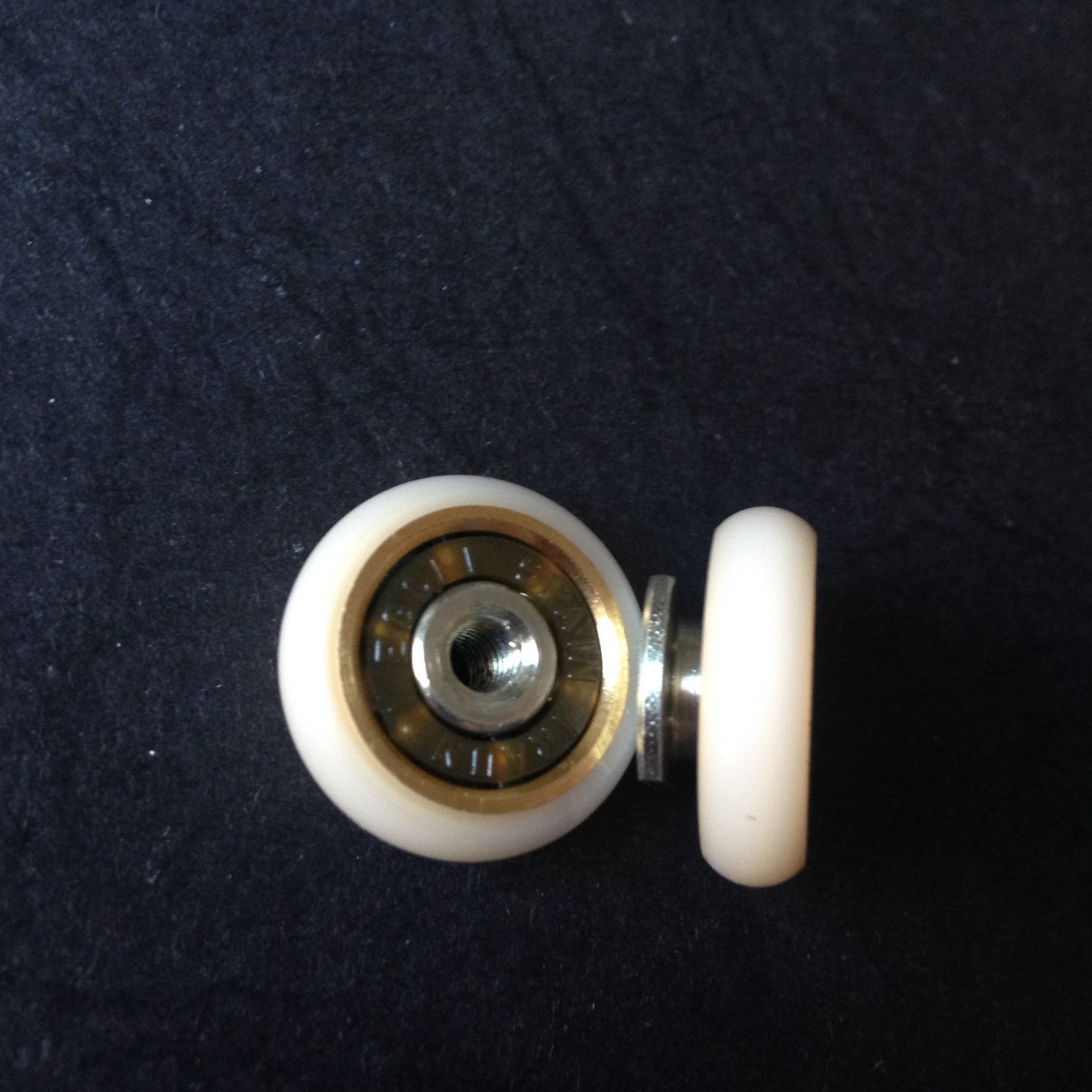 Roulette droite simple pour porte coulissante de cabine de douche. Vendue à l’unité, cette roulette se compose d’un corps en laiton. Le bandage plat de la roulette est en téflon, recouvrant un roulement à billes étanche en acier inoxydable. Le choix et la qualité des matériaux employés offrent une utilisation optimale de confort, limitant ainsi le frottement et le bruit lors de la manipulation de la porte.