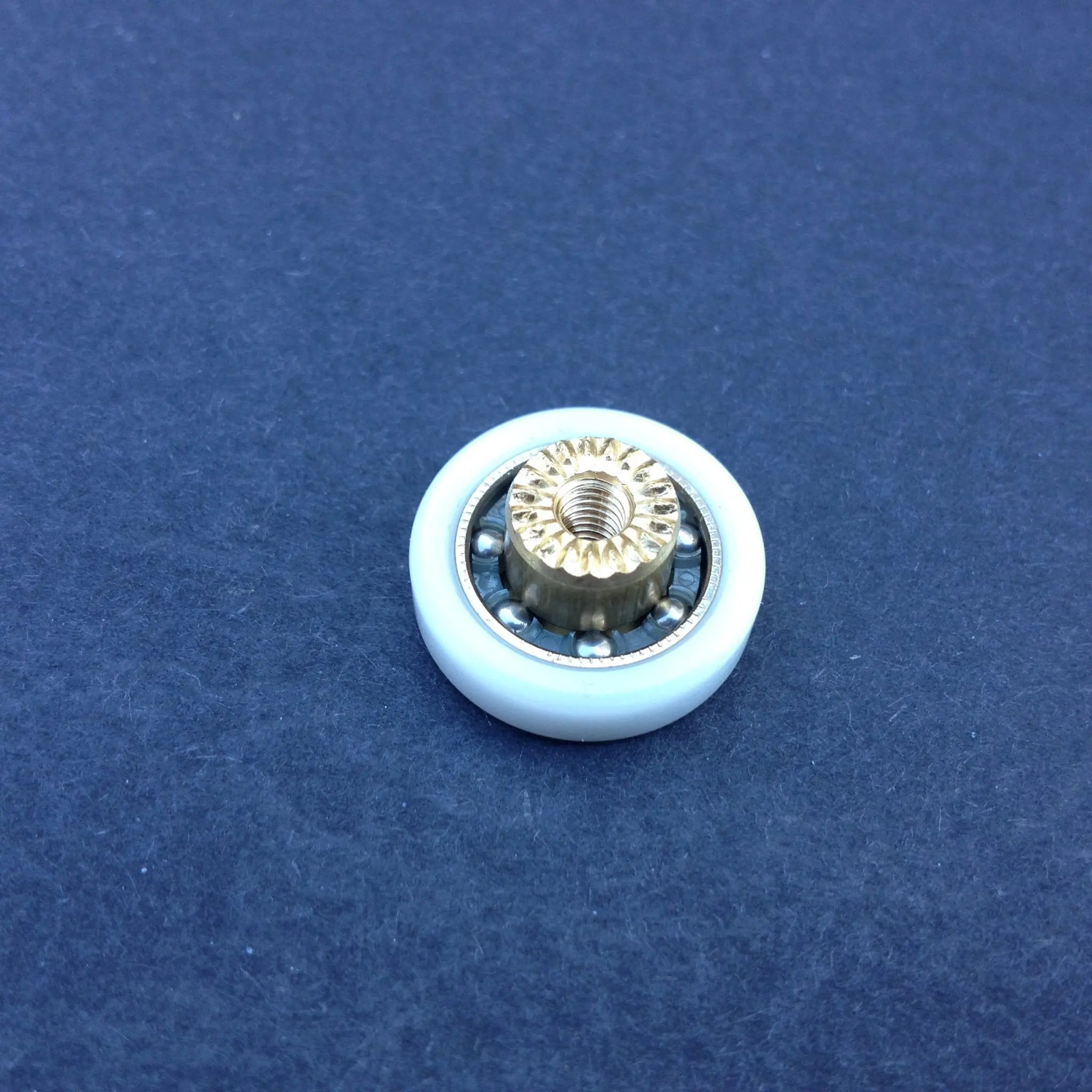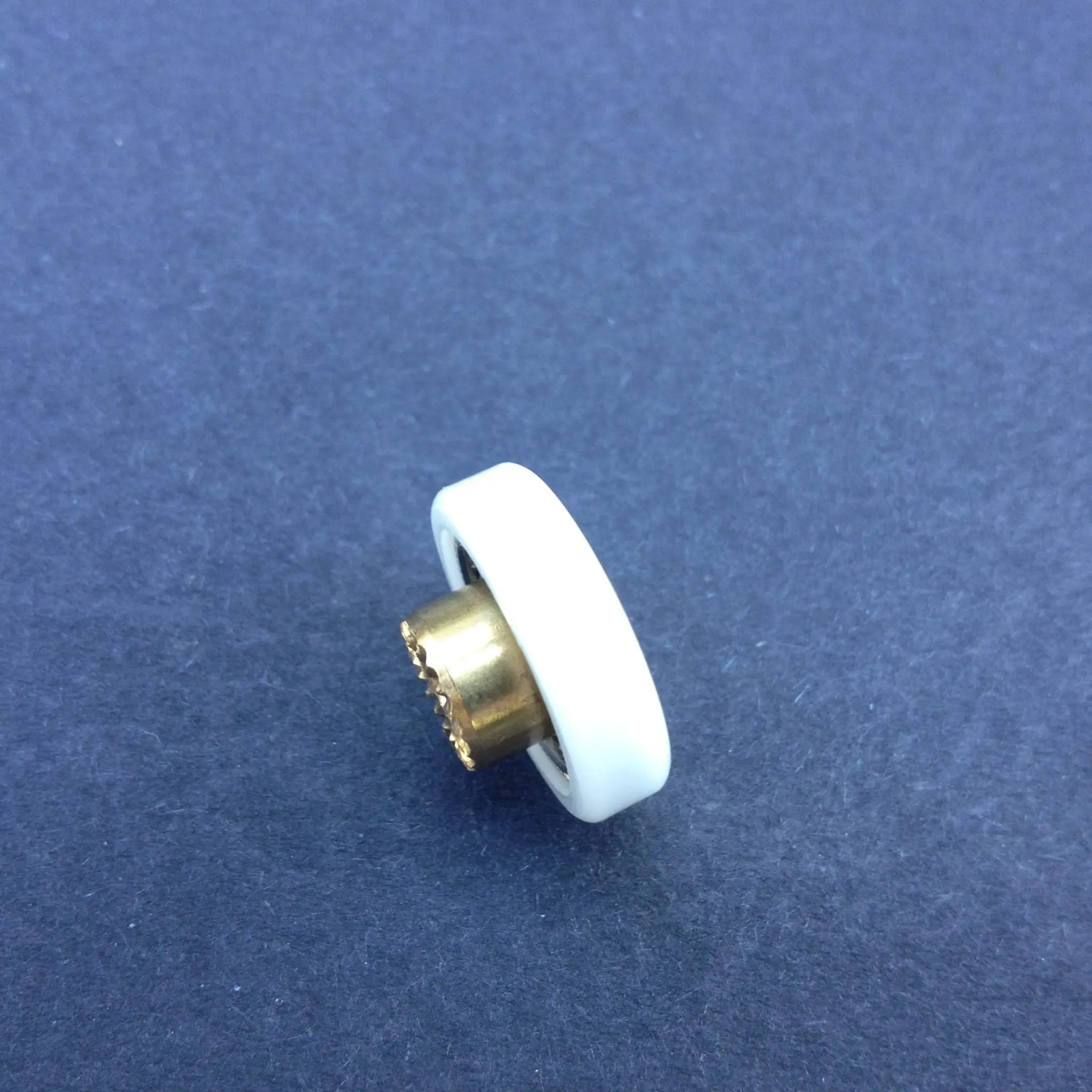Roulette droite simple pour porte coulissante de cabine de douche. Vendue à l’unité, cette roulette se compose d’un corps en laiton. Le bandage plat de la roulette est en téflon, recouvrant un roulement à billes étanche en acier inoxydable. Le choix et la qualité des matériaux employés offrent une utilisation optimale de confort, limitant ainsi le frottement et le bruit lors de la manipulation de la porte.