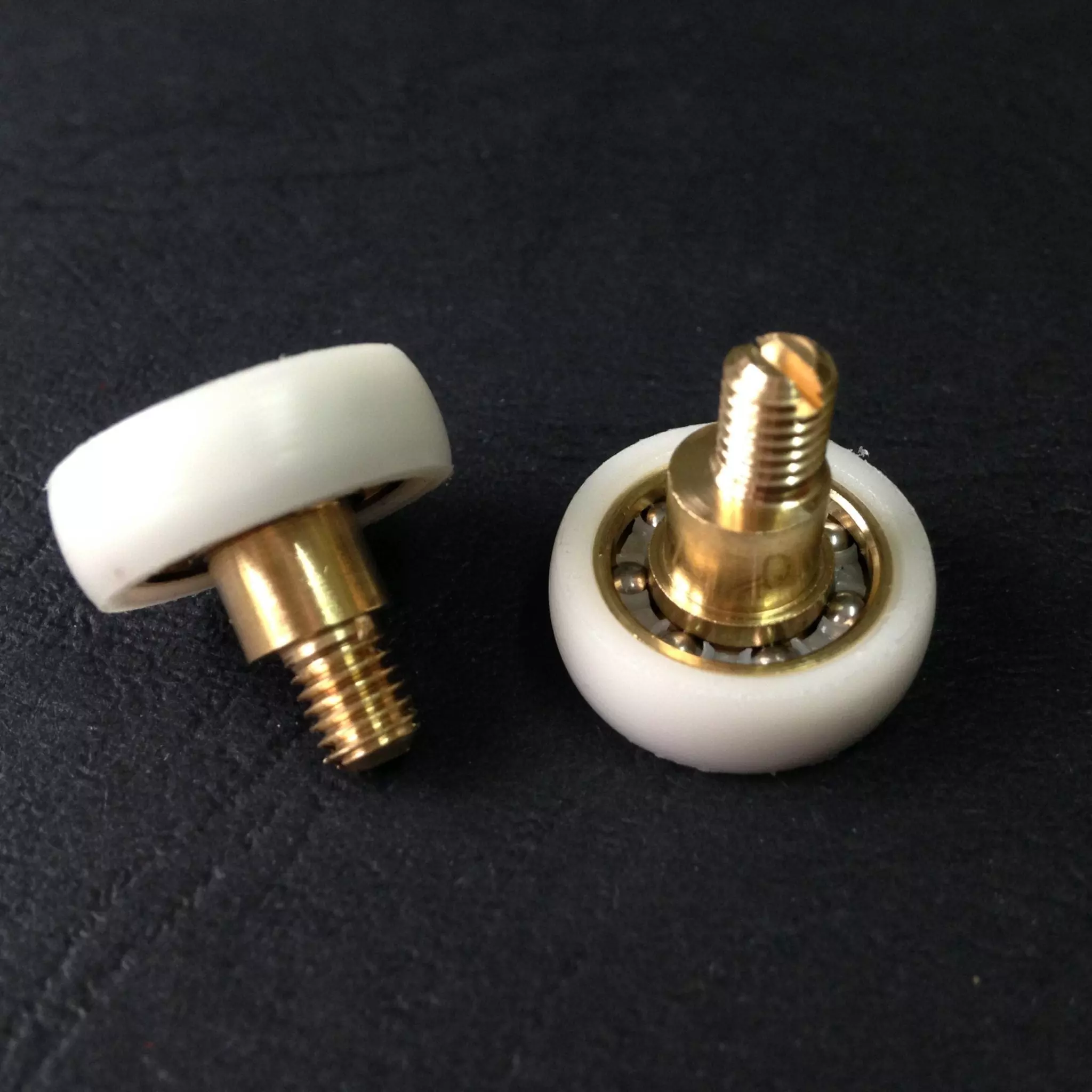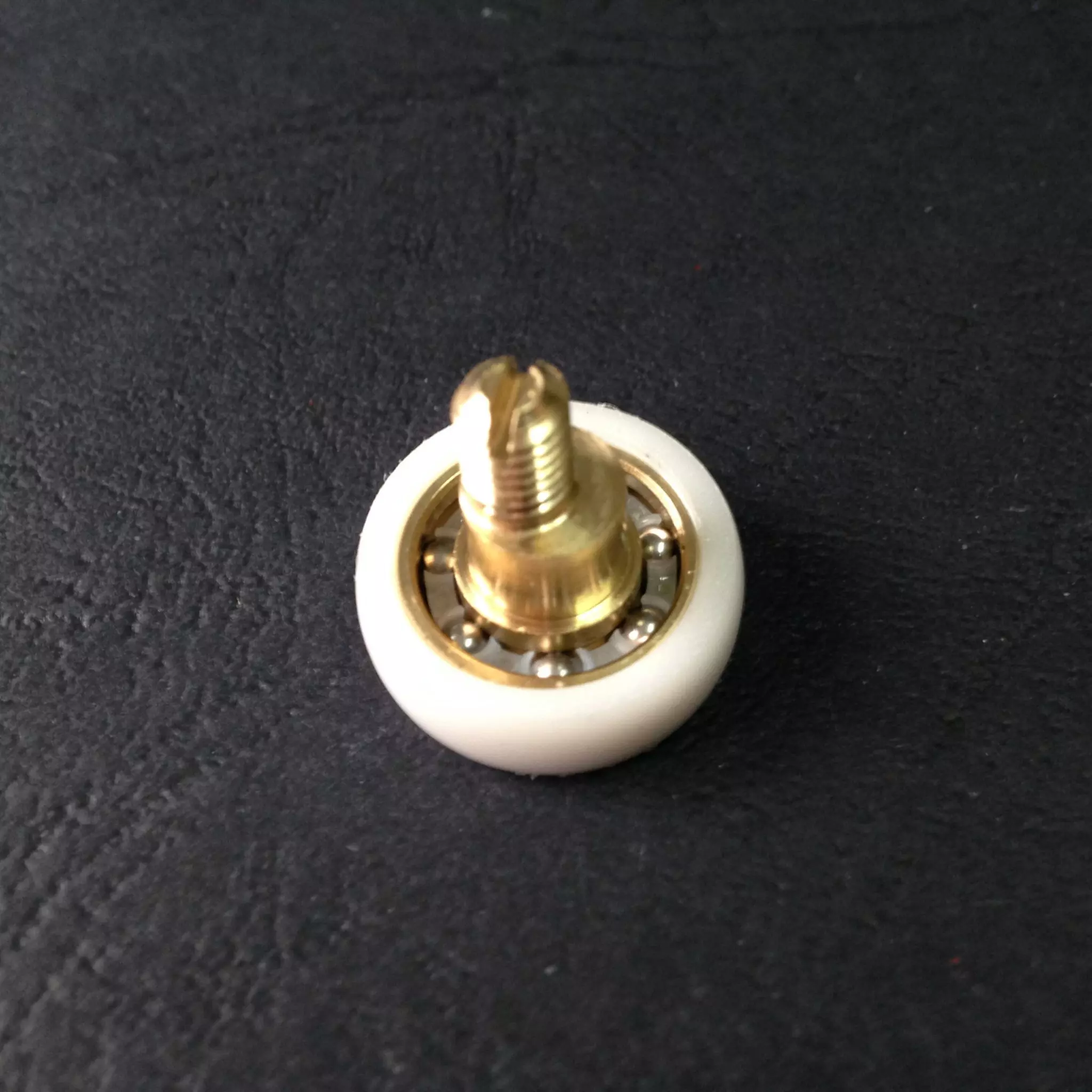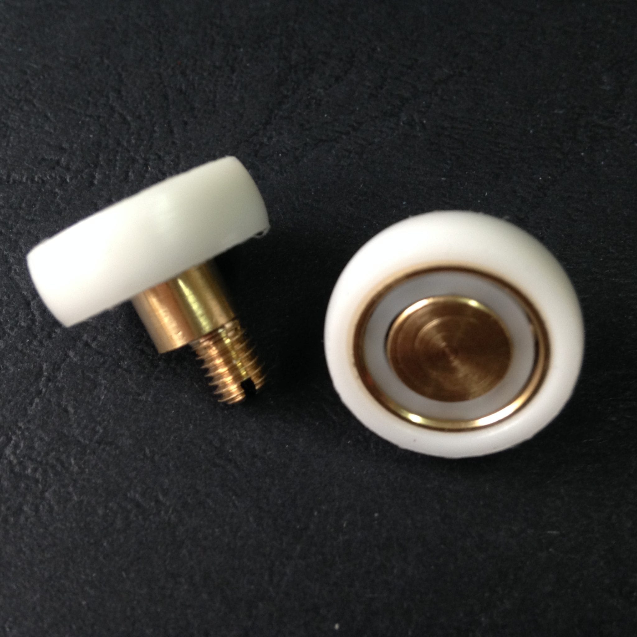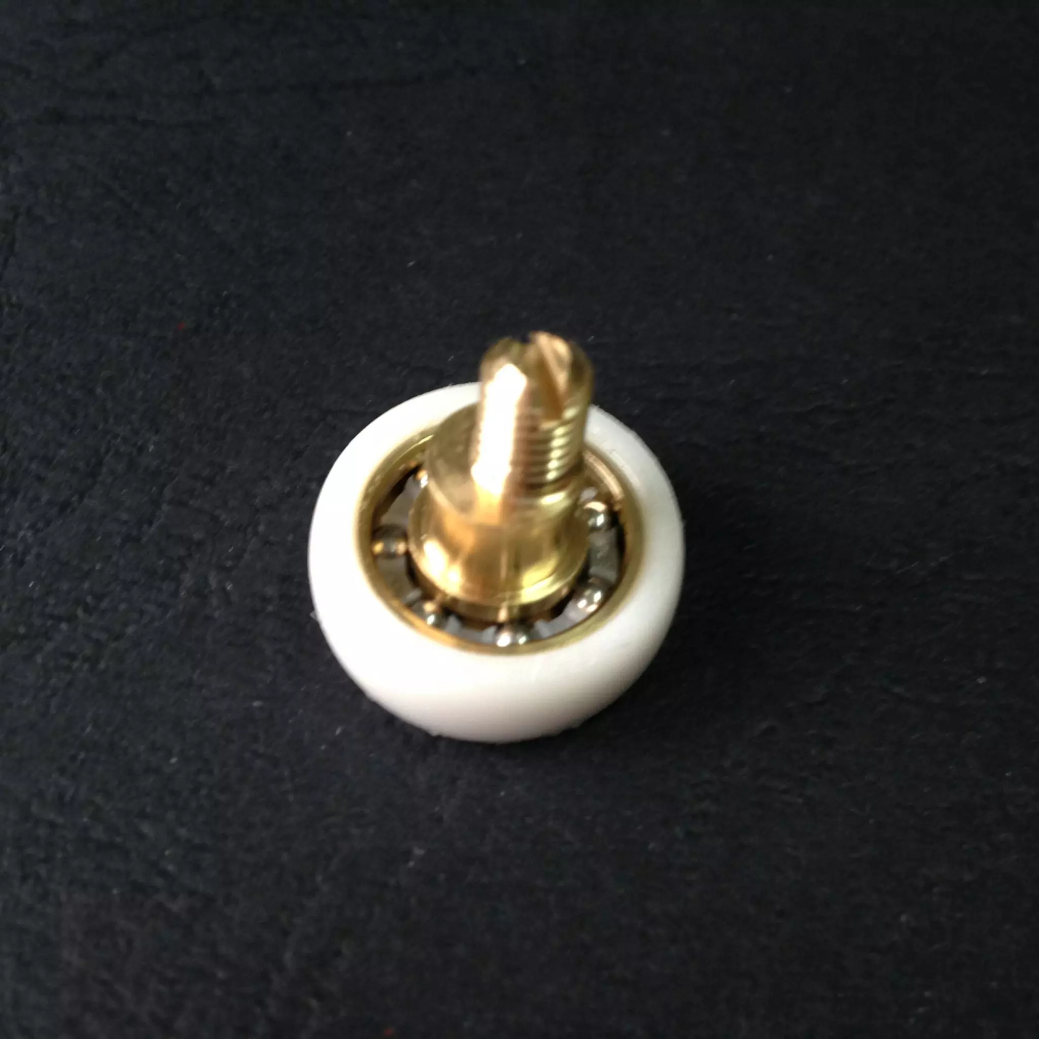 Roulette droite simple pour porte coulissante de cabine de douche. Vendue à l’unité, cette roulette se compose d’un corps en laiton. Le bandage plat de la roulette est en téflon, recouvrant un roulement à billes étanche en acier inoxydable. Le choix et la qualité des matériaux employés offrent une utilisation optimale de confort, limitant ainsi le frottement et le bruit lors de la manipulation de la porte.