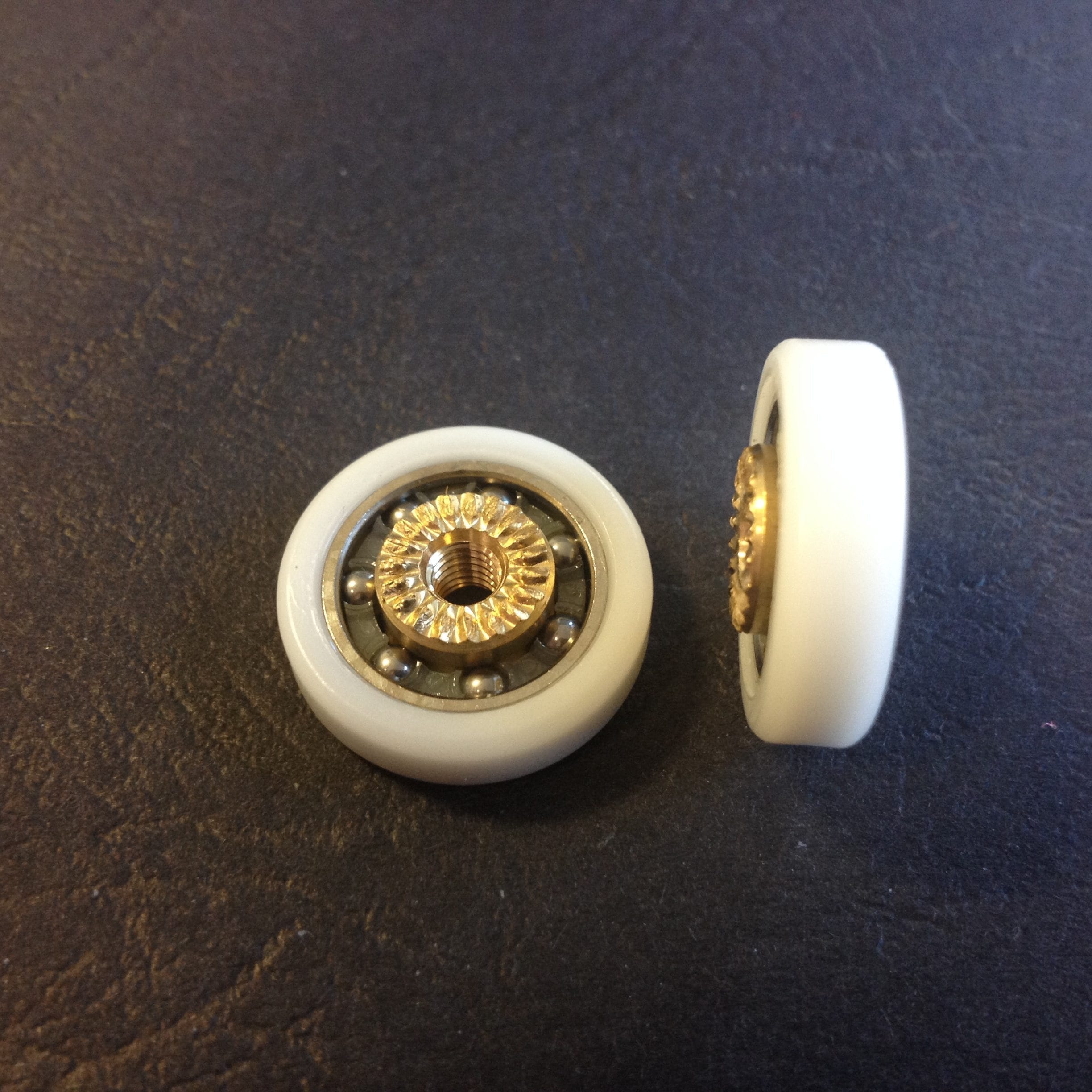 Roulette droite simple pour porte coulissante de cabine de douche. Vendue à l’unité, cette roulette se compose d’un corps en laiton. Le bandage plat de la roulette est en téflon, recouvrant un roulement à billes étanche en acier inoxydable. Le choix et la qualité des matériaux employés offrent une utilisation optimale de confort, limitant ainsi le frottement et le bruit lors de la manipulation de la porte.