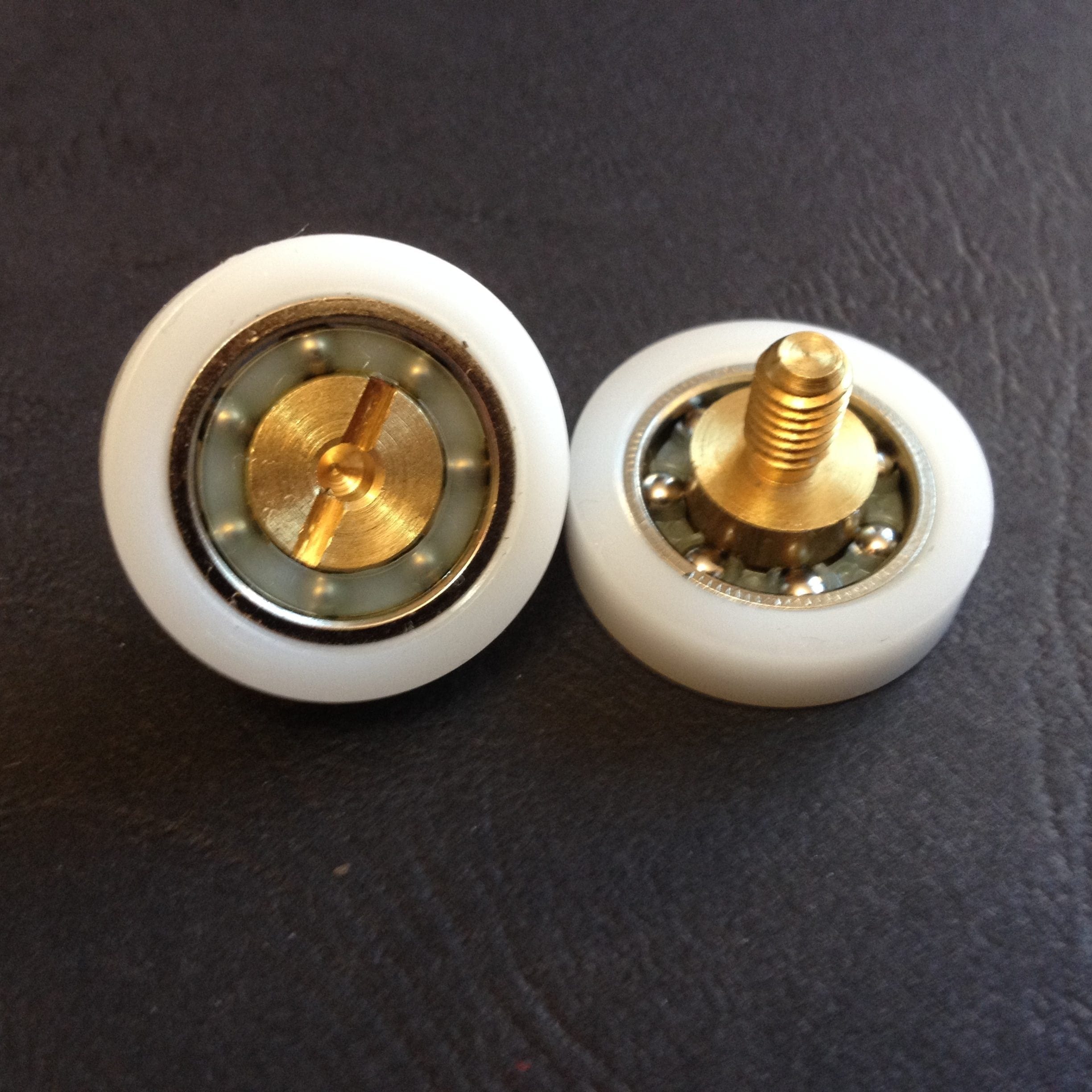 Roulette droite simple pour porte coulissante de cabine de douche. Vendue à l’unité, cette roulette se compose d’un corps en laiton. Le bandage de la roulette est en téflon, recouvrant un roulement à billes étanche en acier inoxydable. Le choix et la qualité des matériaux employés offrent une utilisation optimale de confort, limitant ainsi le frottement et le bruit lors de la manipulation de la porte.