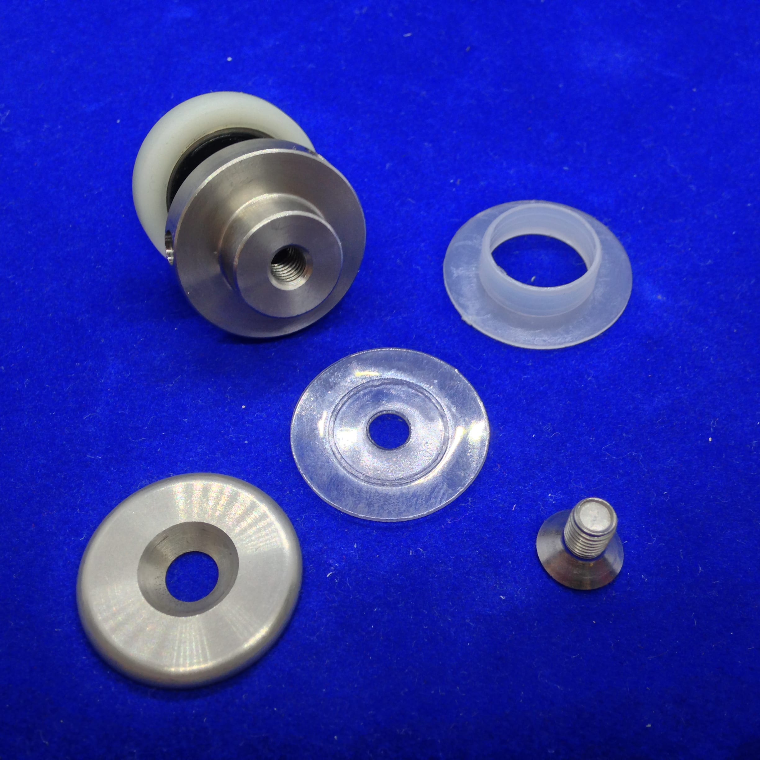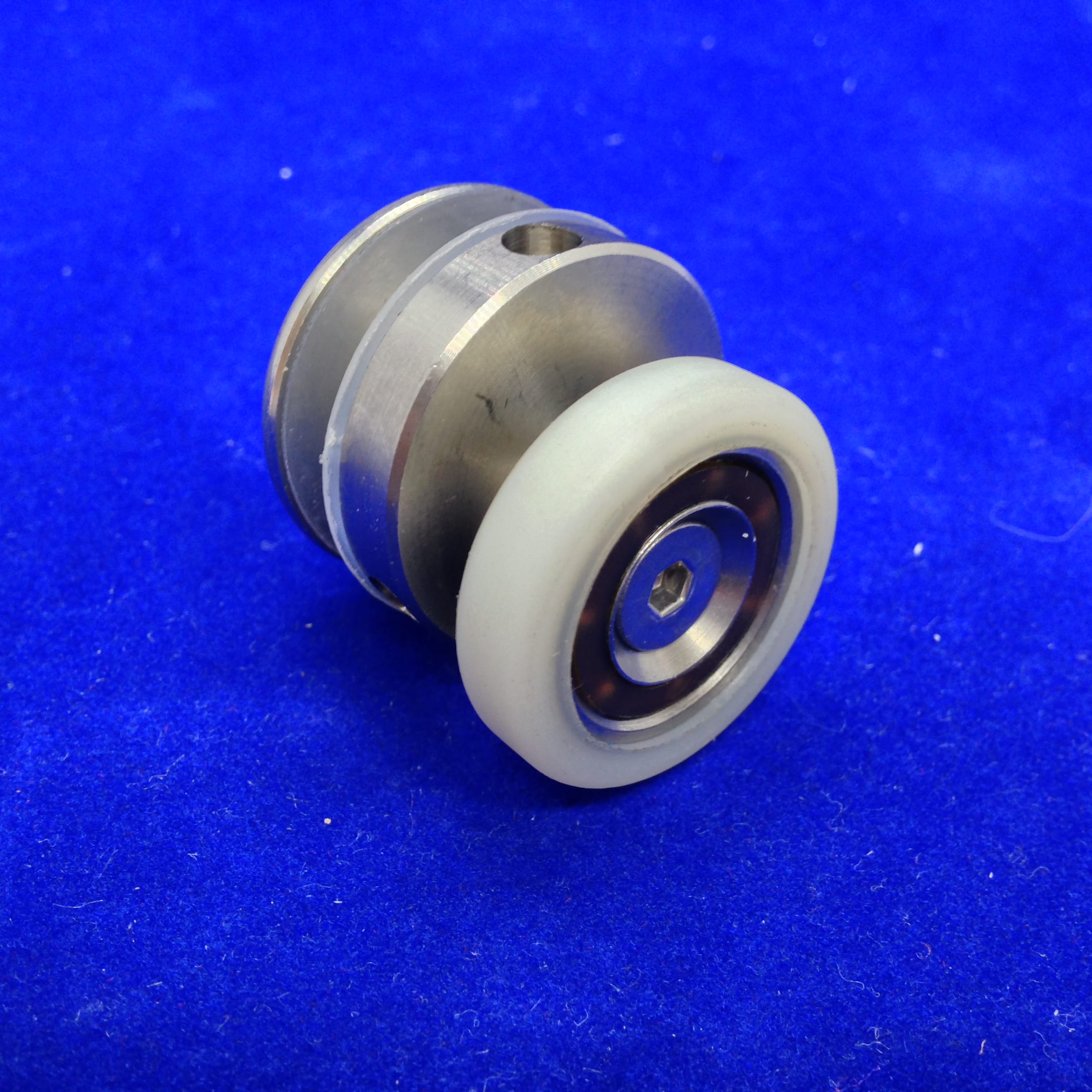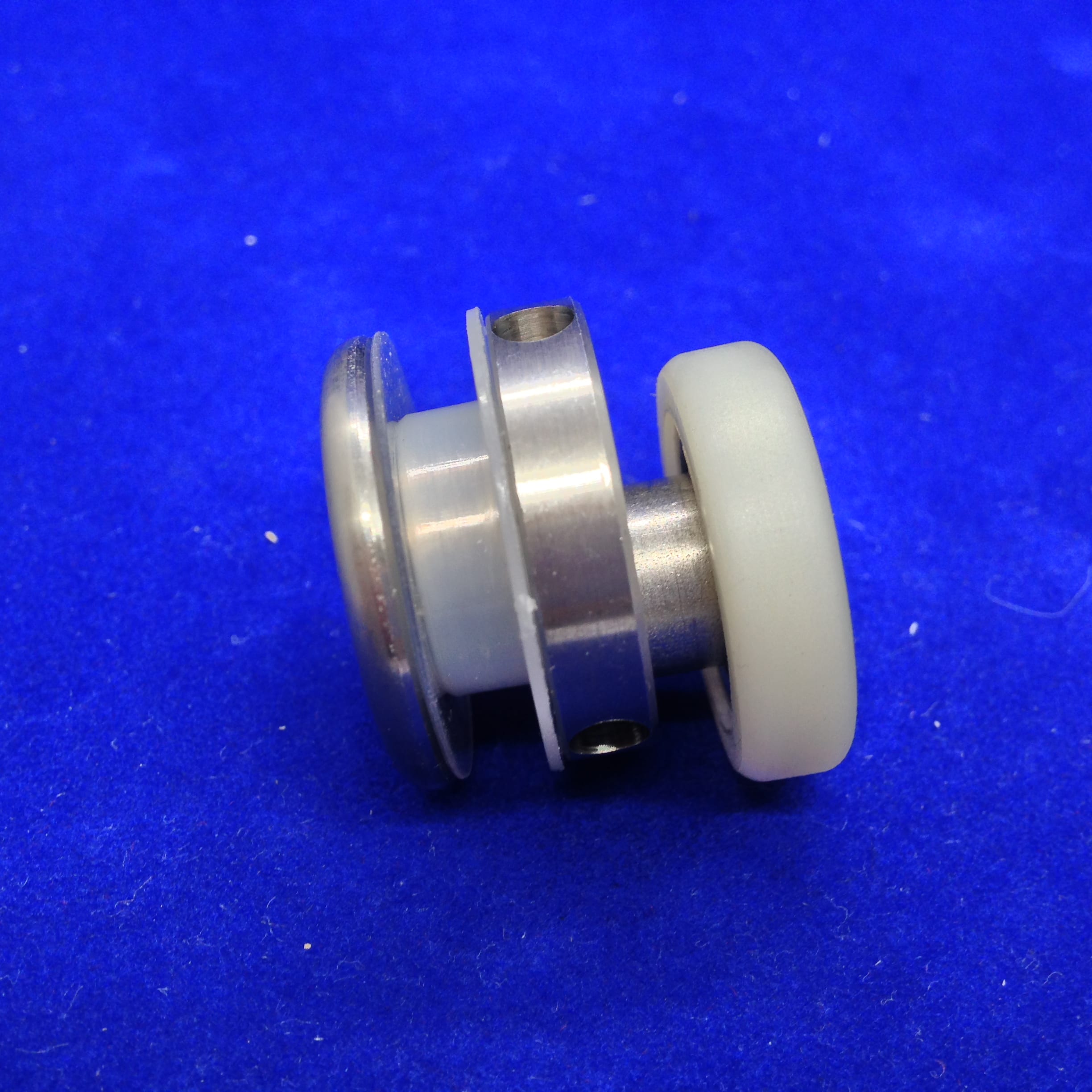 Roulette droite simple excentrique pour porte coulissante de cabine de douche. Vendue à l’unité, cette roulette se compose d’un corps en laiton. Le bandage plat de la roulette est en téflon, recouvrant un roulement à billes étanche en acier inoxydable. Le choix et la qualité des matériaux employés offrent une utilisation optimale de confort, limitant ainsi le frottement et le bruit lors de la manipulation de la porte.